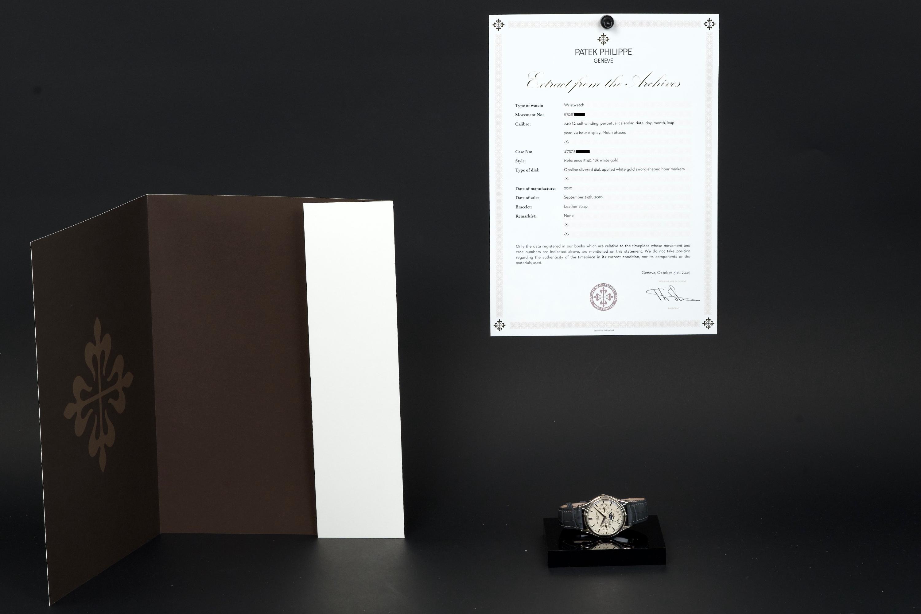 Patek Philippe Perpetual Calendar ref. 5140G in white gold, 37.2 mm. The watch presents very well, with only light wear and minor polishing visible under close inspection. The opaline dial is clean, paired with matching hands and sapphire crystal in excellent condition. Fitted with a new grey alligator strap and white gold tang buckle. Powered by the caliber 240 Q automatic movement with micro-rotor, featuring perpetual calendar with day, date, month, leap year and moonphase. No service history is available, but the watch has been carefully inspected by our watchmaker and shows strong performance (+3 s/d, amplitude over 300). Comes with Extract from the Archives confirming its production in 2010, as well as a 1-year warranty from our compagny. A refined perpetual calendar, offering both elegance and technical depth in a versatile case size.