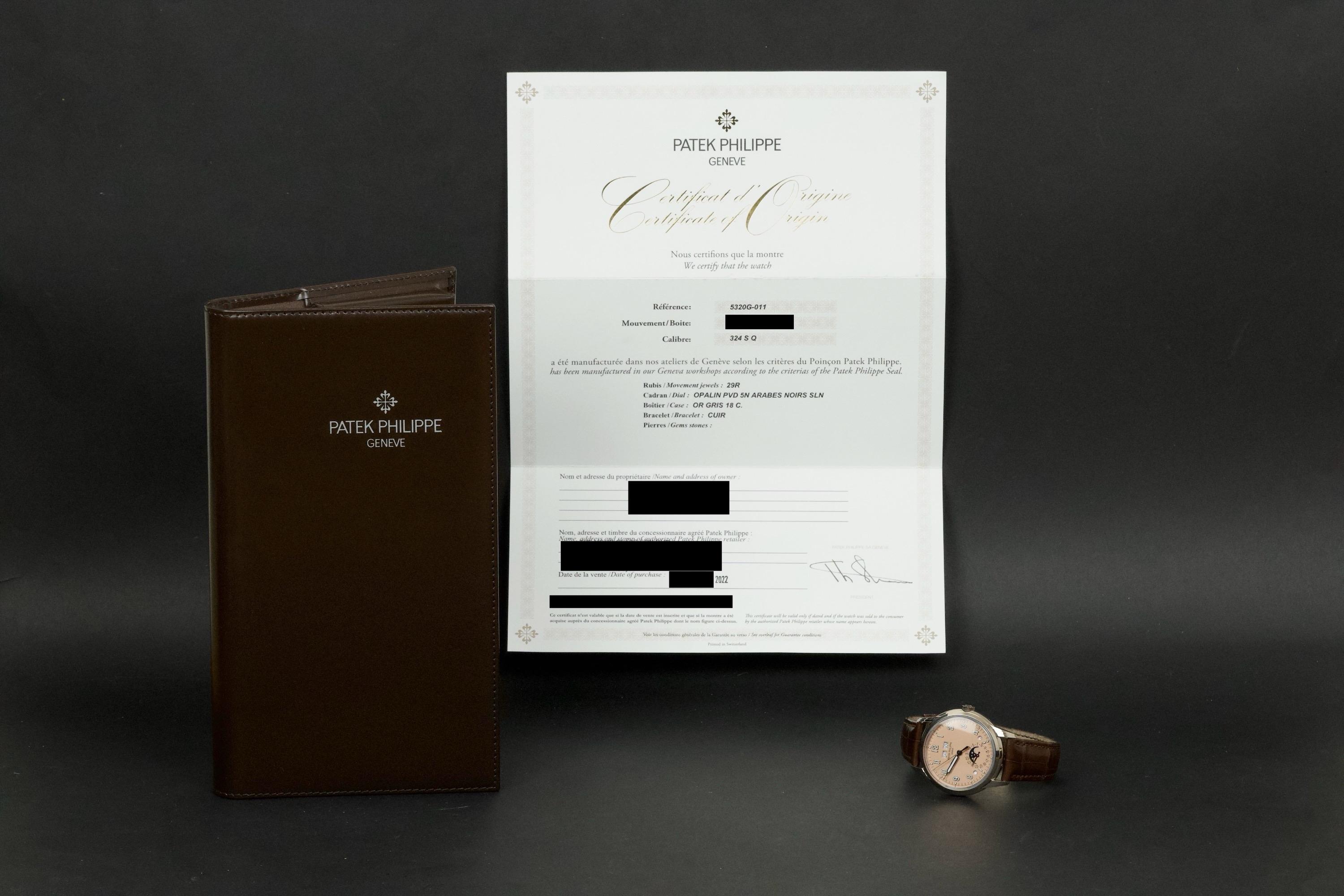 A superb example of the Patek Philippe 5320G-011 Perpetual Calendar in white gold, featuring the elegant and highly sought-after salmon dial. The watch is unpolished and shows only very light wear from careful use. Powered by the automatic caliber 324 S Q, this reference combines classic perpetual calendar functionality with Patek Philippe’s signature Art Deco–inspired design. It comes as a full set, including the second solid caseback, display caseback, and original pin pusher. A refined and collectible modern Patek Philippe, offered in excellent condition with full accessories.
