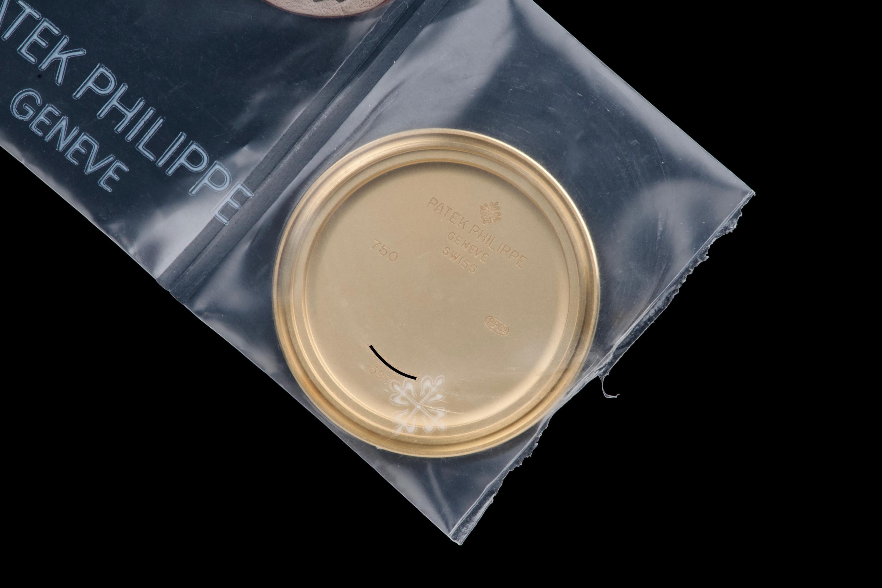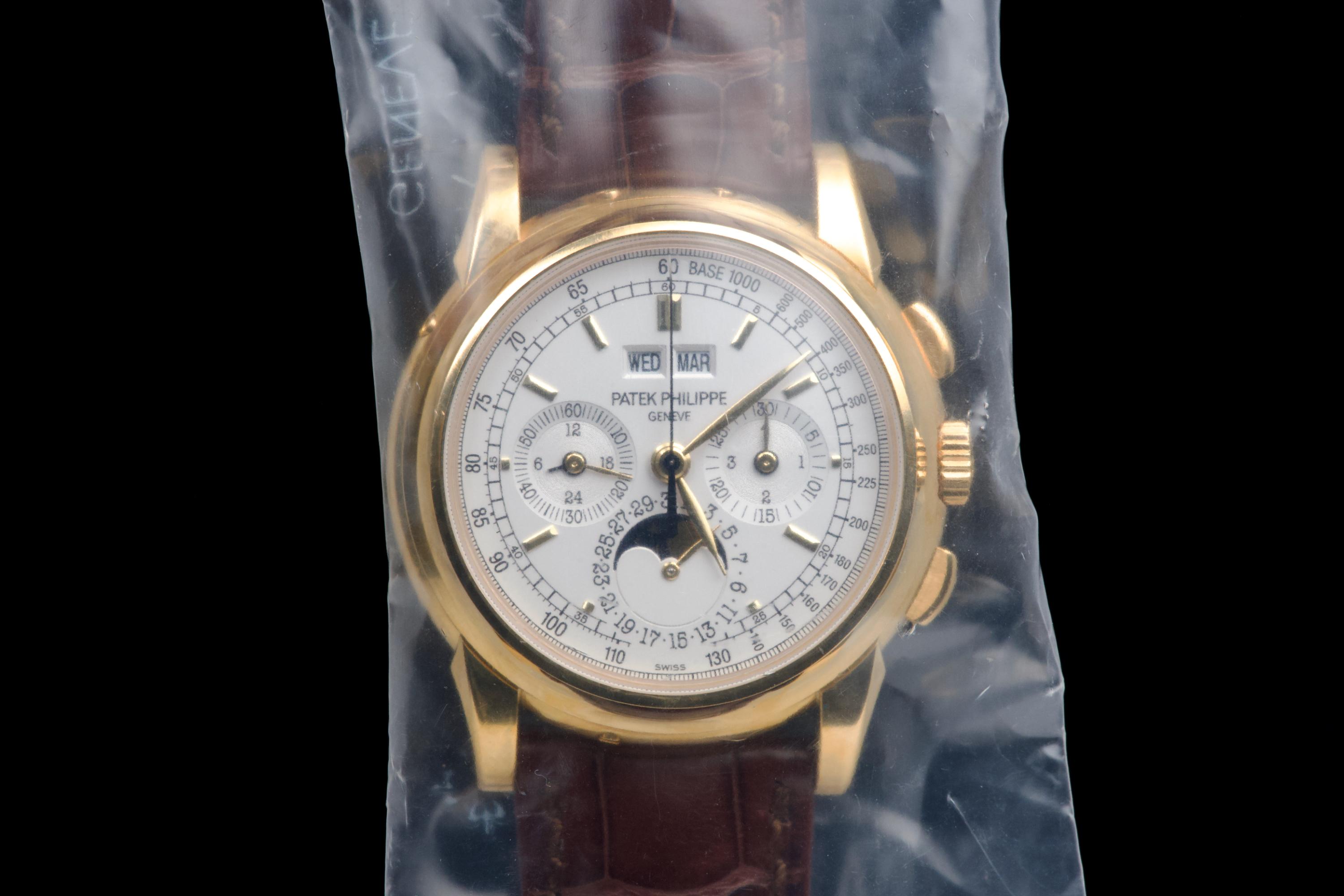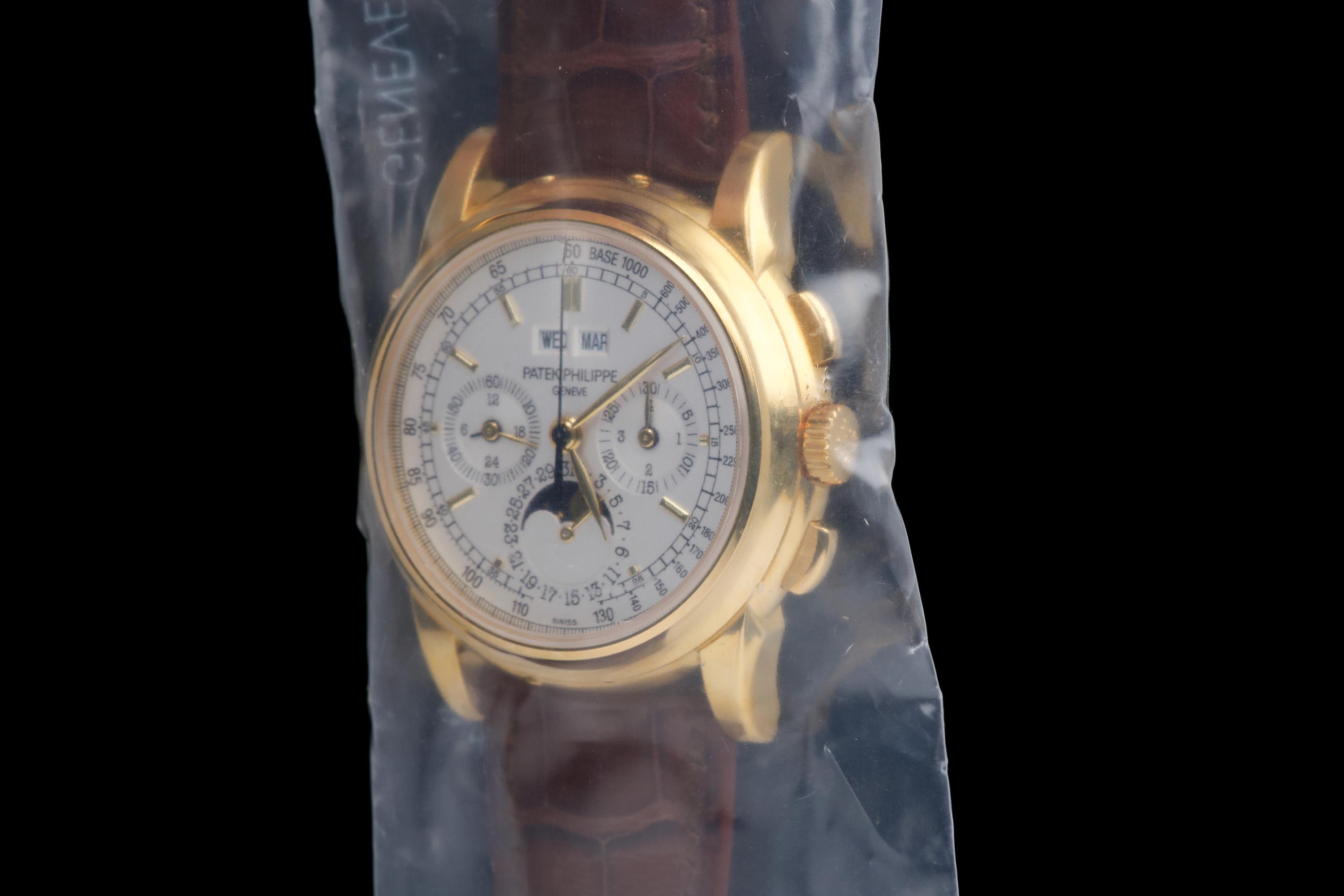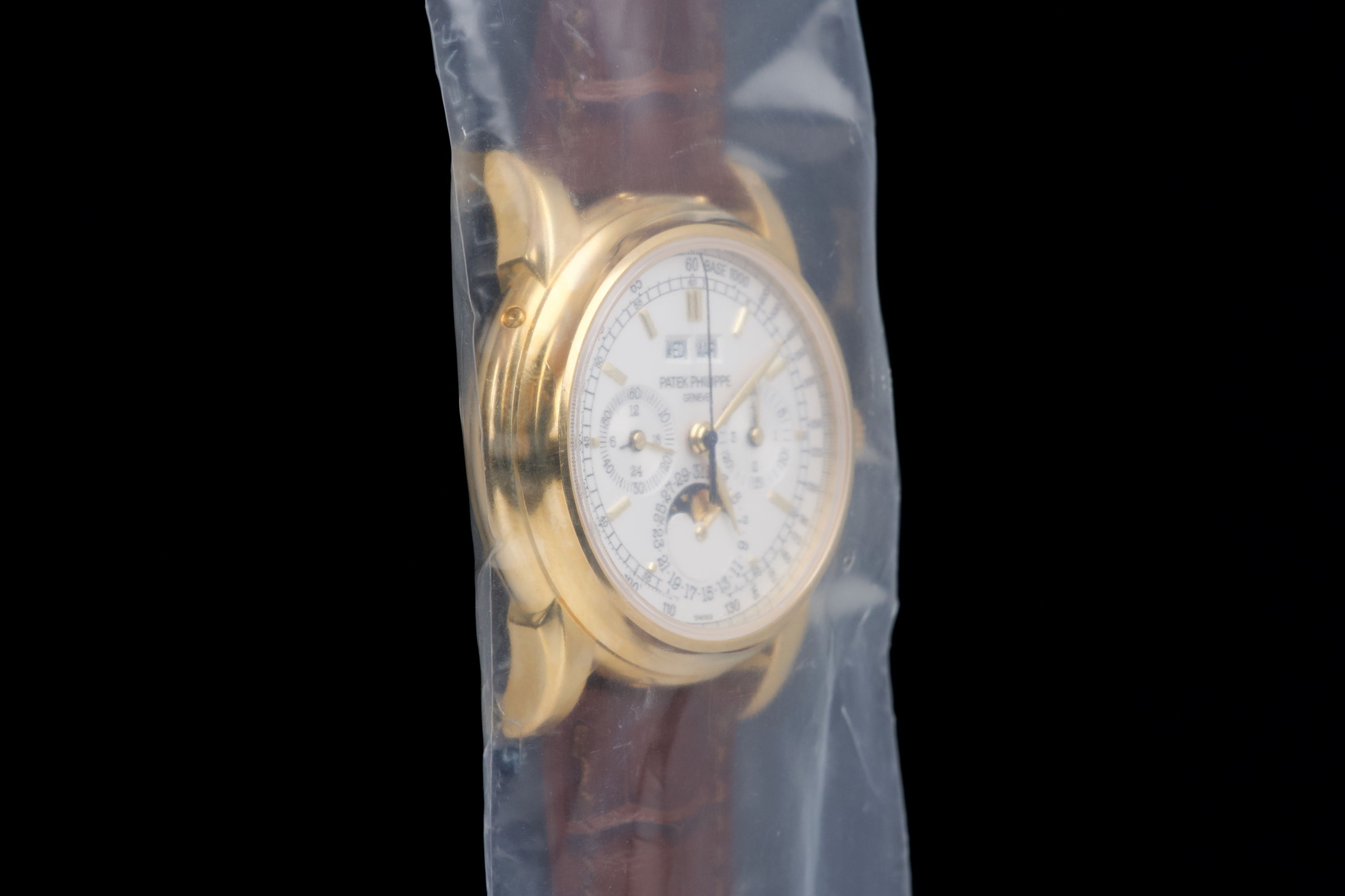 An extraordinary and highly collectible example of the Patek Philippe Perpetual Calendar Chronograph reference 5970J, presented in single-sealed condition. Crafted in 18K yellow gold, this 40 mm masterpiece remains factory sealed, with the solid caseback and pin pushers attached to the original Patek Philippe plastic seal — a true time capsule and a grail for collectors. Powered by the manual-winding caliber CH 27-70 Q, the 5970 is celebrated as one of the most perfectly proportioned perpetual calendar chronographs ever produced by Patek Philippe. Accompanied by its full 2008 set, including box, original certificate, booklets, and accessories. An extremely rare opportunity to acquire a single-sealed 5970J — one of the most iconic and sought-after modern Patek Philippe complications, preserved in untouched condition.