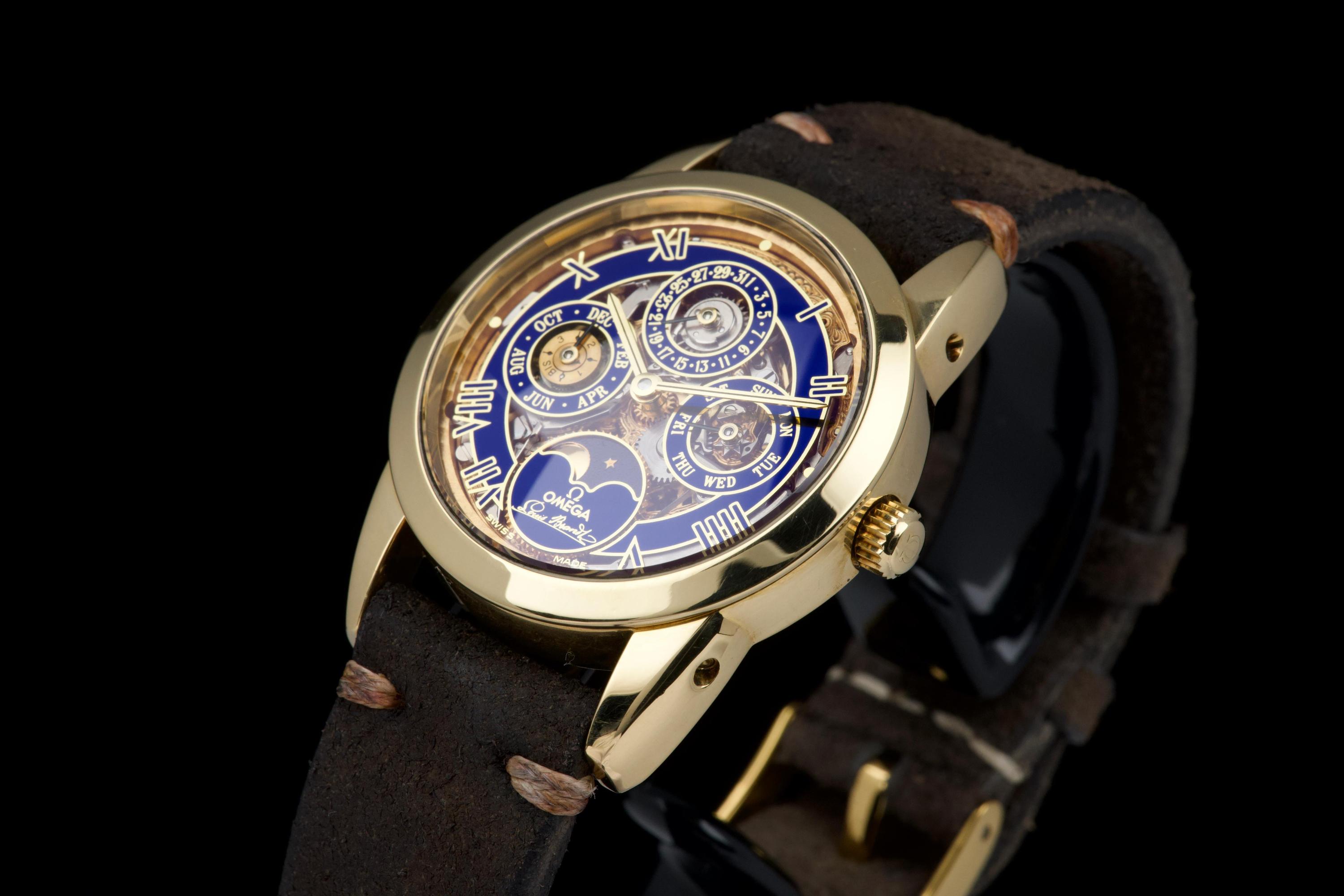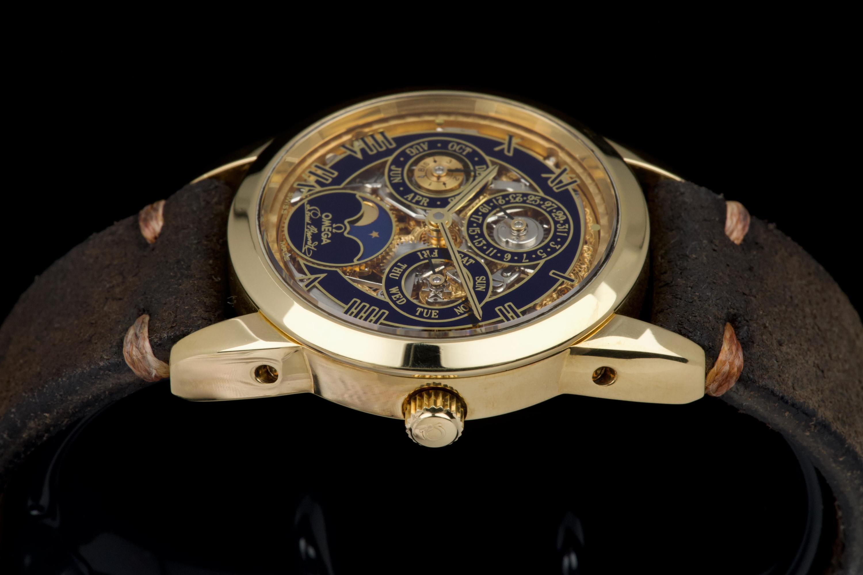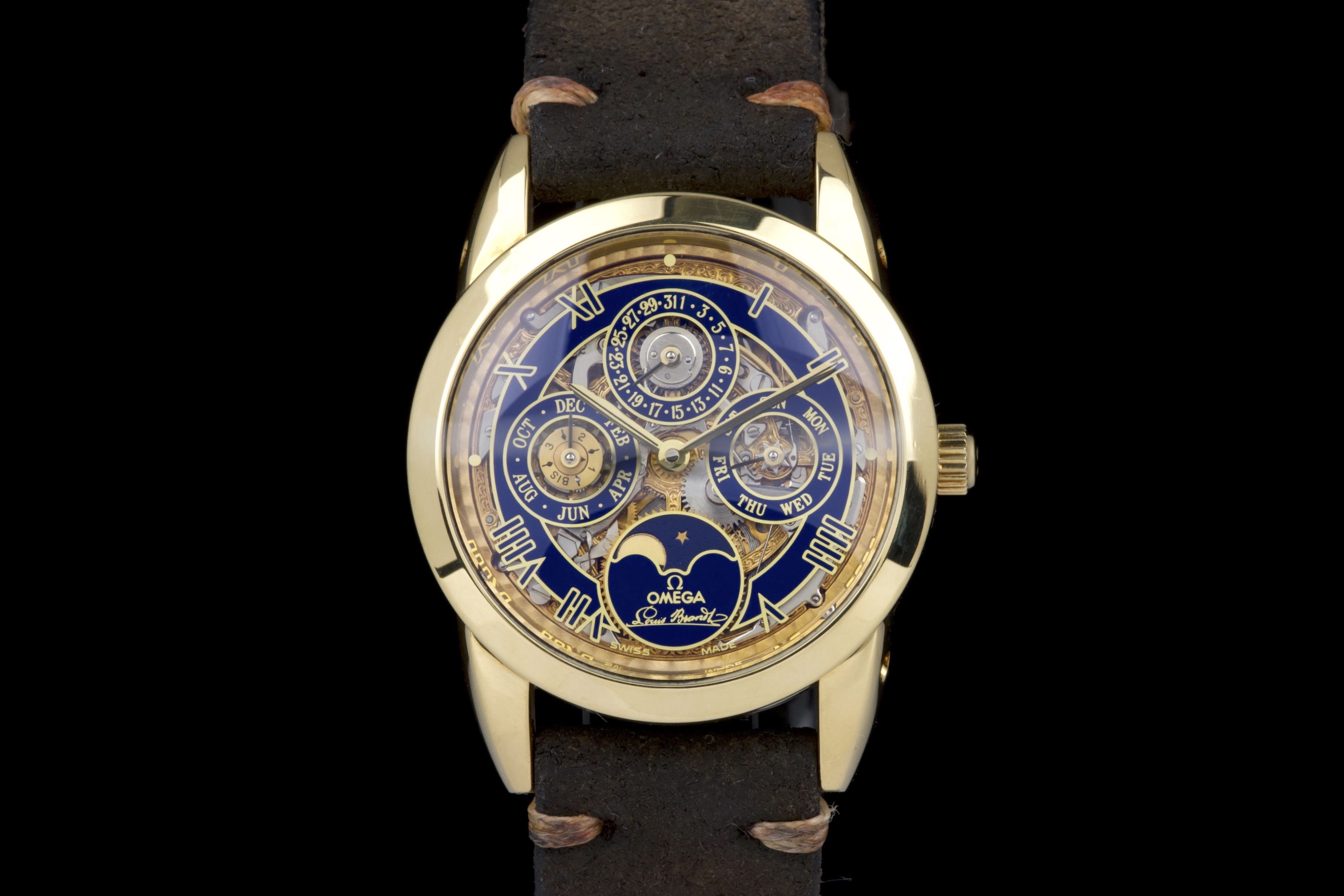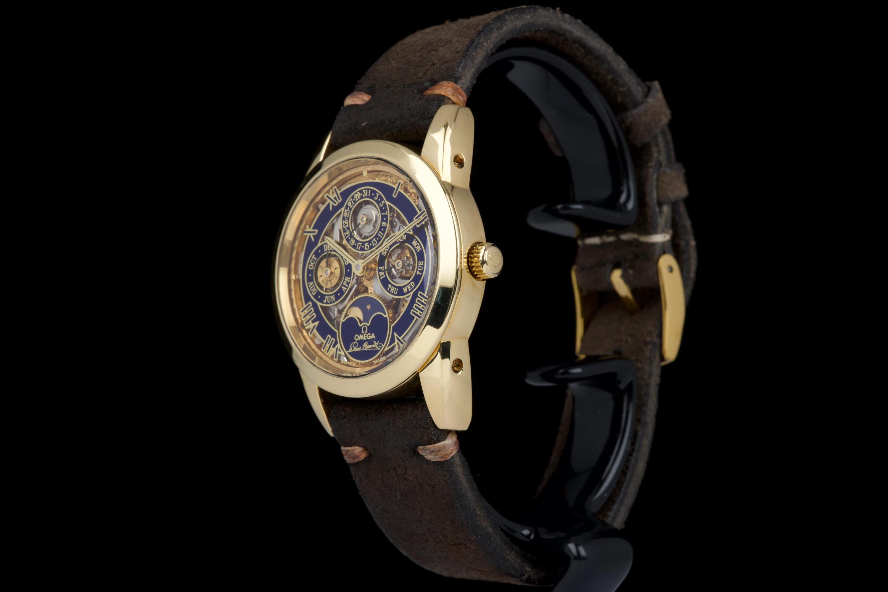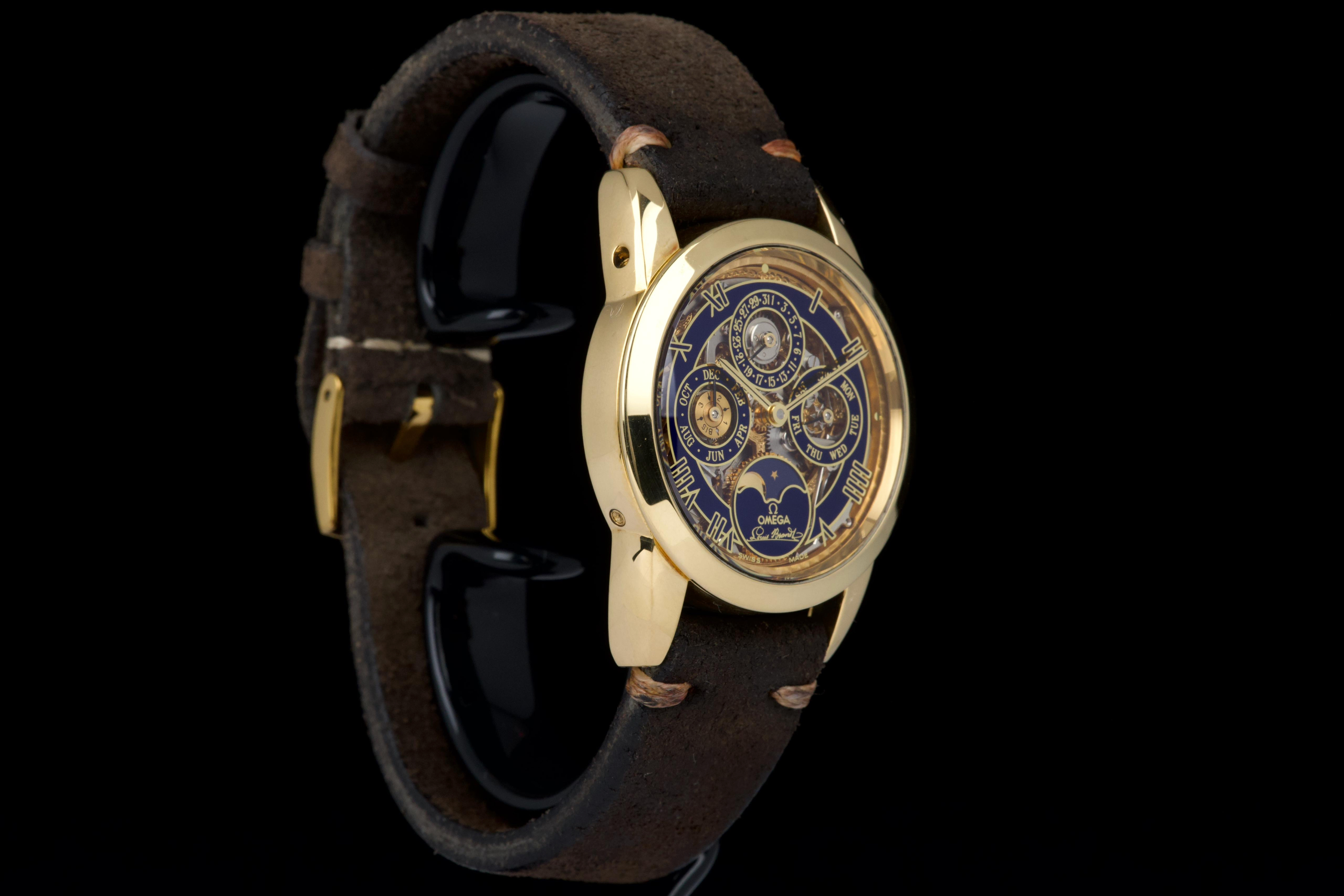 The present Omega Louis Brandt Perpetual Calendar reference 5349.80.83, dating to circa 2005, is a refined and technically impressive wristwatch showcasing Omega’s mastery in combining traditional complications with decorative openworked movements. In the 1990s through the early 2000s, Omega introduced a series of sophisticated timepieces within the Louis Brandt collection, named after the founder of the manufacture. This line was created to highlight Omega’s ability to produce elegant and highly complicated watches in compact formats. The collection included one chronograph and three perpetual calendar models, one of which was presented in a striking skeletonized execution, demonstrating the brand’s craftsmanship and decorative expertise. Executed in 18K yellow gold, this watch features a beautifully skeletonized dial that reveals the intricate architecture of the movement beneath. The display incorporates a full perpetual calendar with moon phases and leap year indication, arranged across four subdials. Subtle blue accents outline the subdials, adding visual depth and enhancing legibility. The watch is powered by the automatic calibre 1117 (movement number 289’049), a sophisticated perpetual calendar movement combining reliability with mechanical complexity. The movement can also be admired through the sapphire crystal display caseback. The 34 mm case is crafted in 18K yellow gold and has been lightly polished in the past, remaining in very good overall condition, with minor wear consistent with age including light scratches on the back of the lugs. The case is signed by the maker, while the dial is signed Omega and Louis Brandt. The watch is fitted with a leather strap and a yellow-gold plated Omega pin buckle. The watch is offered without box or papers. Combining historical significance within the Louis Brandt collection, a full perpetual calendar complication, and the visual appeal of a skeletonized dial, this reference 5349.80.83 represents an attractive and uncommon example of Omega’s high-complication watchmaking from the early 2000s.