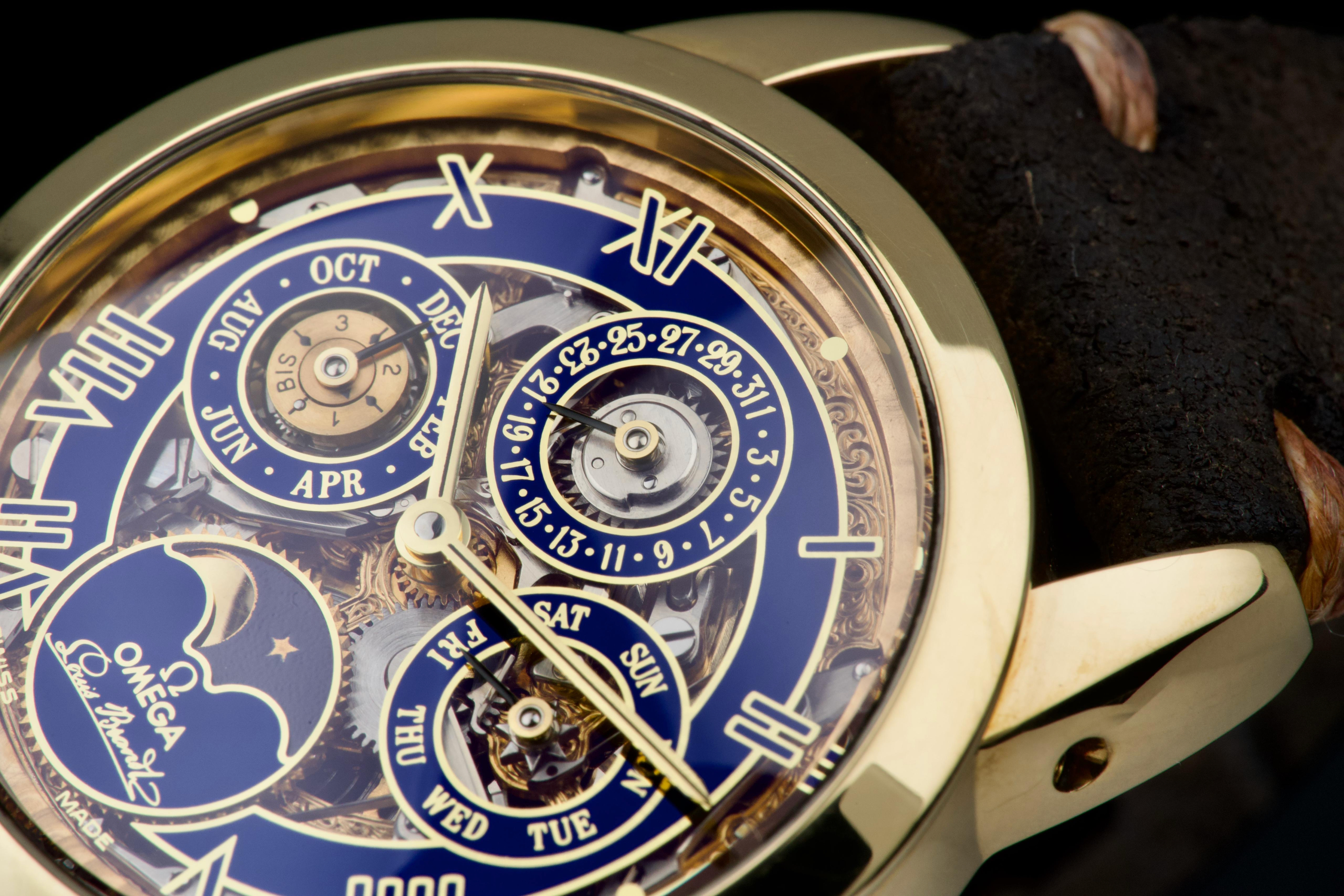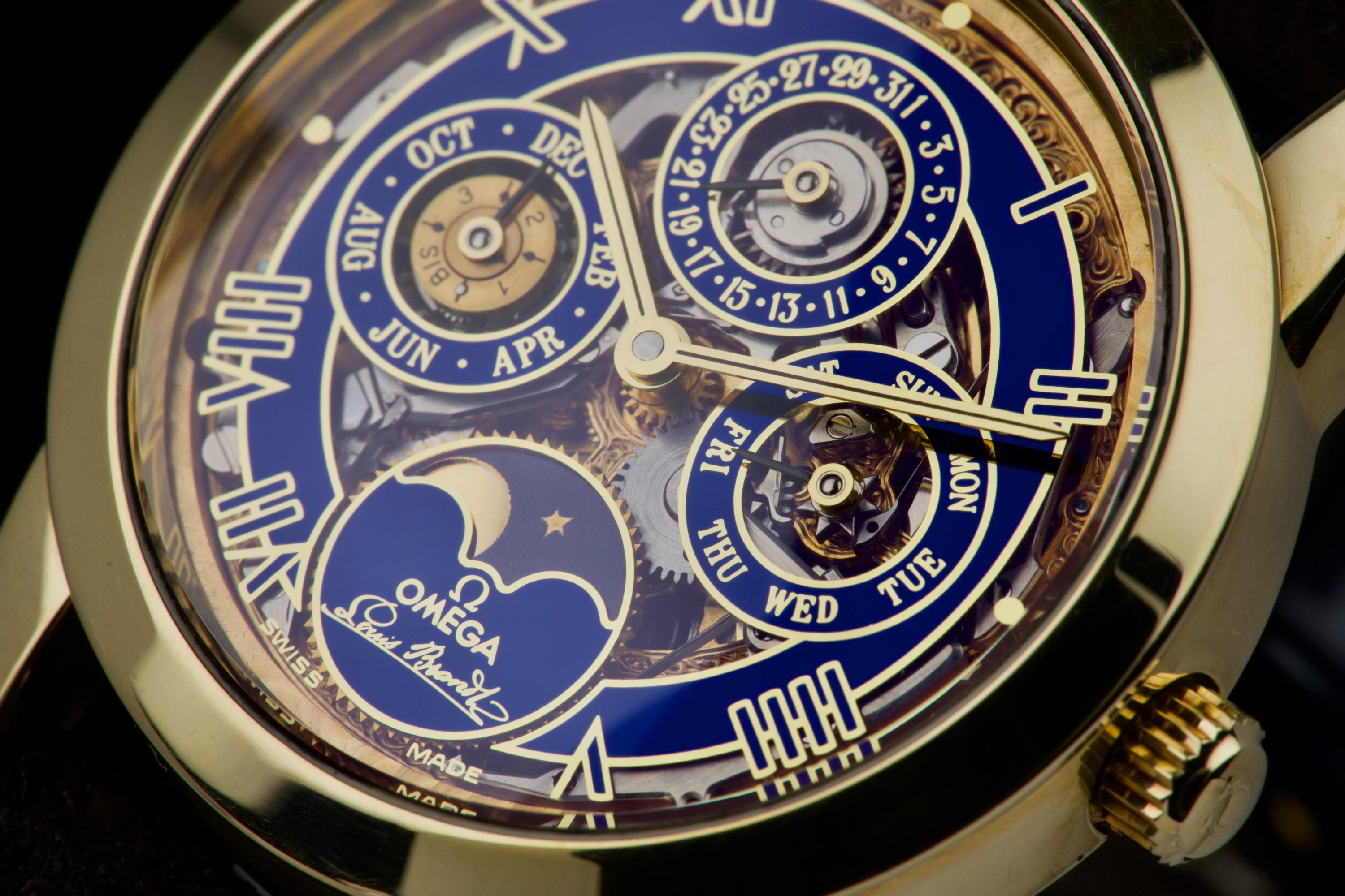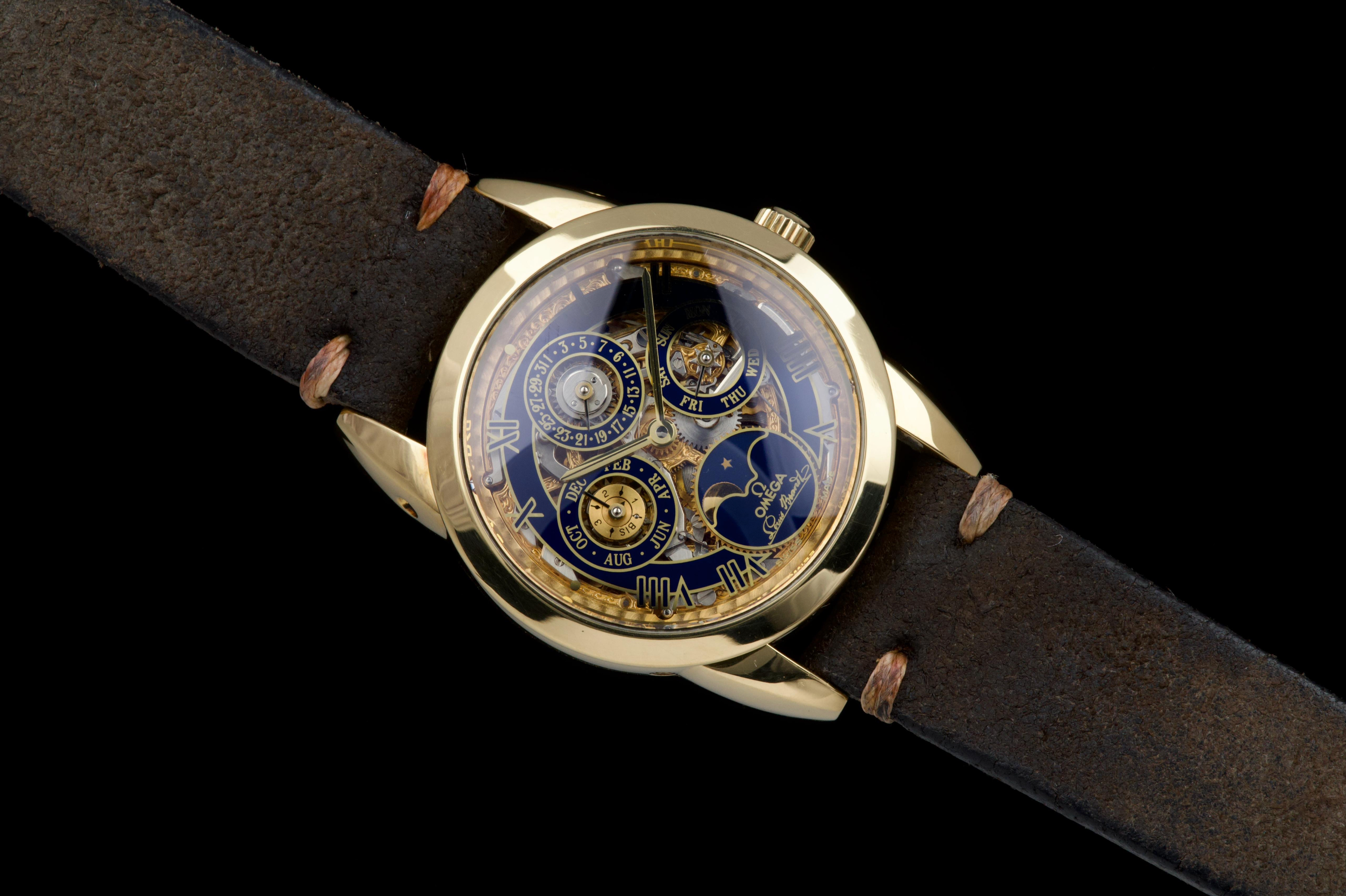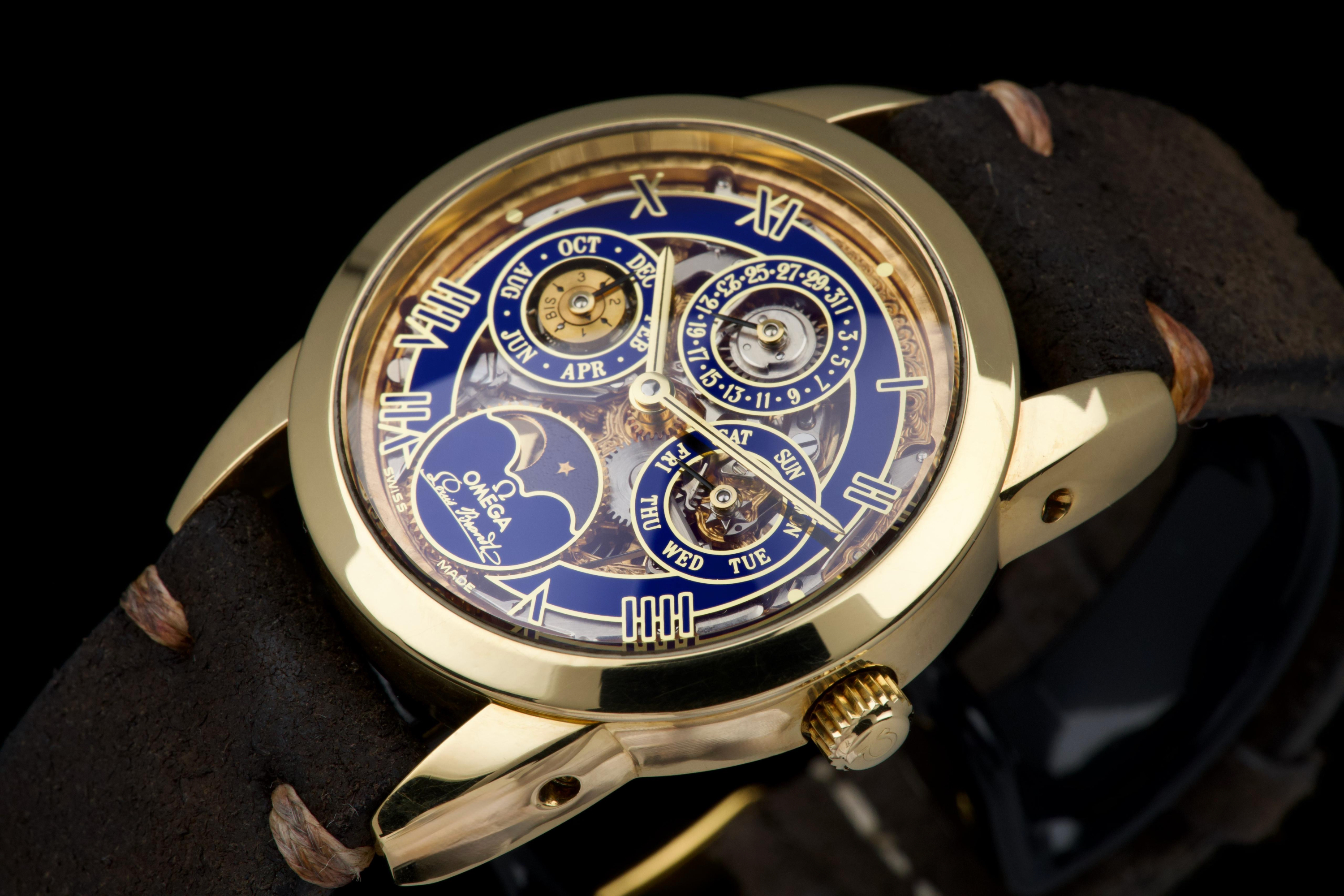 The present Omega Louis Brandt Perpetual Calendar reference 5349.80.83, dating to circa 2005, is a refined and technically impressive wristwatch showcasing Omega’s mastery in combining traditional complications with decorative openworked movements. In the 1990s through the early 2000s, Omega introduced a series of sophisticated timepieces within the Louis Brandt collection, named after the founder of the manufacture. This line was created to highlight Omega’s ability to produce elegant and highly complicated watches in compact formats. The collection included one chronograph and three perpetual calendar models, one of which was presented in a striking skeletonized execution, demonstrating the brand’s craftsmanship and decorative expertise. Executed in 18K yellow gold, this watch features a beautifully skeletonized dial that reveals the intricate architecture of the movement beneath. The display incorporates a full perpetual calendar with moon phases and leap year indication, arranged across four subdials. Subtle blue accents outline the subdials, adding visual depth and enhancing legibility. The watch is powered by the automatic calibre 1117 (movement number 289’049), a sophisticated perpetual calendar movement combining reliability with mechanical complexity. The movement can also be admired through the sapphire crystal display caseback. The 34 mm case is crafted in 18K yellow gold and has been lightly polished in the past, remaining in very good overall condition, with minor wear consistent with age including light scratches on the back of the lugs. The case is signed by the maker, while the dial is signed Omega and Louis Brandt. The watch is fitted with a leather strap and a yellow-gold plated Omega pin buckle. The watch is offered without box or papers. Combining historical significance within the Louis Brandt collection, a full perpetual calendar complication, and the visual appeal of a skeletonized dial, this reference 5349.80.83 represents an attractive and uncommon example of Omega’s high-complication watchmaking from the early 2000s.