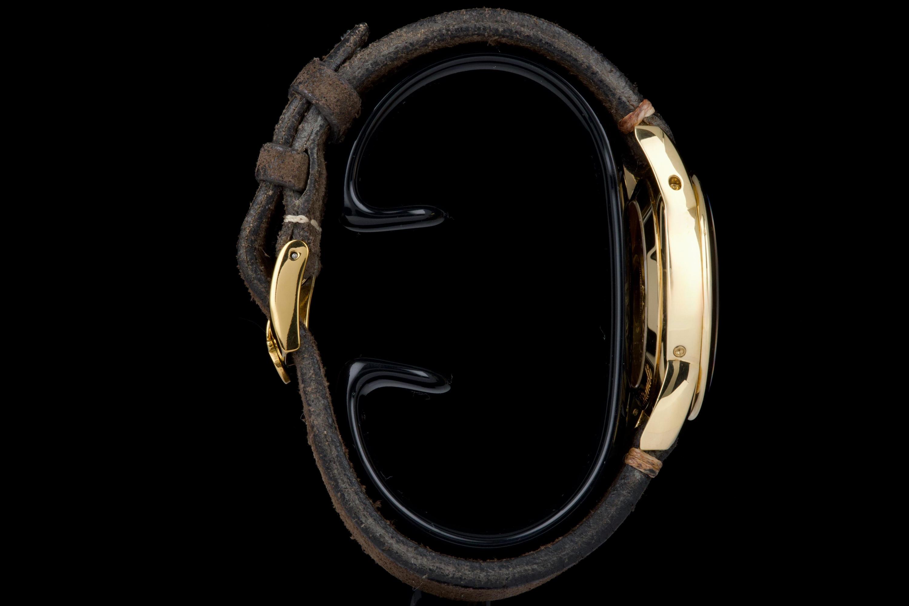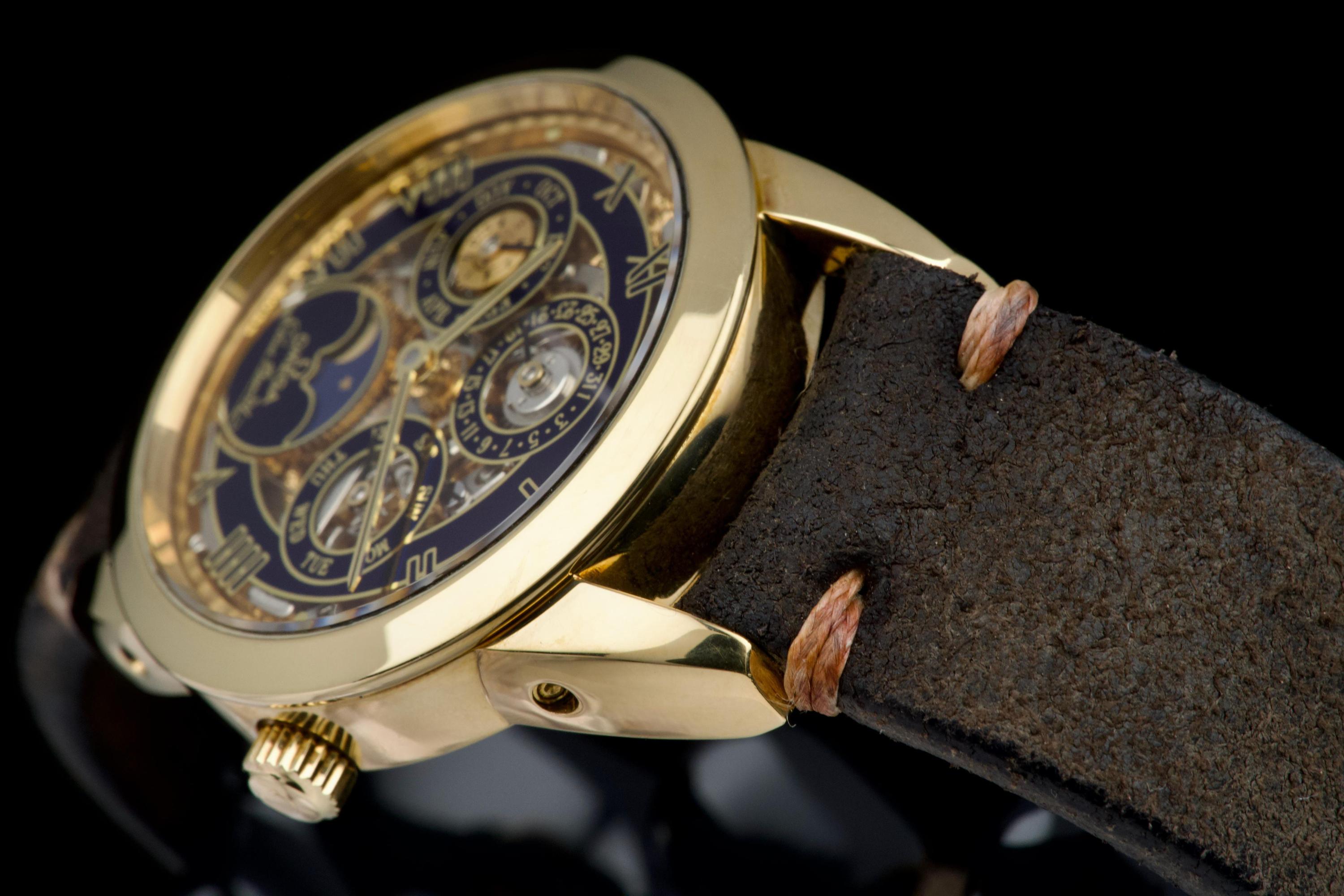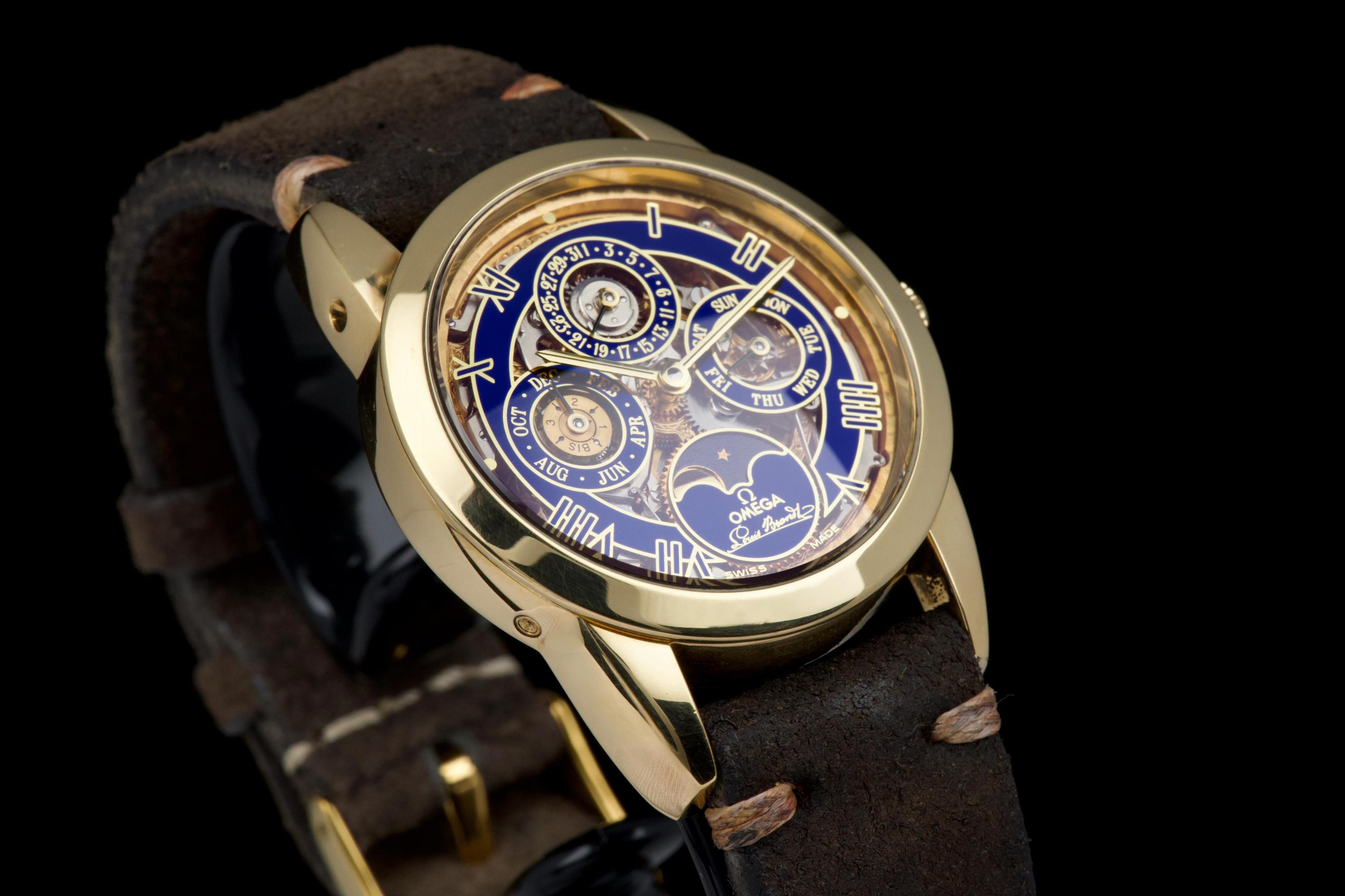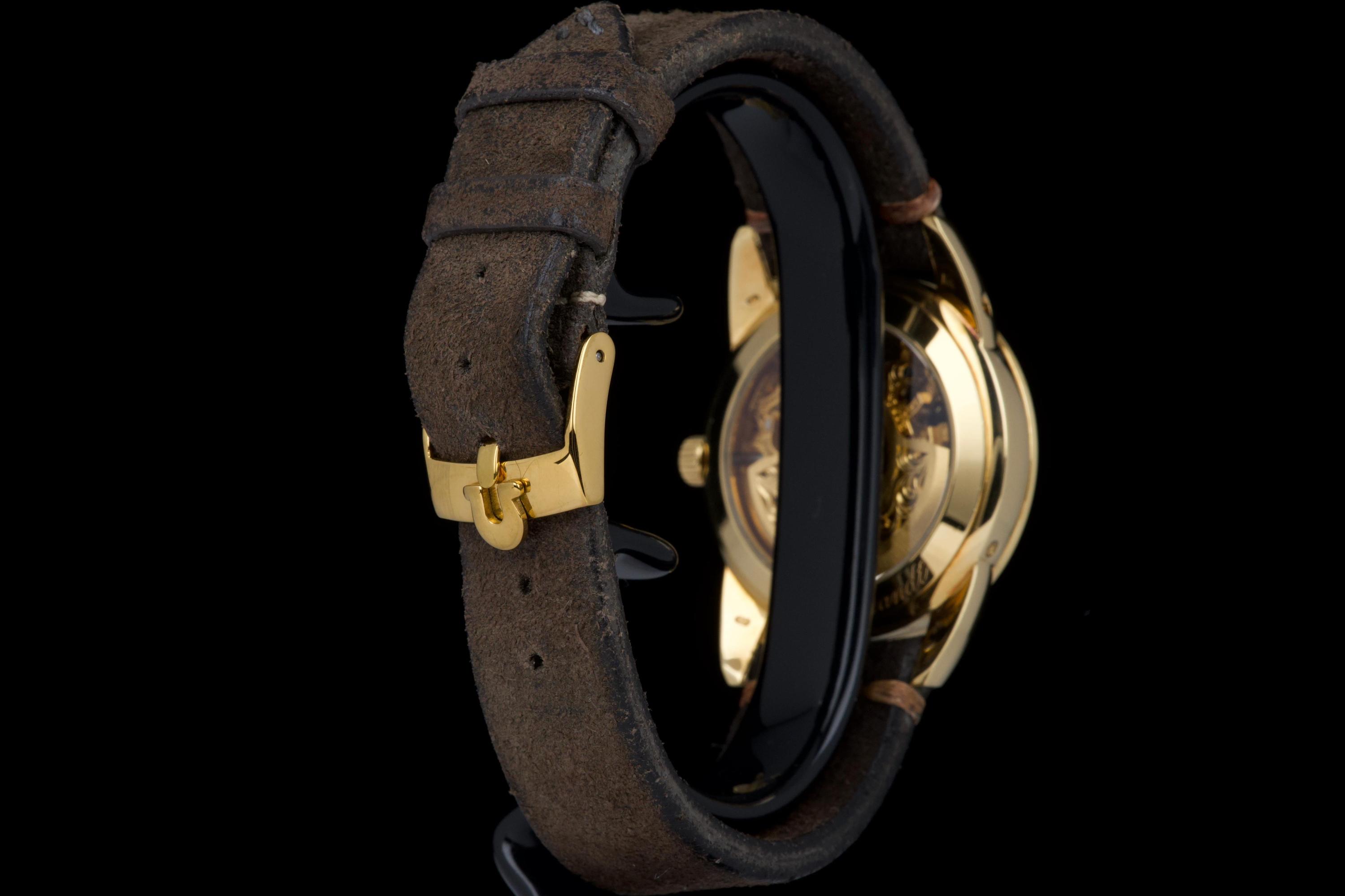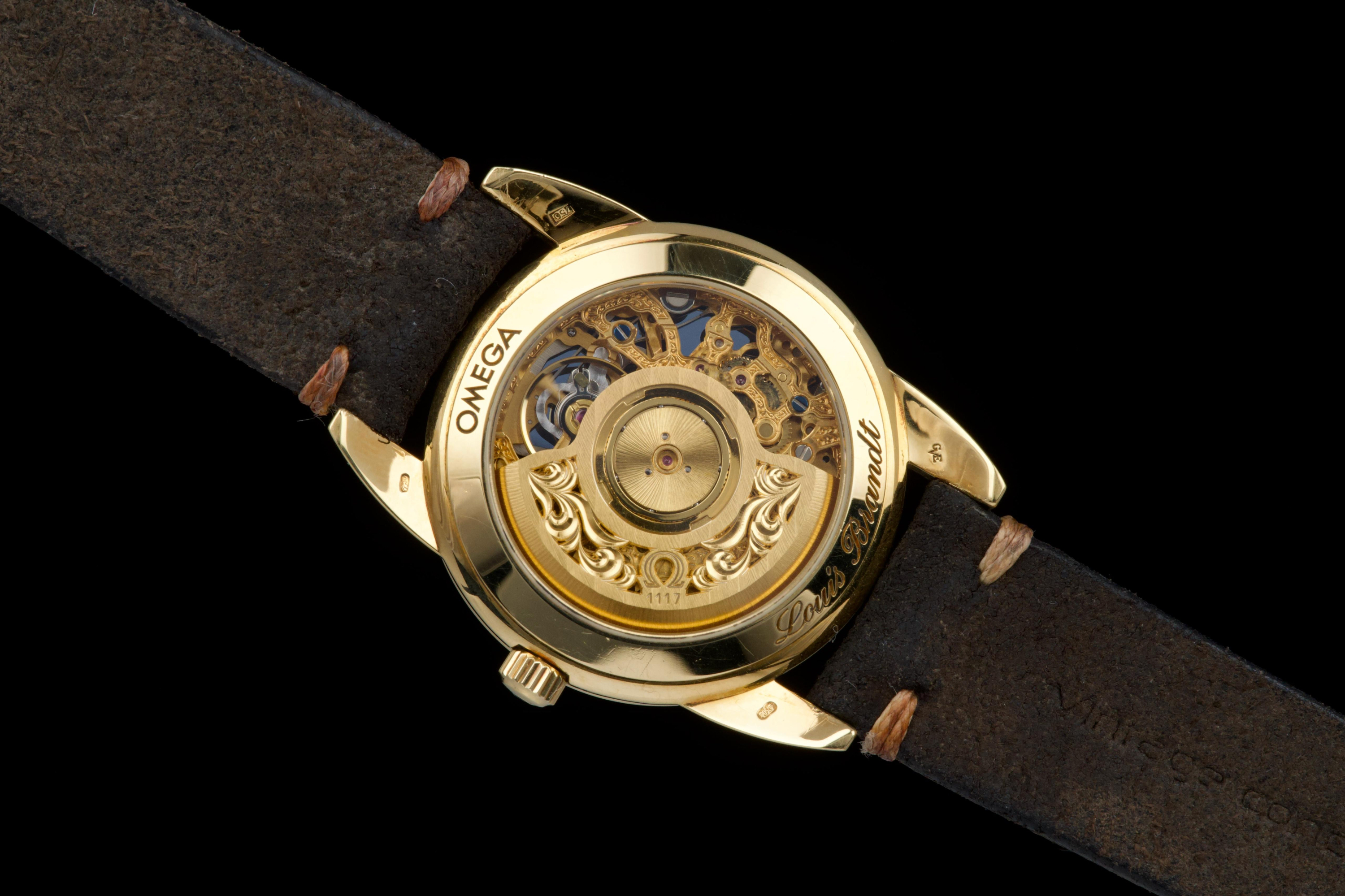 The present Omega Louis Brandt Perpetual Calendar reference 5349.80.83, dating to circa 2005, is a refined and technically impressive wristwatch showcasing Omega’s mastery in combining traditional complications with decorative openworked movements. In the 1990s through the early 2000s, Omega introduced a series of sophisticated timepieces within the Louis Brandt collection, named after the founder of the manufacture. This line was created to highlight Omega’s ability to produce elegant and highly complicated watches in compact formats. The collection included one chronograph and three perpetual calendar models, one of which was presented in a striking skeletonized execution, demonstrating the brand’s craftsmanship and decorative expertise. Executed in 18K yellow gold, this watch features a beautifully skeletonized dial that reveals the intricate architecture of the movement beneath. The display incorporates a full perpetual calendar with moon phases and leap year indication, arranged across four subdials. Subtle blue accents outline the subdials, adding visual depth and enhancing legibility. The watch is powered by the automatic calibre 1117 (movement number 289’049), a sophisticated perpetual calendar movement combining reliability with mechanical complexity. The movement can also be admired through the sapphire crystal display caseback. The 34 mm case is crafted in 18K yellow gold and has been lightly polished in the past, remaining in very good overall condition, with minor wear consistent with age including light scratches on the back of the lugs. The case is signed by the maker, while the dial is signed Omega and Louis Brandt. The watch is fitted with a leather strap and a yellow-gold plated Omega pin buckle. The watch is offered without box or papers. Combining historical significance within the Louis Brandt collection, a full perpetual calendar complication, and the visual appeal of a skeletonized dial, this reference 5349.80.83 represents an attractive and uncommon example of Omega’s high-complication watchmaking from the early 2000s.