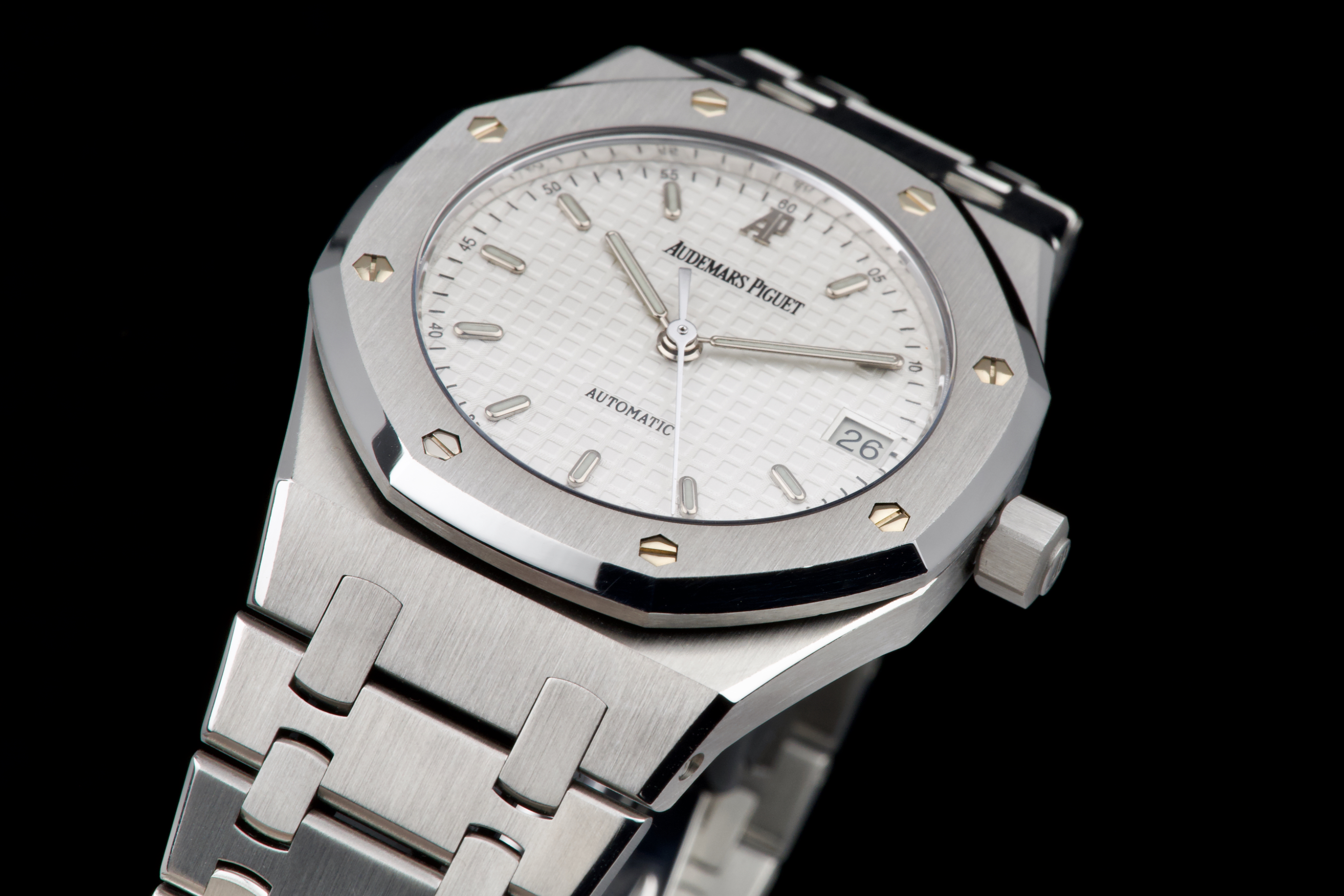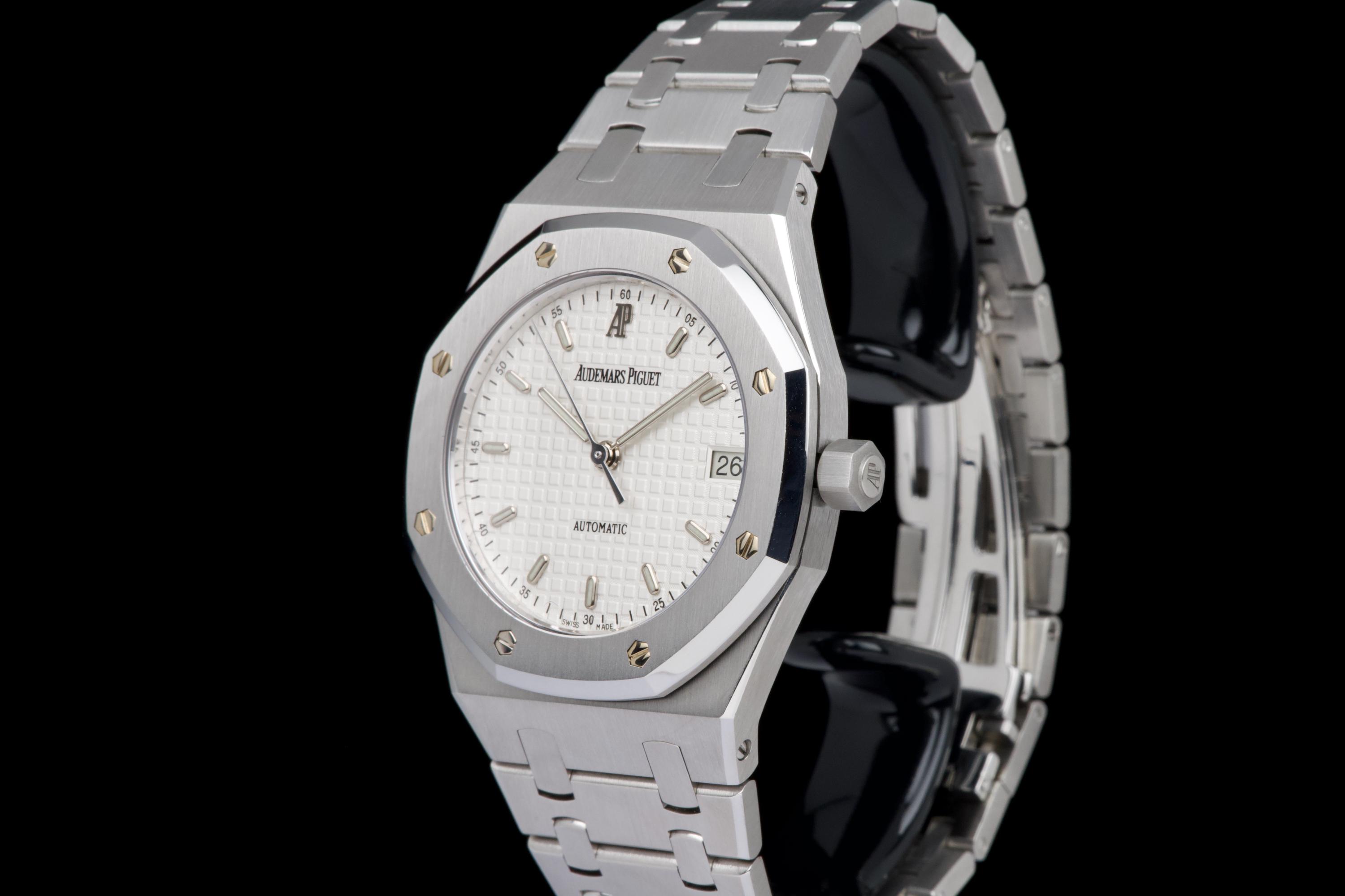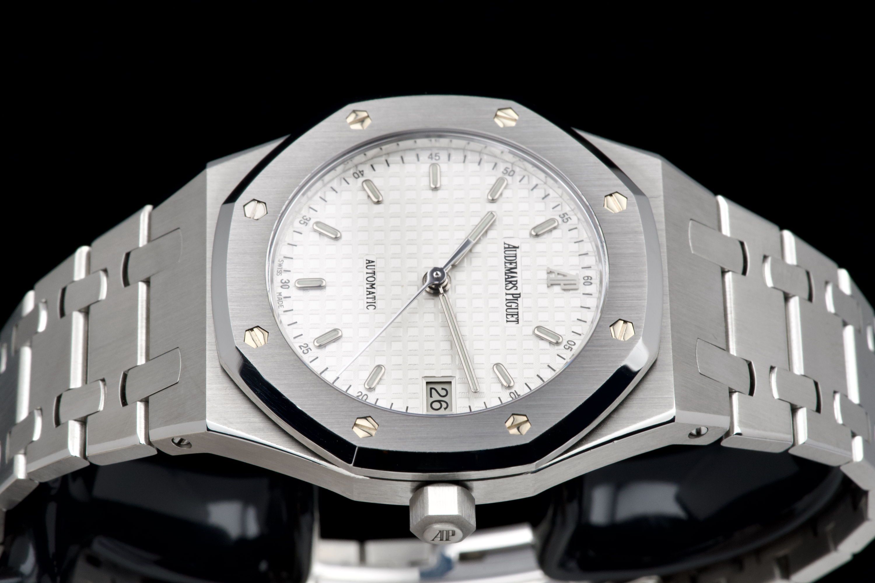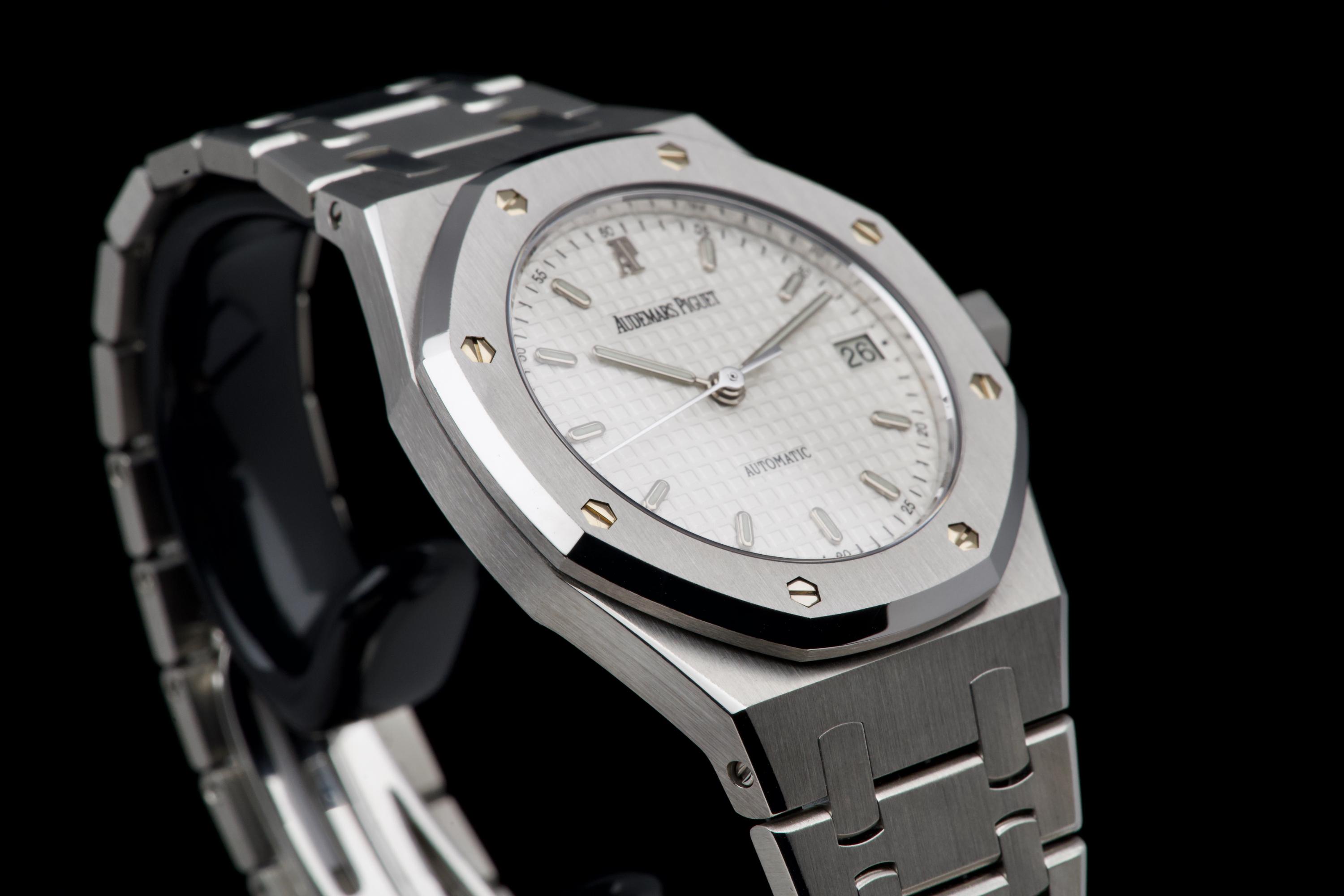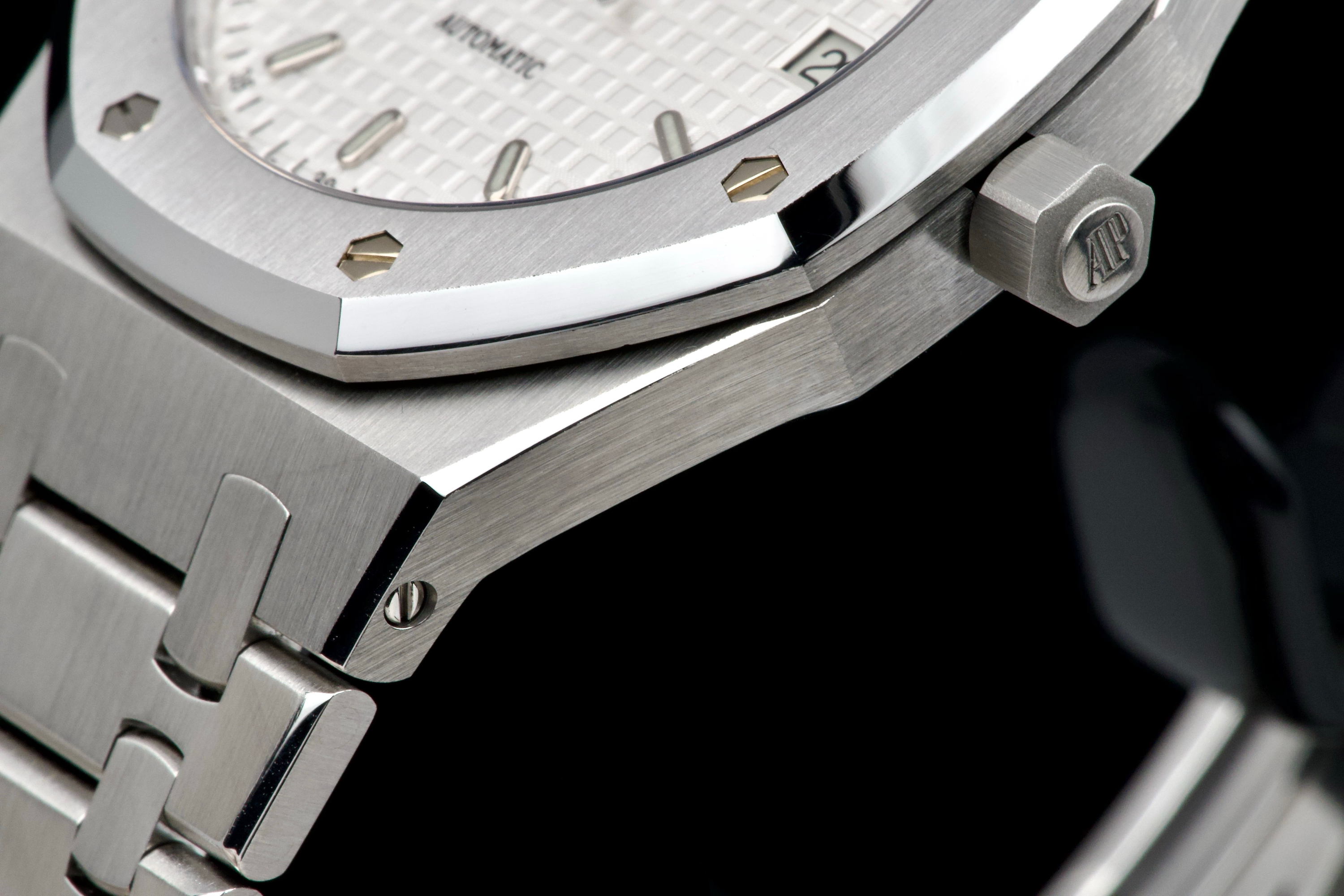 An exceptional and likely unique example of the Audemars Piguet Royal Oak 14790ST, featuring a white tapisserie dial and an engraving of the number “1” on the caseback. This same number “1” is also printed on the original warranty papers next to the case number, confirming that it was factory-delivered this way — not a later addition. The watch has just returned from a complete service (including light polishing) by Audemars Piguet in 2025, and is therefore covered by a two-year AP service warranty. It is in outstanding condition, with a sharp and clean case, and a bracelet showing minimal stretch, with all links present. Complete with its original box and papers. A superb and highly unusual Royal Oak 14790 — combining rarity, provenance, and freshly serviced condition.