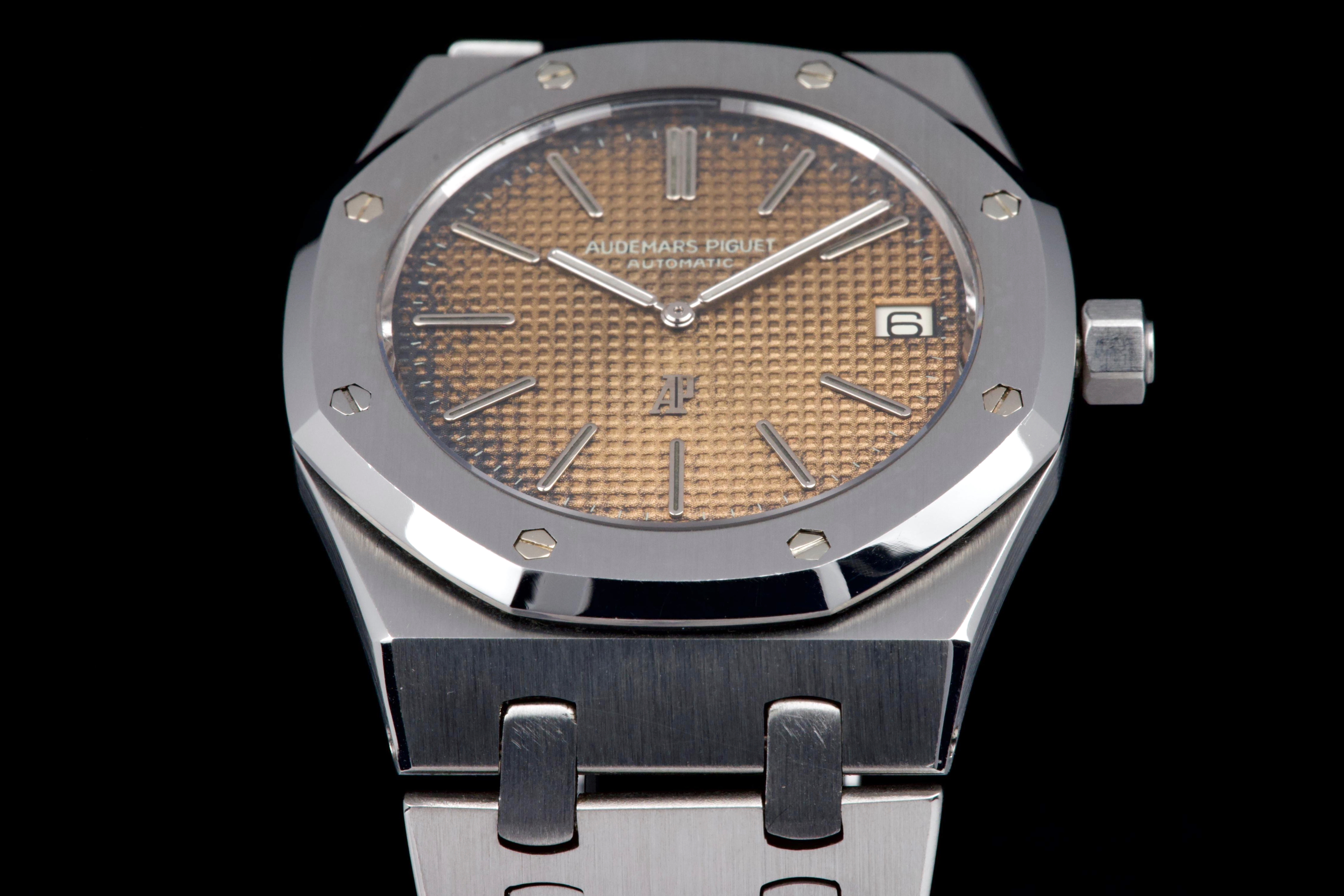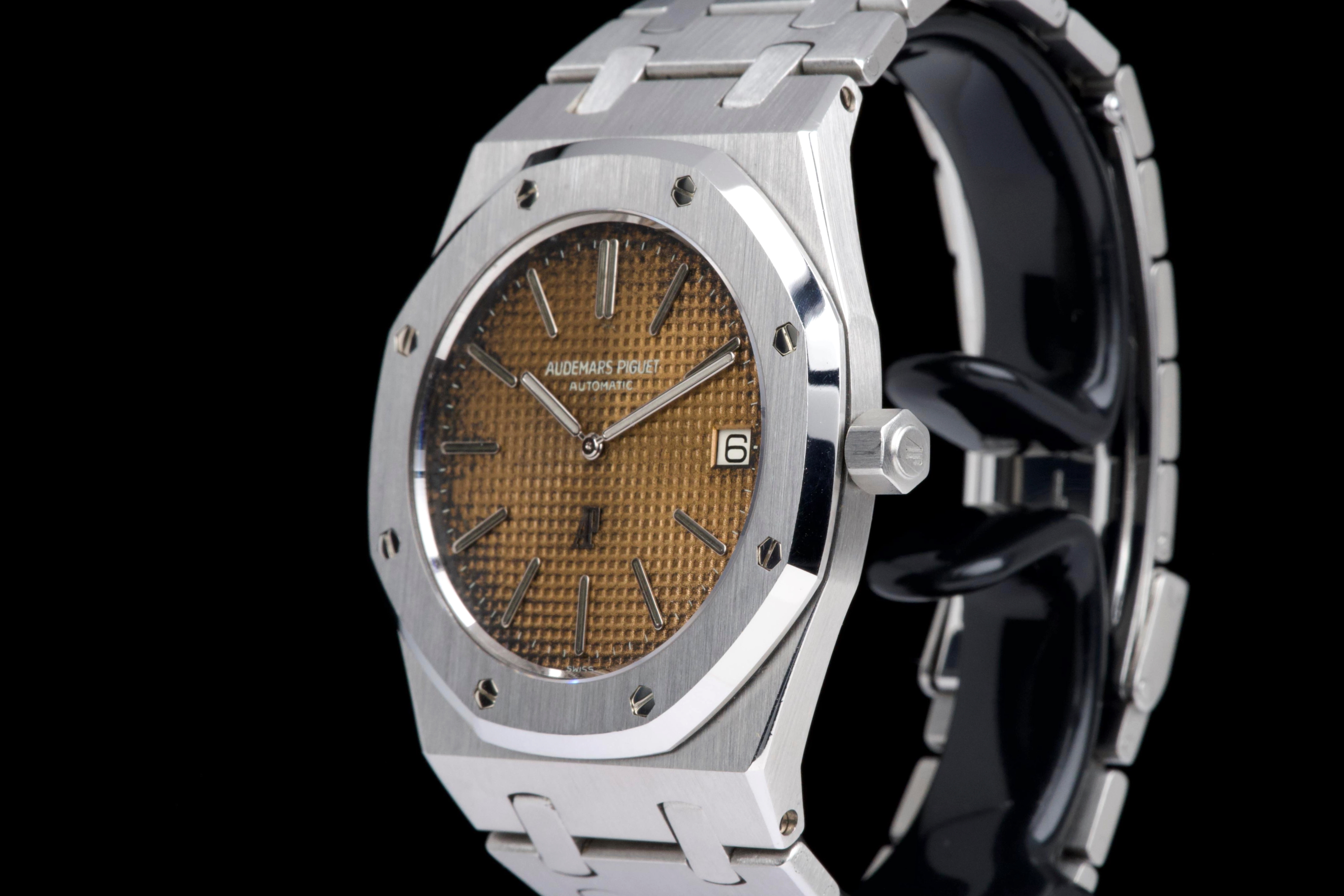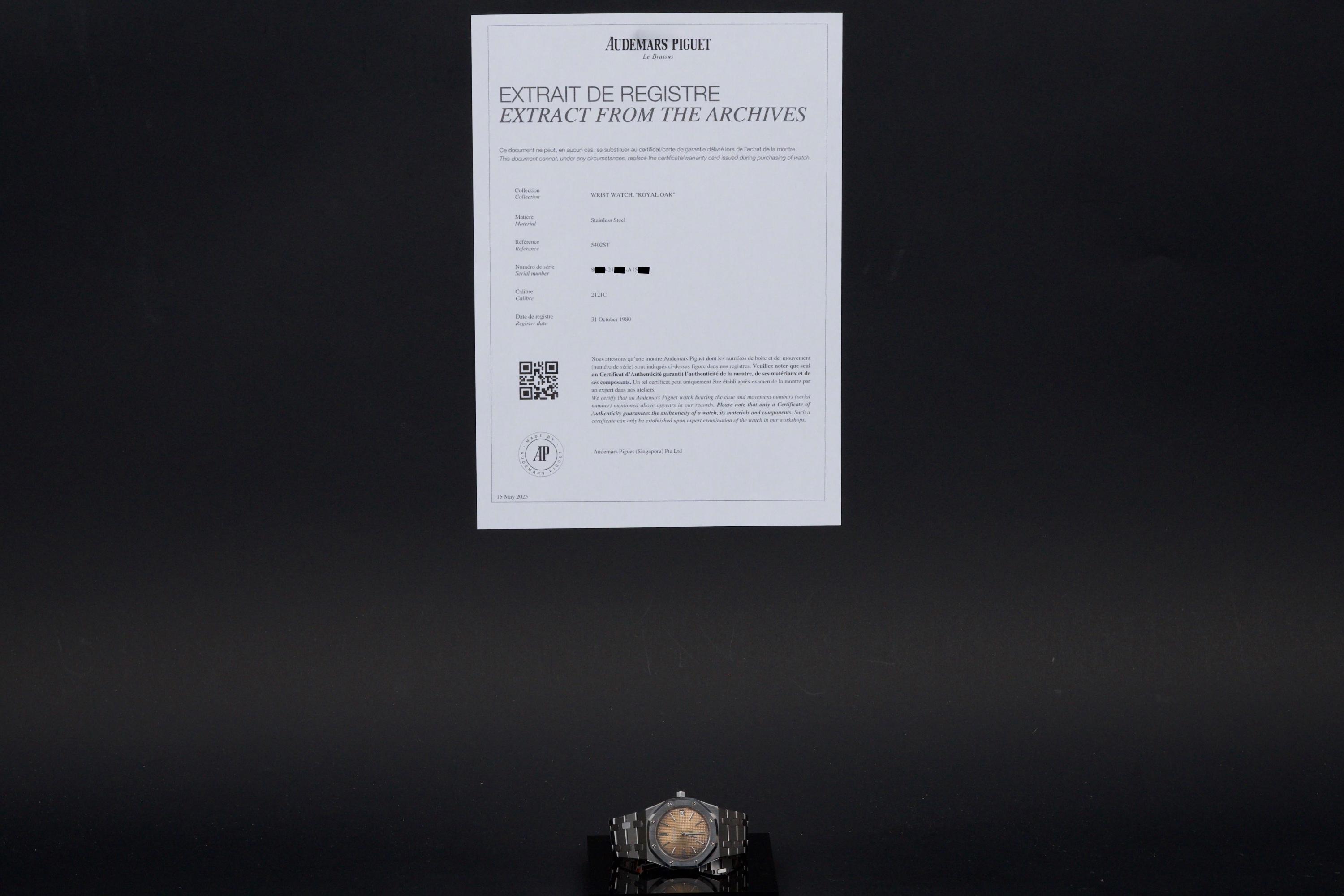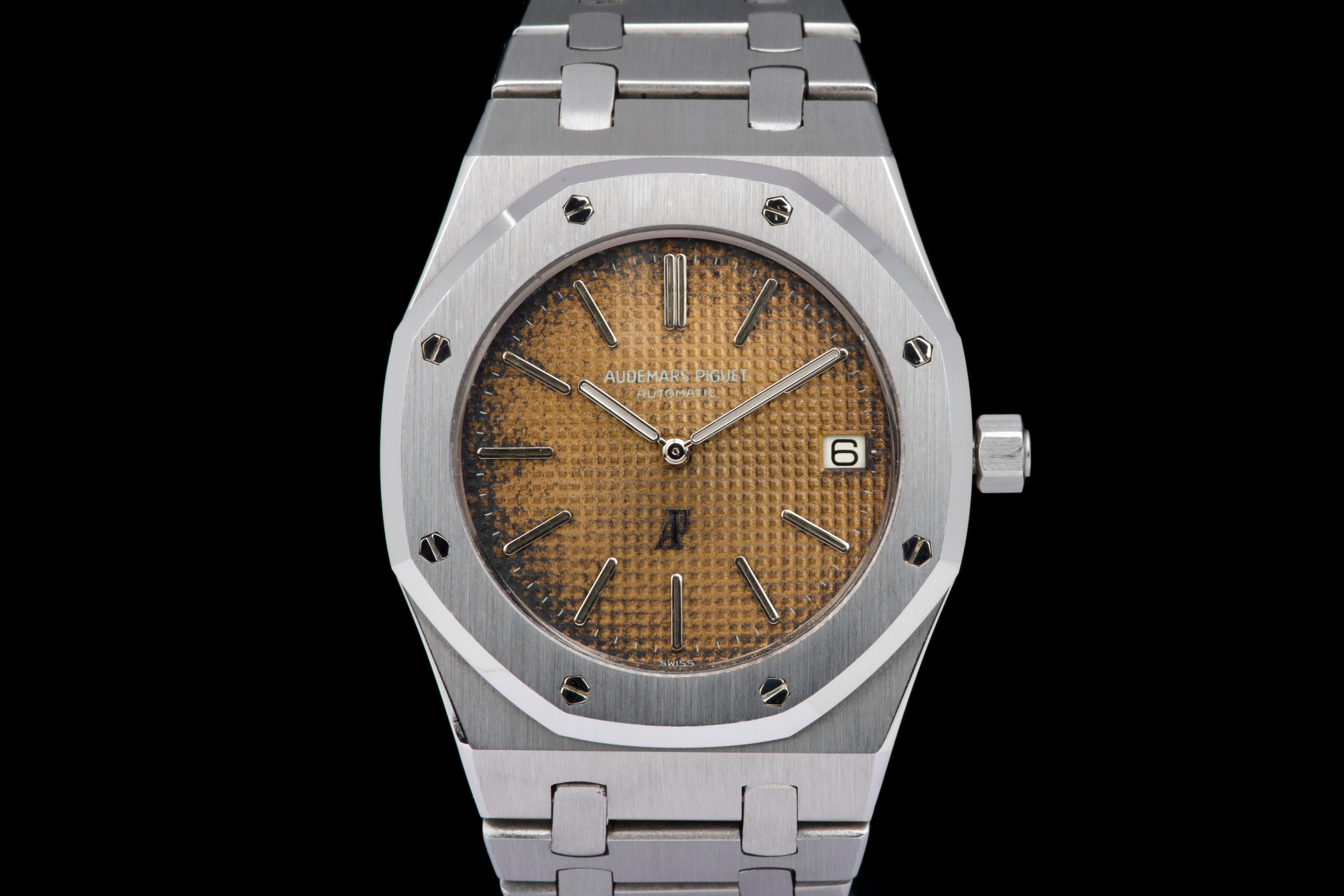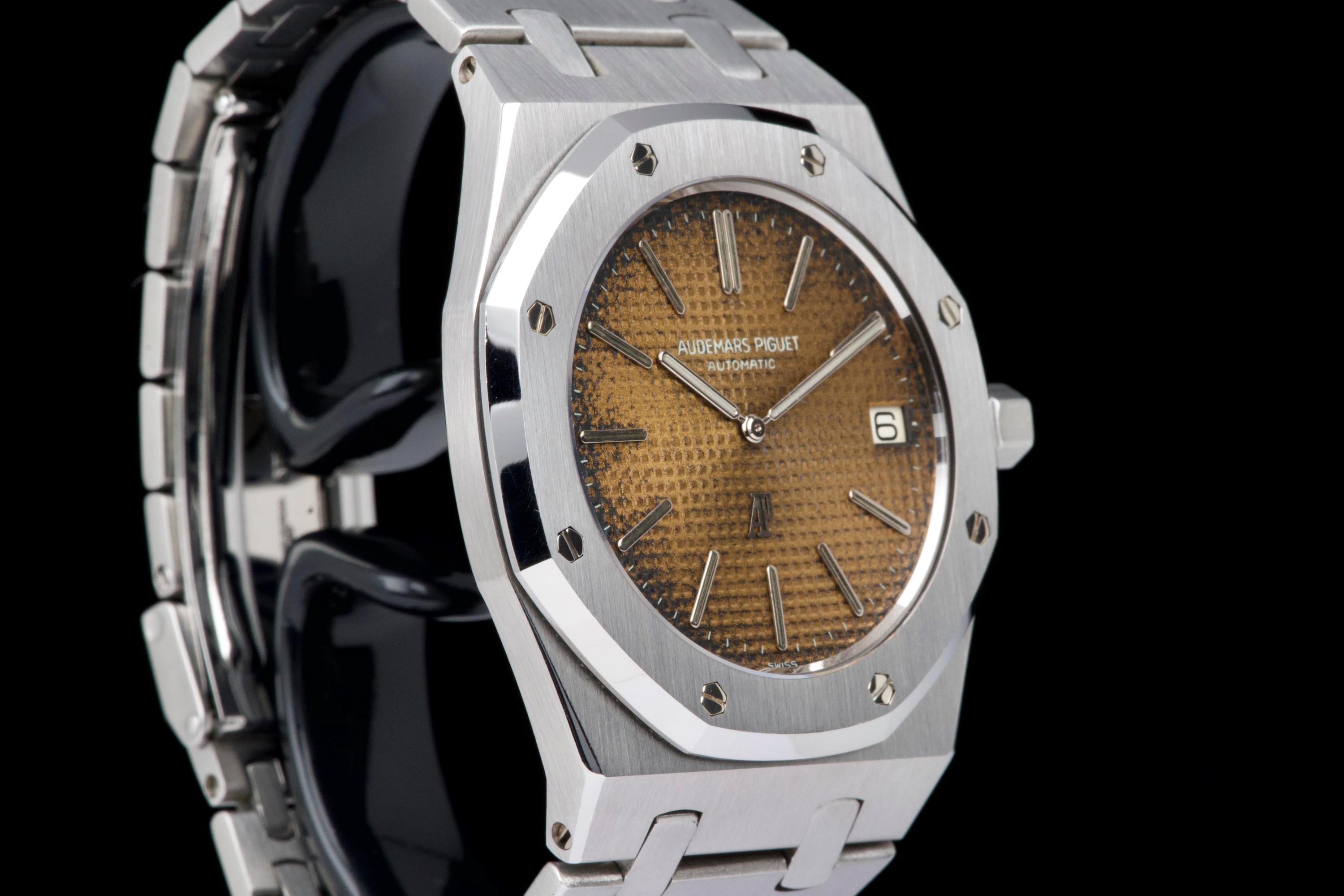 Presented here is a highly attractive vintage example of the Audemars Piguet Royal Oak reference 5402ST, bearing an A-series serial (A15XX). As one of the earliest generations of Gérald Genta’s groundbreaking design, the 5402 represents a cornerstone in the history of modern luxury sports watches. The stainless steel case has been recently polished and presents in very good overall condition, retaining the sharp architectural lines that define the Royal Oak aesthetic. The watch is distinguished by a beautiful tropical dial that has aged to an exceptional caramel tone, giving the piece a particularly warm and desirable vintage character. The dial’s patina is both even and visually striking, making this example especially appealing to collectors. The watch is fitted with service hands and a service crown, while retaining its original date disk. The integrated stainless steel bracelet is original to the watch and shows only very light stretch from use, and is completed by its original clasp. Accompanied by an extract from the Audemars Piguet archives dated October 31, 1980, this example provides documented provenance. Based on the serial number, the production of the watch is believed to date to approximately 1975. A compelling opportunity to acquire an early Royal Oak 5402ST with a superb tropical dial, combining historical importance, strong originality, and highly desirable vintage character.
