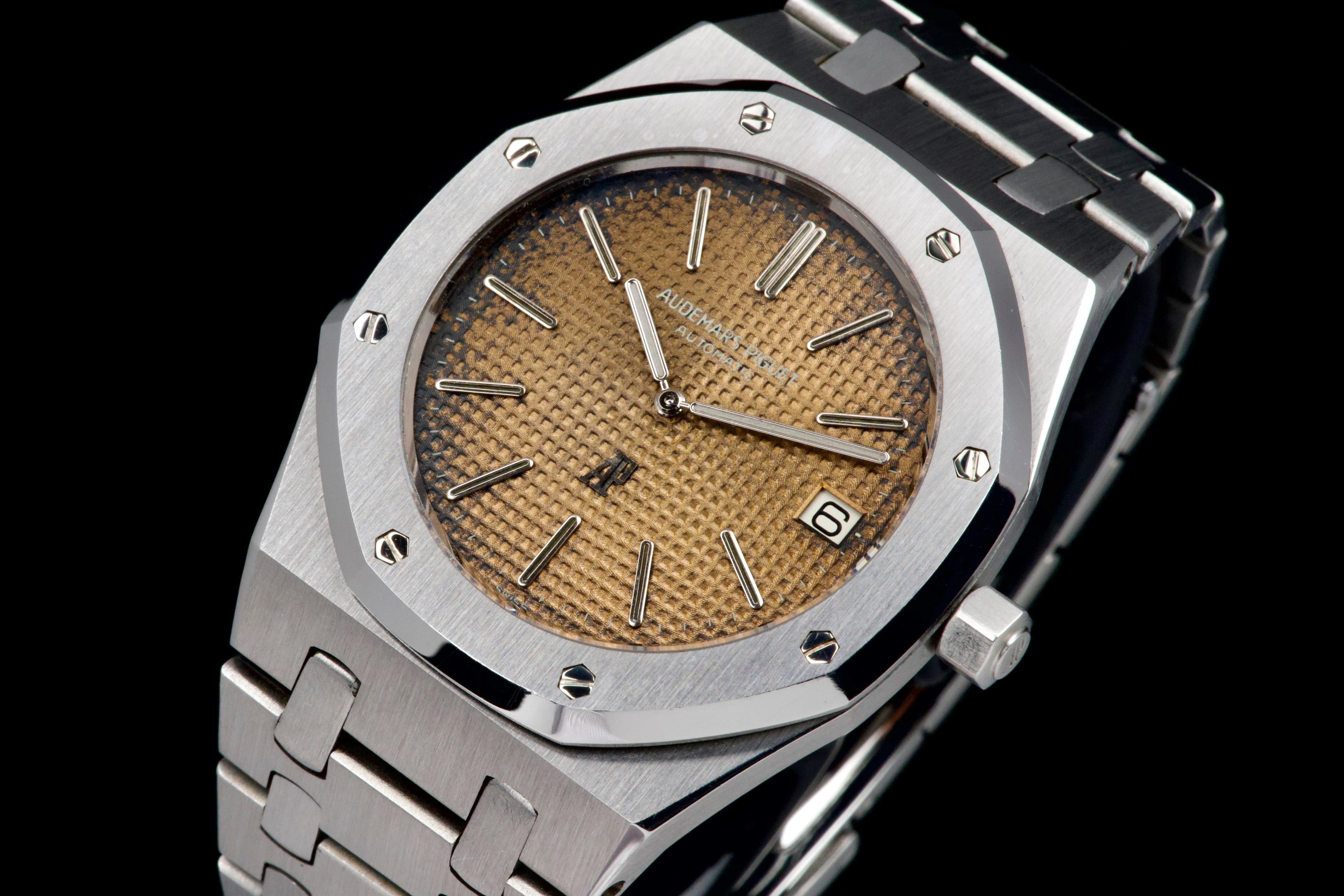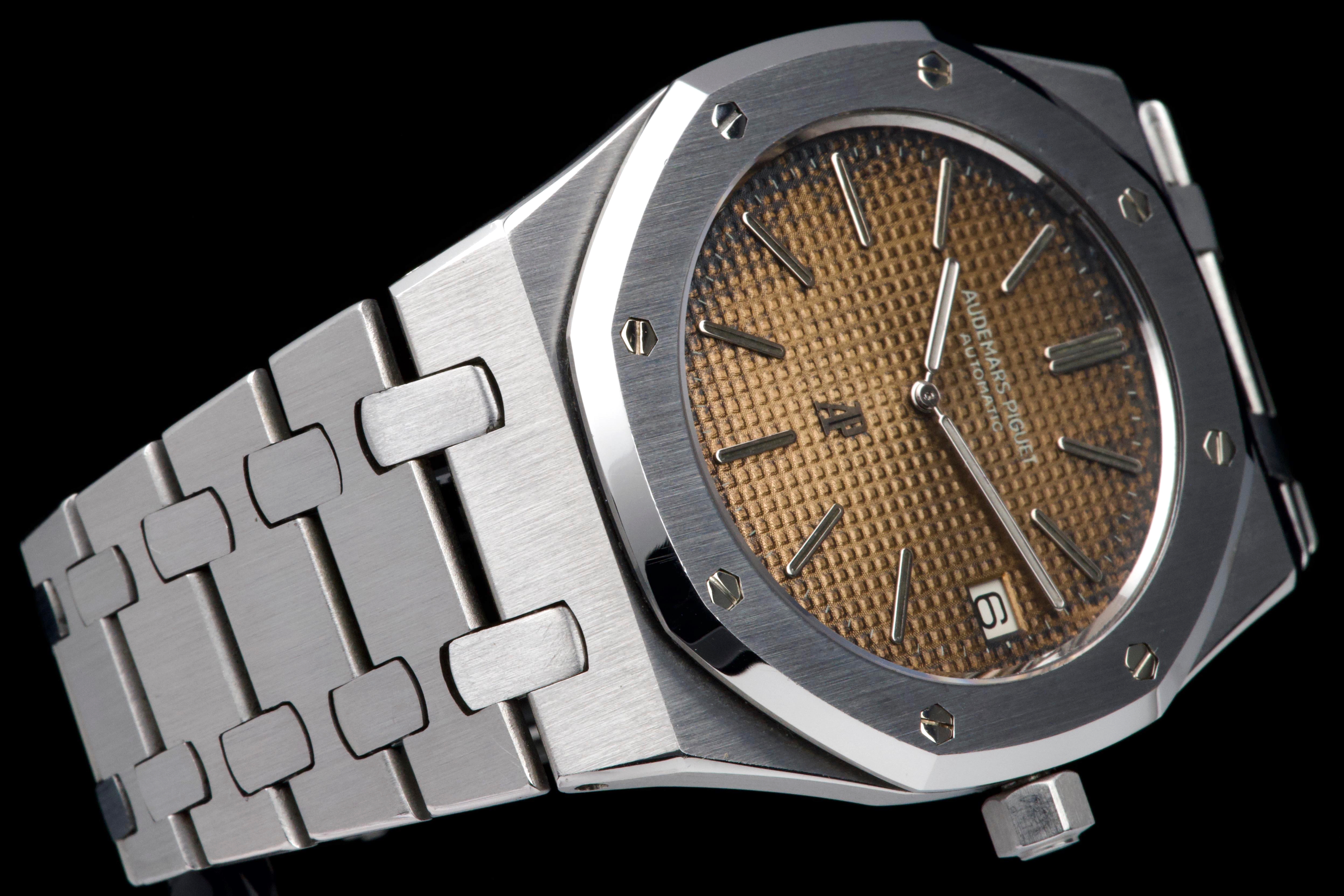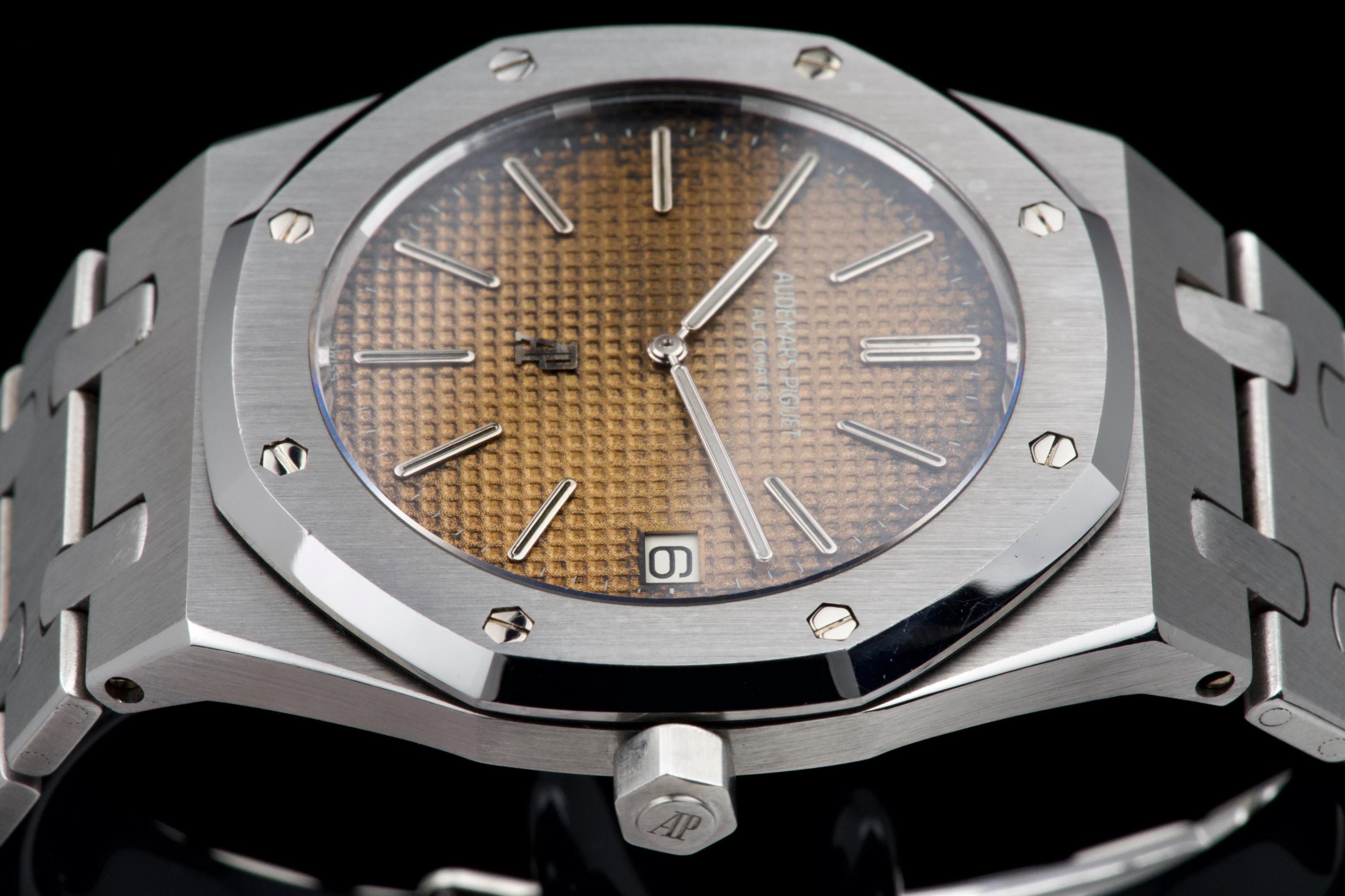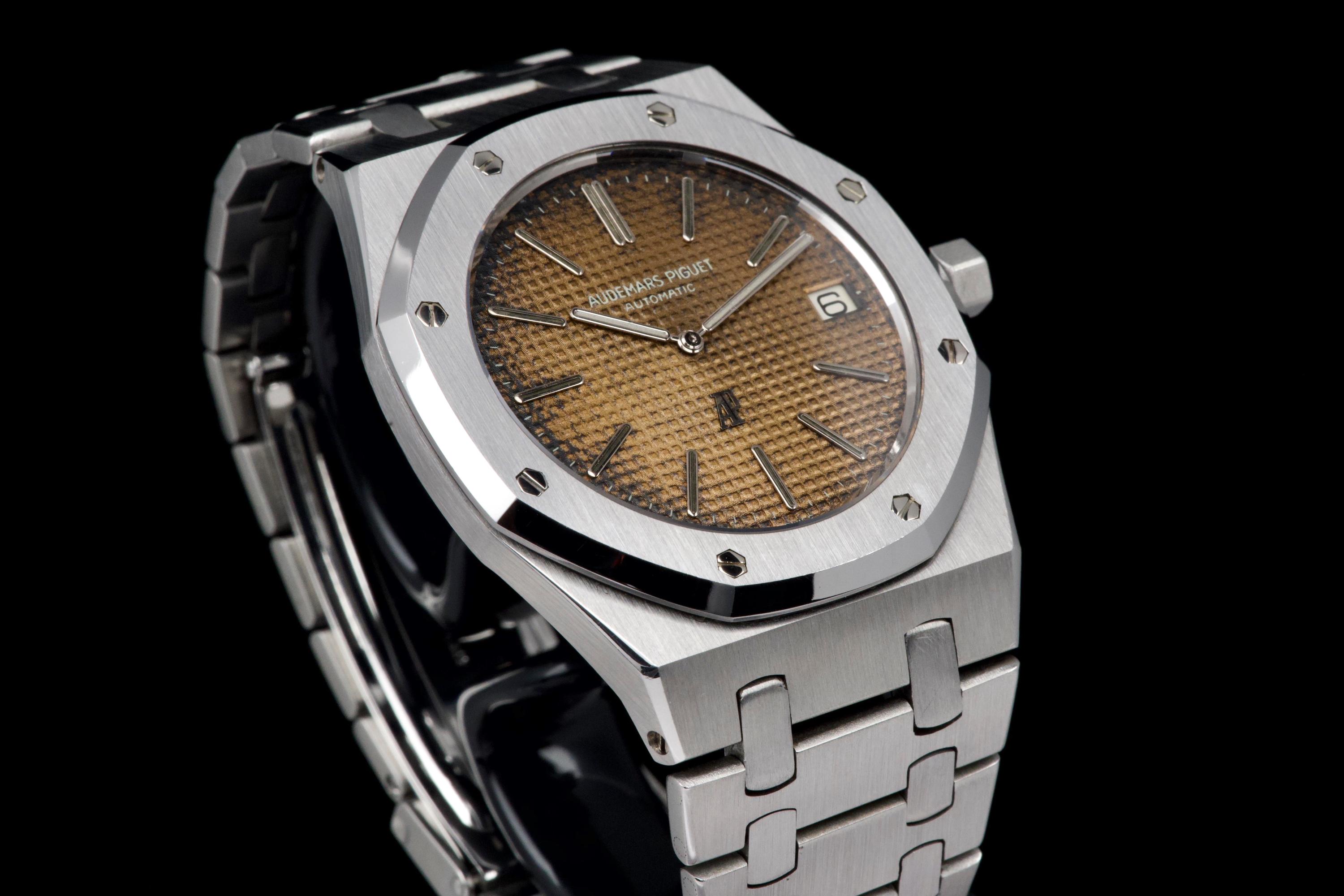 Presented here is a highly attractive vintage example of the Audemars Piguet Royal Oak reference 5402ST, bearing an A-series serial (A15XX). As one of the earliest generations of Gérald Genta’s groundbreaking design, the 5402 represents a cornerstone in the history of modern luxury sports watches. The stainless steel case has been recently polished and presents in very good overall condition, retaining the sharp architectural lines that define the Royal Oak aesthetic. The watch is distinguished by a beautiful tropical dial that has aged to an exceptional caramel tone, giving the piece a particularly warm and desirable vintage character. The dial’s patina is both even and visually striking, making this example especially appealing to collectors. The watch is fitted with service hands and a service crown, while retaining its original date disk. The integrated stainless steel bracelet is original to the watch and shows only very light stretch from use, and is completed by its original clasp. Accompanied by an extract from the Audemars Piguet archives dated October 31, 1980, this example provides documented provenance. Based on the serial number, the production of the watch is believed to date to approximately 1975. A compelling opportunity to acquire an early Royal Oak 5402ST with a superb tropical dial, combining historical importance, strong originality, and highly desirable vintage character.