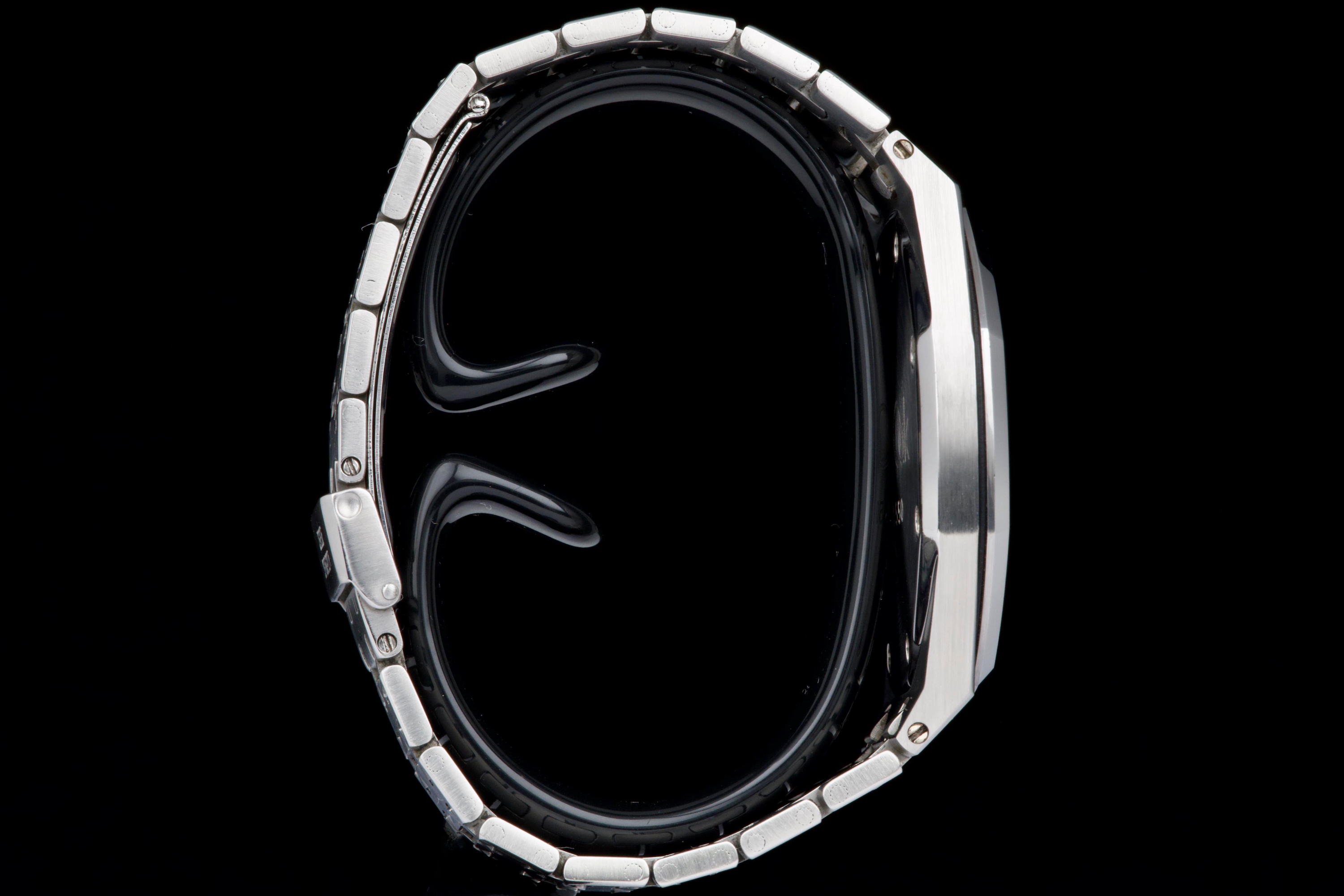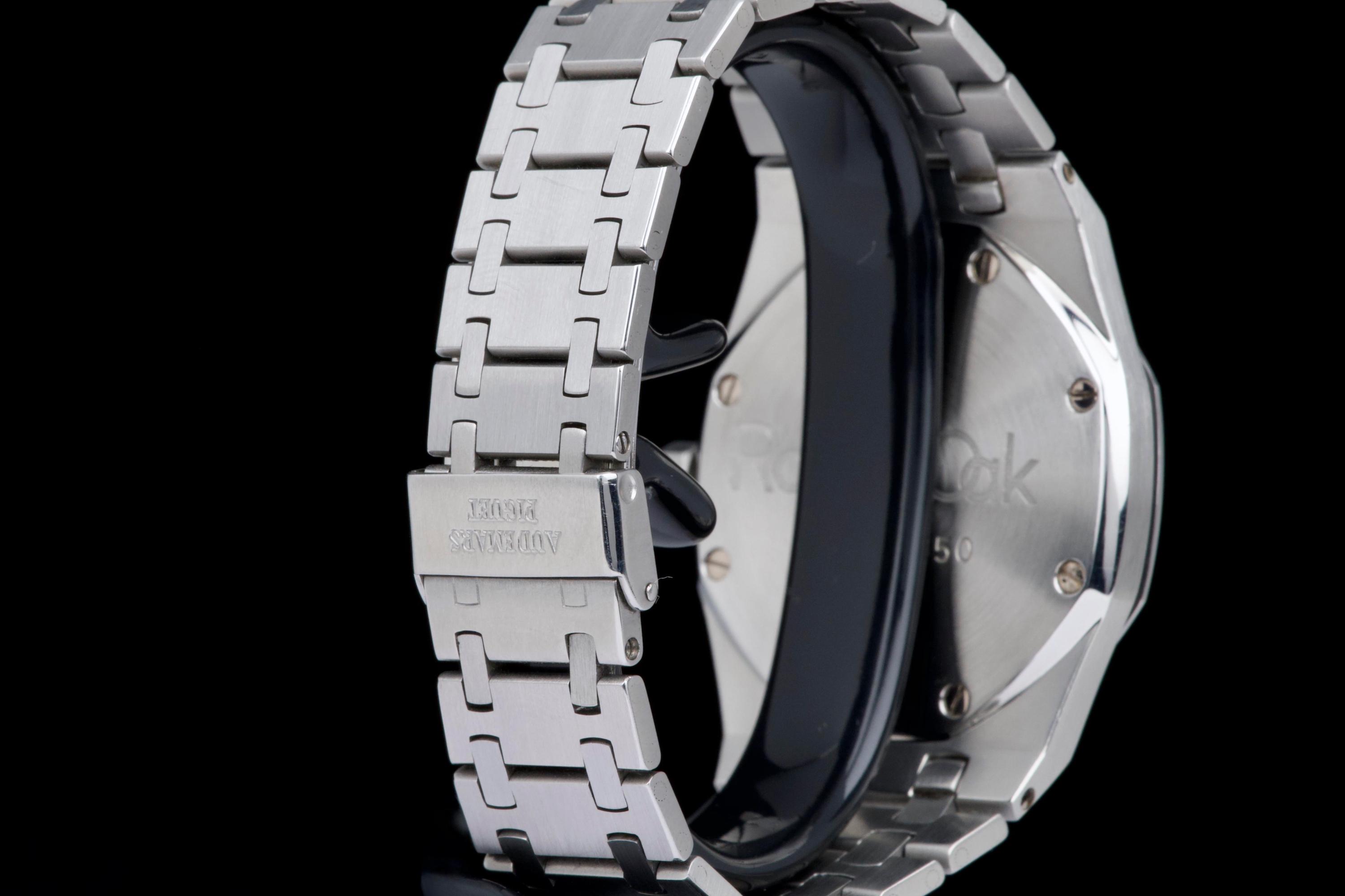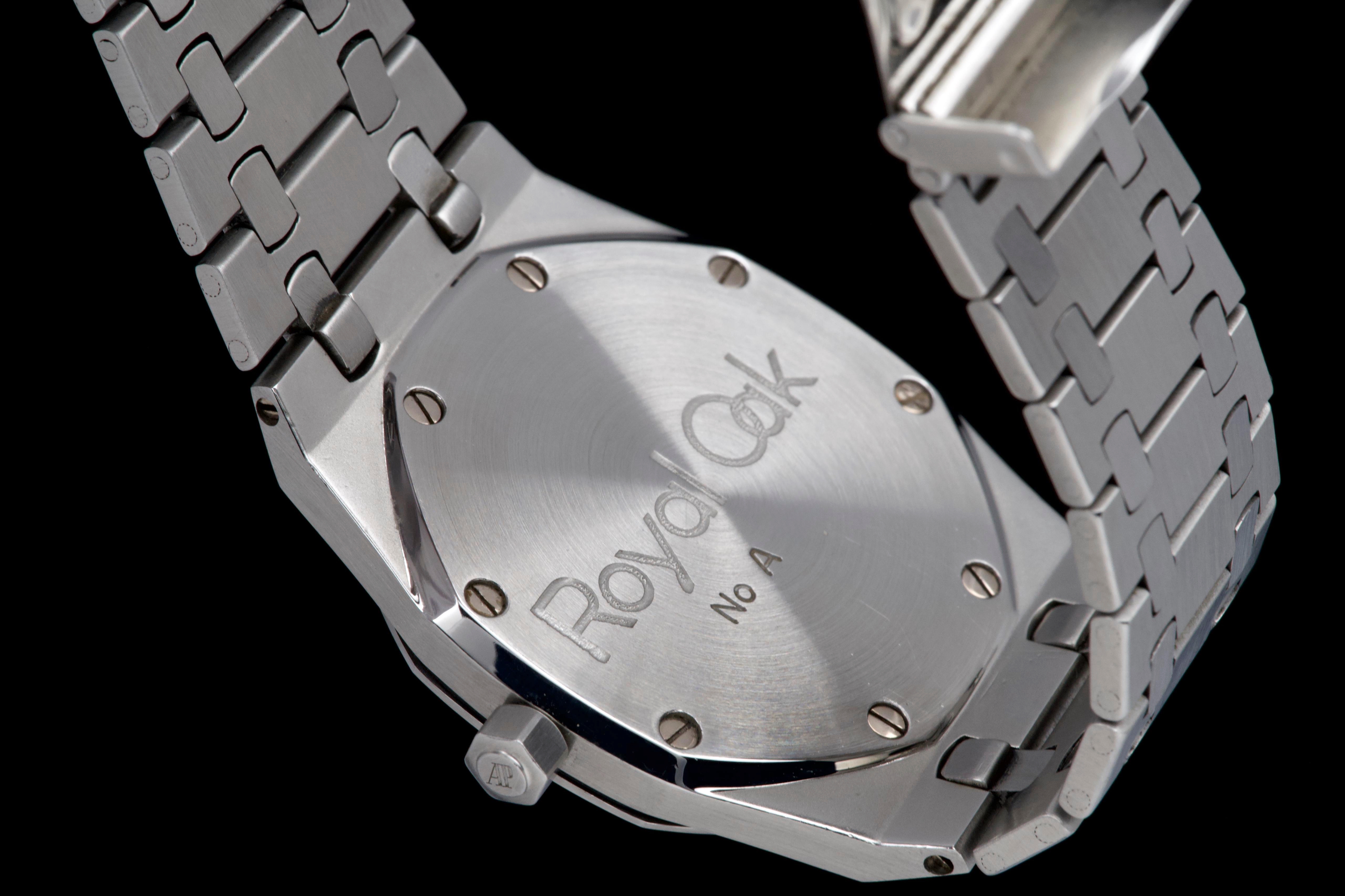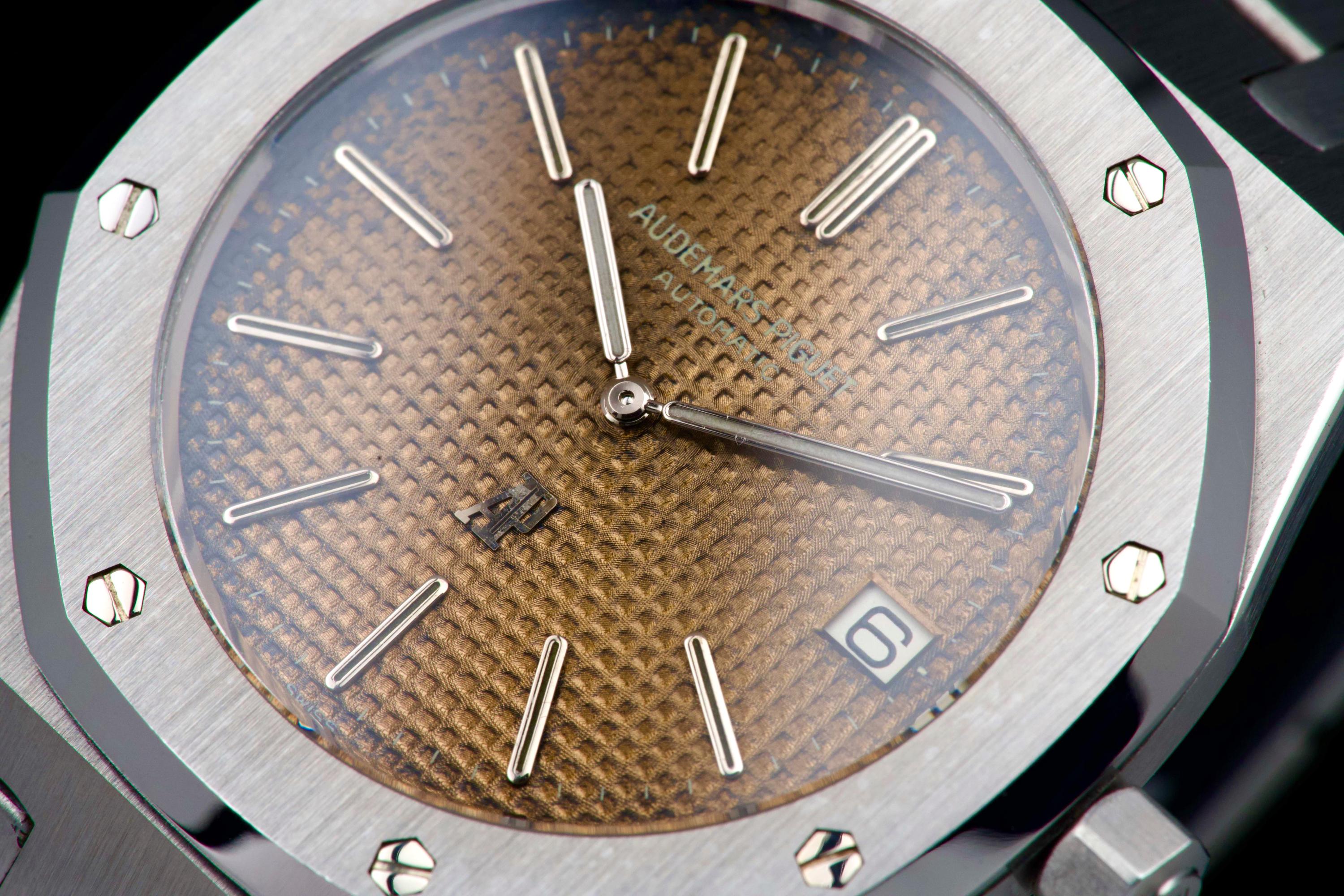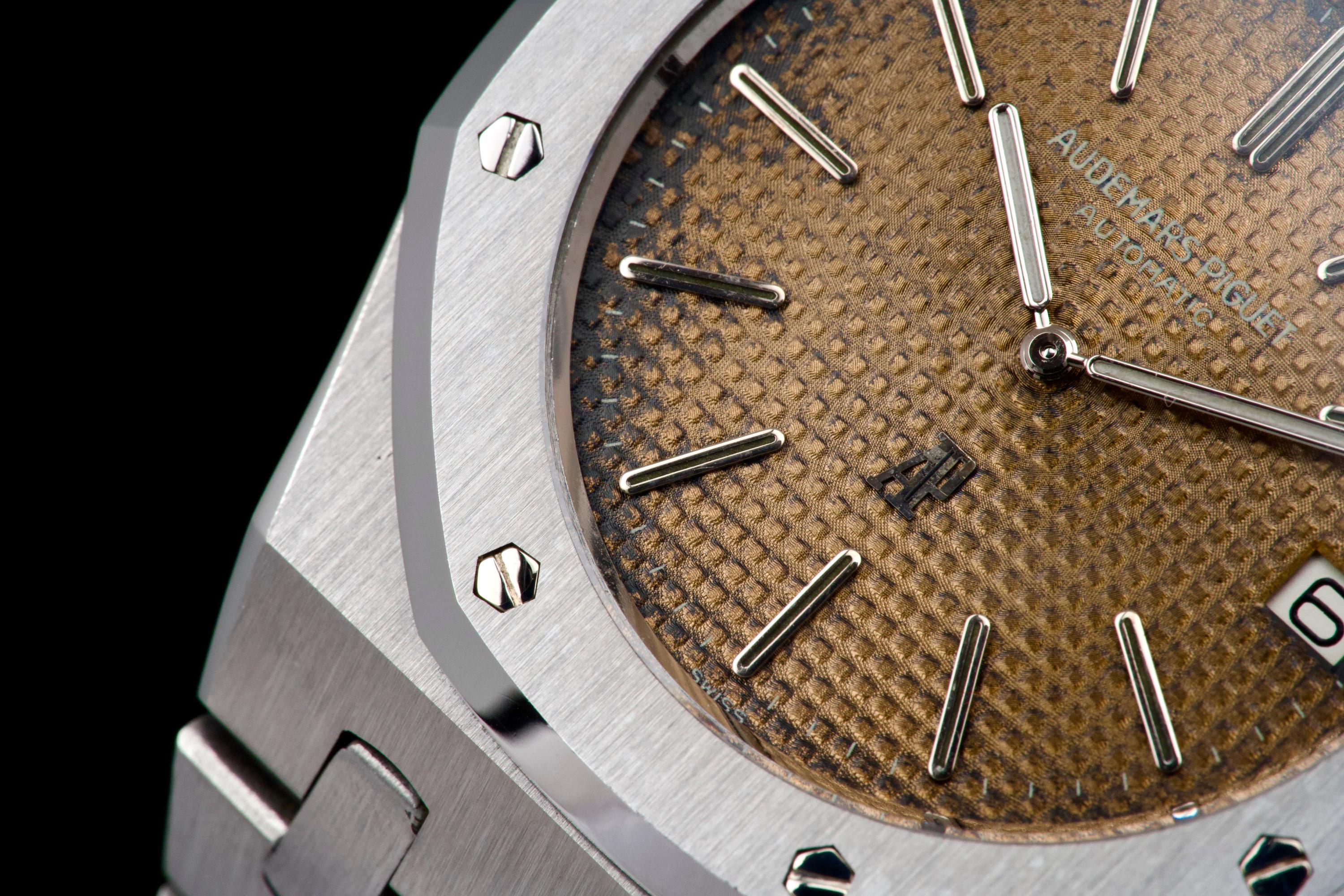 Presented here is a highly attractive vintage example of the Audemars Piguet Royal Oak reference 5402ST, bearing an A-series serial (A15XX). As one of the earliest generations of Gérald Genta’s groundbreaking design, the 5402 represents a cornerstone in the history of modern luxury sports watches. The stainless steel case has been recently polished and presents in very good overall condition, retaining the sharp architectural lines that define the Royal Oak aesthetic. The watch is distinguished by a beautiful tropical dial that has aged to an exceptional caramel tone, giving the piece a particularly warm and desirable vintage character. The dial’s patina is both even and visually striking, making this example especially appealing to collectors. The watch is fitted with service hands and a service crown, while retaining its original date disk. The integrated stainless steel bracelet is original to the watch and shows only very light stretch from use, and is completed by its original clasp. Accompanied by an extract from the Audemars Piguet archives dated October 31, 1980, this example provides documented provenance. Based on the serial number, the production of the watch is believed to date to approximately 1975. A compelling opportunity to acquire an early Royal Oak 5402ST with a superb tropical dial, combining historical importance, strong originality, and highly desirable vintage character.