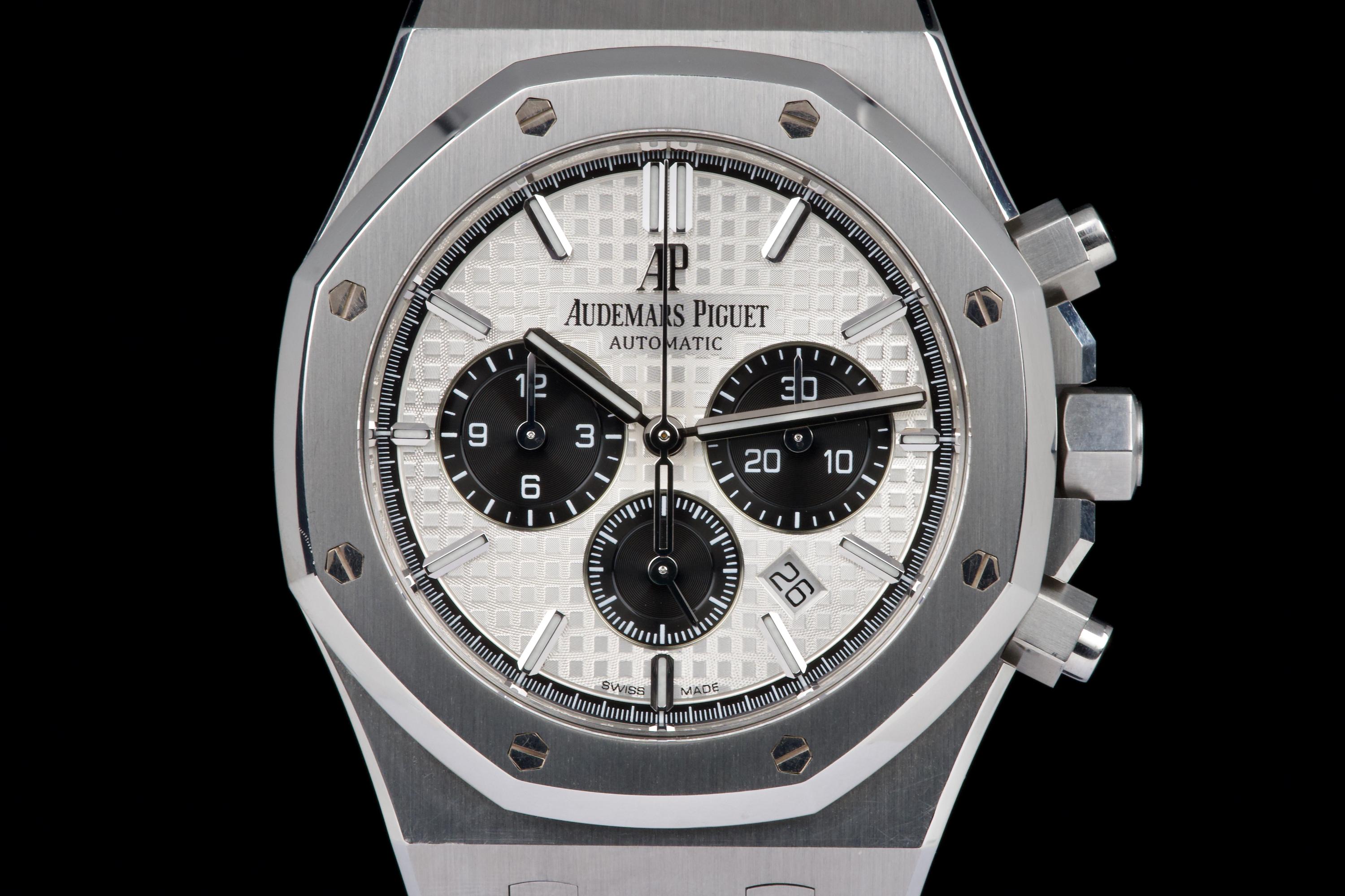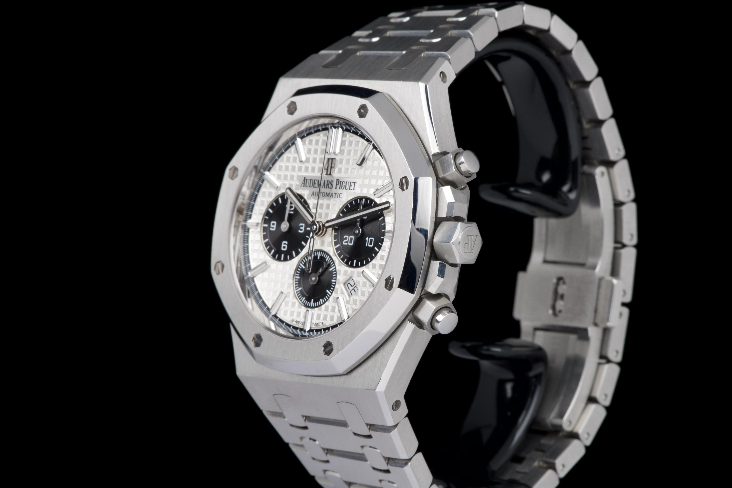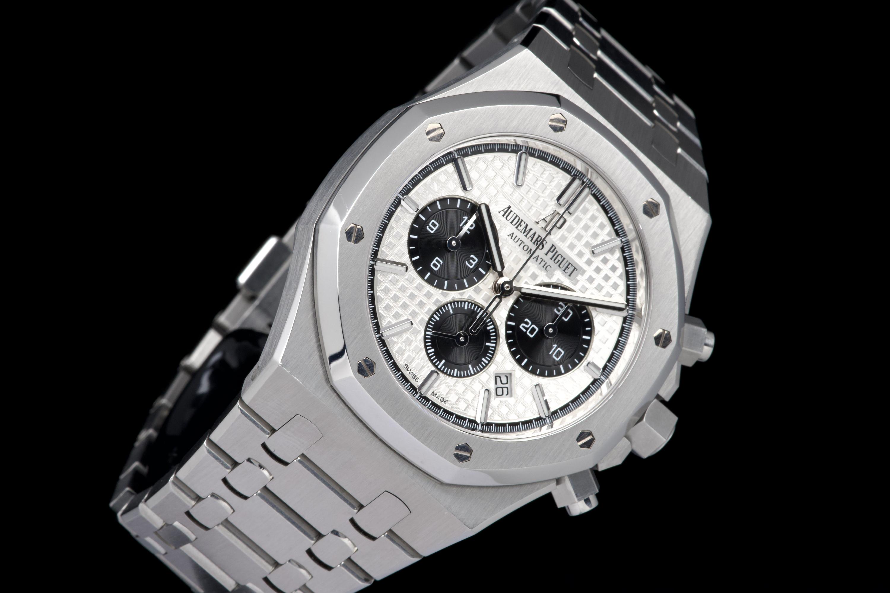 A beautiful example of the Audemars Piguet Royal Oak Chronograph 41 mm “Panda”, featuring the iconic silver dial with black subdials. The watch has been lightly polished in the past and is presented in excellent overall condition, showing only minor marks and hairlines from careful wear. The dial and hands are flawless, and the bracelet shows no stretch, retaining its crisp articulation. Powered by the Audemars Piguet caliber 2385, the movement has been checked by our watchmaker and runs perfectly. Complete with its original box, warranty card, and booklets. A superb example of the highly desirable Royal Oak Chronograph “Panda” — elegant, sporty, and beautifully preserved.