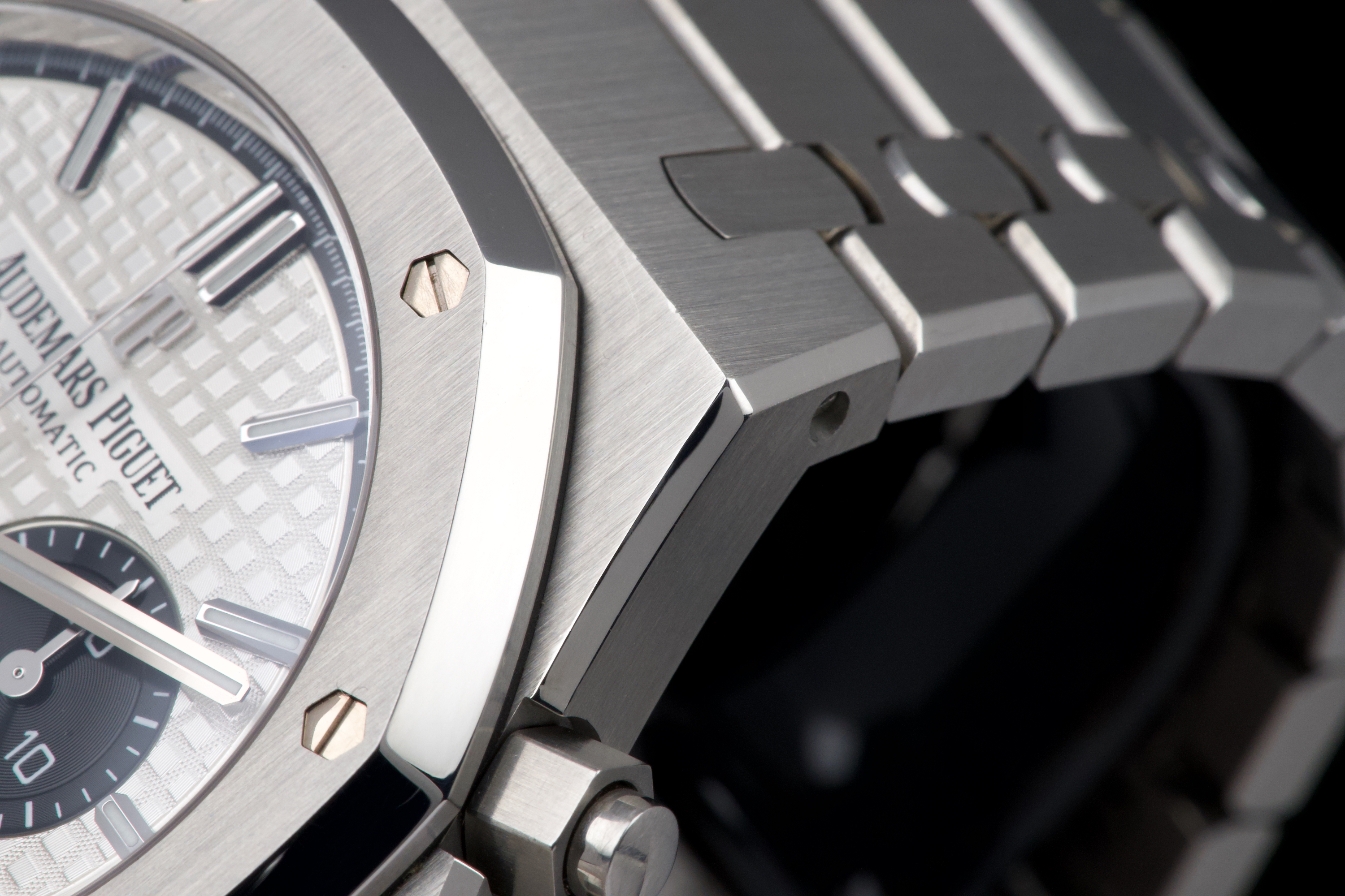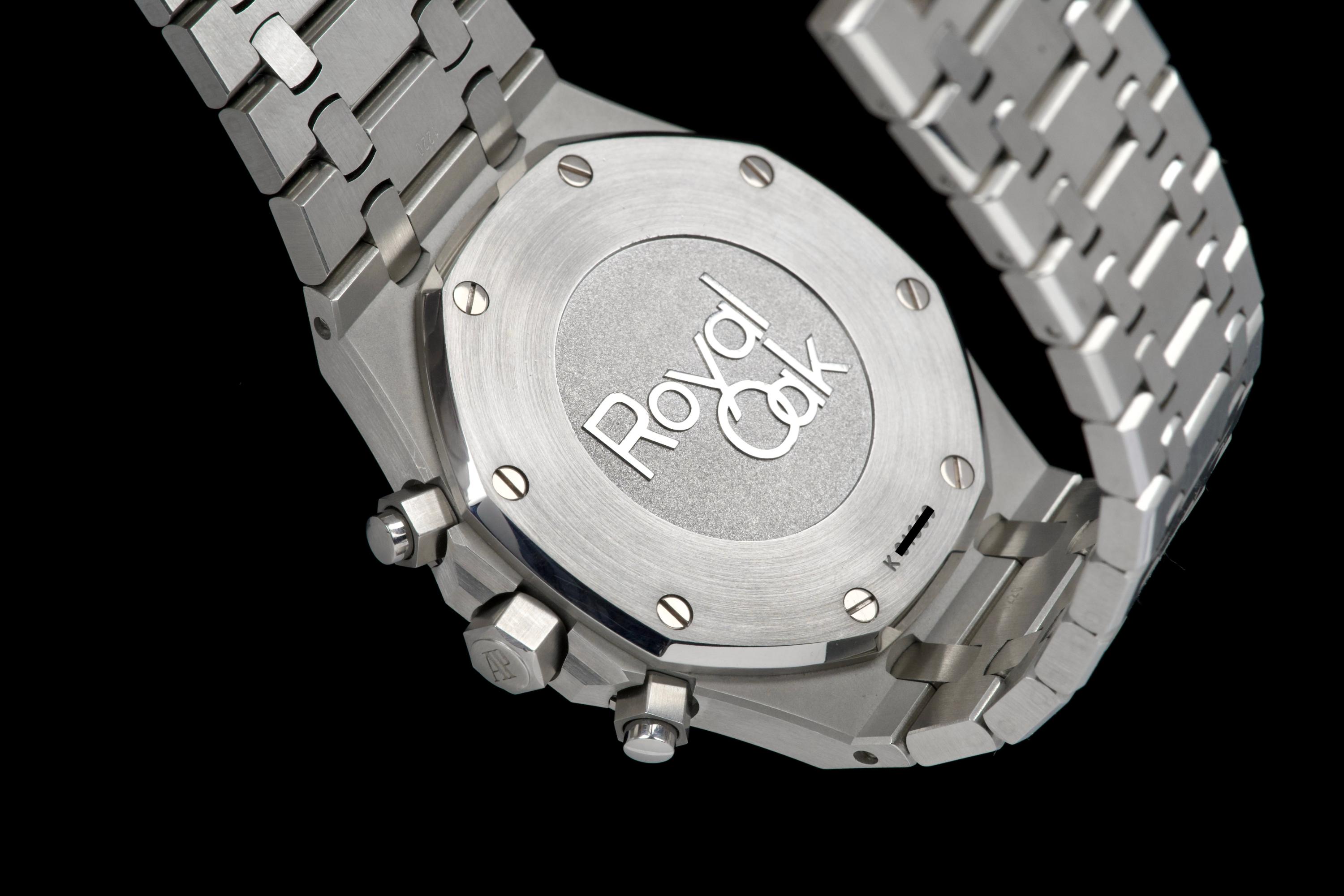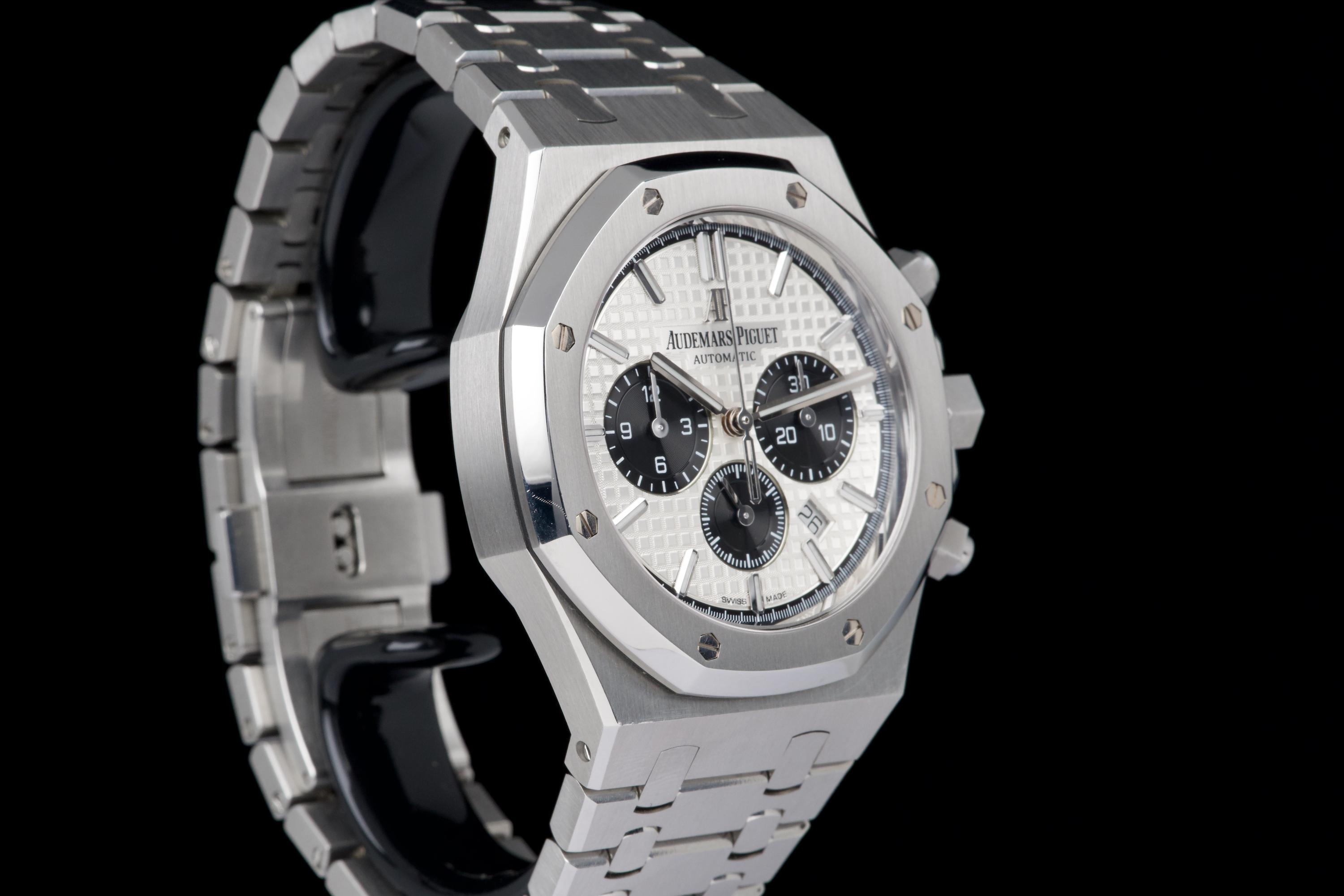 A beautiful example of the Audemars Piguet Royal Oak Chronograph 41 mm “Panda”, featuring the iconic silver dial with black subdials. The watch has been lightly polished in the past and is presented in excellent overall condition, showing only minor marks and hairlines from careful wear. The dial and hands are flawless, and the bracelet shows no stretch, retaining its crisp articulation. Powered by the Audemars Piguet caliber 2385, the movement has been checked by our watchmaker and runs perfectly. Complete with its original box, warranty card, and booklets. A superb example of the highly desirable Royal Oak Chronograph “Panda” — elegant, sporty, and beautifully preserved.