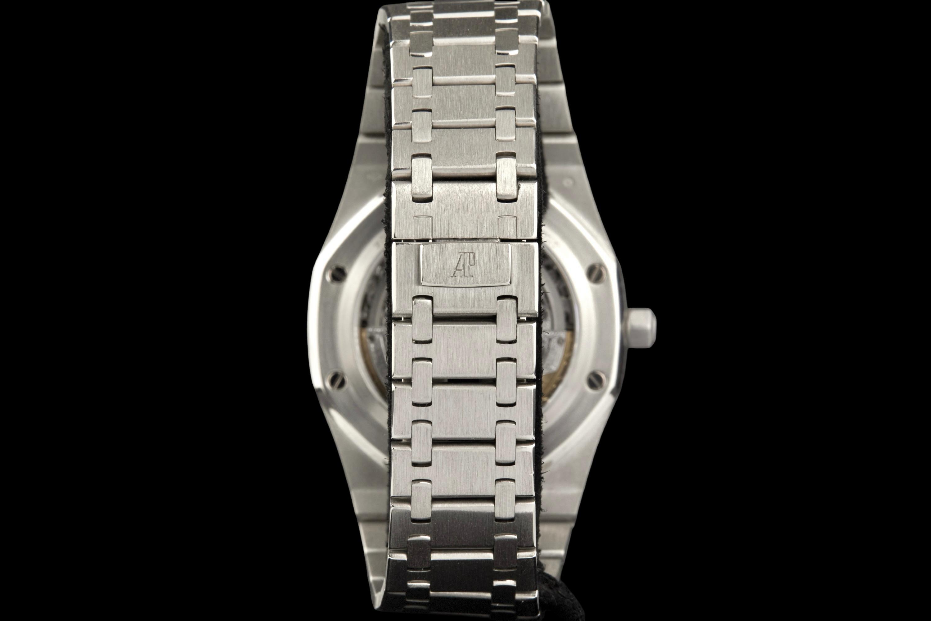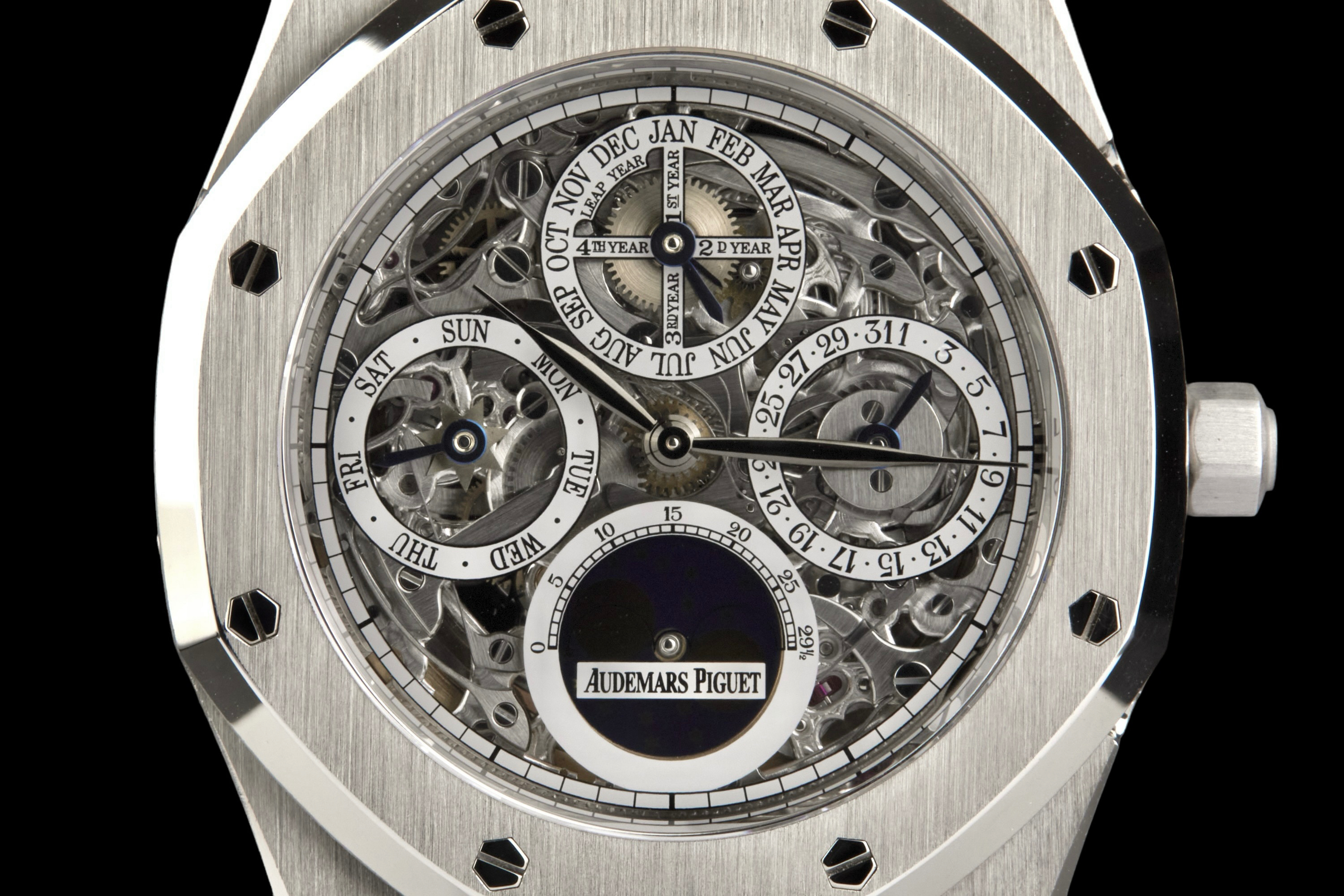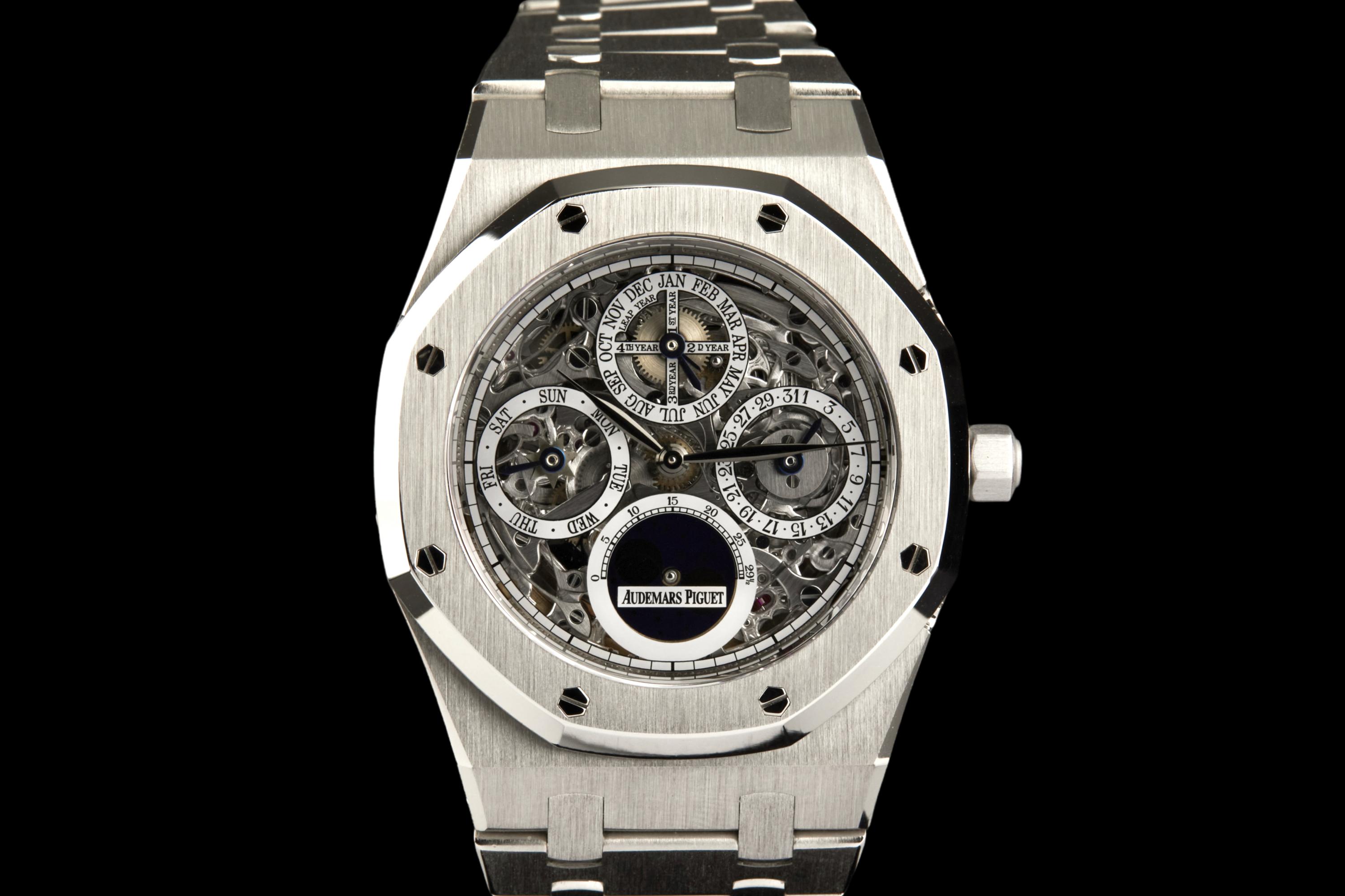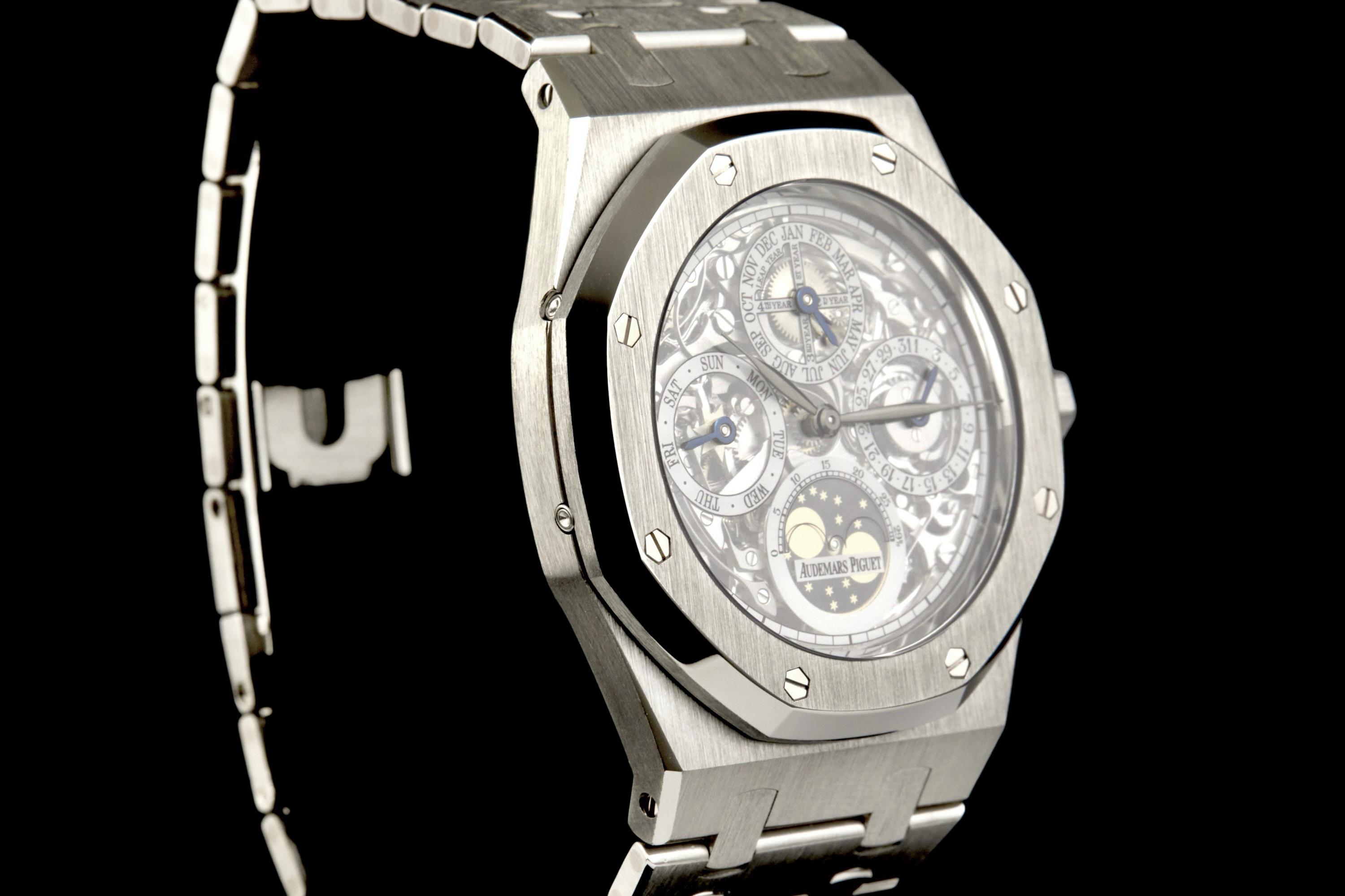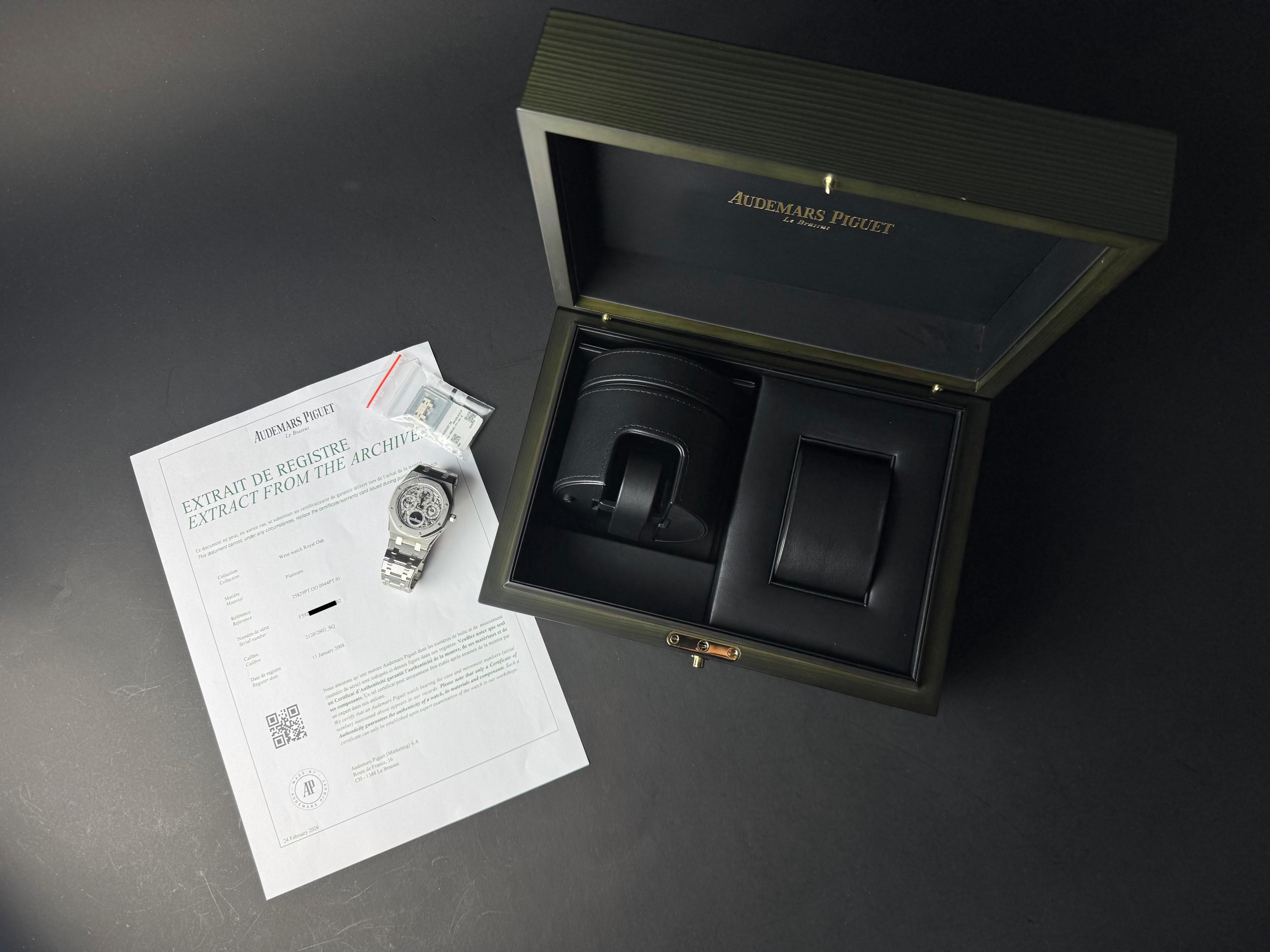 Audemars Piguet Royal Oak Quantième Perpétuel Squelette, reference 25829PT.00.0944PT.01, platinum openworked wristwatch with bracelet, Extract from the Archives, circa 2008. A highly sophisticated and visually arresting interpretation of one of Audemars Piguet’s most celebrated complications, the present Royal Oak Quantième Perpétuel Squelette reference 25829PT.00.0944PT.01 combines the technical refinement of a perpetual calendar with the architectural beauty of an openworked movement. Produced in 2008, this exceptional timepiece is crafted entirely in platinum, from its iconic Royal Oak case to its integrated bracelet, offering both substantial presence and unmistakable exclusivity. The skeletonised dial reveals the remarkable complexity of the movement, while preserving the balanced display of the perpetual calendar indications, including the day, date, month, leap year and moon phases. The openworked construction showcases Audemars Piguet’s expertise in both high complication and traditional finishing, lending the watch extraordinary visual depth and mechanical character. The watch has been polished in the past and is today presented in excellent overall condition, with the case and bracelet retaining a very attractive appearance. It is accompanied by an Extract from the Audemars Piguet Archives, confirming its production in 2008, as well as a more recent Audemars Piguet winder box. Although no service history is available, the watch is reported to be functioning perfectly at the time of cataloguing. A rare and highly collectible Royal Oak, this perpetual calendar skeleton in platinum stands as a compelling example of Audemars Piguet’s savoir-faire at the highest level, combining noble materials, mechanical sophistication and the enduring appeal of Gérald Genta’s iconic design.