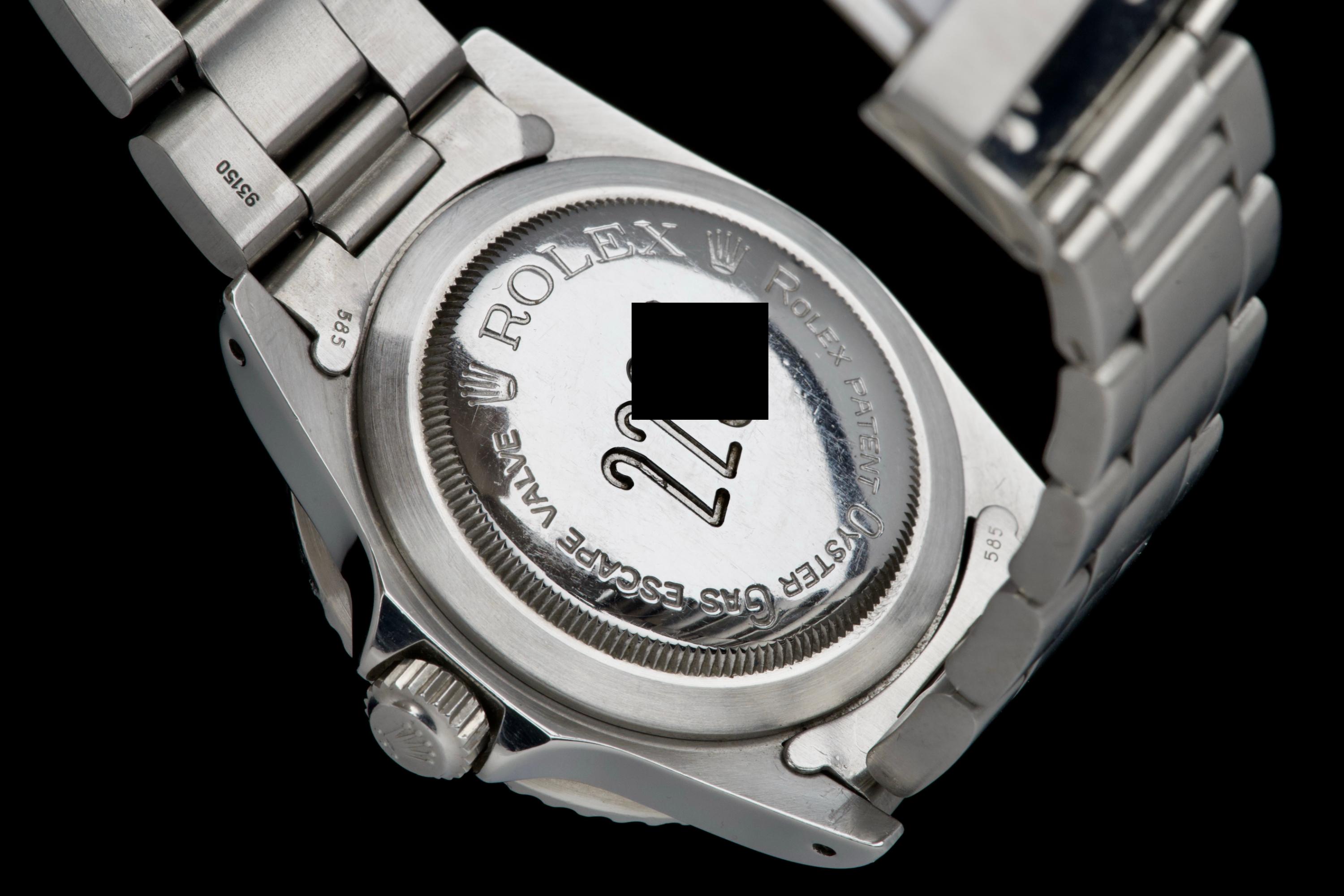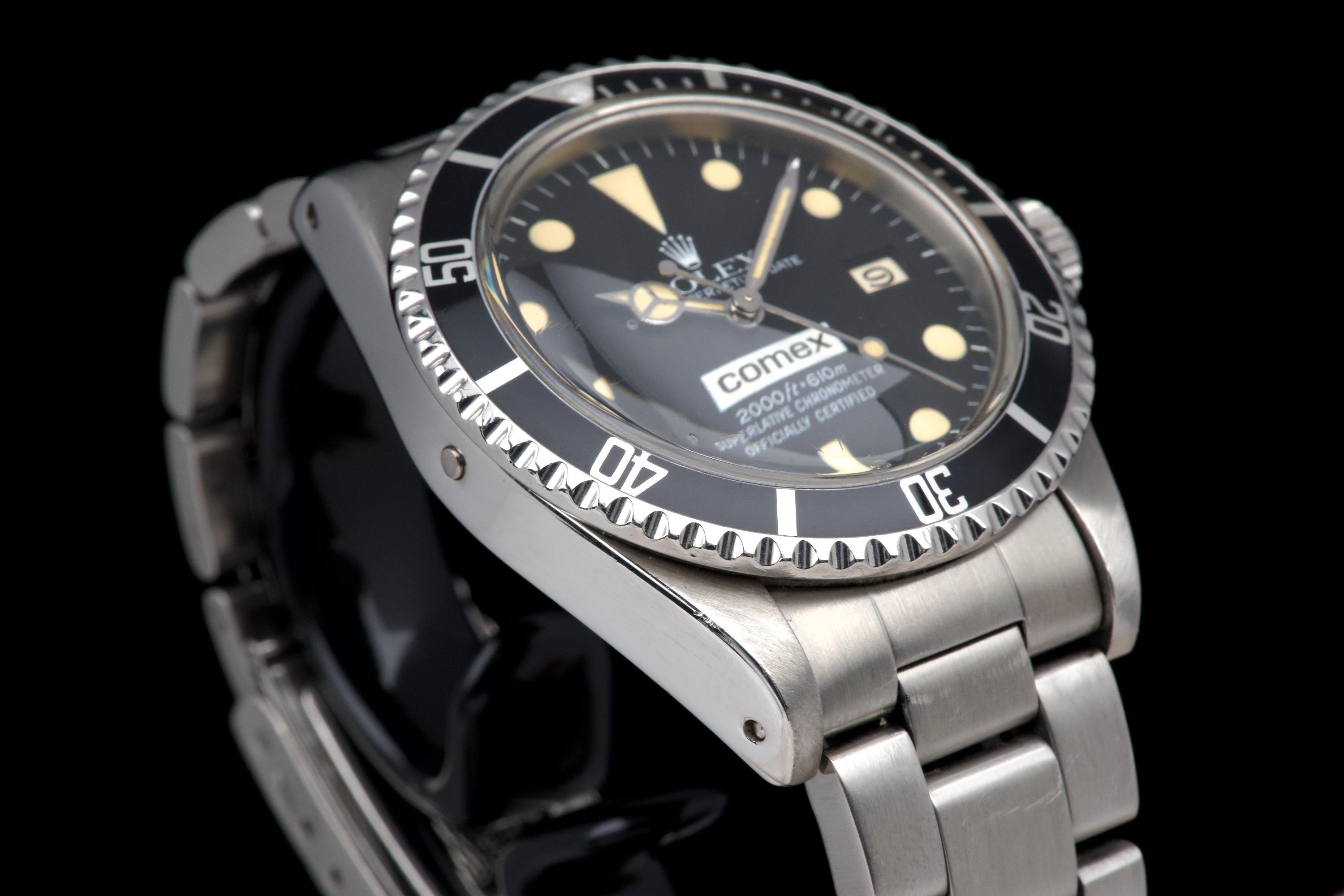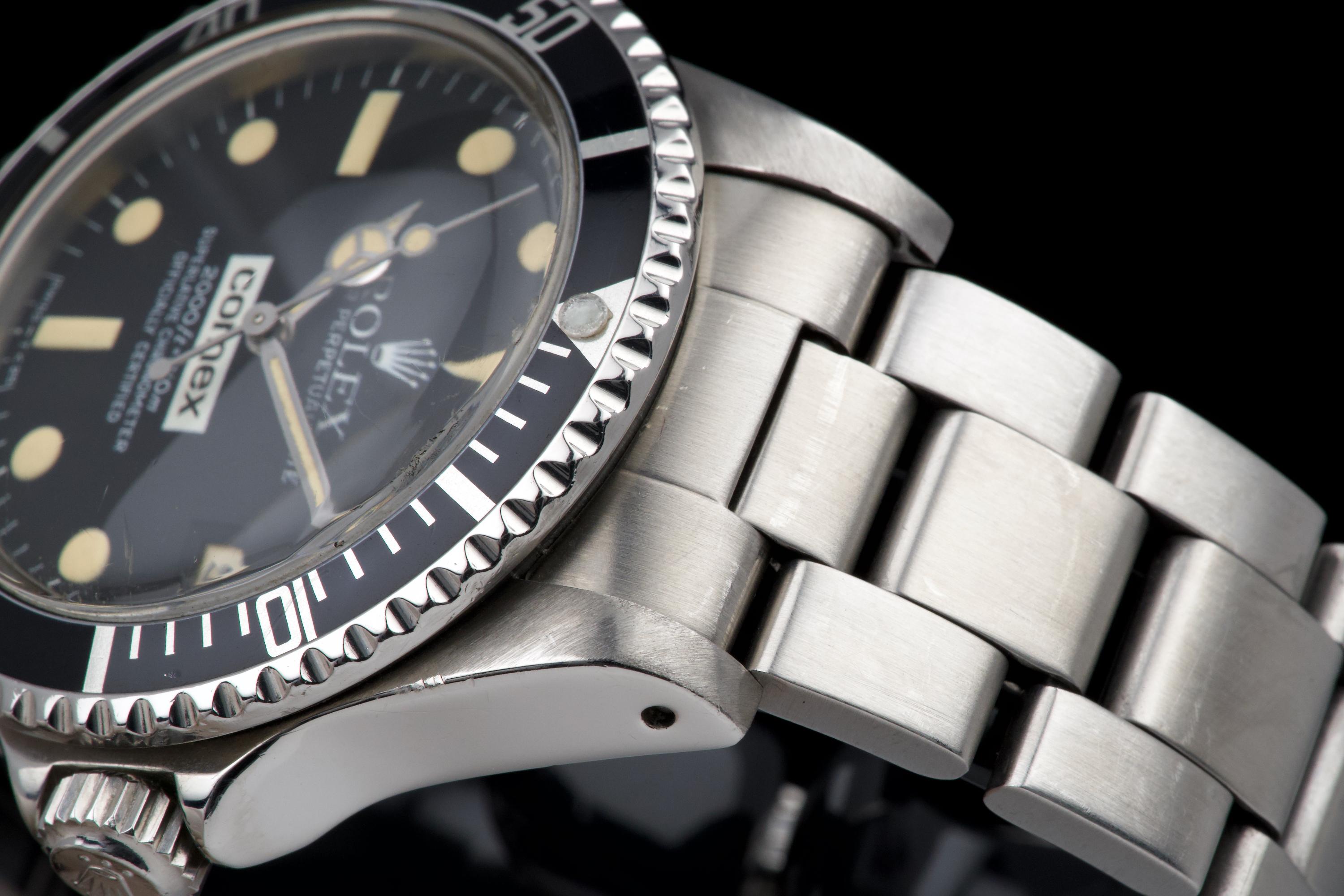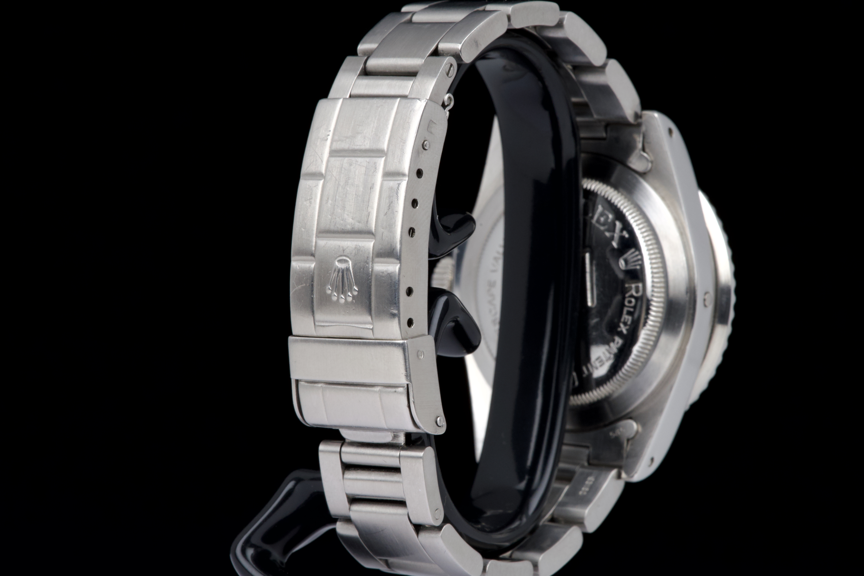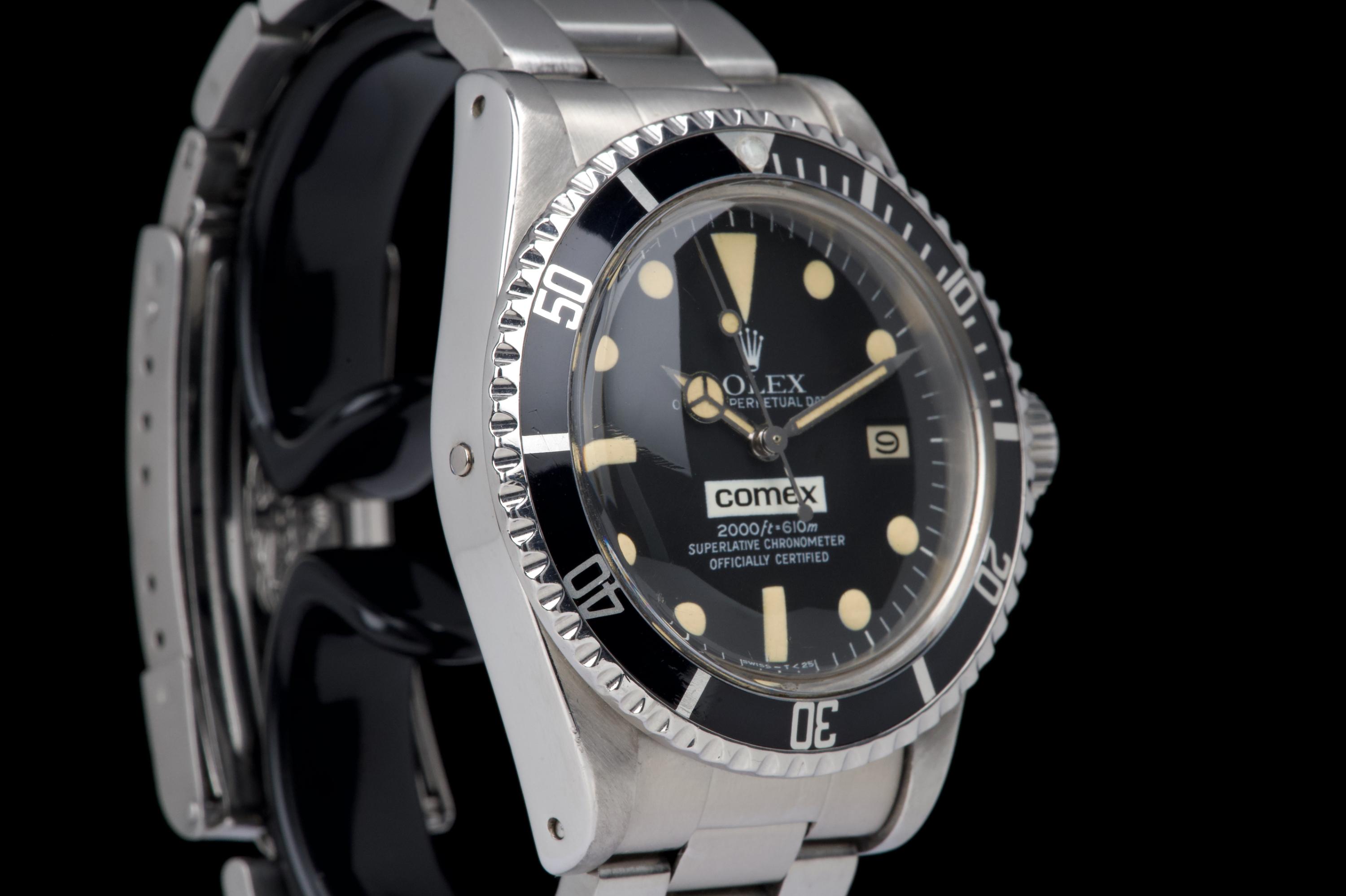 An outstanding and historically significant example of the Rolex Sea-Dweller 1665 COMEX, delivered in 1982 and belonging to the very last batch ever supplied to COMEX — this watch is among the final ten pieces, with diver engraving 229X on the caseback. The stainless-steel case remains thick, sharp, and honest, having been lightly polished in the past but retaining excellent proportions. The serial and reference numbers between the lugs are crisp and well defined (serial 6751XXX). The caseback is correctly stamped 1665 and engraved internally with the matching serial number, and externally with the diver number. The watch features its original MK2 COMEX dial (non–rail dial), entirely correct for these very late deliveries. The dial is in perfect condition, showing a beautiful and warm yellow patina on the indexes, with matching hands. The original “open 6” date disc is still present. The steel bezel and its graduated insert are both original; only the luminous pearlwas replaced with a later Luminova version. The watch is accompanied by a copy of the original Rolex letter confirming COMEX delivery to Marseille in 1982, strengthening its provenance and historical relevance. Later 93150 bracelet with 585 endlinks (claspcode N4), showing stretch consistent with professional diving use — entirely expected and characteristic of authentic COMEX tools. The original domed crystal shows light marks and small impacts, again reinforcing that the watch served its intended purpose. Powered by the Calibre 1570, freshly checked and running perfectly, this example combines condition, authenticity, and superb provenance. A truly exceptional and desirable COMEX 1665 — one of the final ones ever issued, with confirmed delivery, correct MK2 dial, diver engraving, and all the hallmarks of a genuine tool-used COMEX Sea-Dweller. A trophy-level piece for the serious collector.