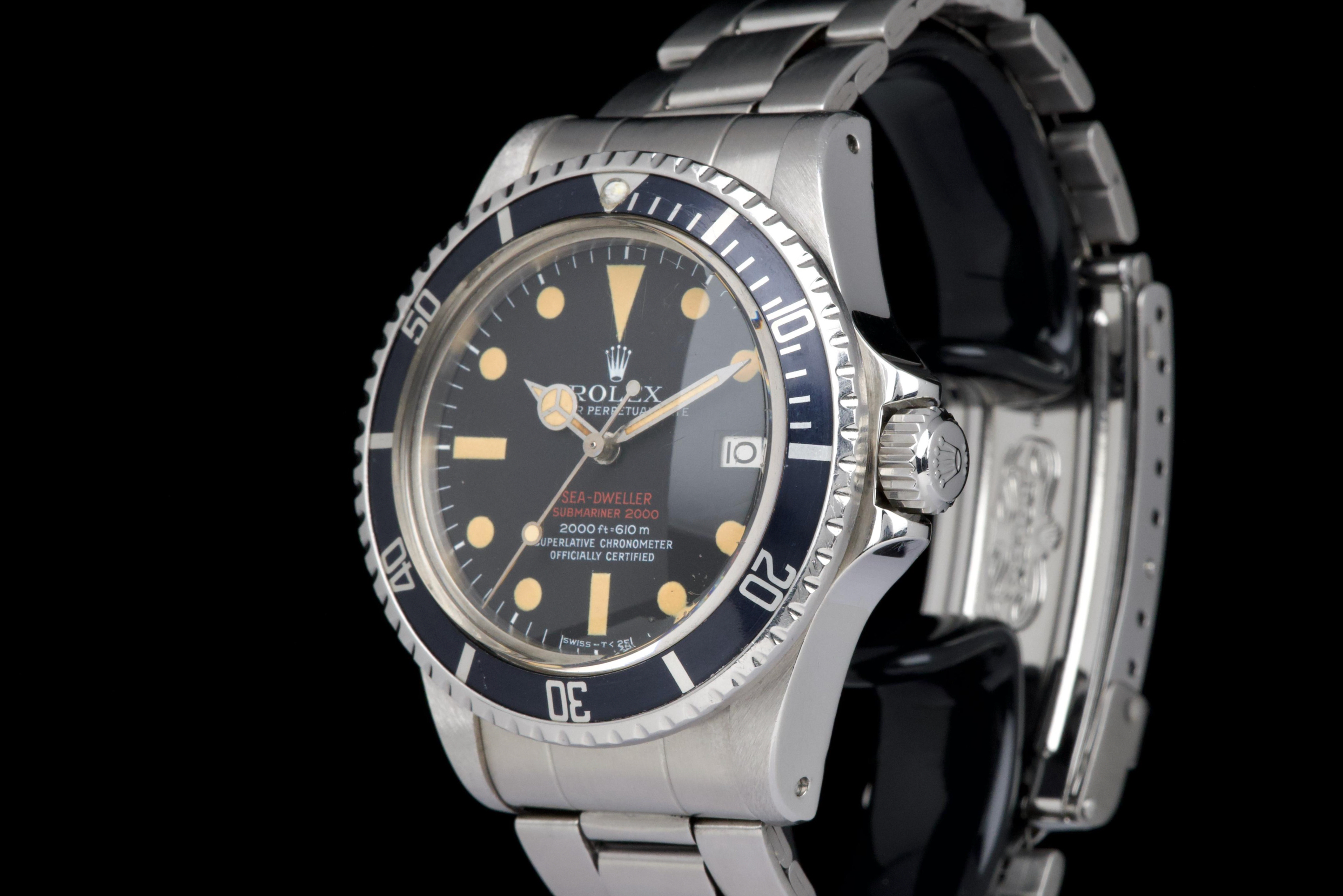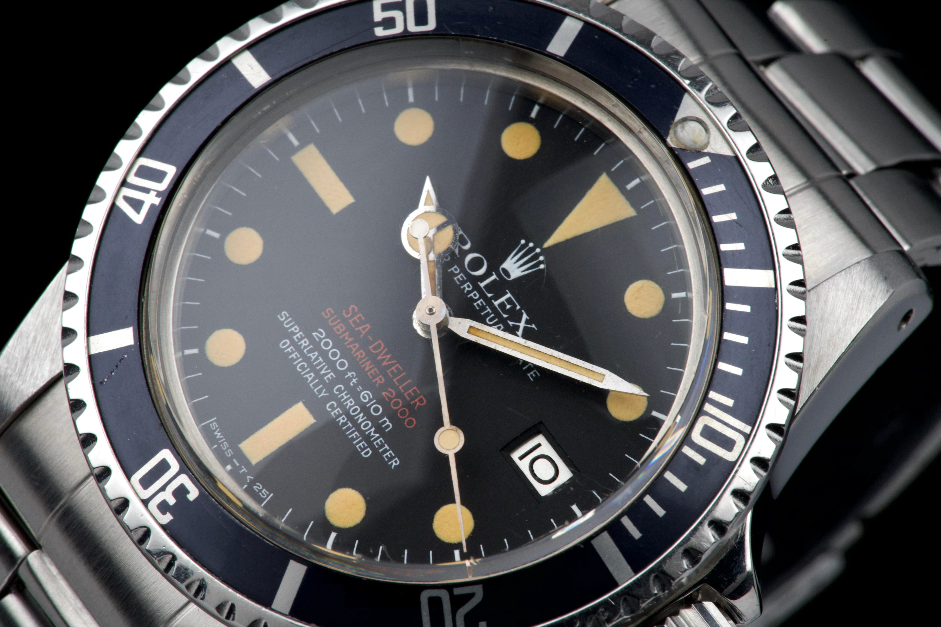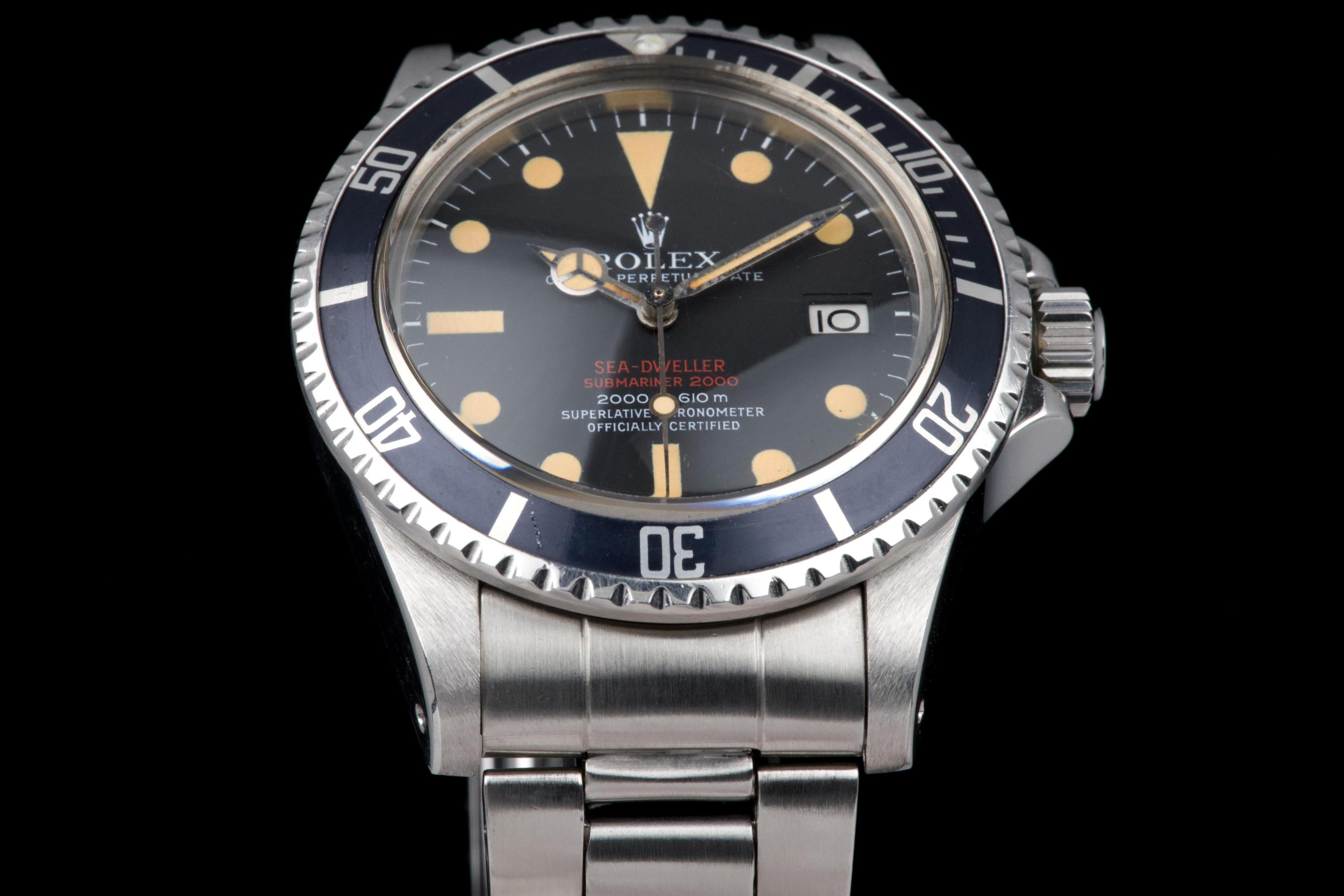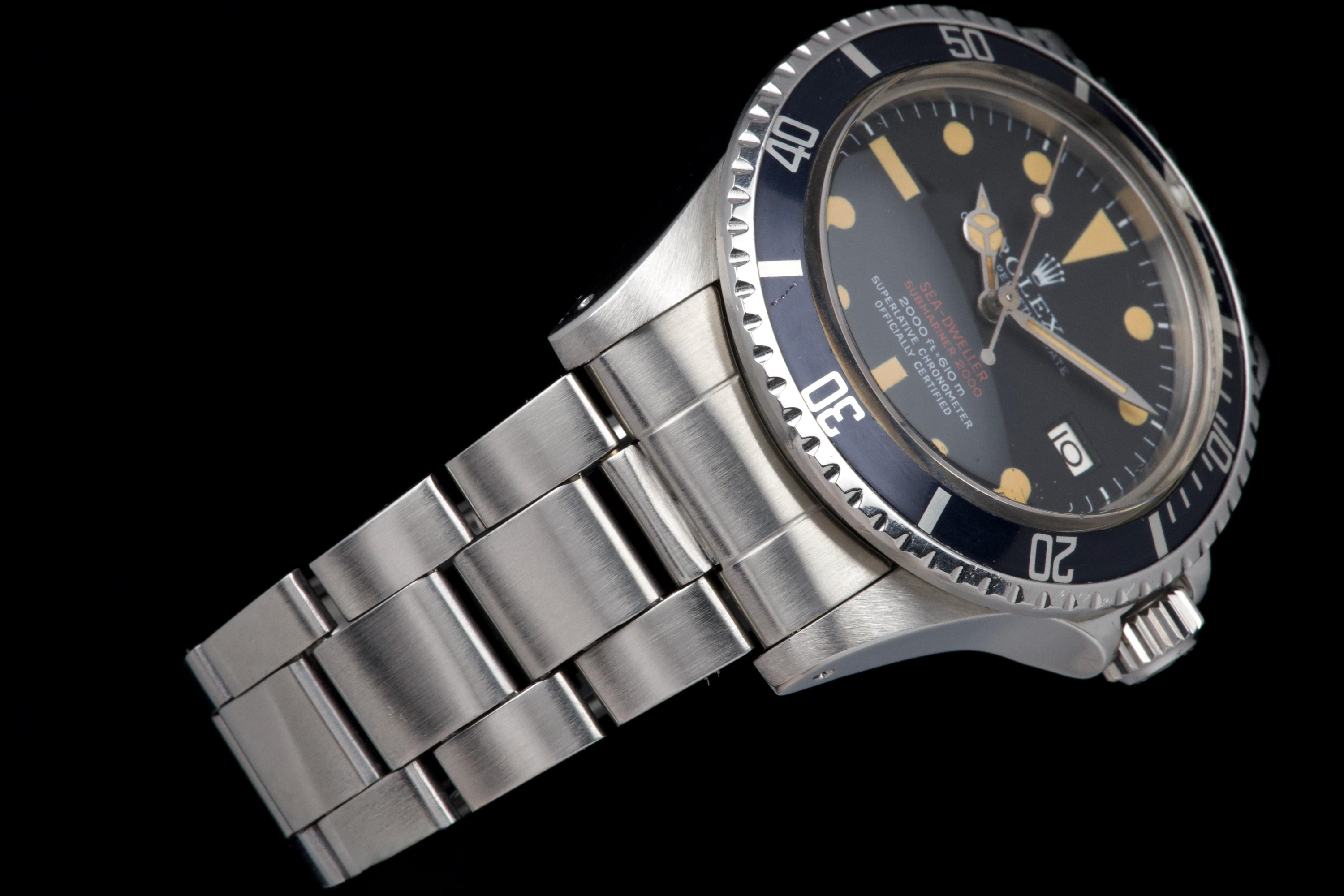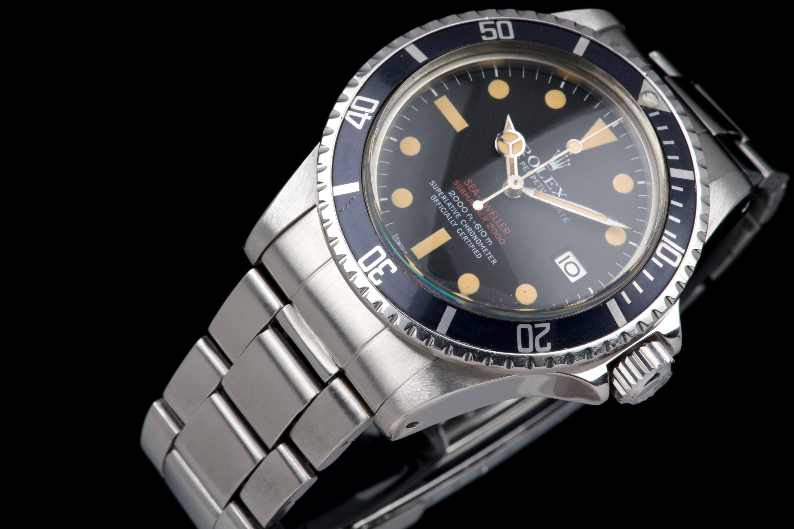The present Rolex Sea-Dweller reference 1665 “Double Red”, offered with its original box and papers, is a superb and highly collectible example of one of the most iconic professional dive watches ever produced. Bearing serial 377XXXX, corresponding to production in 1973, the watch was originally sold in November 1975, a circumstance not uncommon for professional Rolex models of the period. The stainless-steel case remains excellent and well proportioned, having been polished in the past but retaining strong, symmetrical lines and overall crisp geometry. The serial and reference numbers between the lugs remain sharp and clearly defined, confirming the integrity of the case. The watch is fitted with a particularly attractive and rare Mk3 “Double Red” dial, preserved in excellent overall condition. The tritium hour markers have aged to a lightly orange patina, and the original hands match beautifully, creating a highly harmonious appearance. The original bezel insert has faded slightly to a dark navy tone, adding considerable vintage character. The luminous pearl has likely been repaired at some point, a detail sometimes encountered on vintage dive watches that saw real use. The caseback is correctly stamped 1665, and importantly the serial number is also engraved inside the caseback, a feature consistent with many authentic Double Red Sea-Dwellers of the period. The watch is fitted with its original folded Oyster bracelet reference 9315 with 380 endlinks, showing some stretch consistent with age. The clasp is un-dated, which is typical for bracelets from around 1973, and the diver’s extension is engraved “Pateted”, a known and documented engraving variation found on bracelets from this era. The watch was serviced by Rolex Geneva in 2013, and the movement is running perfectly at the time of cataloguing. It is fitted with a service plexiglass crystal, consistent with Rolex maintenance practices. Accompanying the watch is a particularly appealing set including the original box (without outer packaging), original punched papers, booklet, and anchor, forming a highly desirable ensemble for collectors. Combining a rare Mk3 Double Red dial, strong case, original bracelet, and a remarkably complete set of accessories, this Sea-Dweller 1665 represents a compelling opportunity to acquire one of the most historically important and sought-after vintage Rolex dive watches.