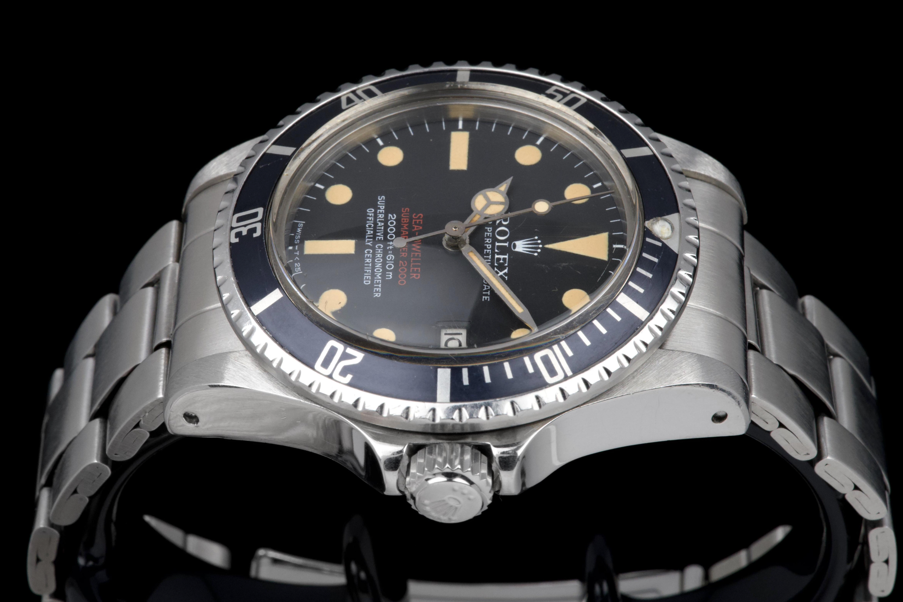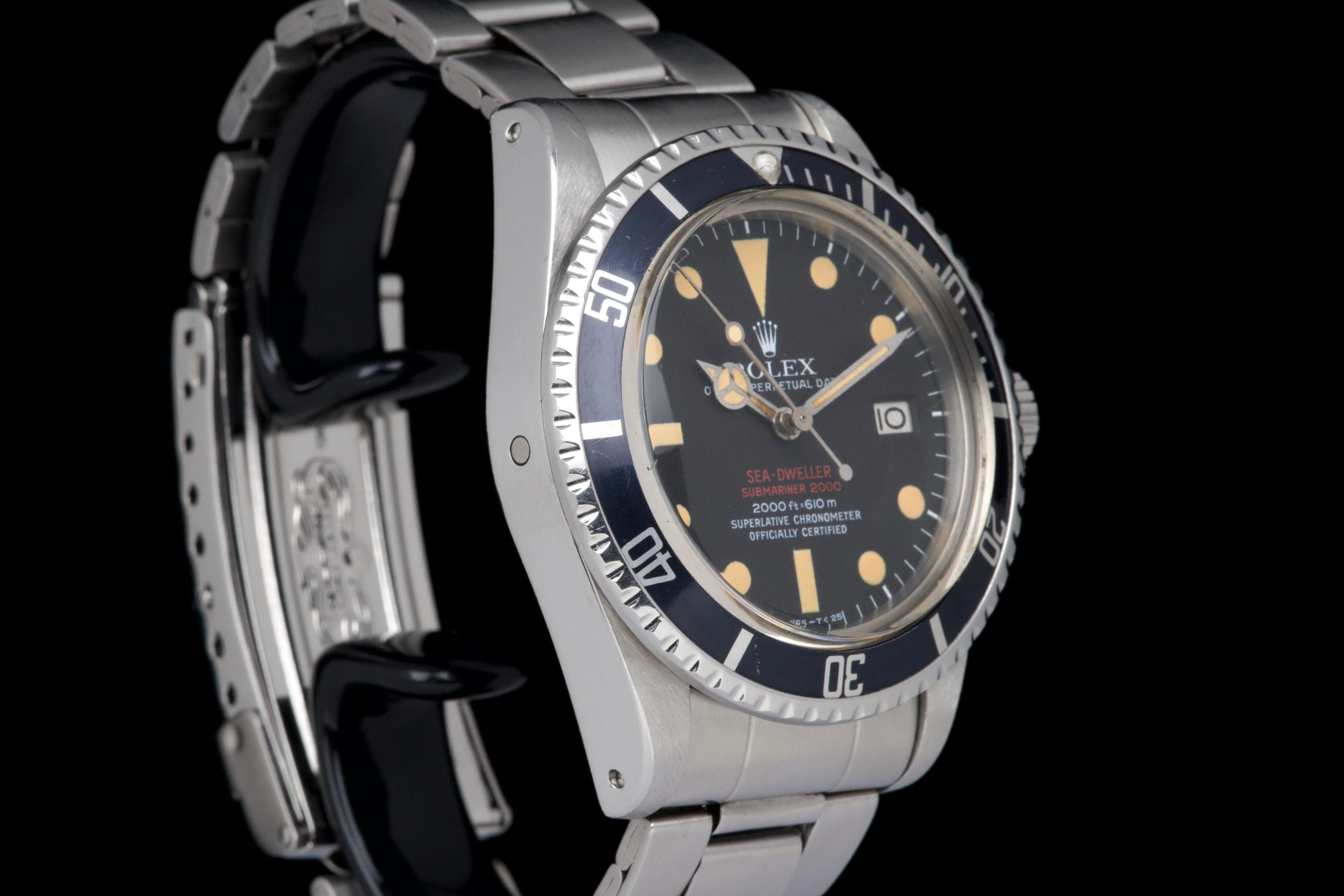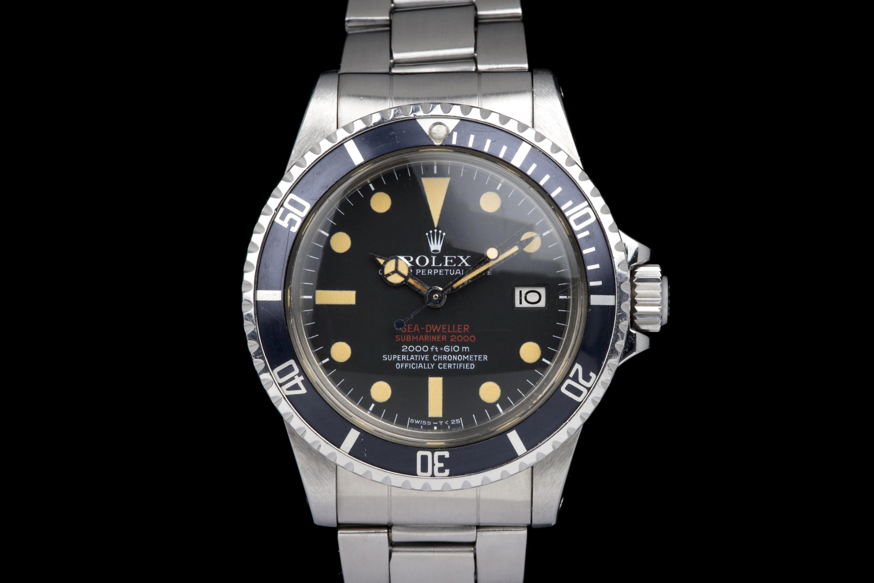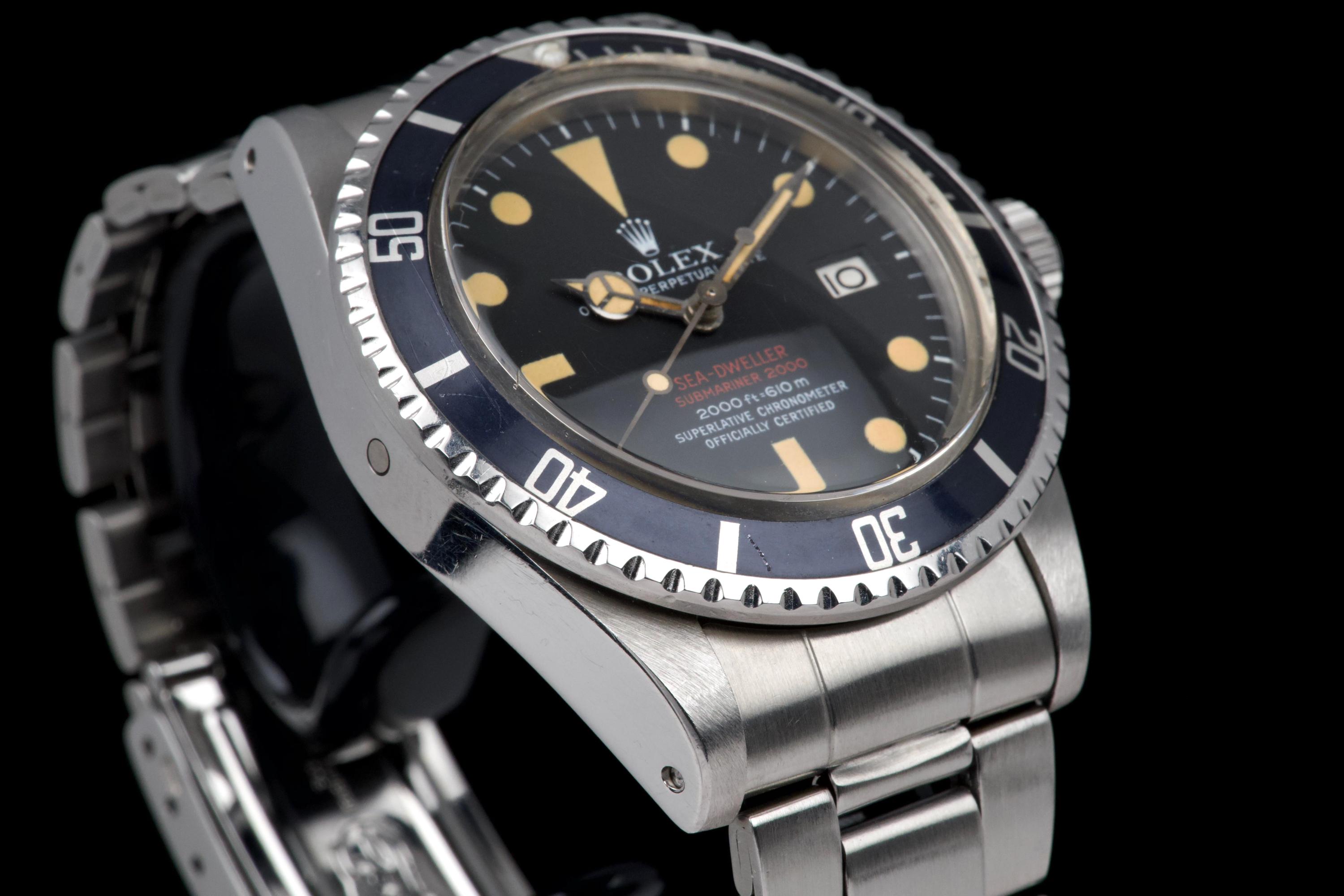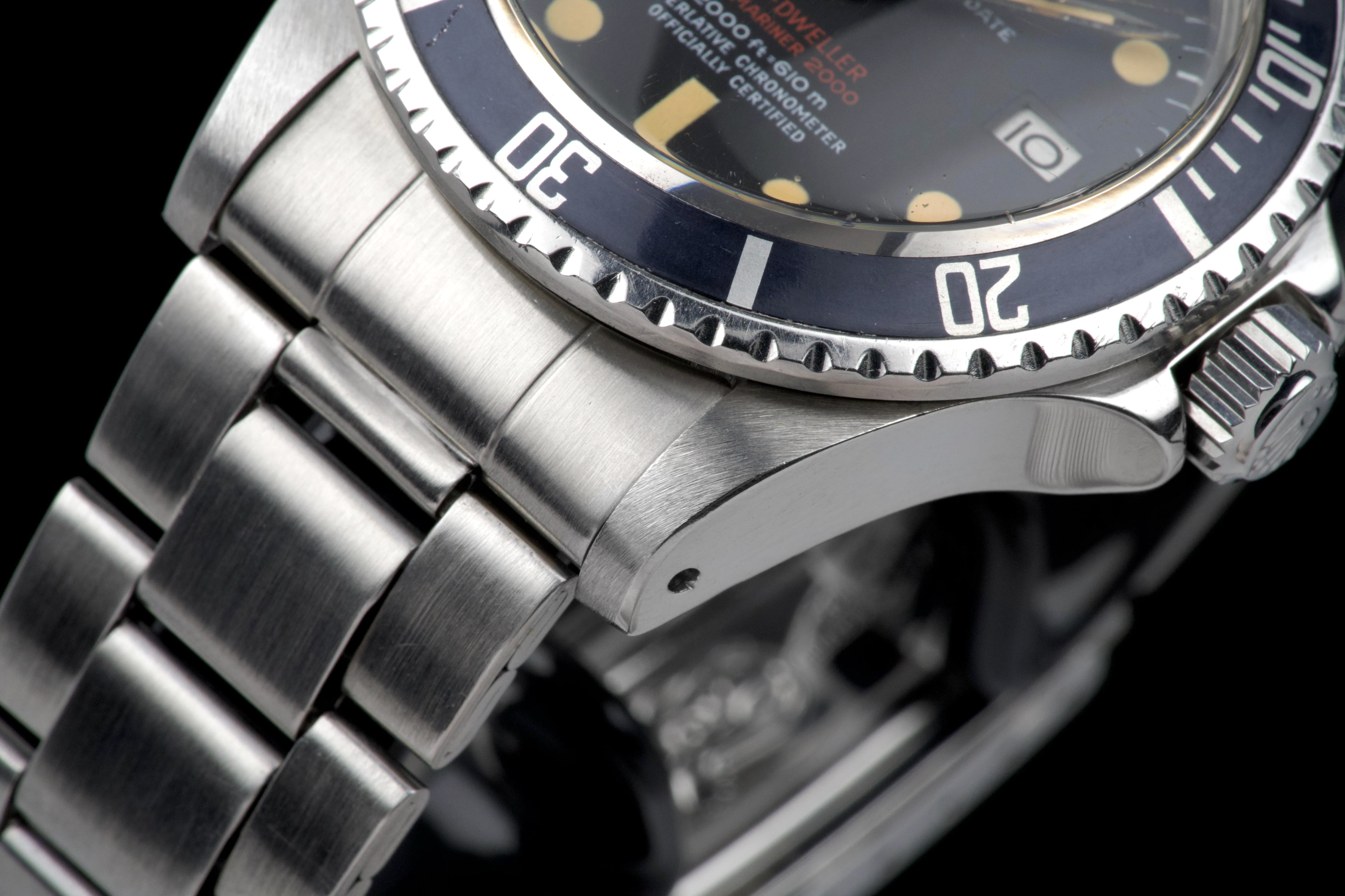 The present Rolex Sea-Dweller reference 1665 “Double Red”, offered with its original box and papers, is a superb and highly collectible example of one of the most iconic professional dive watches ever produced. Bearing serial 377XXXX, corresponding to production in 1973, the watch was originally sold in November 1975, a circumstance not uncommon for professional Rolex models of the period. The stainless-steel case remains excellent and well proportioned, having been polished in the past but retaining strong, symmetrical lines and overall crisp geometry. The serial and reference numbers between the lugs remain sharp and clearly defined, confirming the integrity of the case. The watch is fitted with a particularly attractive and rare Mk3 “Double Red” dial, preserved in excellent overall condition. The tritium hour markers have aged to a lightly orange patina, and the original hands match beautifully, creating a highly harmonious appearance. The original bezel insert has faded slightly to a dark navy tone, adding considerable vintage character. The luminous pearl has likely been repaired at some point, a detail sometimes encountered on vintage dive watches that saw real use. The caseback is correctly stamped 1665, and importantly the serial number is also engraved inside the caseback, a feature consistent with many authentic Double Red Sea-Dwellers of the period. The watch is fitted with its original folded Oyster bracelet reference 9315 with 380 endlinks, showing some stretch consistent with age. The clasp is un-dated, which is typical for bracelets from around 1973, and the diver’s extension is engraved “Pateted”, a known and documented engraving variation found on bracelets from this era. The watch was serviced by Rolex Geneva in 2013, and the movement is running perfectly at the time of cataloguing. It is fitted with a service plexiglass crystal, consistent with Rolex maintenance practices. Accompanying the watch is a particularly appealing set including the original box (without outer packaging), original punched papers, booklet, and anchor, forming a highly desirable ensemble for collectors. Combining a rare Mk3 Double Red dial, strong case, original bracelet, and a remarkably complete set of accessories, this Sea-Dweller 1665 represents a compelling opportunity to acquire one of the most historically important and sought-after vintage Rolex dive watches.