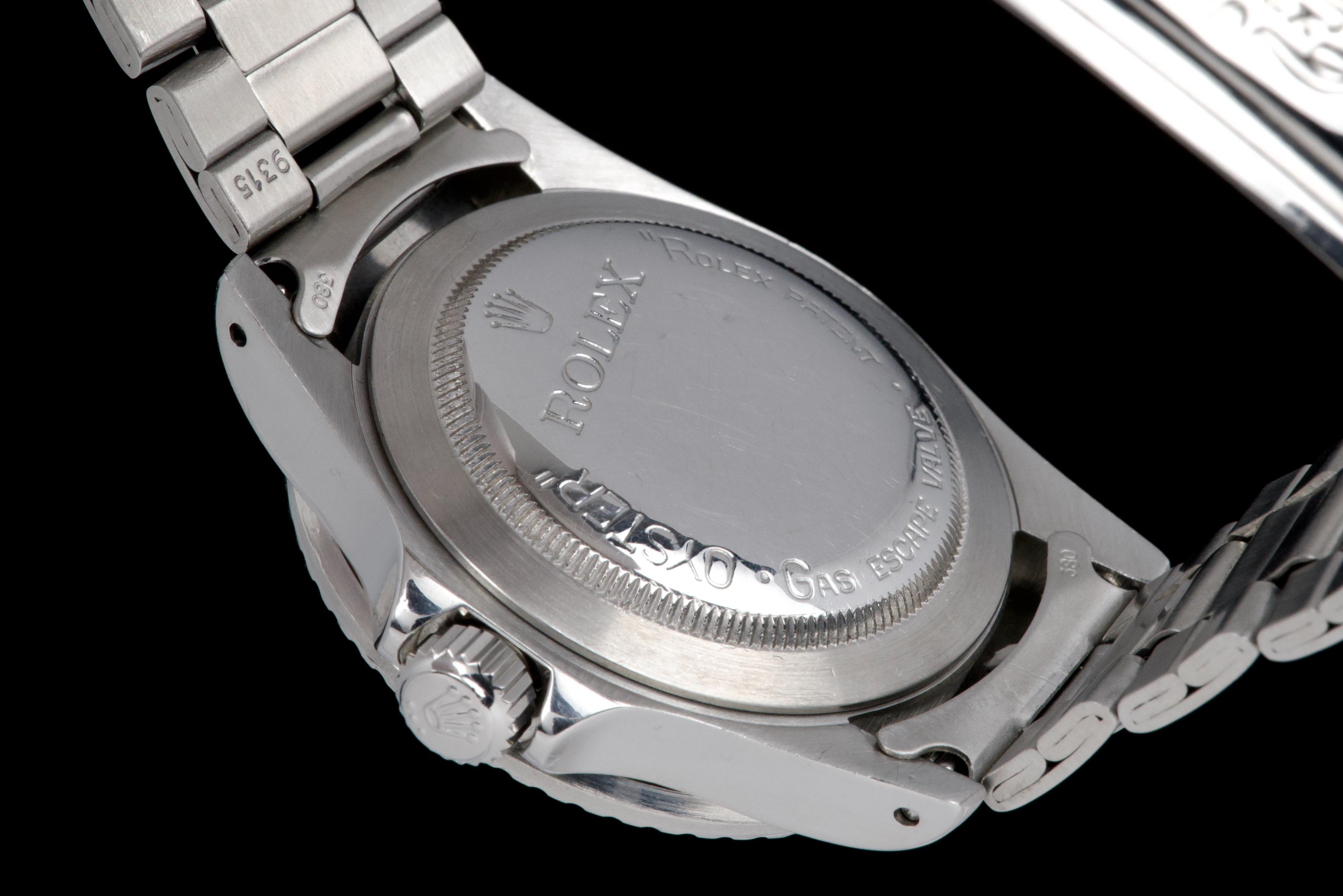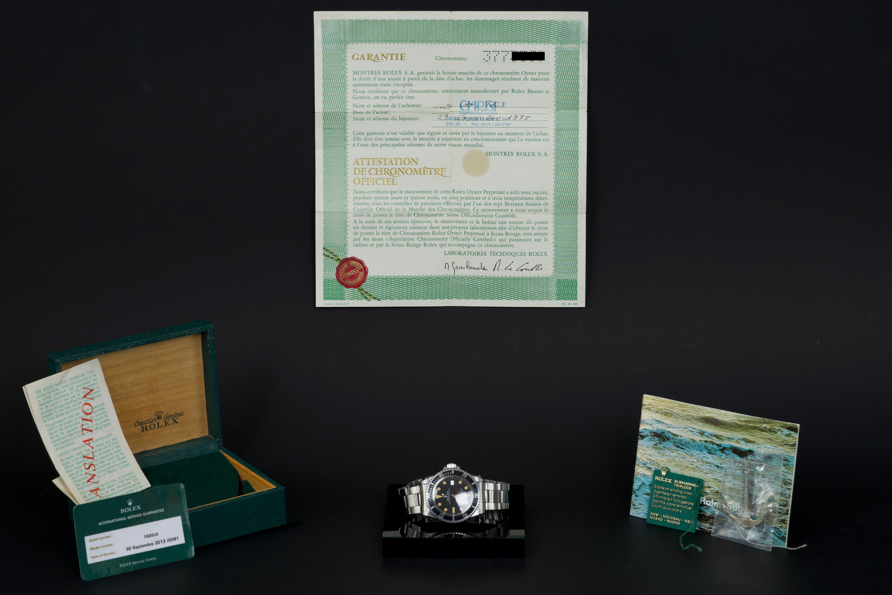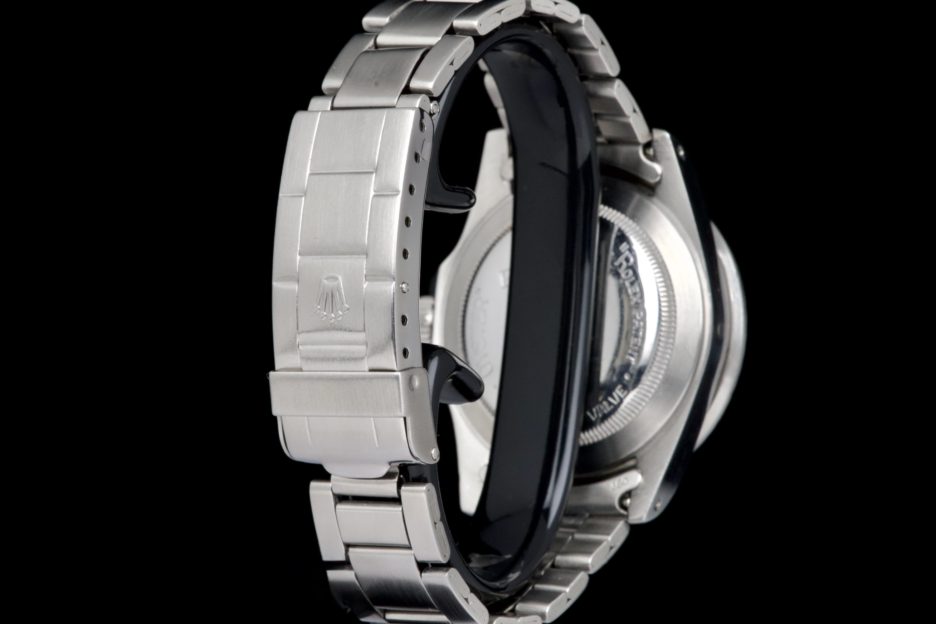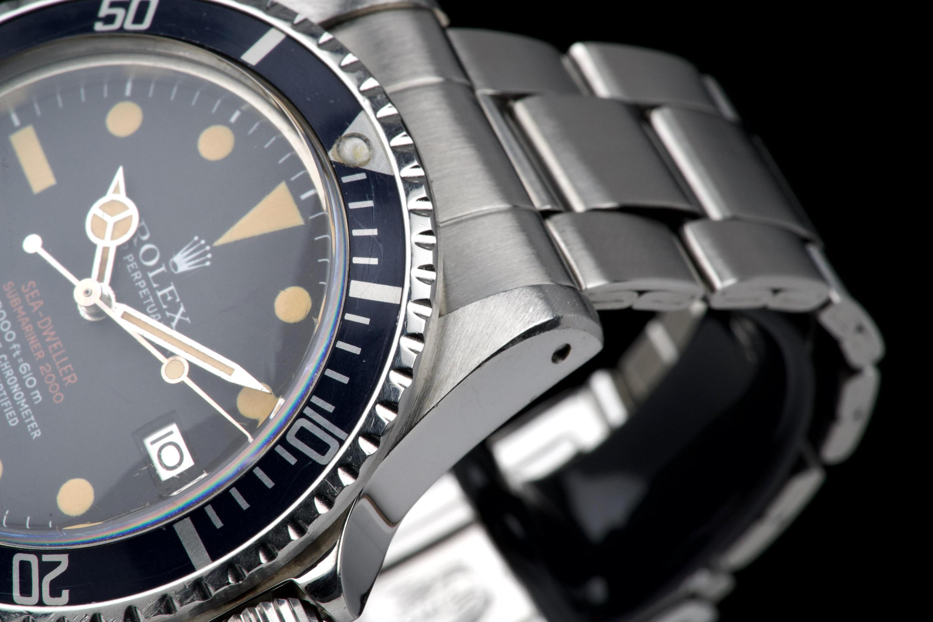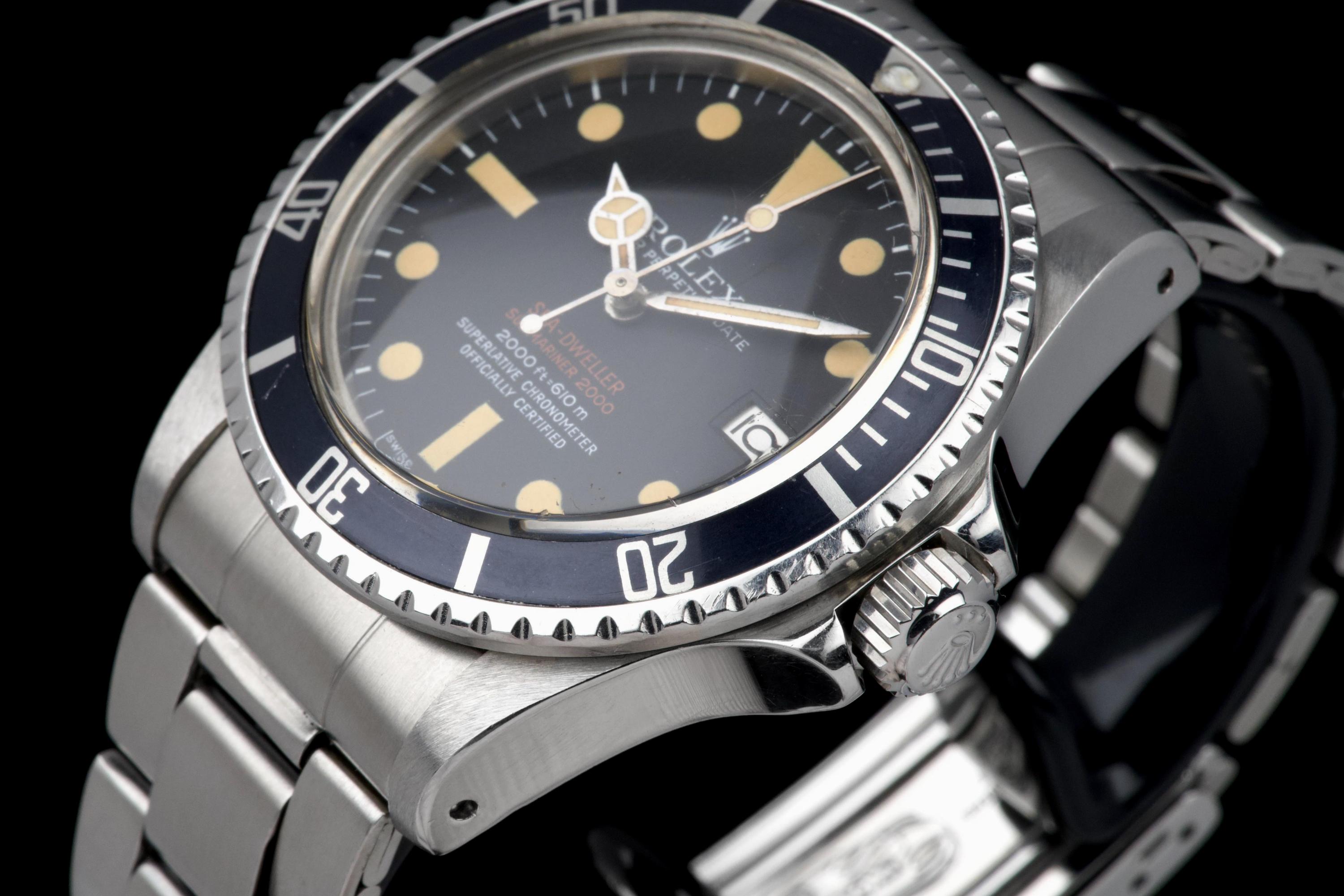 The present Rolex Sea-Dweller reference 1665 “Double Red”, offered with its original box and papers, is a superb and highly collectible example of one of the most iconic professional dive watches ever produced. Bearing serial 377XXXX, corresponding to production in 1973, the watch was originally sold in November 1975, a circumstance not uncommon for professional Rolex models of the period. The stainless-steel case remains excellent and well proportioned, having been polished in the past but retaining strong, symmetrical lines and overall crisp geometry. The serial and reference numbers between the lugs remain sharp and clearly defined, confirming the integrity of the case. The watch is fitted with a particularly attractive and rare Mk3 “Double Red” dial, preserved in excellent overall condition. The tritium hour markers have aged to a lightly orange patina, and the original hands match beautifully, creating a highly harmonious appearance. The original bezel insert has faded slightly to a dark navy tone, adding considerable vintage character. The luminous pearl has likely been repaired at some point, a detail sometimes encountered on vintage dive watches that saw real use. The caseback is correctly stamped 1665, and importantly the serial number is also engraved inside the caseback, a feature consistent with many authentic Double Red Sea-Dwellers of the period. The watch is fitted with its original folded Oyster bracelet reference 9315 with 380 endlinks, showing some stretch consistent with age. The clasp is un-dated, which is typical for bracelets from around 1973, and the diver’s extension is engraved “Pateted”, a known and documented engraving variation found on bracelets from this era. The watch was serviced by Rolex Geneva in 2013, and the movement is running perfectly at the time of cataloguing. It is fitted with a service plexiglass crystal, consistent with Rolex maintenance practices. Accompanying the watch is a particularly appealing set including the original box (without outer packaging), original punched papers, booklet, and anchor, forming a highly desirable ensemble for collectors. Combining a rare Mk3 Double Red dial, strong case, original bracelet, and a remarkably complete set of accessories, this Sea-Dweller 1665 represents a compelling opportunity to acquire one of the most historically important and sought-after vintage Rolex dive watches.