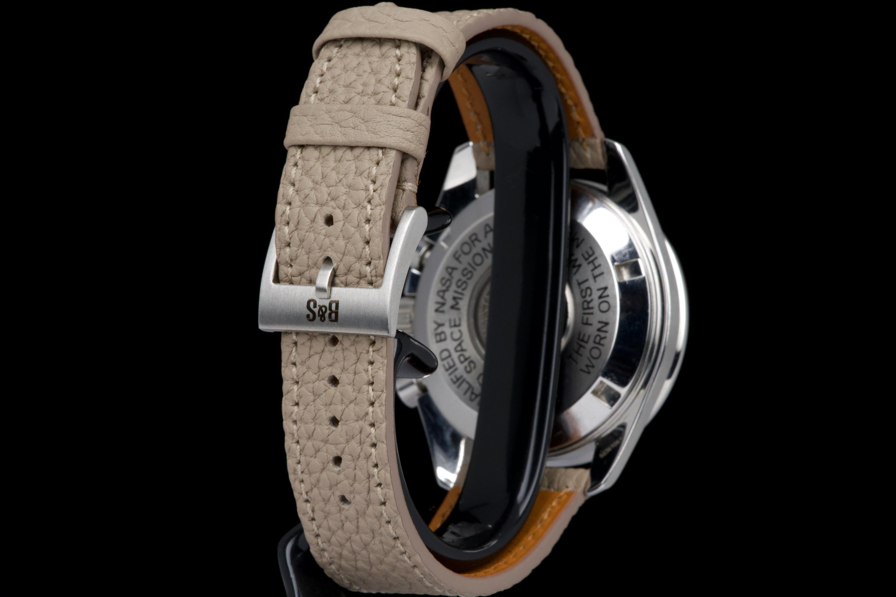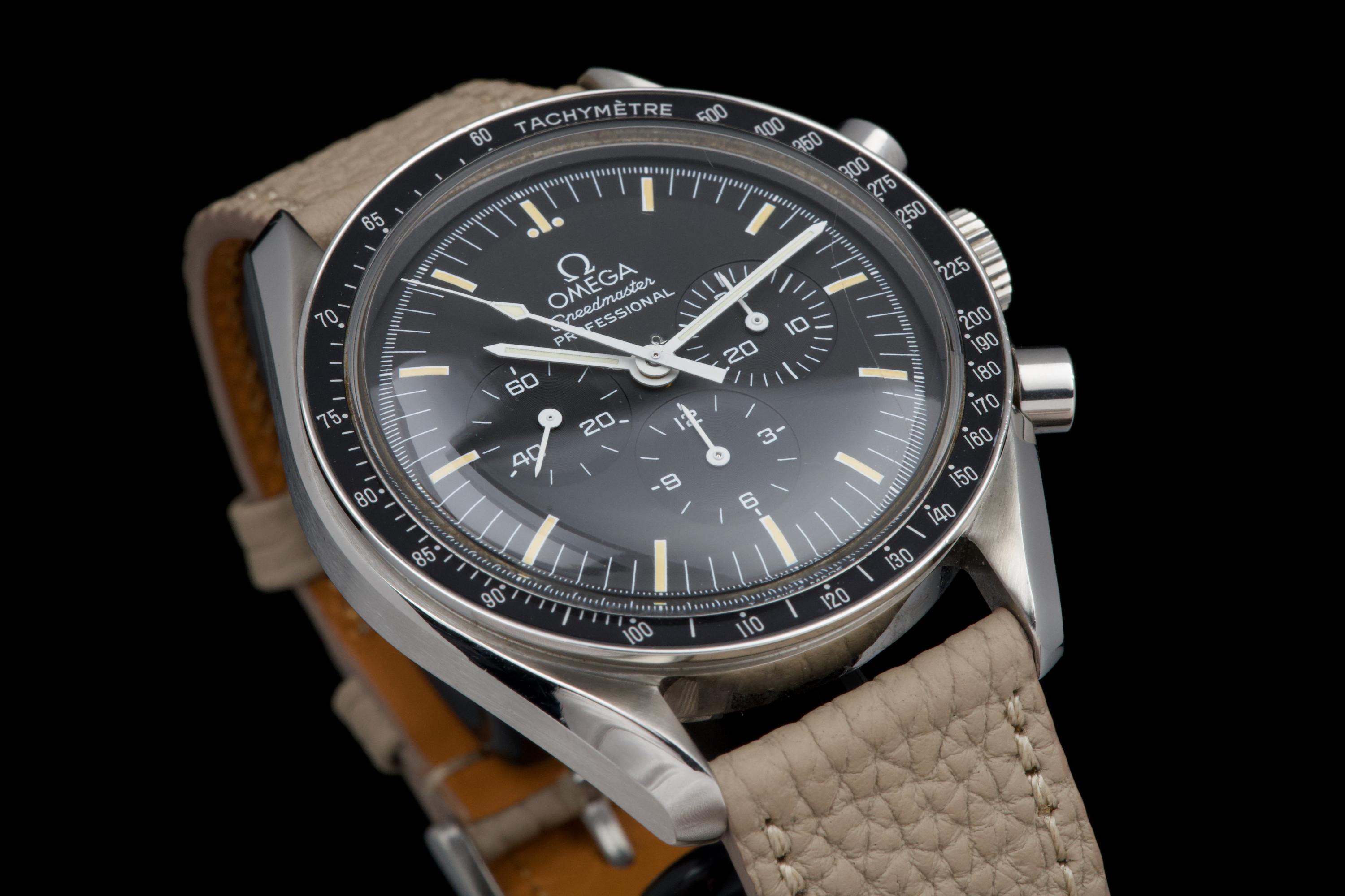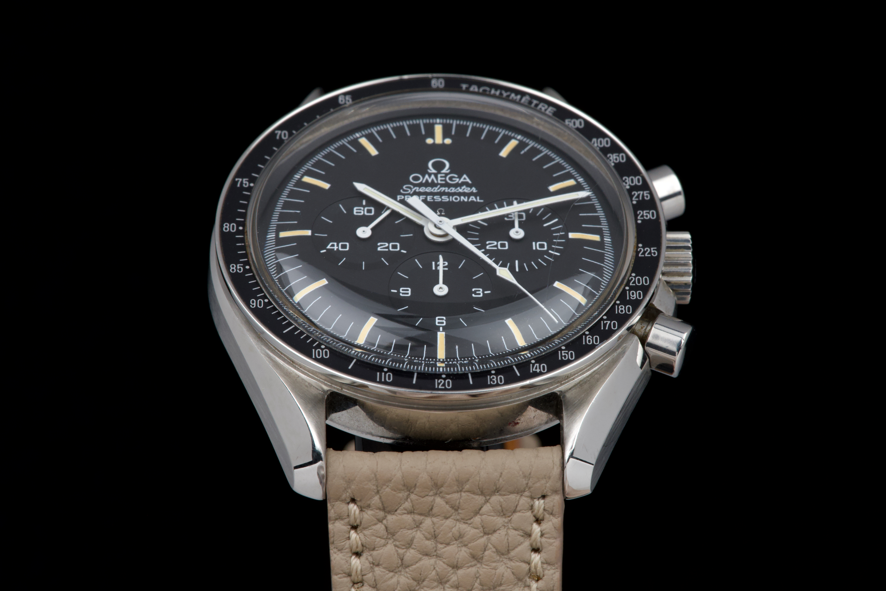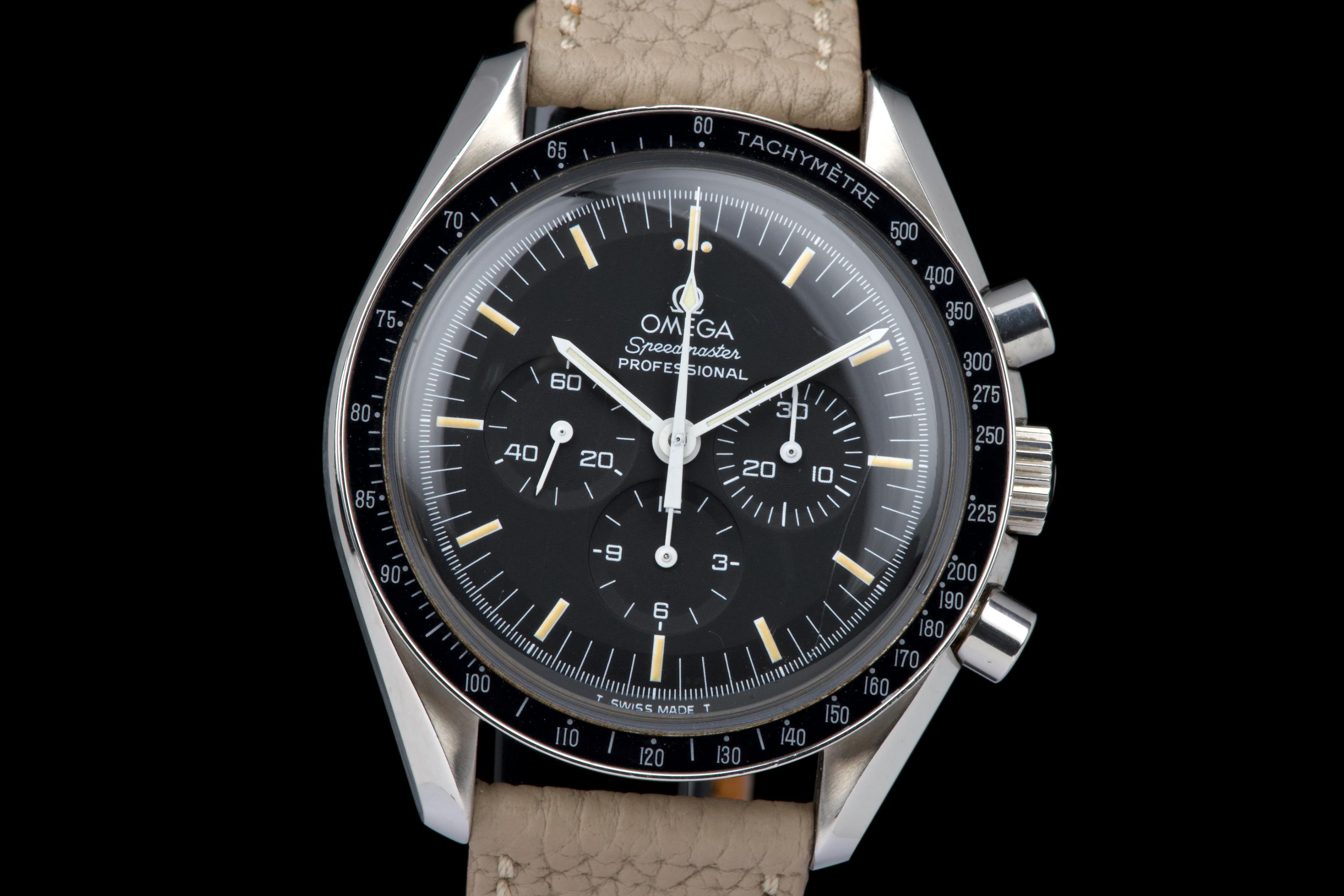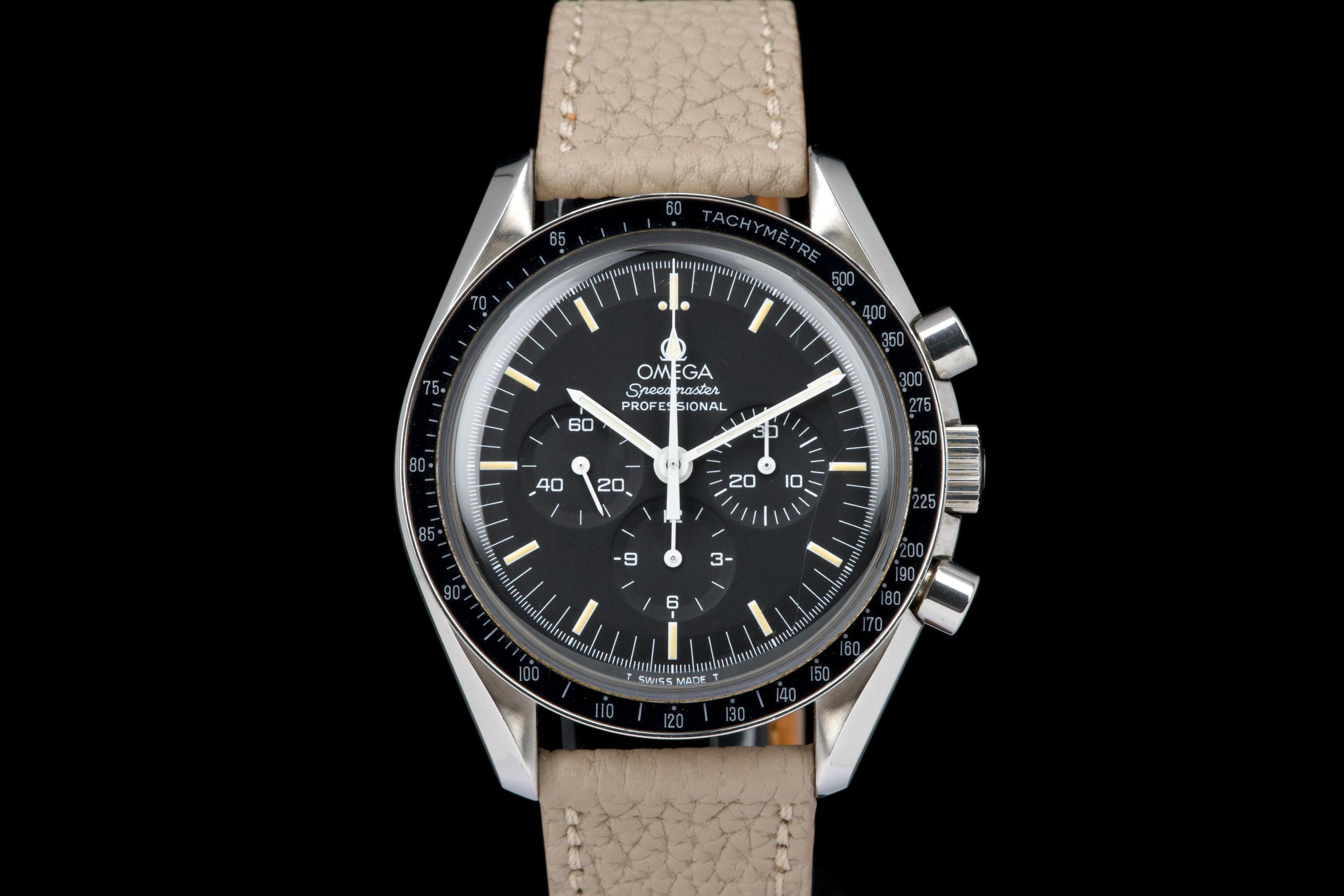 The present Omega Speedmaster Professional, celebrated as the first watch worn on the Moon, reference 145.0022, dating to 1985, is a classic and highly recognizable example of one of the most important chronographs in horological history. Housed in a 42 mm stainless-steel case, the watch is powered by the legendary manual-winding calibre 1861, a direct descendant of the movement family that accompanied NASA astronauts on lunar missions. Renowned for its robustness, reliability, and ease of service, the calibre 1861 represents the modern evolution of Omega’s historic Moonwatch movement. The watch is fitted with its original tritium dial, preserved in excellent condition, and paired with matching tritium hands, resulting in a harmonious and period-correct appearance. The luminous material has aged attractively, enhancing the vintage character of the watch. The case has been polished in the past and now shows only light signs of wear consistent with careful use. The movement is functioning perfectly at the time of cataloguing. For additional peace of mind, the watch is sold with a one-year warranty on proper functioning. Combining historical significance, mechanical purity, and timeless design, this Speedmaster Professional ref. 145.0022 represents an excellent opportunity to acquire a classic Moonwatch from the mid-1980s, offering both collectability and everyday wearability.