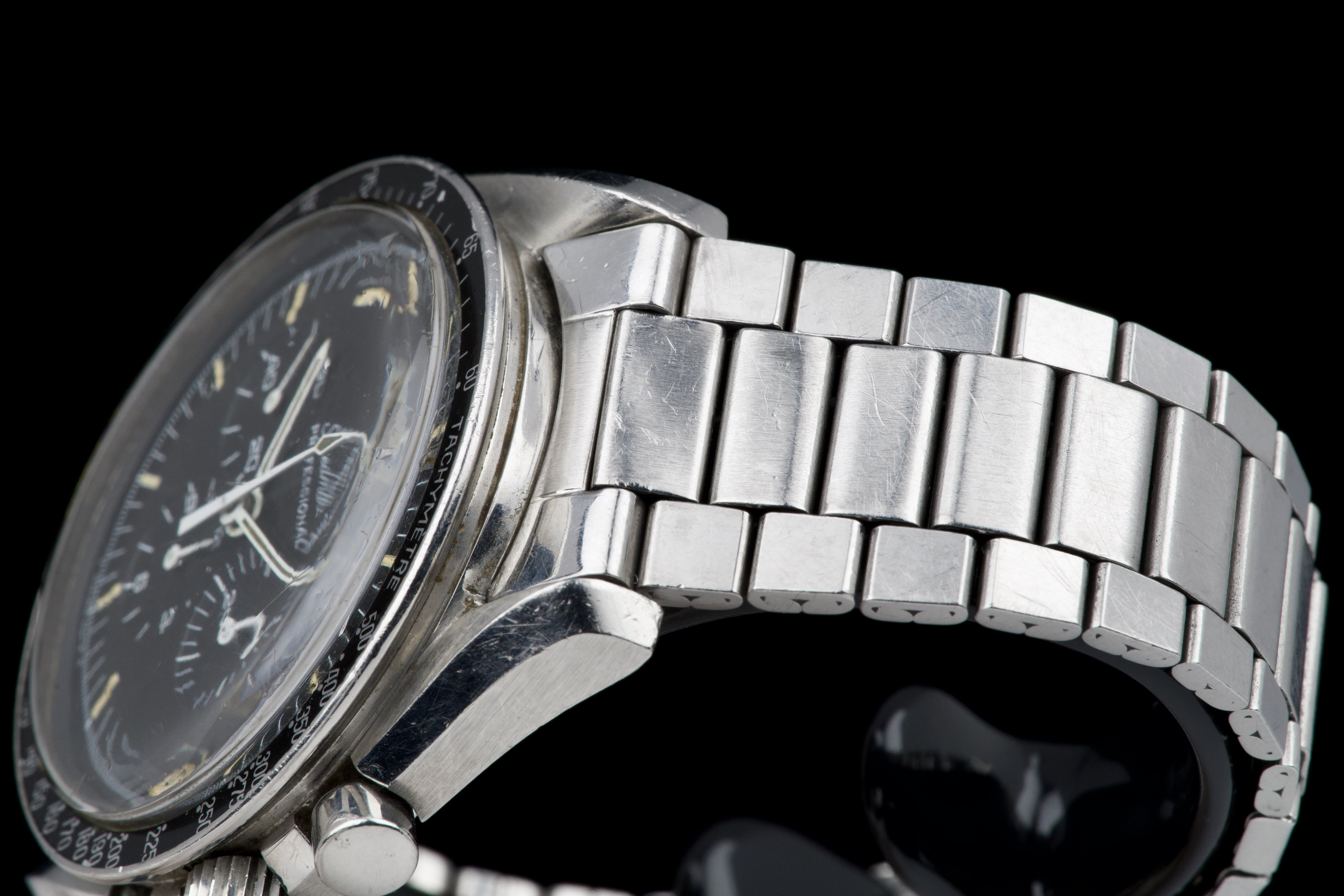 A highly attractive and fully honest example of the 1969 Omega Speedmaster 145.022-69, retaining all of its important original components. The watch is unpolished and shows marks, scratches, and signs of wear consistent with its age, giving it a strong and appealing vintage presence. The original tritium dial has developed a beautiful warm patina, perfectly complemented by matching tritium hands. It features its correct and highly sought-after Dot Over Ninety bezel, along with original pushers, original crown, and the original hesalite crystal with the Omega logo still visible at the center. The watch is fitted with its original 1039 bracelet with 416 endlinks, and the clasp is correctly stamped 4.69. Powered by the Omega caliber 861, the watch has no documented service history but is running properly. A superb, untouched, and collectible example of a late-1960s Moonwatch, exactly as enthusiasts and purists hope to find it.