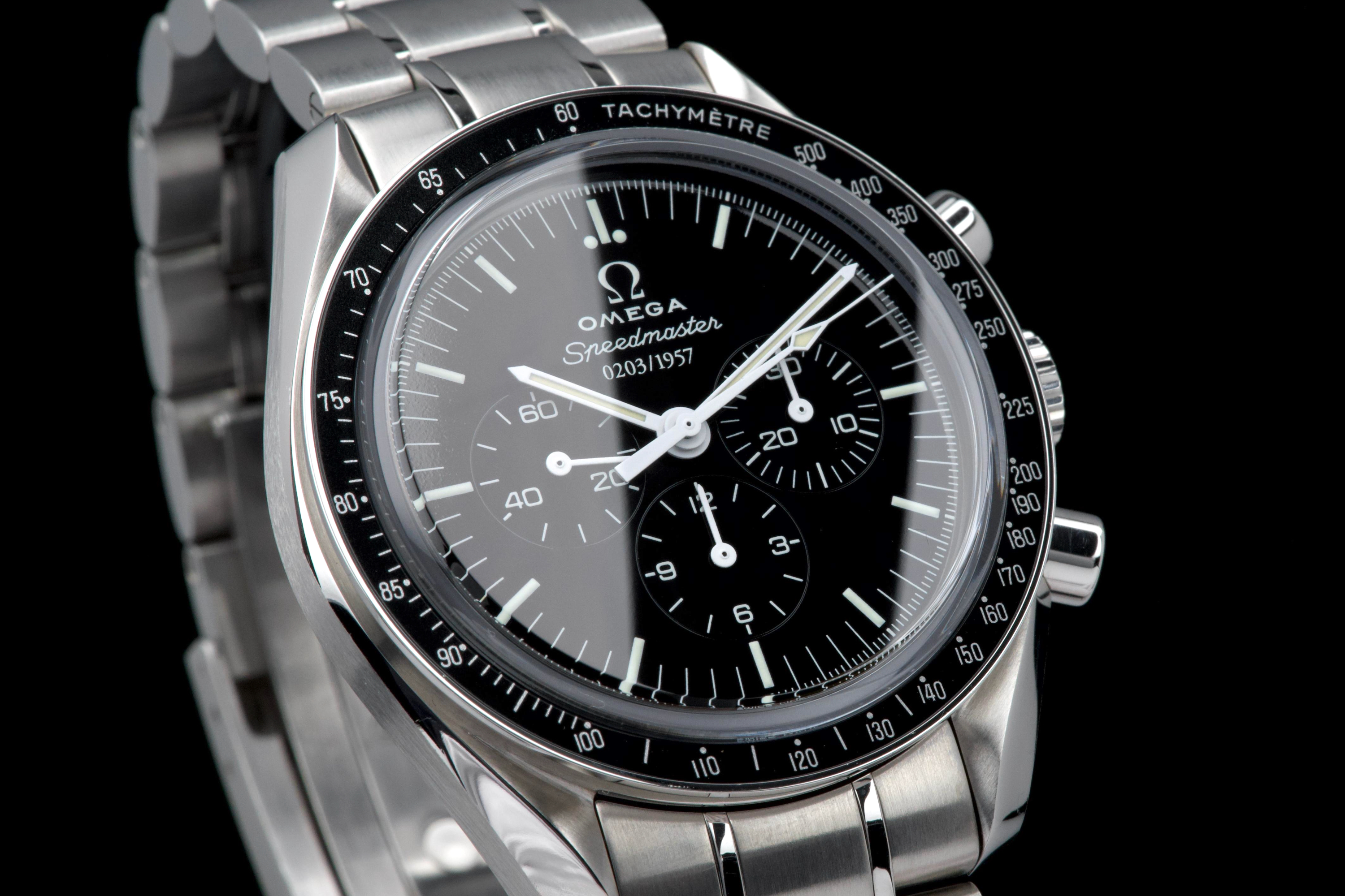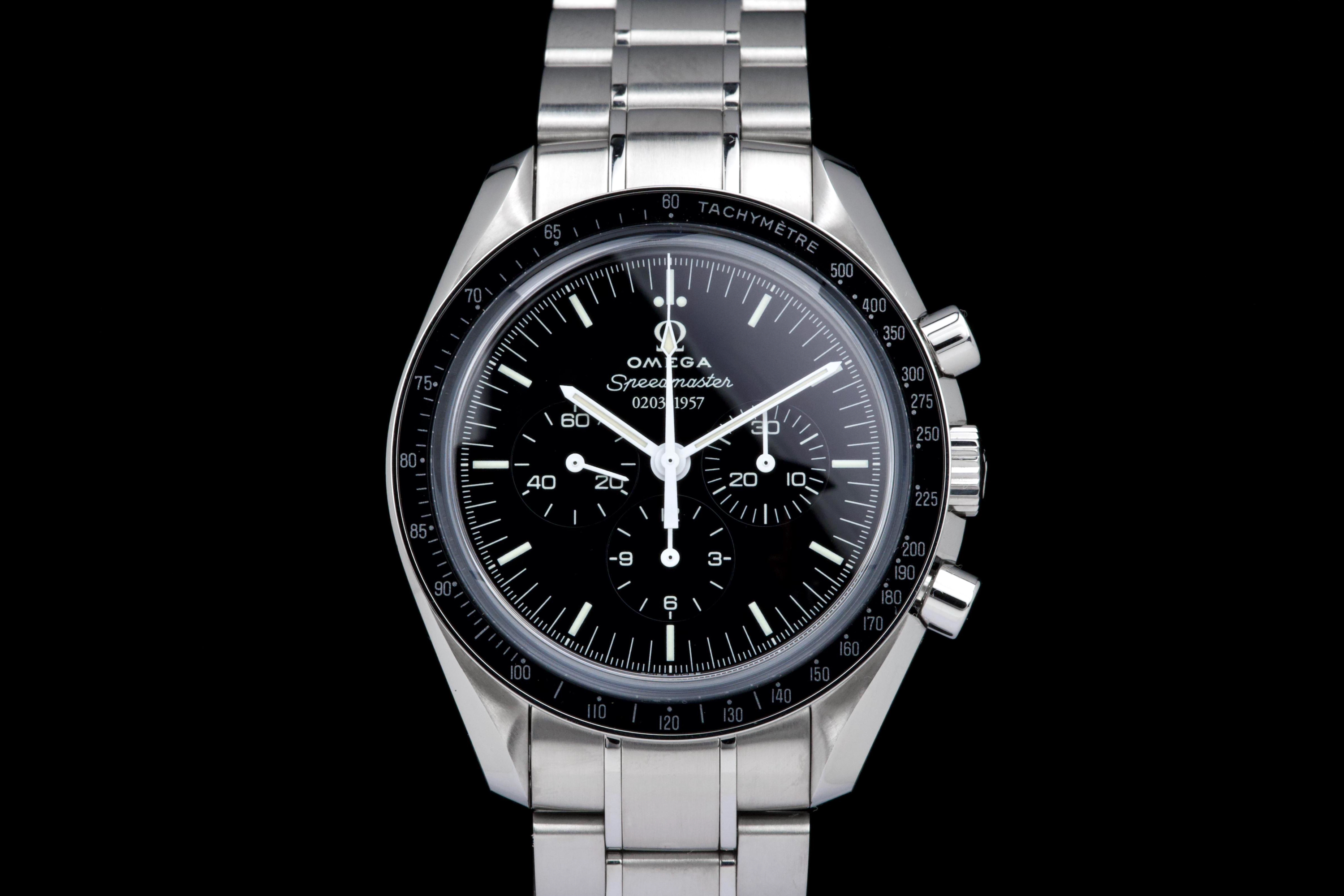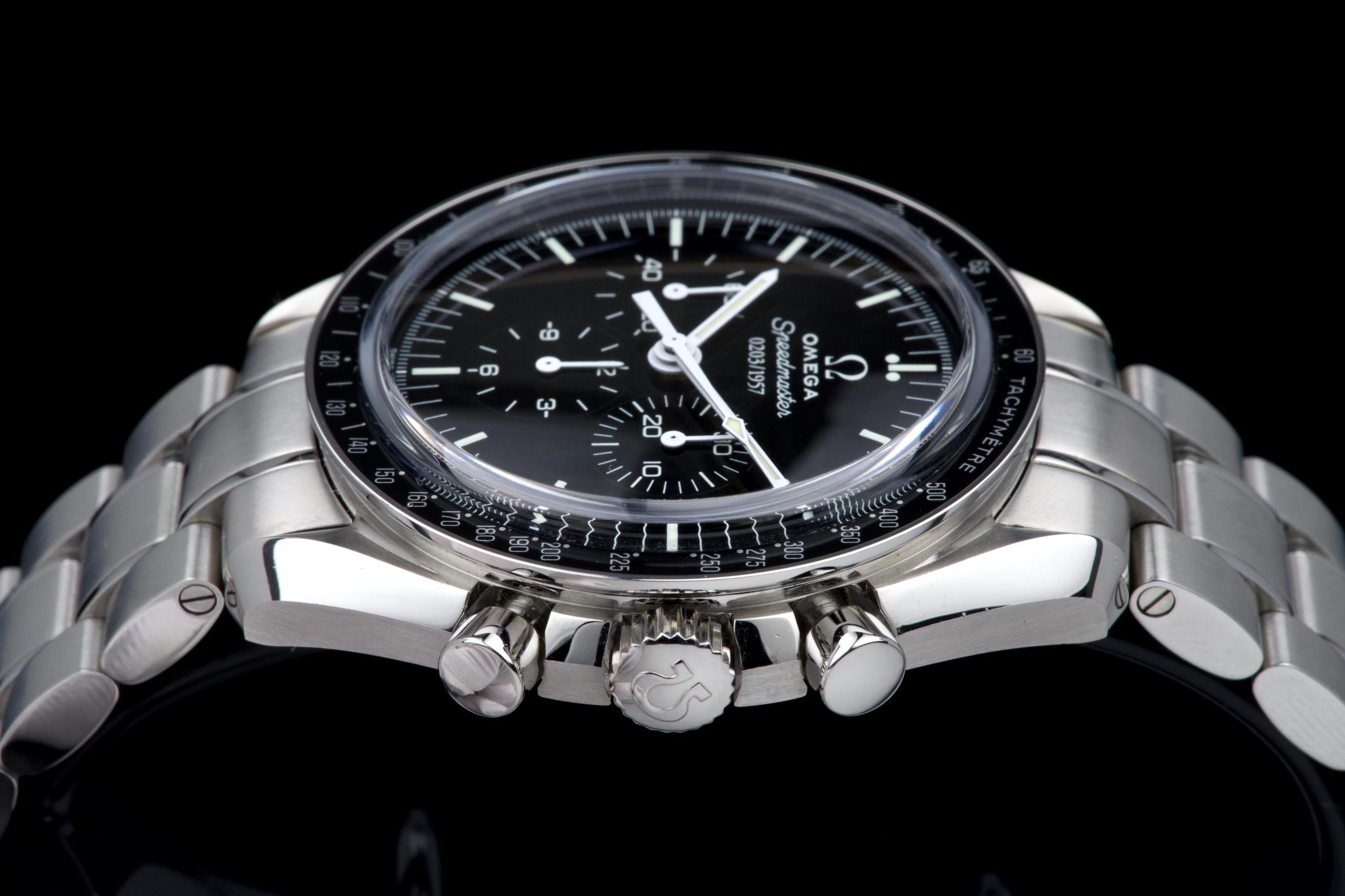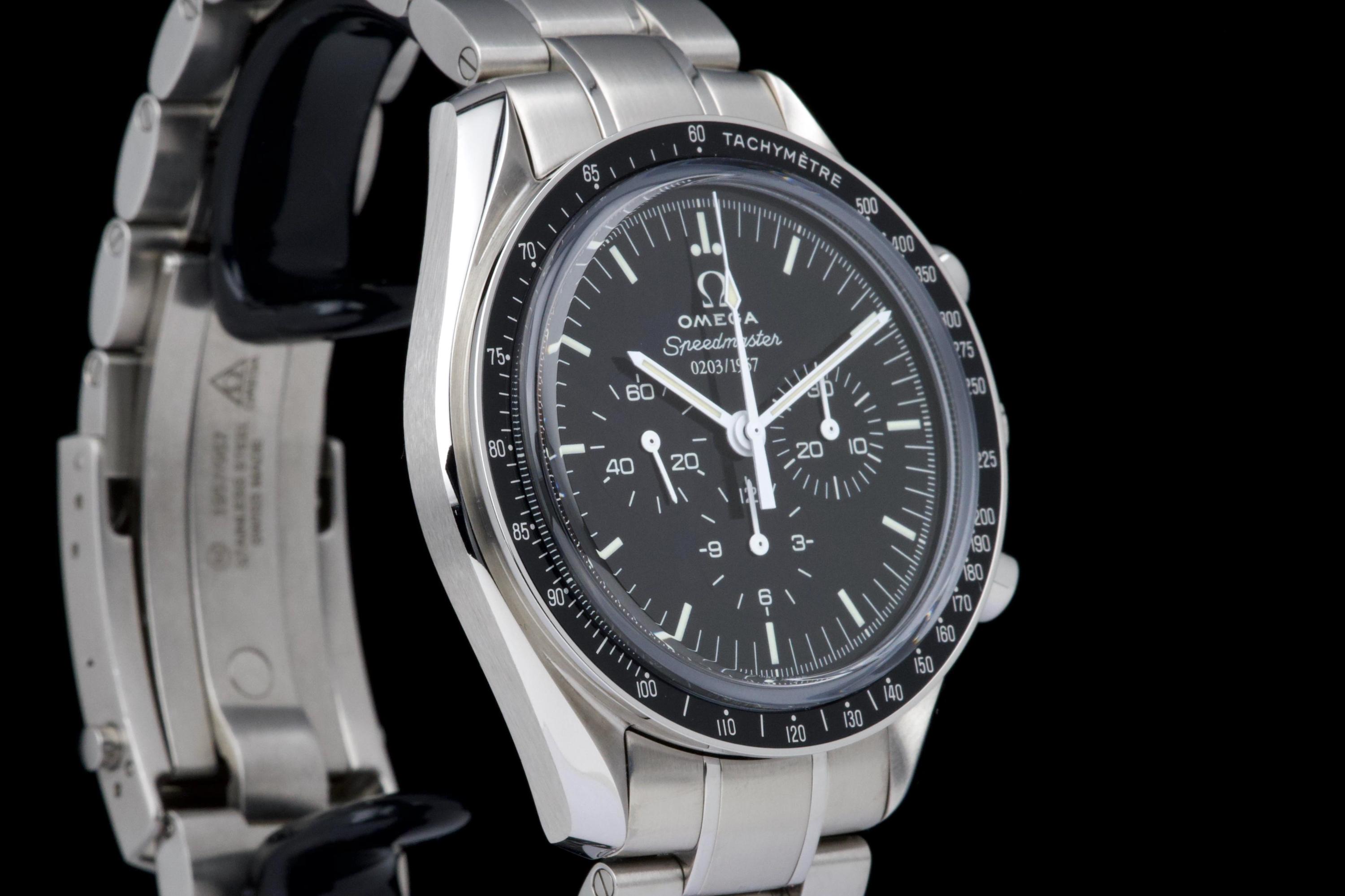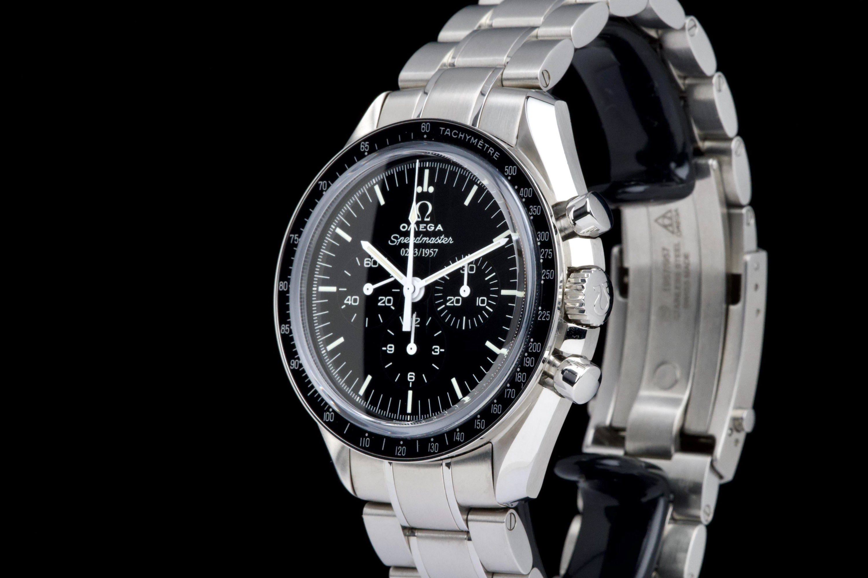 The present Omega Speedmaster Professional Moonwatch 50th Anniversary reference 311.33.42.50.01.001 is a commemorative edition celebrating one of the most iconic chronographs ever produced. Offered with its original box and accessories, this model pays tribute to the enduring legacy of the Speedmaster within Omega’s history. The stainless-steel case appears to be unpolished and is preserved in very good overall condition, showing only very light wear from use. The watch retains its original aesthetic with strong lines and a clean overall appearance. The watch is fitted with its original stainless-steel bracelet, delivered with all links present, ensuring full adjustability. It is accompanied by its original presentation box and the chronometer certificate card bearing the serial and reference numbers. The international warranty card, originally dealer-stamped, is unfortunately missing. While no service history accompanies the watch, it is functioning correctly at the time of cataloguing. Combining the timeless Moonwatch design with commemorative significance and honest overall condition, this Speedmaster 50th Anniversary represents a compelling opportunity to acquire a classic Omega chronograph with strong collector appeal.