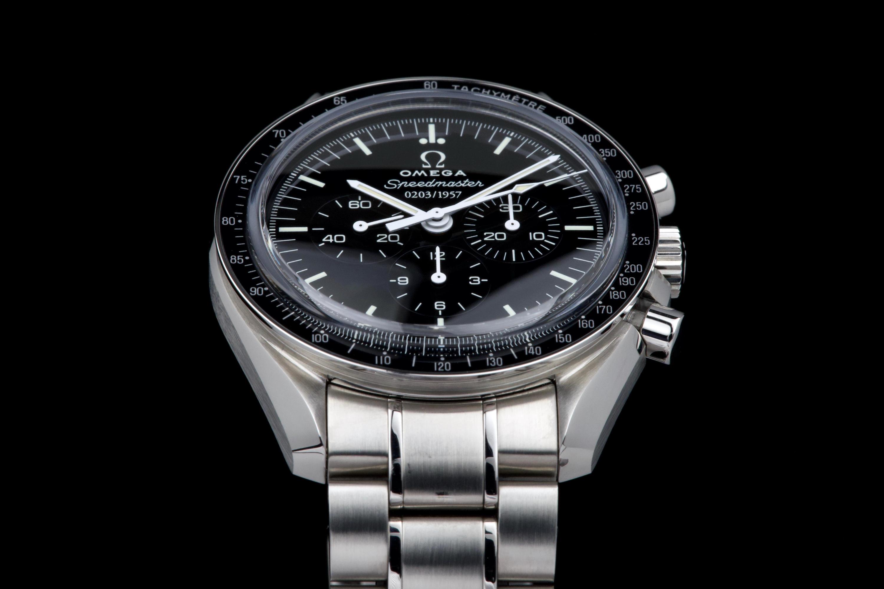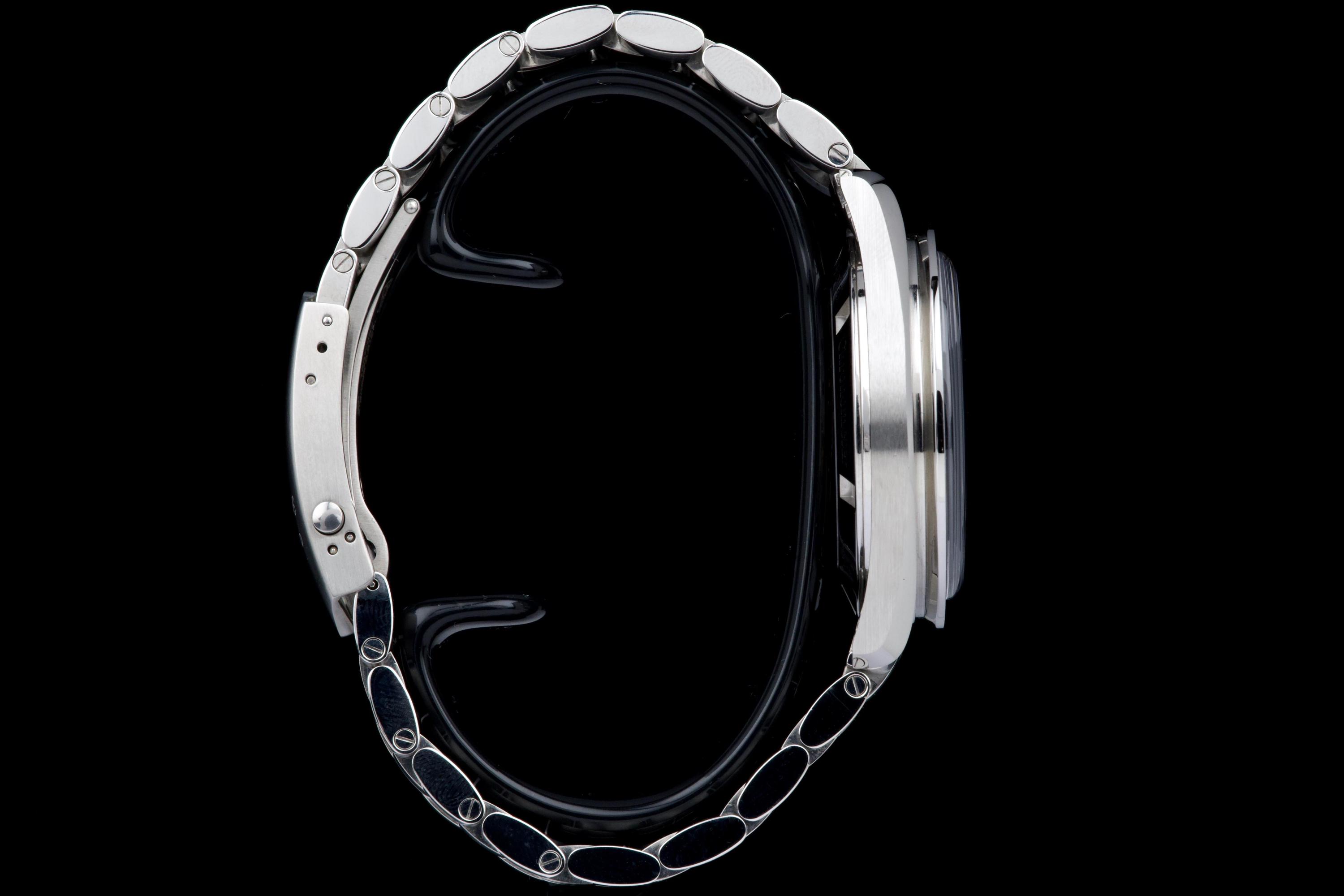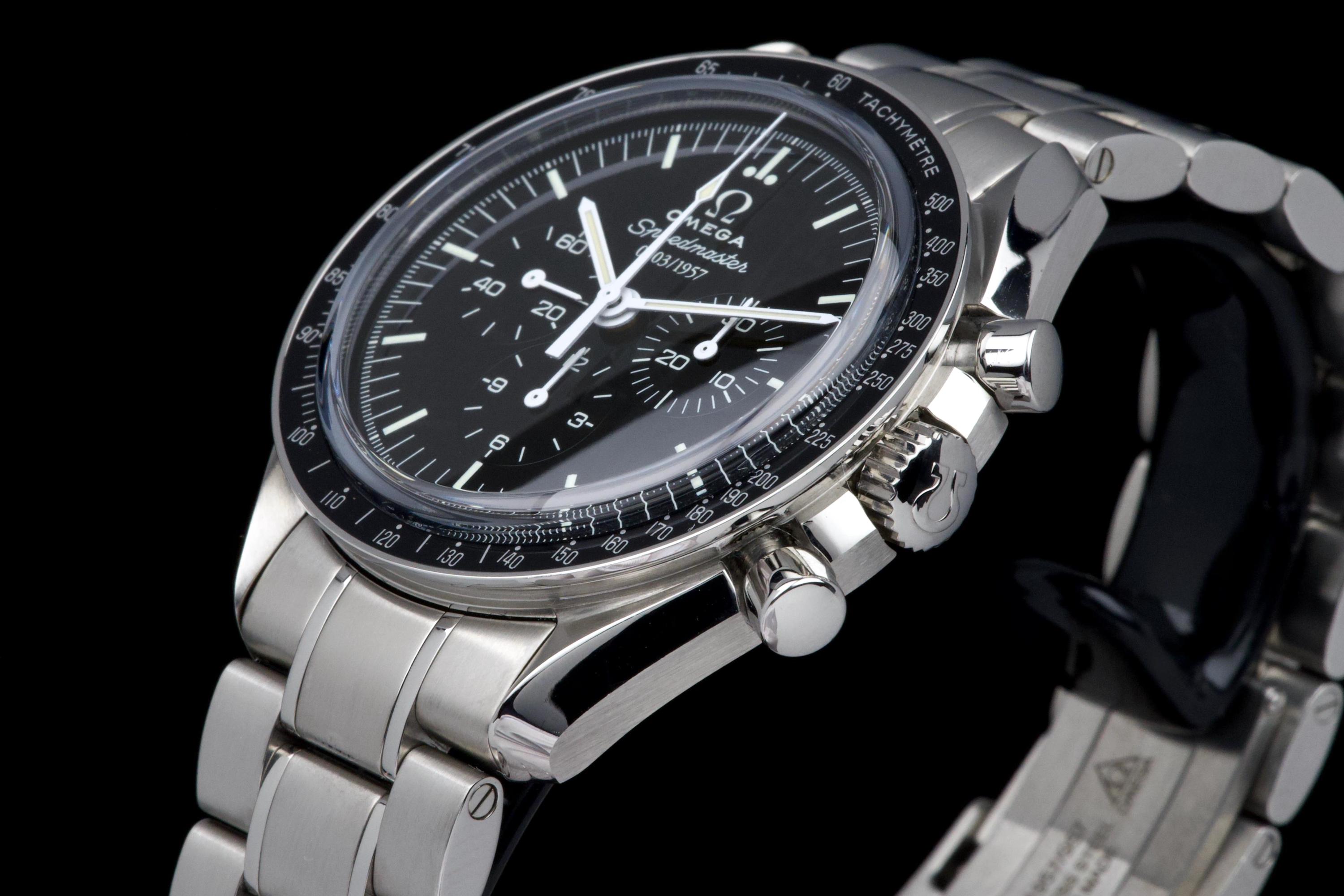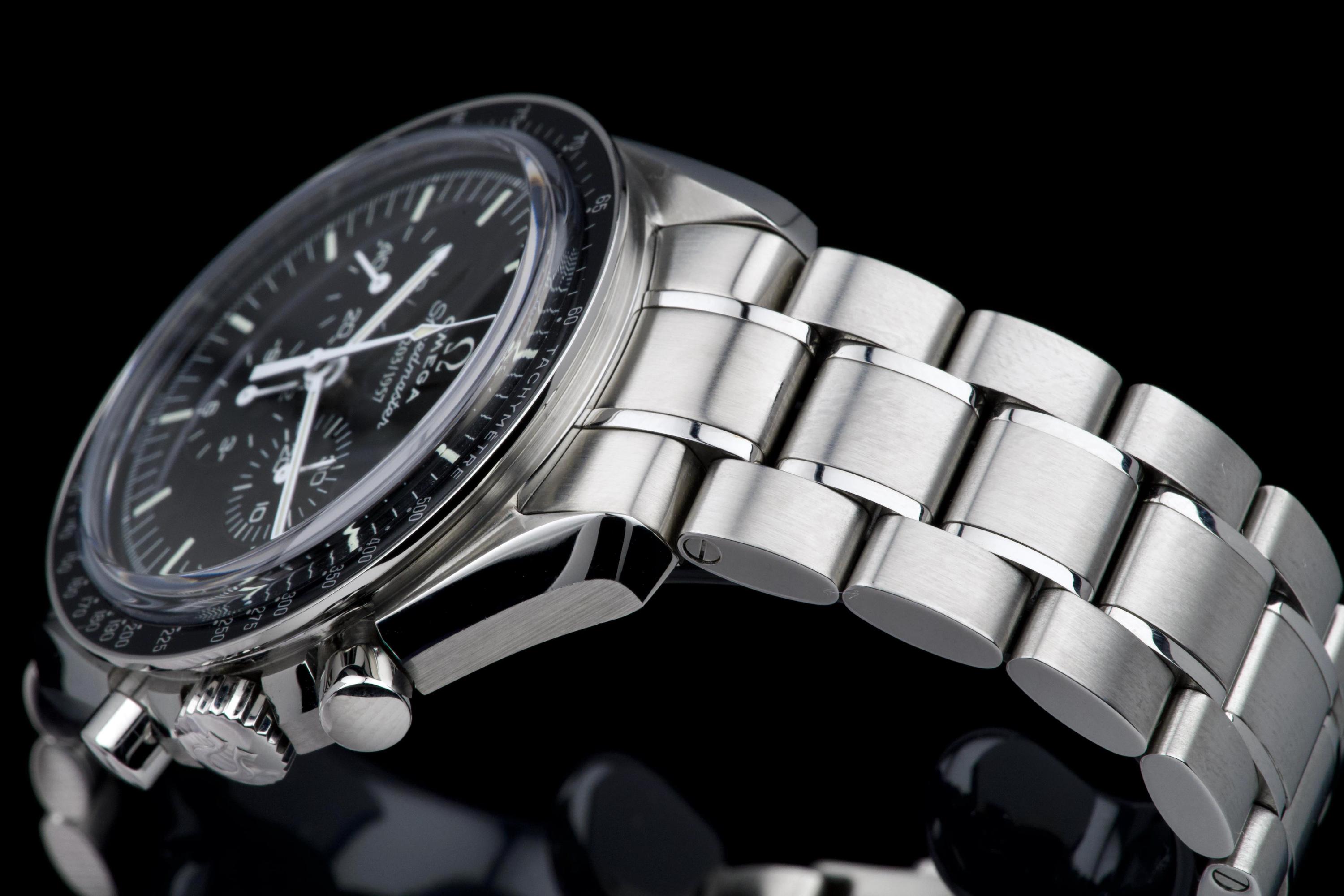 The present Omega Speedmaster Professional Moonwatch 50th Anniversary reference 311.33.42.50.01.001 is a commemorative edition celebrating one of the most iconic chronographs ever produced. Offered with its original box and accessories, this model pays tribute to the enduring legacy of the Speedmaster within Omega’s history. The stainless-steel case appears to be unpolished and is preserved in very good overall condition, showing only very light wear from use. The watch retains its original aesthetic with strong lines and a clean overall appearance. The watch is fitted with its original stainless-steel bracelet, delivered with all links present, ensuring full adjustability. It is accompanied by its original presentation box and the chronometer certificate card bearing the serial and reference numbers. The international warranty card, originally dealer-stamped, is unfortunately missing. While no service history accompanies the watch, it is functioning correctly at the time of cataloguing. Combining the timeless Moonwatch design with commemorative significance and honest overall condition, this Speedmaster 50th Anniversary represents a compelling opportunity to acquire a classic Omega chronograph with strong collector appeal.