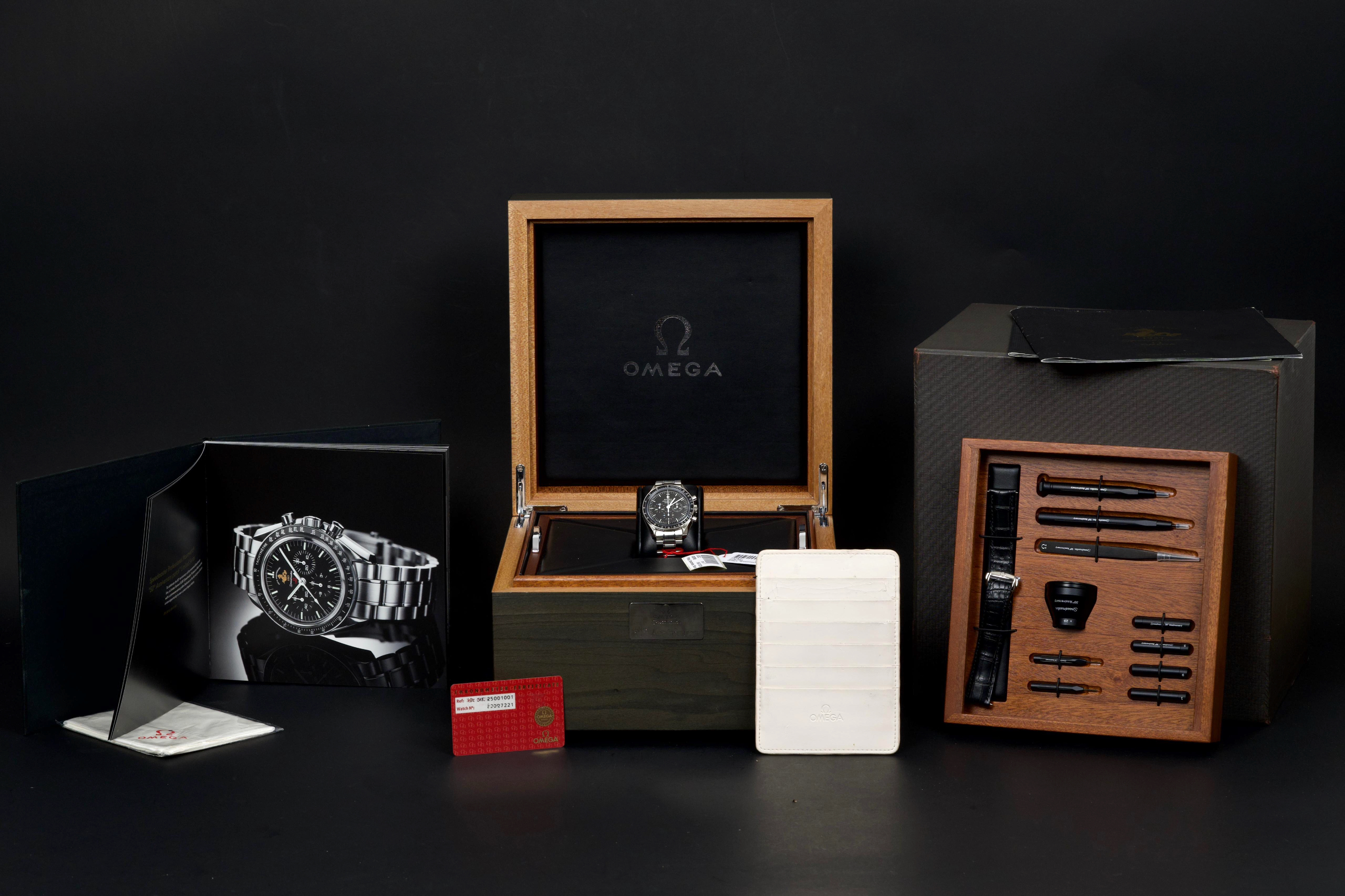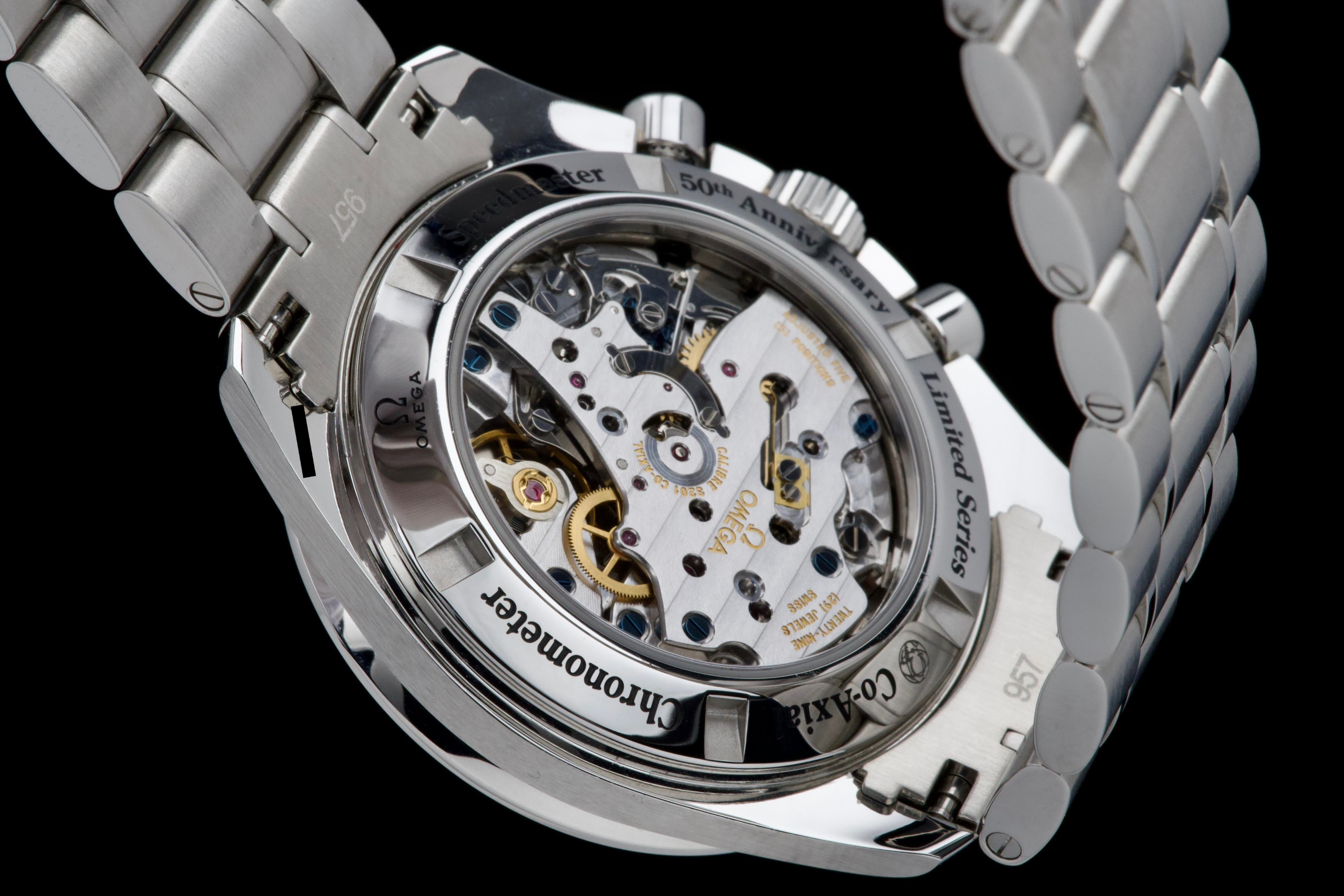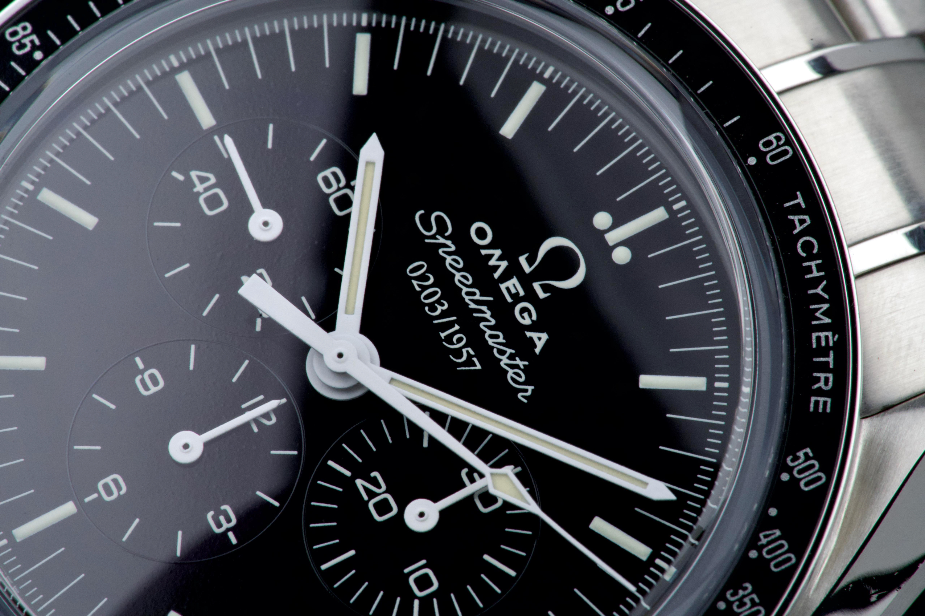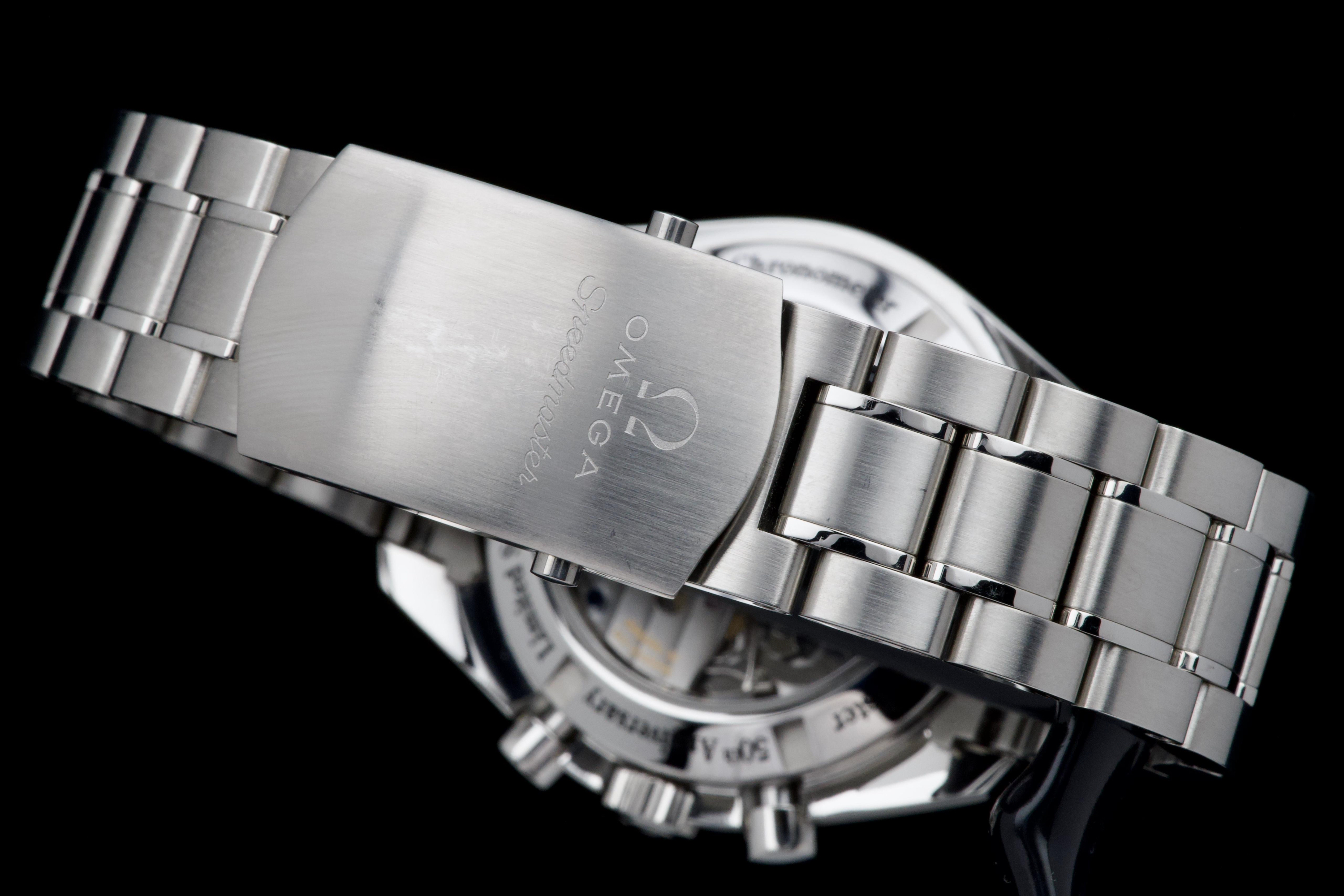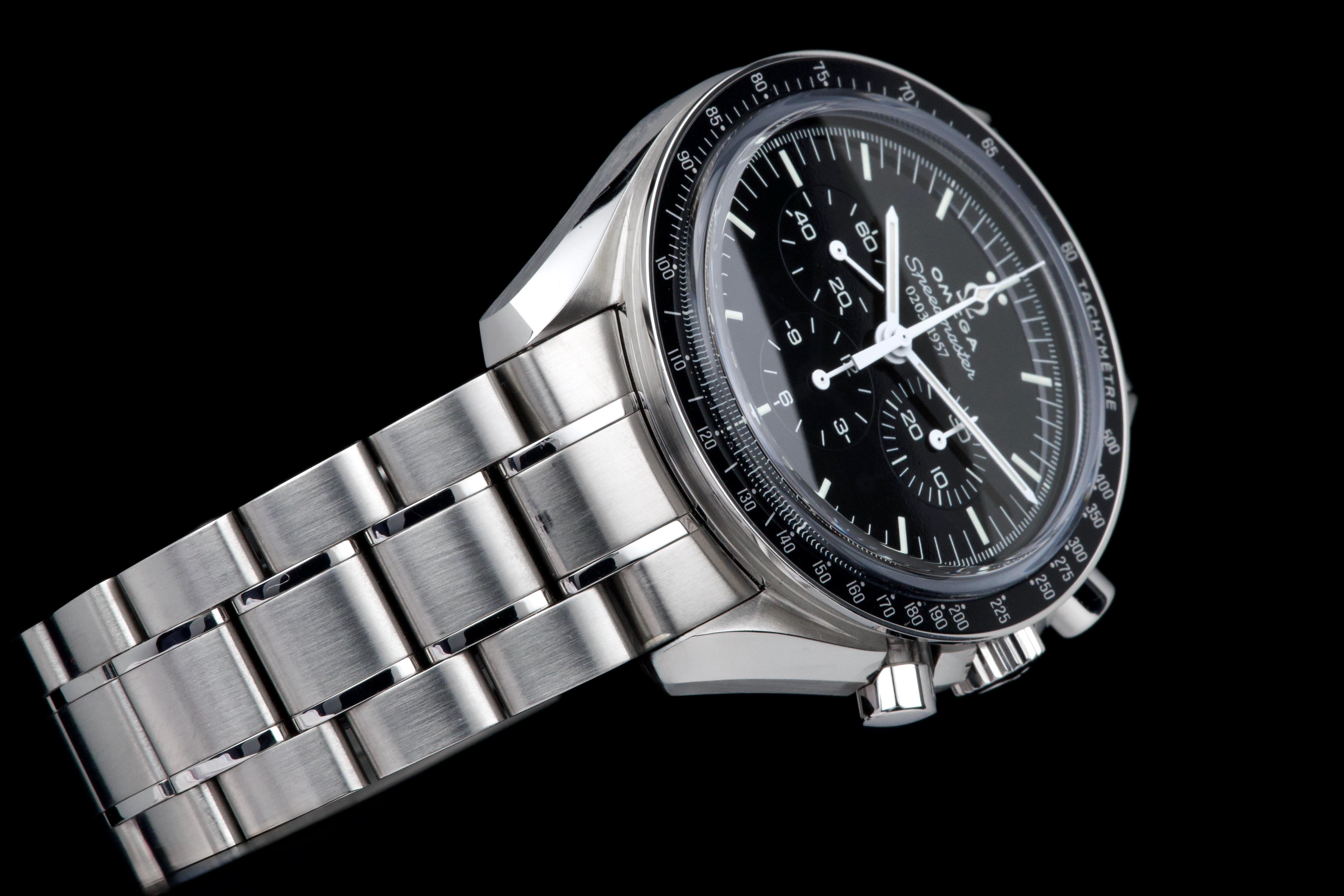 The present Omega Speedmaster Professional Moonwatch 50th Anniversary reference 311.33.42.50.01.001 is a commemorative edition celebrating one of the most iconic chronographs ever produced. Offered with its original box and accessories, this model pays tribute to the enduring legacy of the Speedmaster within Omega’s history. The stainless-steel case appears to be unpolished and is preserved in very good overall condition, showing only very light wear from use. The watch retains its original aesthetic with strong lines and a clean overall appearance. The watch is fitted with its original stainless-steel bracelet, delivered with all links present, ensuring full adjustability. It is accompanied by its original presentation box and the chronometer certificate card bearing the serial and reference numbers. The international warranty card, originally dealer-stamped, is unfortunately missing. While no service history accompanies the watch, it is functioning correctly at the time of cataloguing. Combining the timeless Moonwatch design with commemorative significance and honest overall condition, this Speedmaster 50th Anniversary represents a compelling opportunity to acquire a classic Omega chronograph with strong collector appeal.