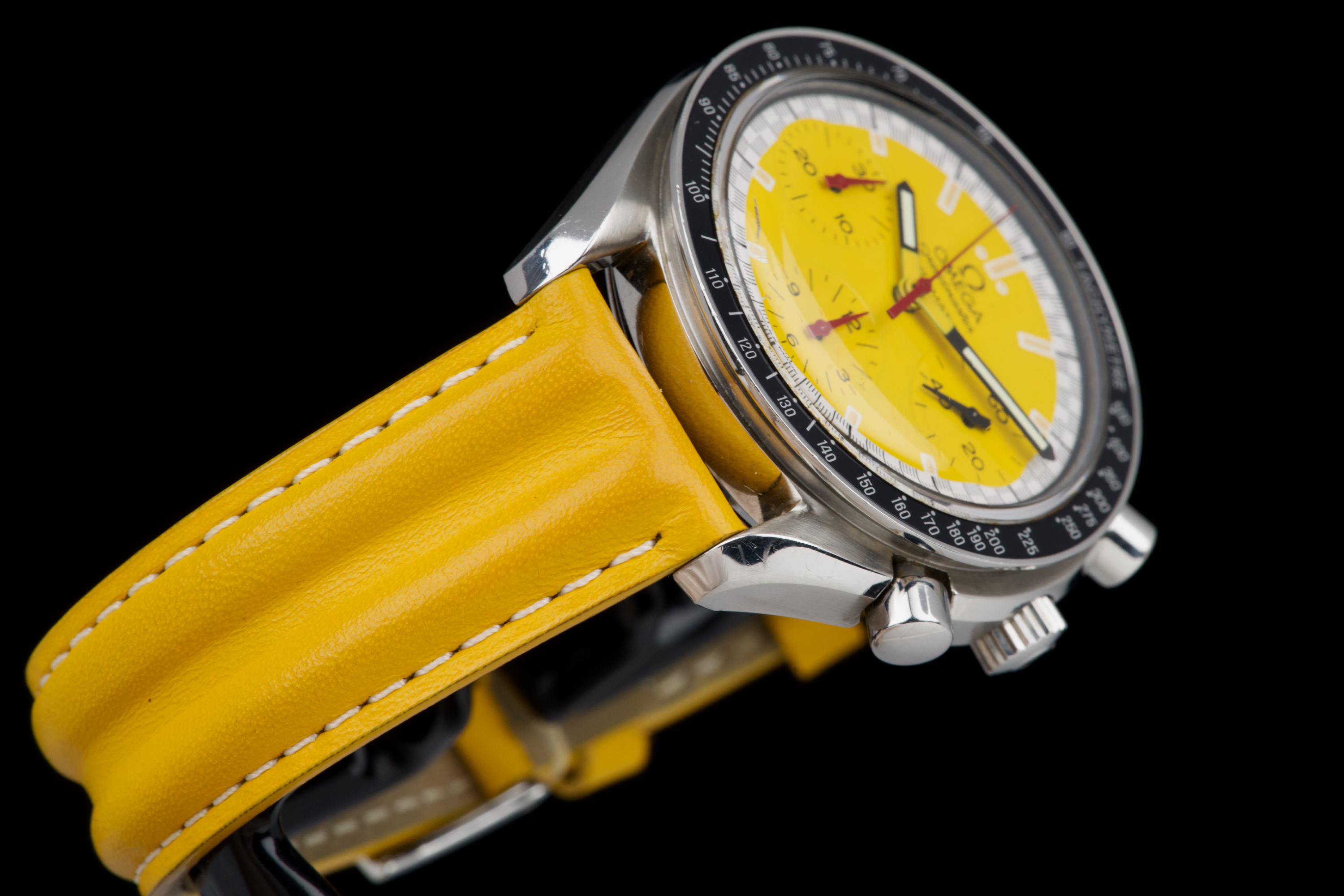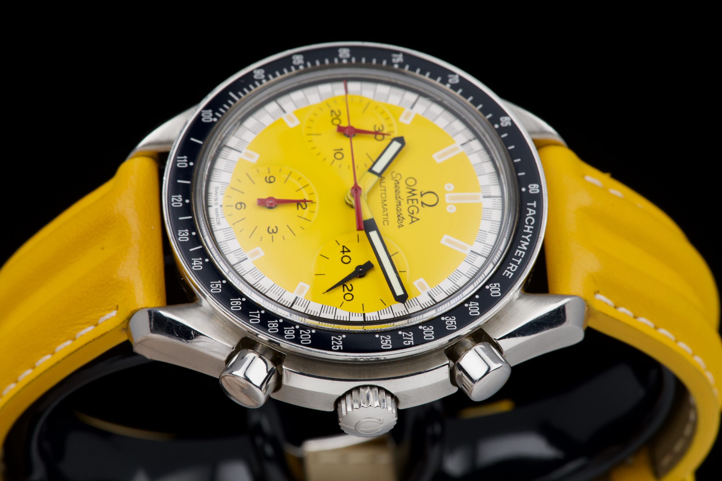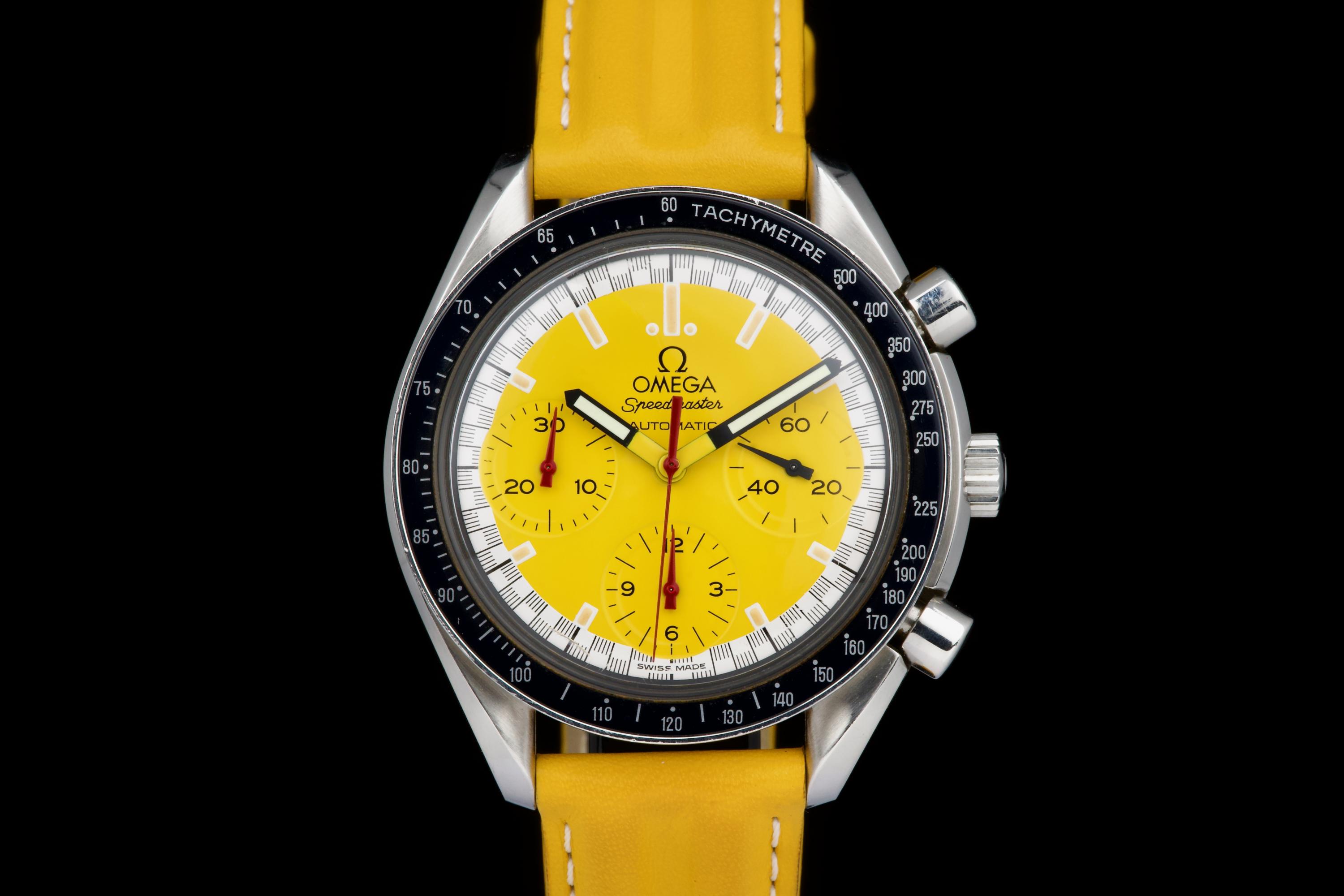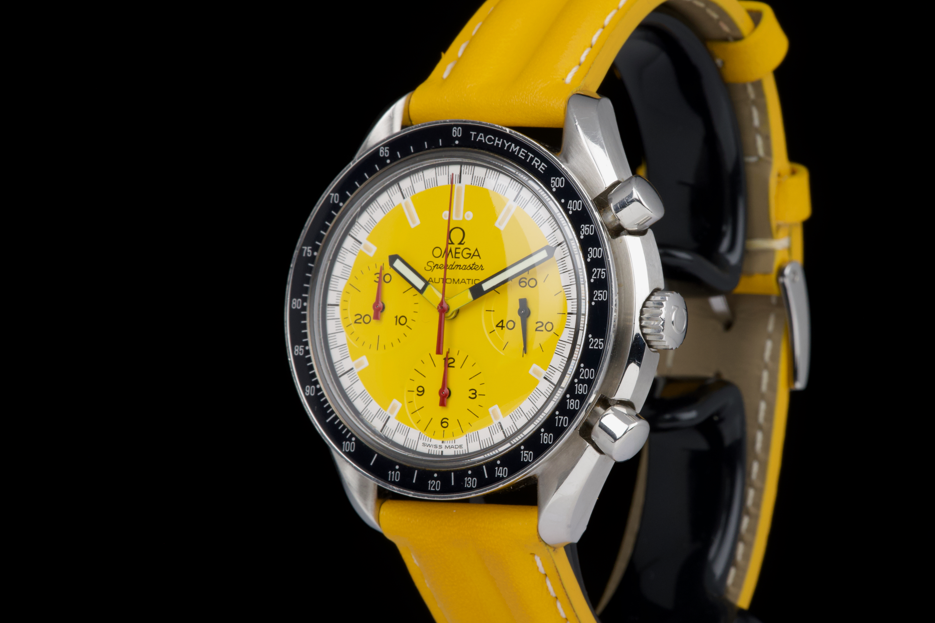 The present Omega Speedmaster Reduced Automatic “Schumacher” reference 3810.12.40, dating to 1997, is offered here as a complete full set and was originally sold new in Bienne in January 1997. Produced in tribute to Michael Schumacher, this model is among the most distinctive and instantly recognizable executions of the Speedmaster line. The watch remains unpolished and is preserved in good overall condition, showing surface scratches and small marks consistent with honest wear and age. The striking yellow dial retains its original tritium luminous material, displaying attractive and even ageing, and is paired with matching tritium hands, resulting in a harmonious and authentic appearance. The plexiglass crystal shows light surface scratches typical of use and consistent with its age. The watch is fitted with a yellow leather strap in near-new condition, secured by an Omega tang buckle, further reinforcing the bold and sporty character of the piece. While no service history is recorded, the movement has been checked and is functioning correctly. Delivered with the complete set as shown in the accompanying photographs, this Speedmaster Reduced Schumacher represents an appealing opportunity to acquire a fully complete, unpolished example with strong colour presence and confirmed early provenance.