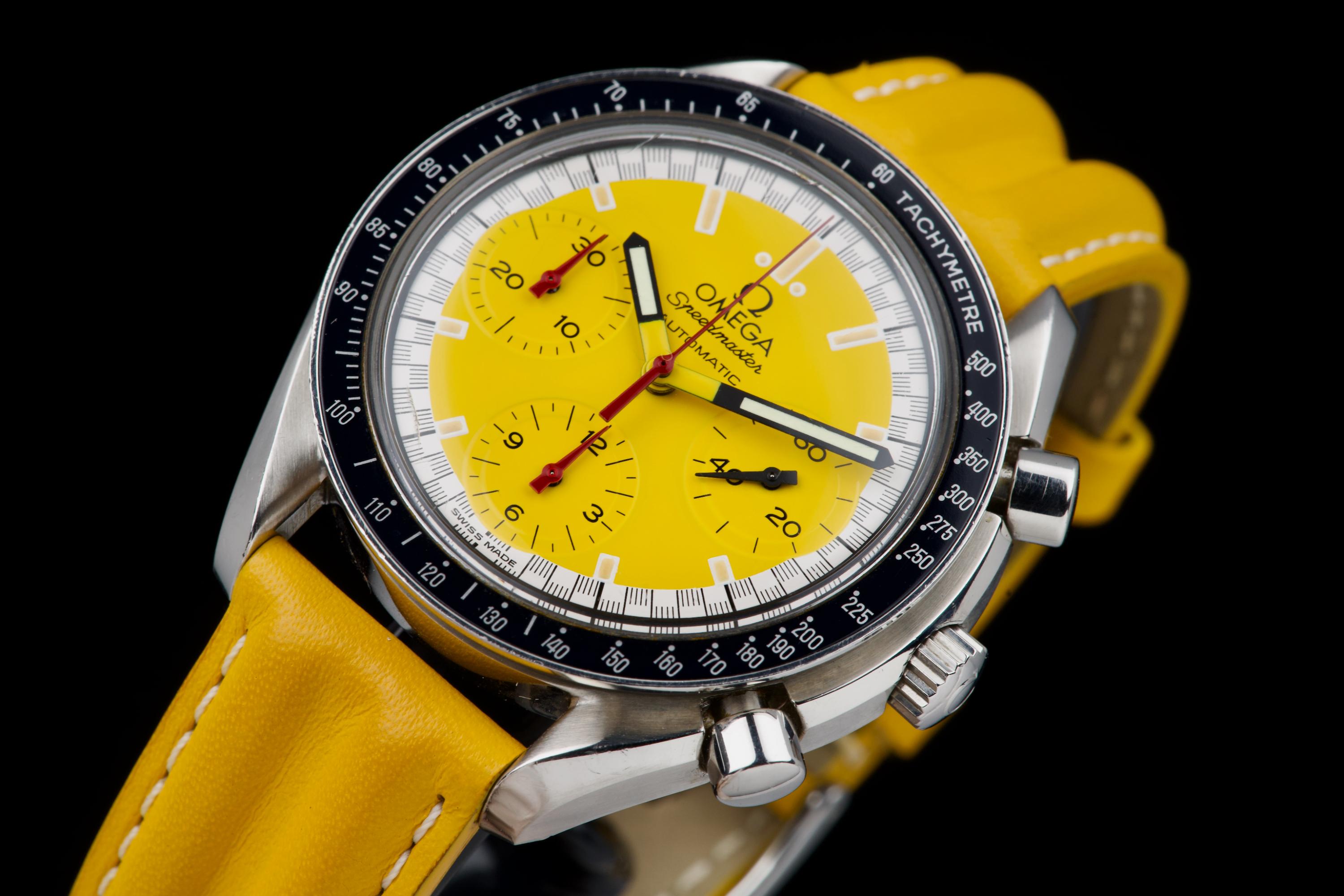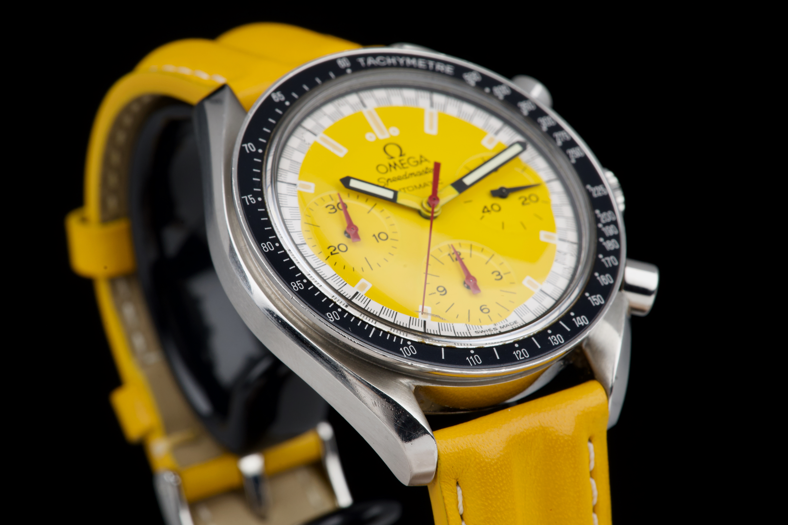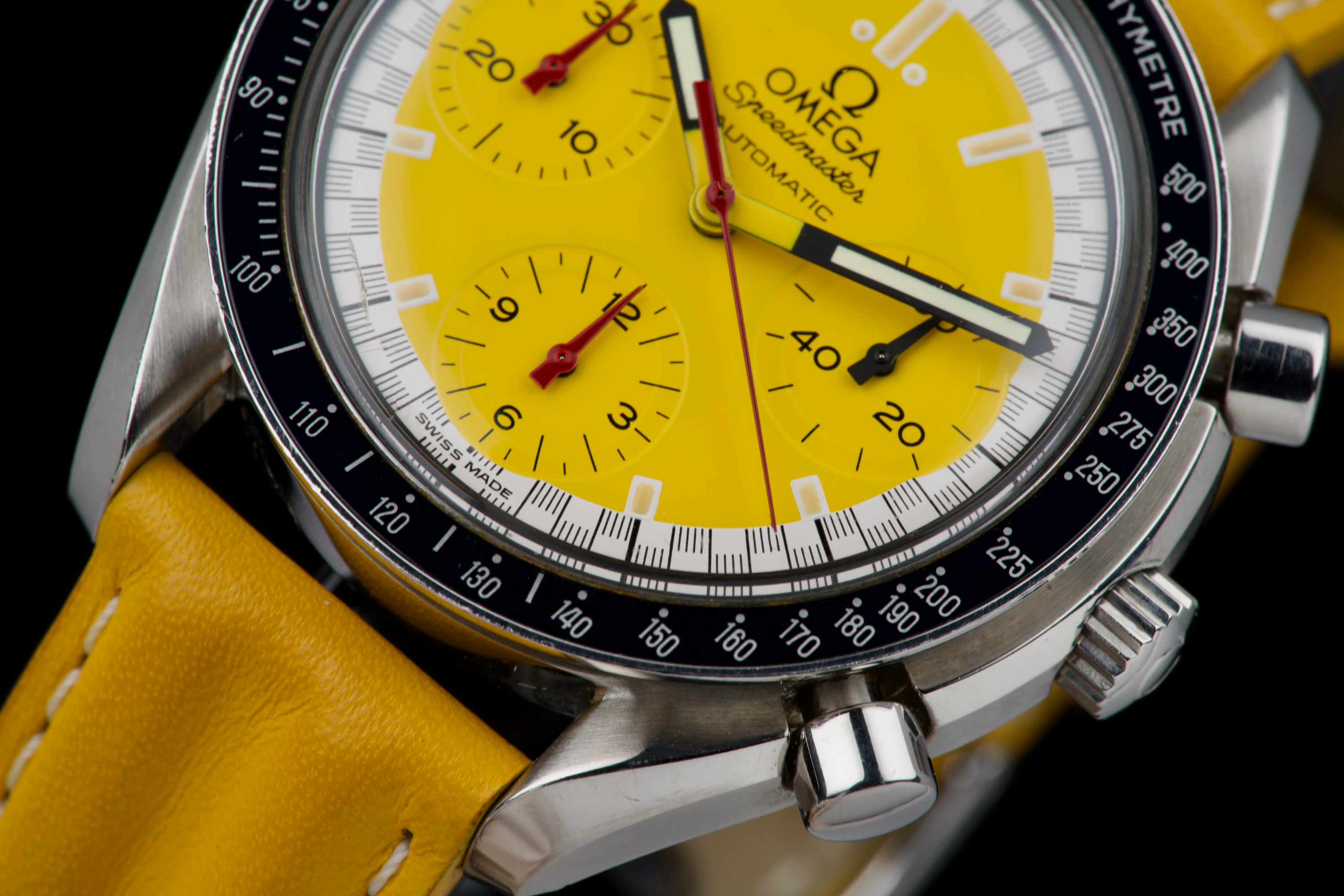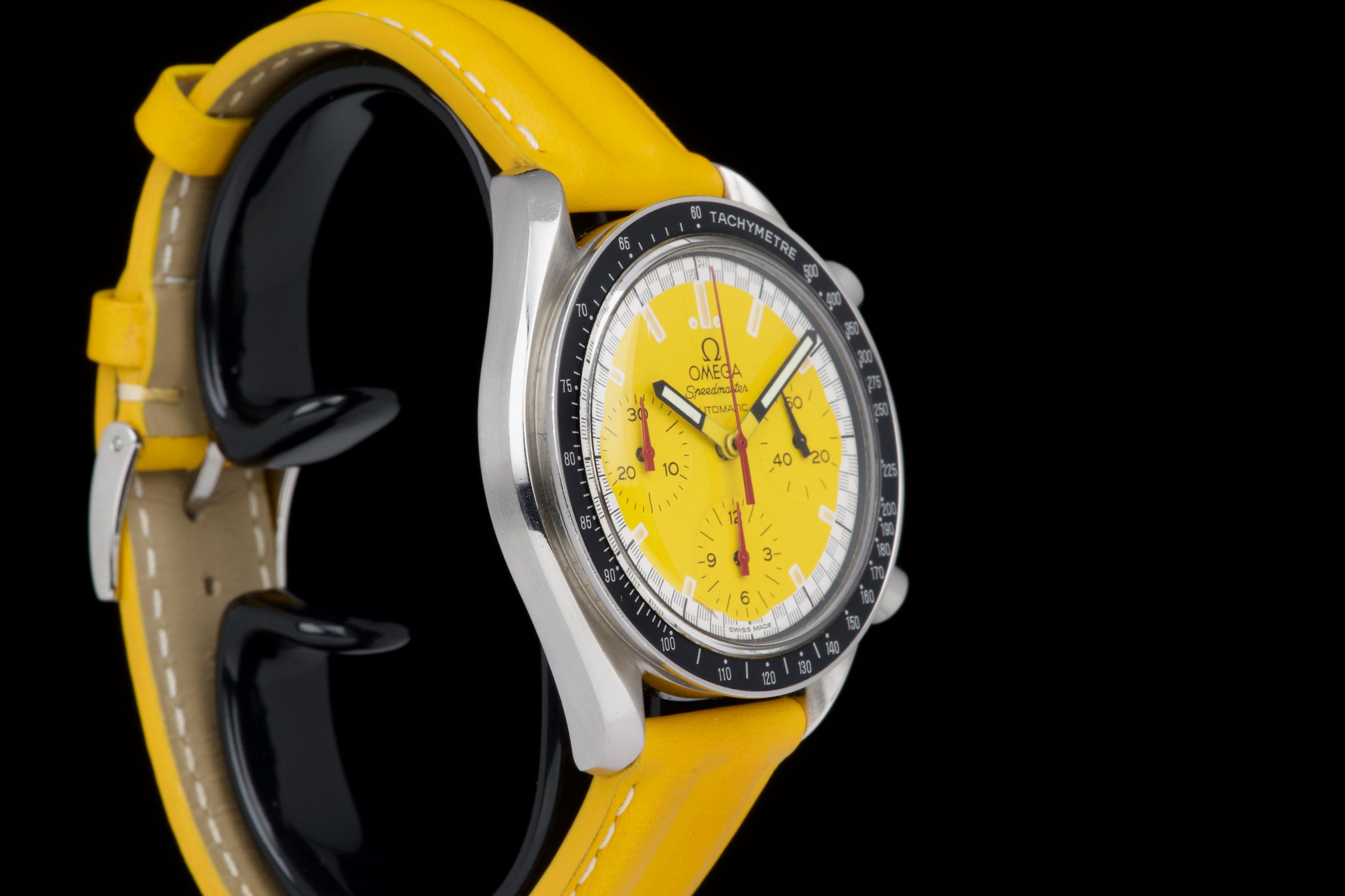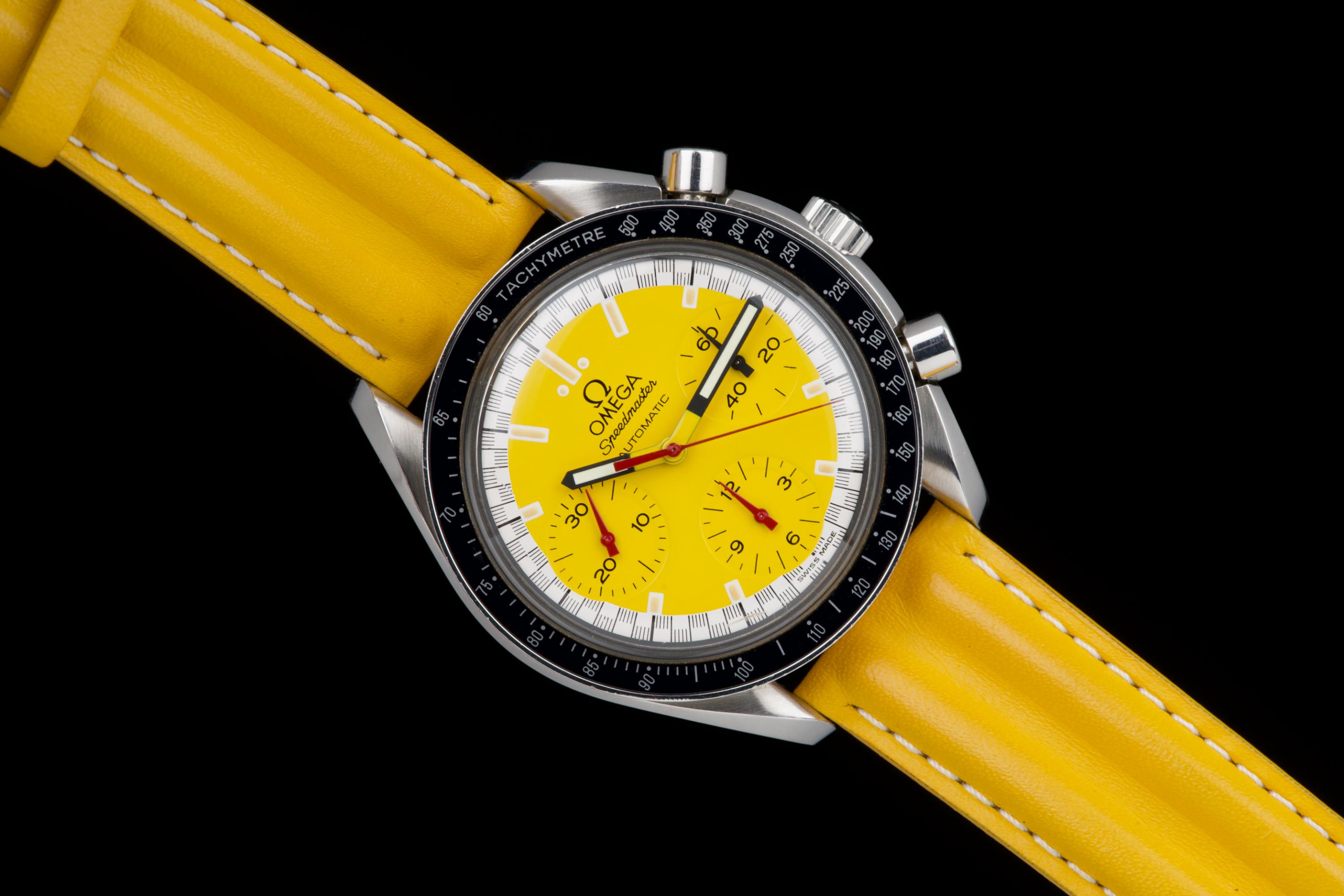 The present Omega Speedmaster Reduced Automatic “Schumacher” reference 3810.12.40, dating to 1997, is offered here as a complete full set and was originally sold new in Bienne in January 1997. Produced in tribute to Michael Schumacher, this model is among the most distinctive and instantly recognizable executions of the Speedmaster line. The watch remains unpolished and is preserved in good overall condition, showing surface scratches and small marks consistent with honest wear and age. The striking yellow dial retains its original tritium luminous material, displaying attractive and even ageing, and is paired with matching tritium hands, resulting in a harmonious and authentic appearance. The plexiglass crystal shows light surface scratches typical of use and consistent with its age. The watch is fitted with a yellow leather strap in near-new condition, secured by an Omega tang buckle, further reinforcing the bold and sporty character of the piece. While no service history is recorded, the movement has been checked and is functioning correctly. Delivered with the complete set as shown in the accompanying photographs, this Speedmaster Reduced Schumacher represents an appealing opportunity to acquire a fully complete, unpolished example with strong colour presence and confirmed early provenance.