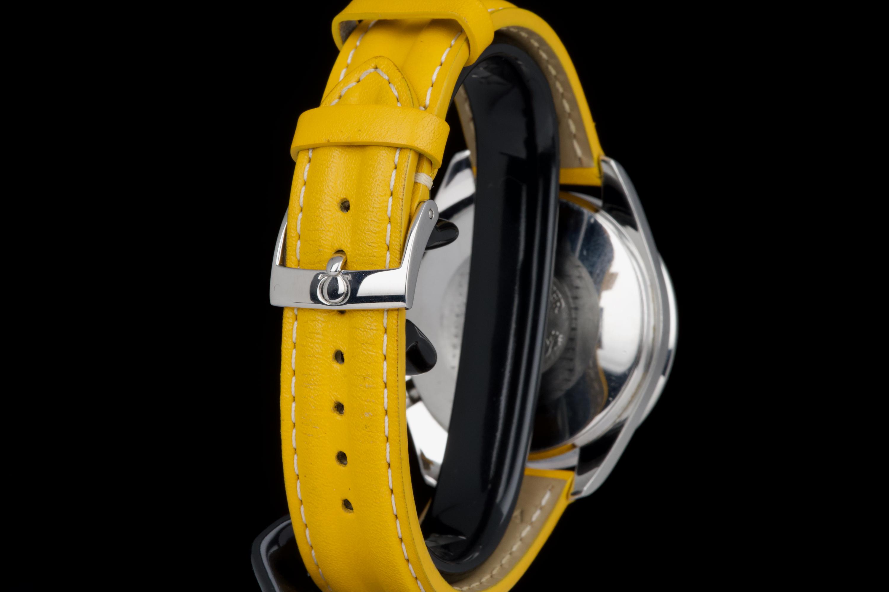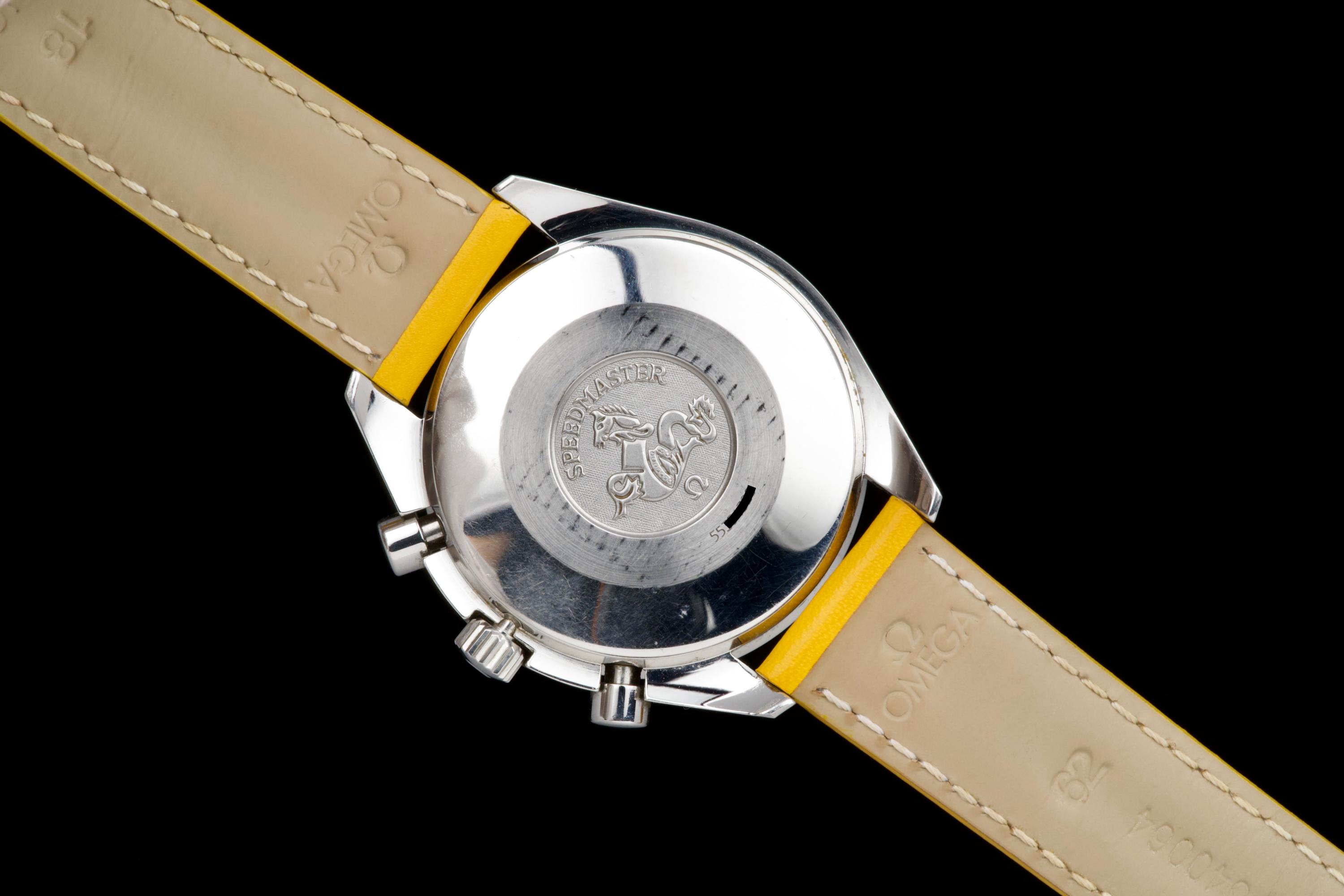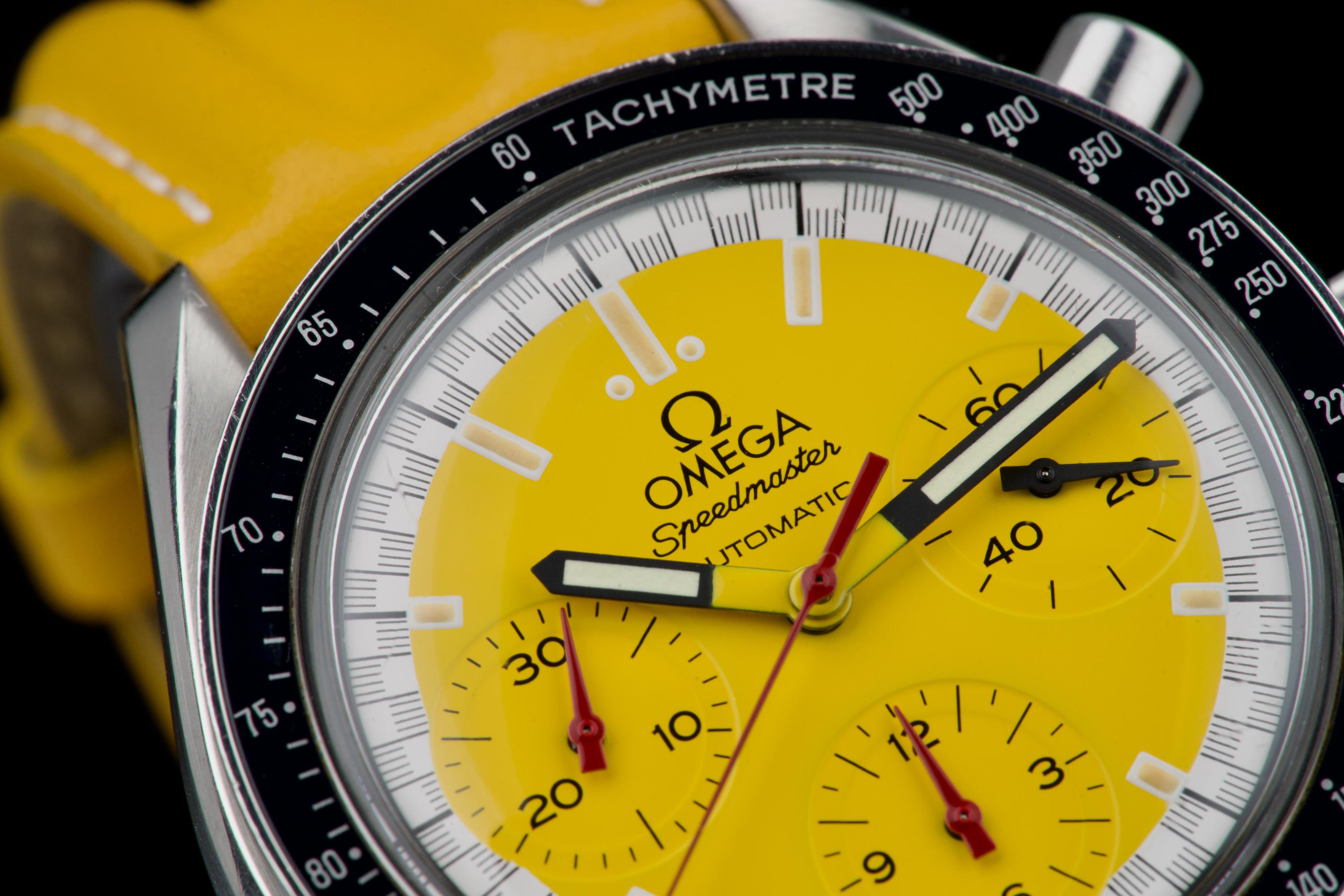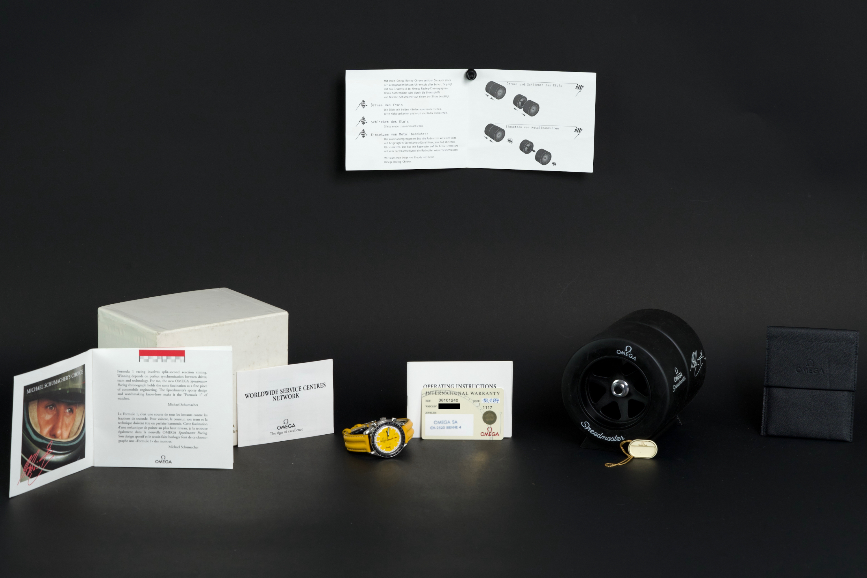 The present Omega Speedmaster Reduced Automatic “Schumacher” reference 3810.12.40, dating to 1997, is offered here as a complete full set and was originally sold new in Bienne in January 1997. Produced in tribute to Michael Schumacher, this model is among the most distinctive and instantly recognizable executions of the Speedmaster line. The watch remains unpolished and is preserved in good overall condition, showing surface scratches and small marks consistent with honest wear and age. The striking yellow dial retains its original tritium luminous material, displaying attractive and even ageing, and is paired with matching tritium hands, resulting in a harmonious and authentic appearance. The plexiglass crystal shows light surface scratches typical of use and consistent with its age. The watch is fitted with a yellow leather strap in near-new condition, secured by an Omega tang buckle, further reinforcing the bold and sporty character of the piece. While no service history is recorded, the movement has been checked and is functioning correctly. Delivered with the complete set as shown in the accompanying photographs, this Speedmaster Reduced Schumacher represents an appealing opportunity to acquire a fully complete, unpolished example with strong colour presence and confirmed early provenance.