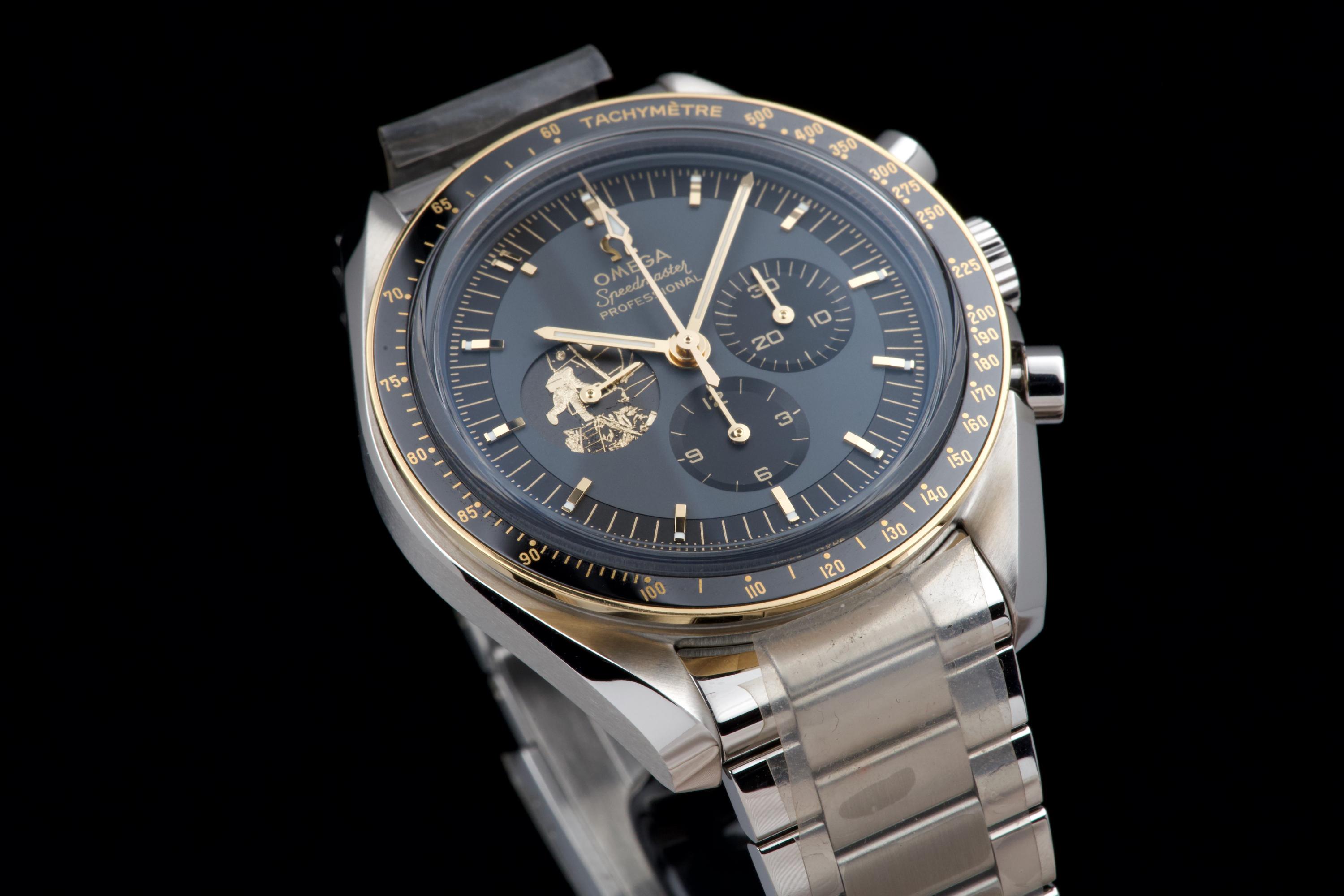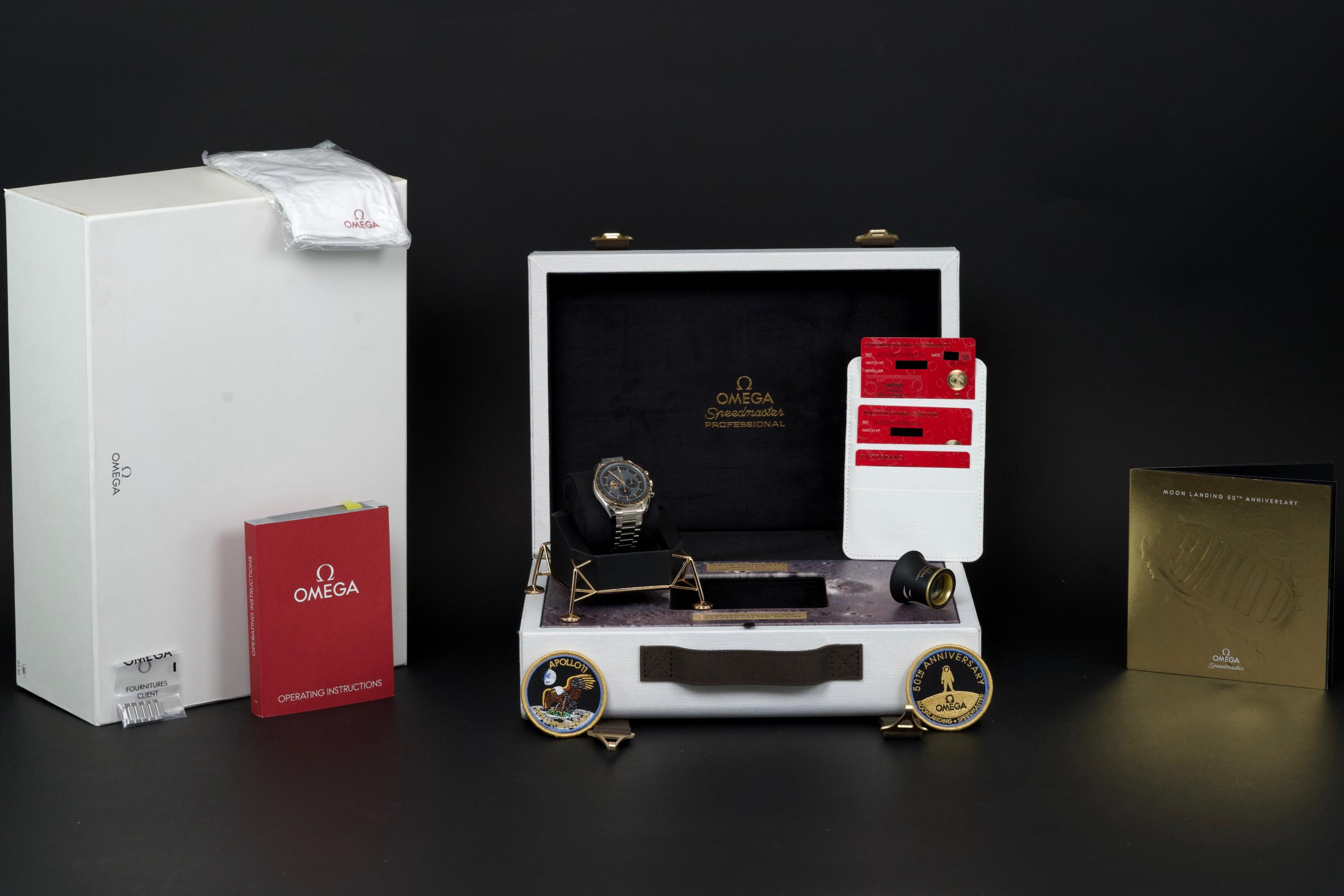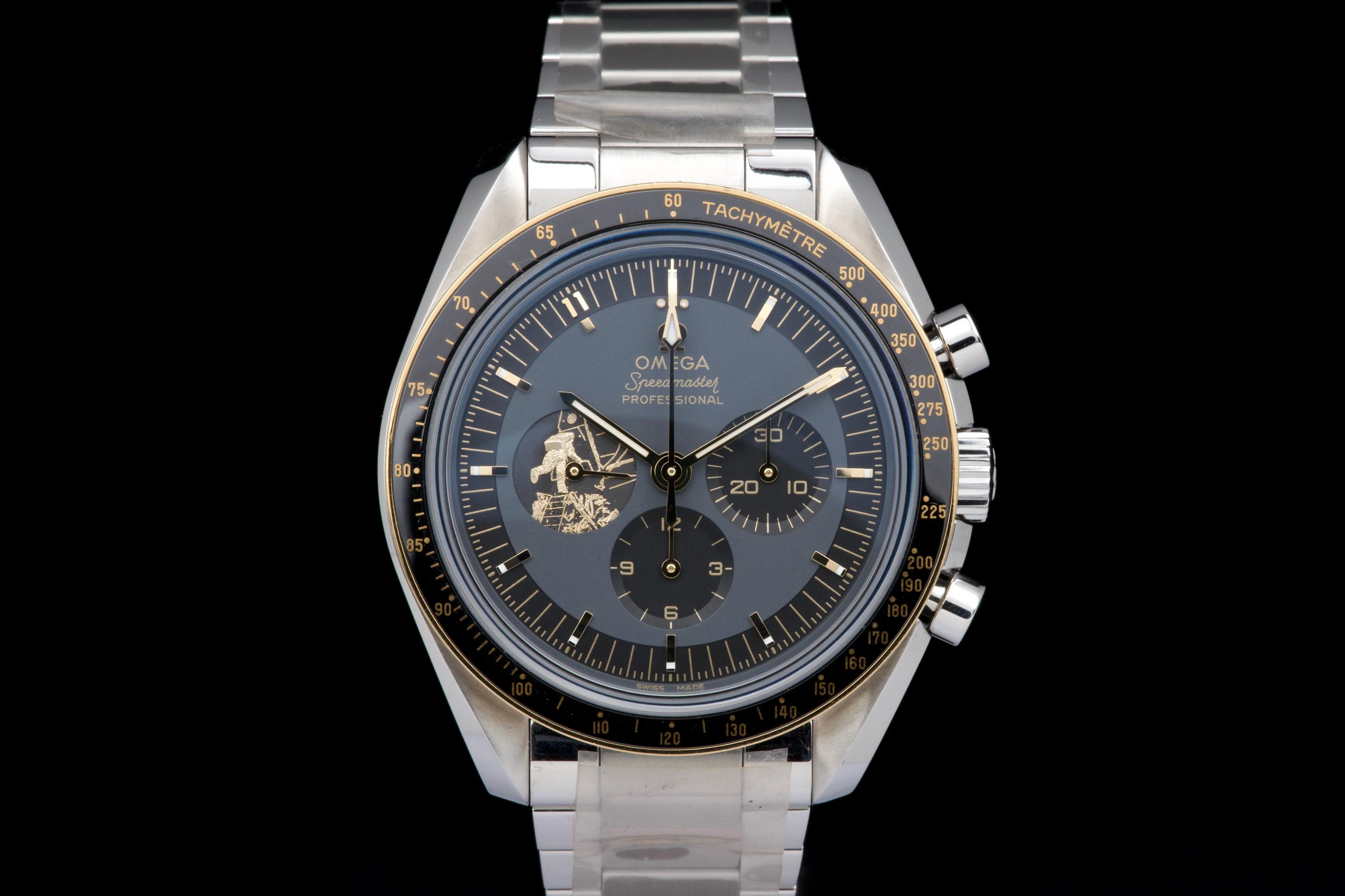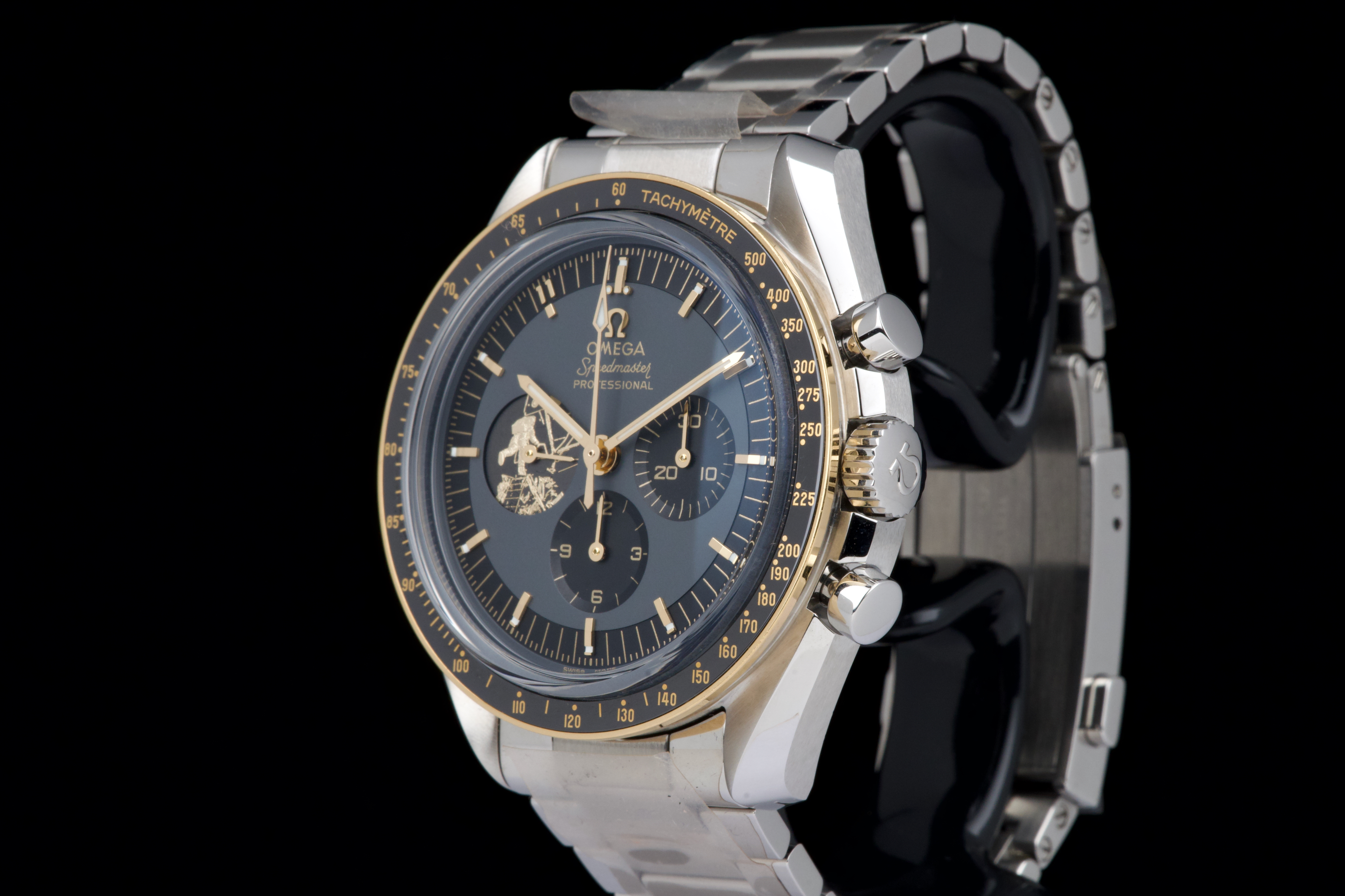 The present Omega Speedmaster Apollo 11 50th Anniversary, released in 2019 as a limited edition, is a highly collectible modern tribute to one of the most significant moments in space and watchmaking history. Celebrating the 50th anniversary of the Apollo 11 mission, this reference combines historical importance with Omega’s latest technical advancements.The watch is powered by the manually wound calibre 3861, Omega’s Master Chronometer-certified evolution of the legendary Moonwatch movement, offering enhanced precision, magnetic resistance, and reliability while remaining faithful to the spirit of the original Speedmaster Professional. Preserved in excellent overall condition, the watch has been worn very little. Notably, protective stickers remain present on the bracelet, underscoring its careful ownership and near-new presentation. The case, dial, and bracelet all display a crisp and clean appearance, consistent with minimal use. Combining commemorative significance, a modern high-performance movement, and outstanding condition, this Speedmaster Apollo 11 Anniversary edition represents a compelling opportunity to acquire a landmark contemporary Omega that bridges heritage and innovation.