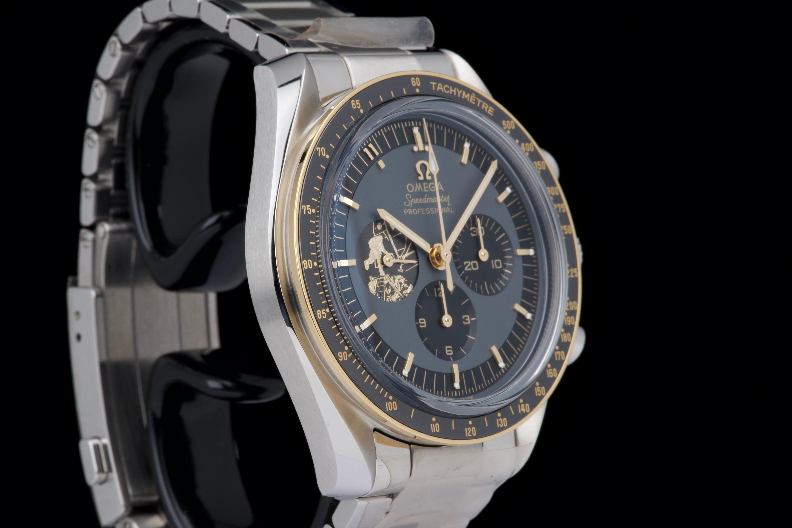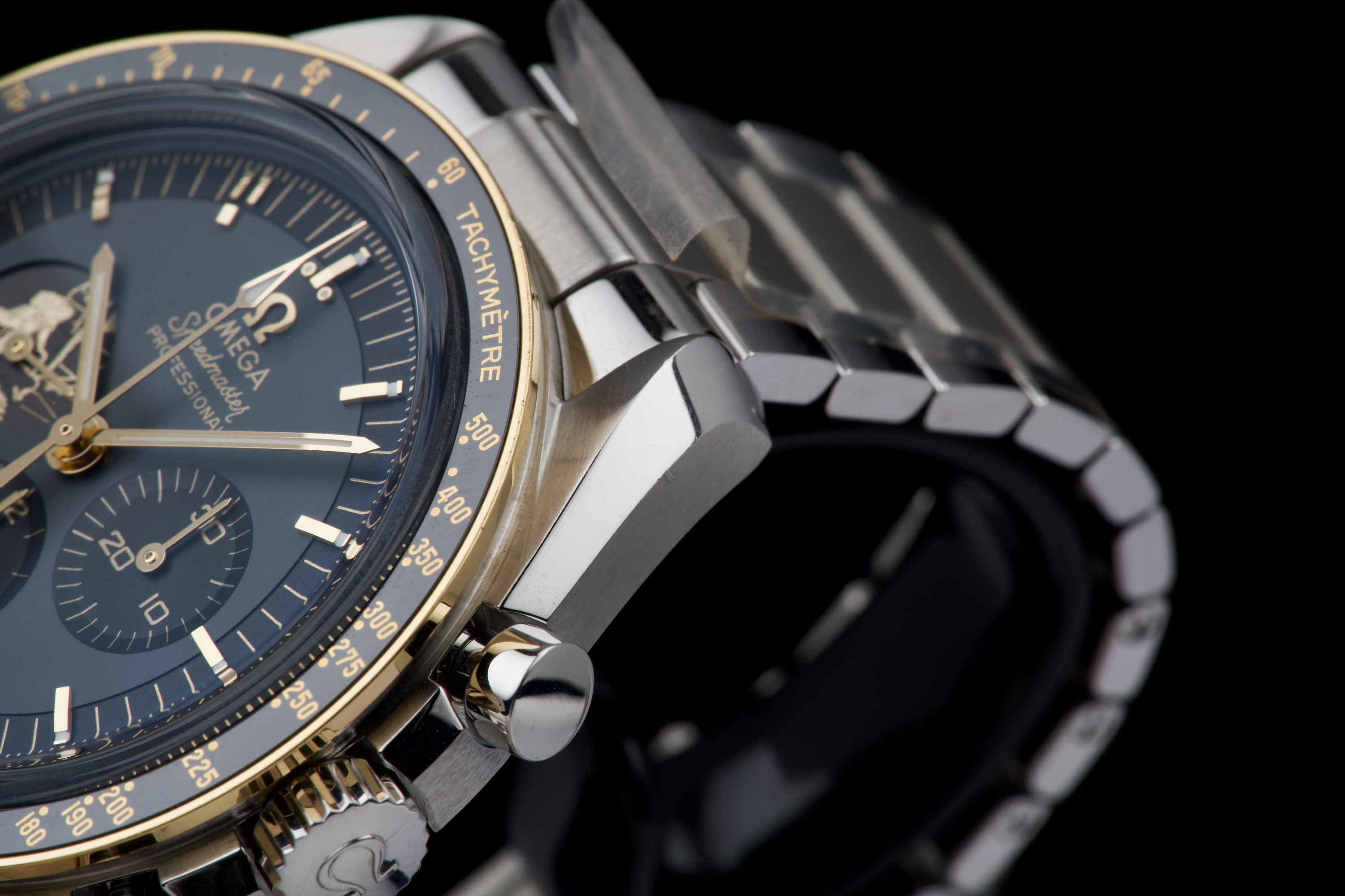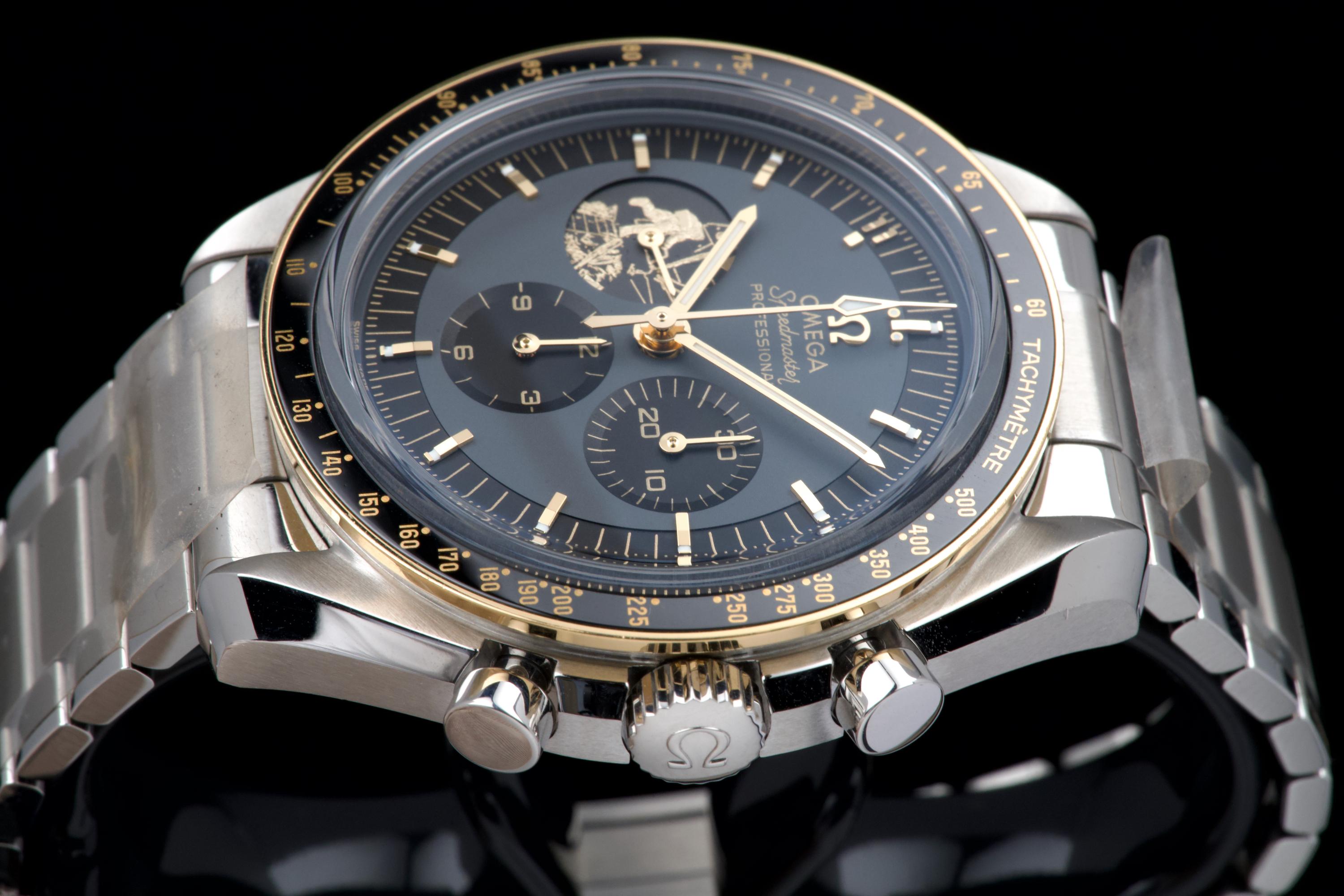 The present Omega Speedmaster Apollo 11 50th Anniversary, released in 2019 as a limited edition, is a highly collectible modern tribute to one of the most significant moments in space and watchmaking history. Celebrating the 50th anniversary of the Apollo 11 mission, this reference combines historical importance with Omega’s latest technical advancements.The watch is powered by the manually wound calibre 3861, Omega’s Master Chronometer-certified evolution of the legendary Moonwatch movement, offering enhanced precision, magnetic resistance, and reliability while remaining faithful to the spirit of the original Speedmaster Professional. Preserved in excellent overall condition, the watch has been worn very little. Notably, protective stickers remain present on the bracelet, underscoring its careful ownership and near-new presentation. The case, dial, and bracelet all display a crisp and clean appearance, consistent with minimal use. Combining commemorative significance, a modern high-performance movement, and outstanding condition, this Speedmaster Apollo 11 Anniversary edition represents a compelling opportunity to acquire a landmark contemporary Omega that bridges heritage and innovation.