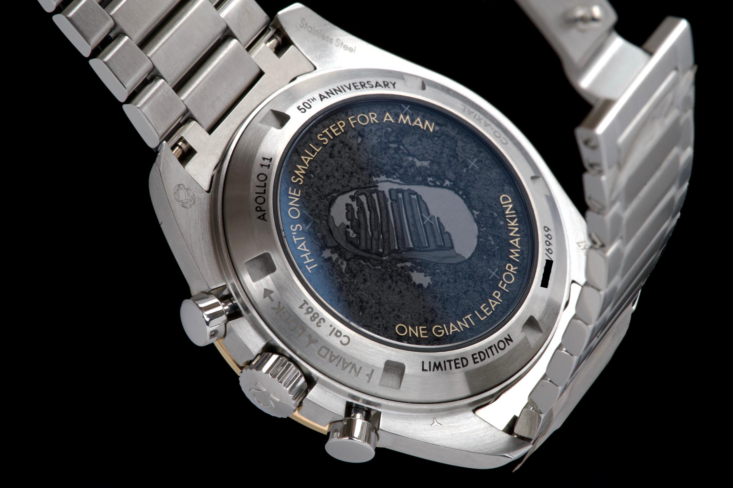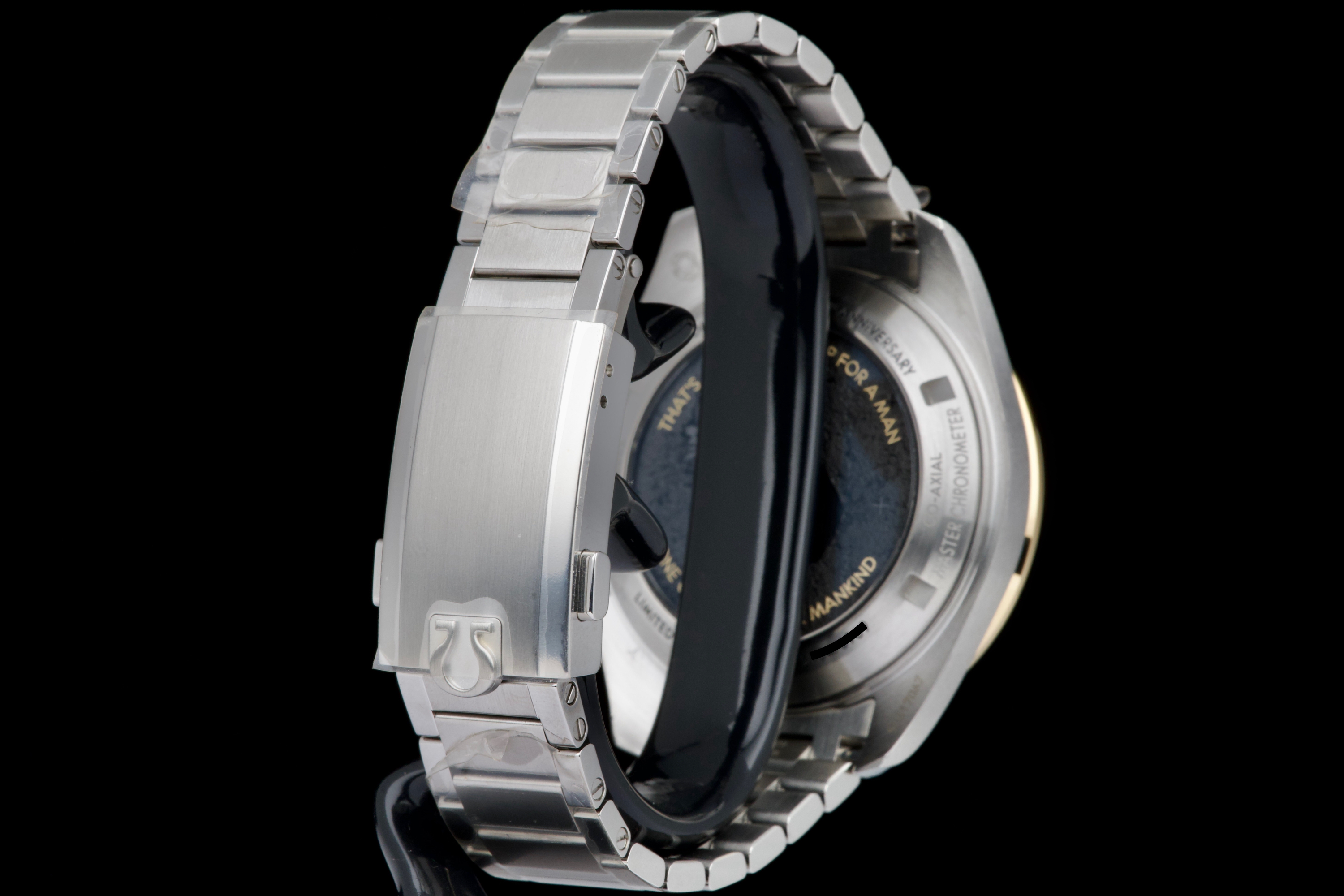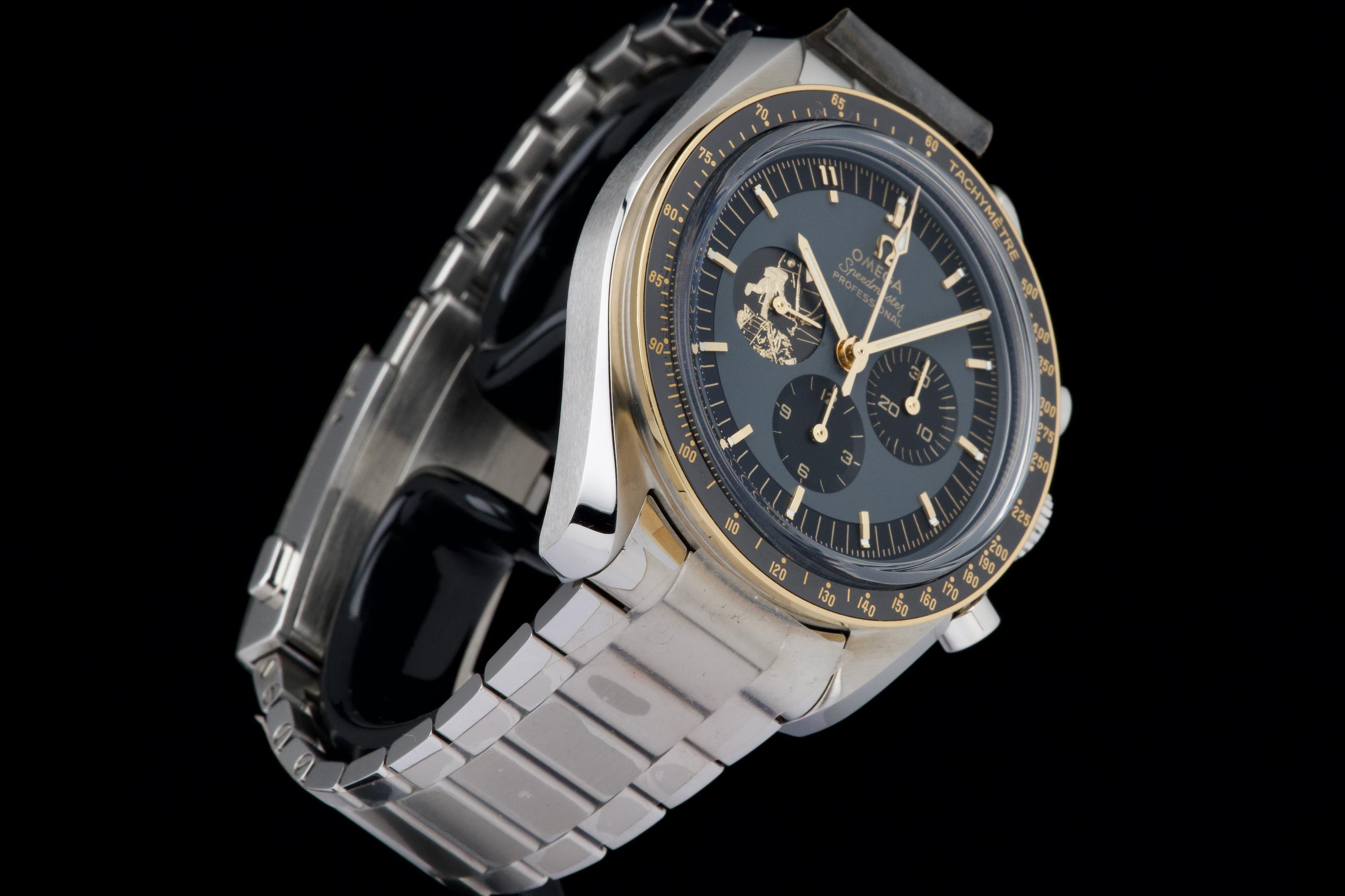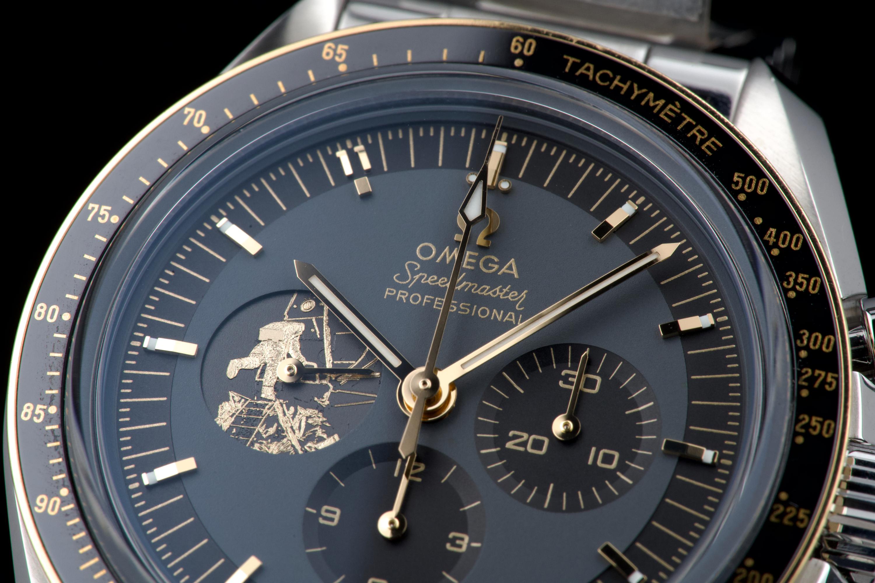 The present Omega Speedmaster Apollo 11 50th Anniversary, released in 2019 as a limited edition, is a highly collectible modern tribute to one of the most significant moments in space and watchmaking history. Celebrating the 50th anniversary of the Apollo 11 mission, this reference combines historical importance with Omega’s latest technical advancements.The watch is powered by the manually wound calibre 3861, Omega’s Master Chronometer-certified evolution of the legendary Moonwatch movement, offering enhanced precision, magnetic resistance, and reliability while remaining faithful to the spirit of the original Speedmaster Professional. Preserved in excellent overall condition, the watch has been worn very little. Notably, protective stickers remain present on the bracelet, underscoring its careful ownership and near-new presentation. The case, dial, and bracelet all display a crisp and clean appearance, consistent with minimal use. Combining commemorative significance, a modern high-performance movement, and outstanding condition, this Speedmaster Apollo 11 Anniversary edition represents a compelling opportunity to acquire a landmark contemporary Omega that bridges heritage and innovation.