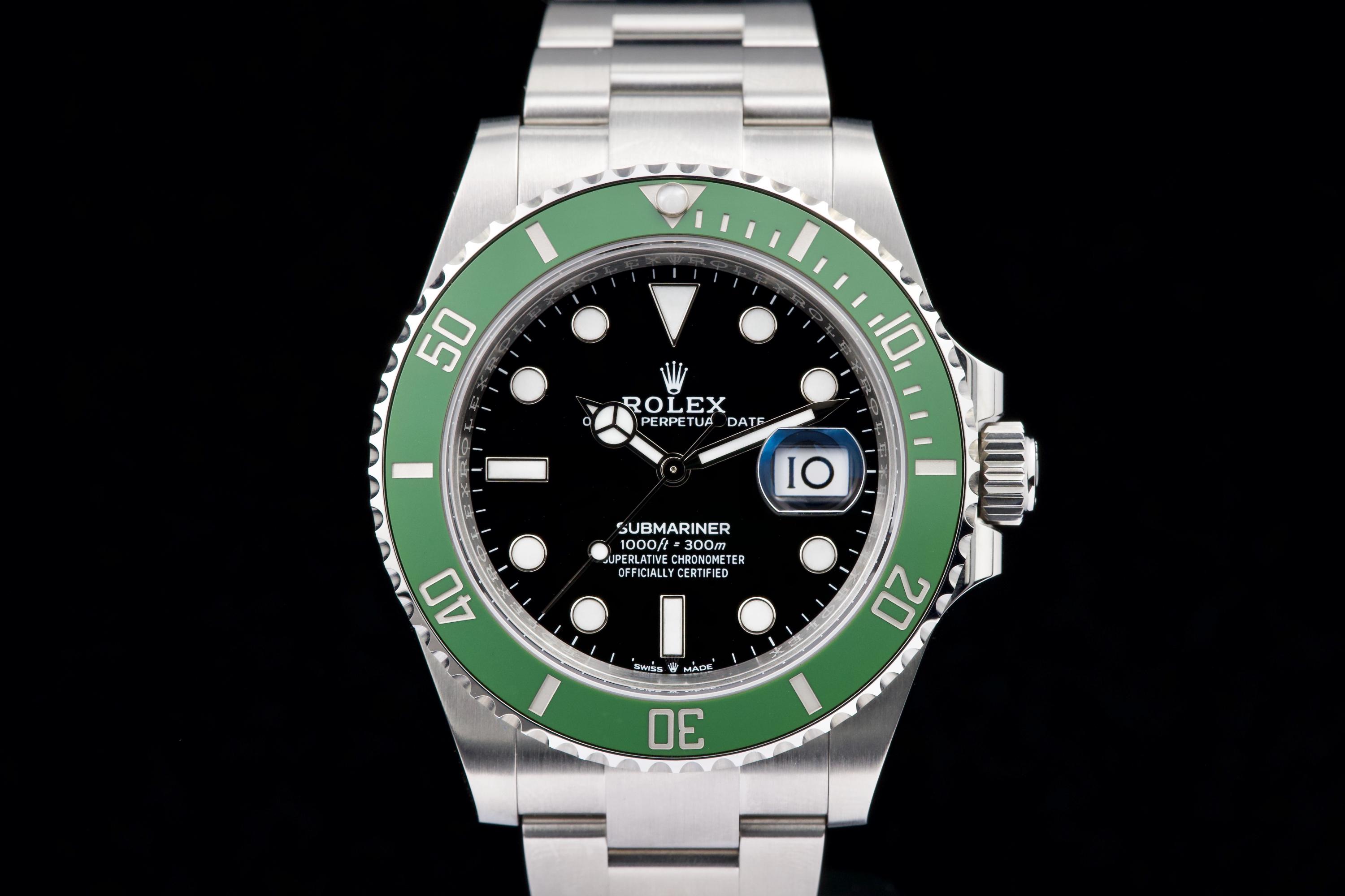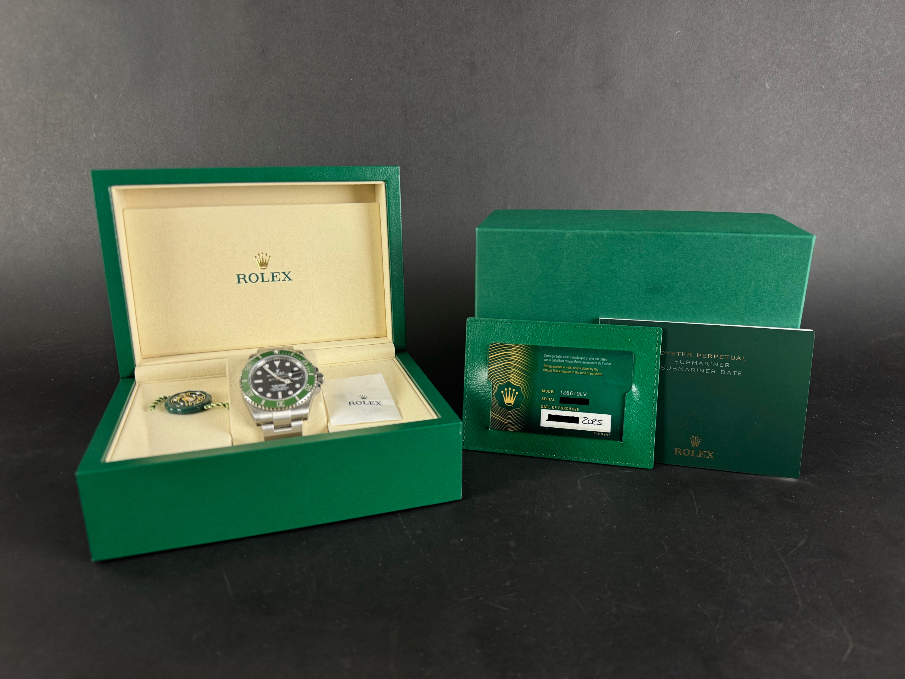 An exceptional and nearly unworn example of the Submariner Date “Starbucks” — featuring the black dial and green Cerachrom bezel. This watch was worn only twice and remains unpolished, in close-to-new condition, showing only the slightest hairline marks on the clasp. The 41 mm stainless steel case houses the automatic Rolex caliber 3235 with 70-hour power reserve and Chronergy escapement, ensuring top precision and durability. Complete with its original new-generation box, warranty card dated 2025, booklets, and accessories. A perfect opportunity to acquire an almost new example of the sought-after Submariner 126610LV, combining modern proportions, everyday wearability, and Rolex’s latest-generation movement.
