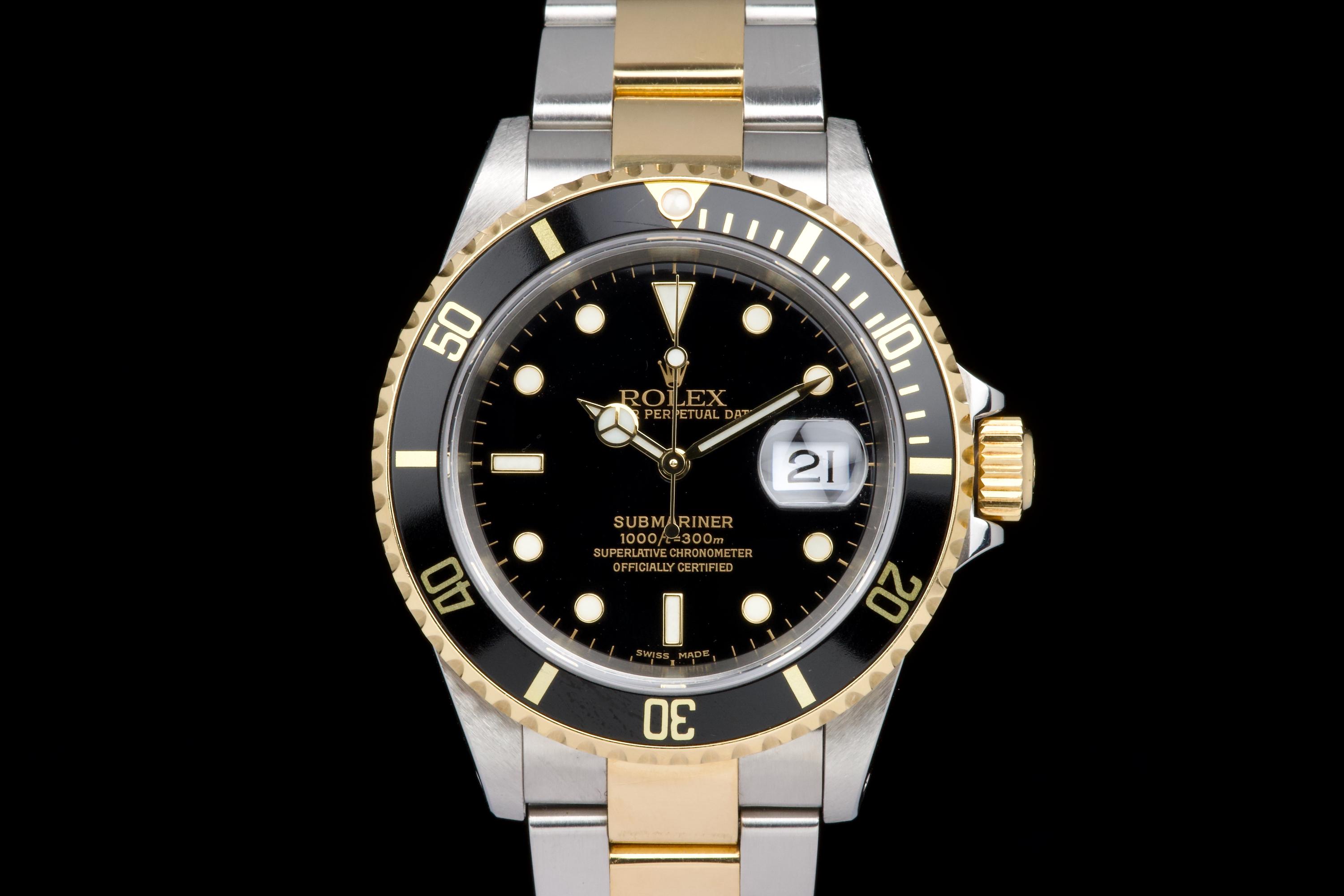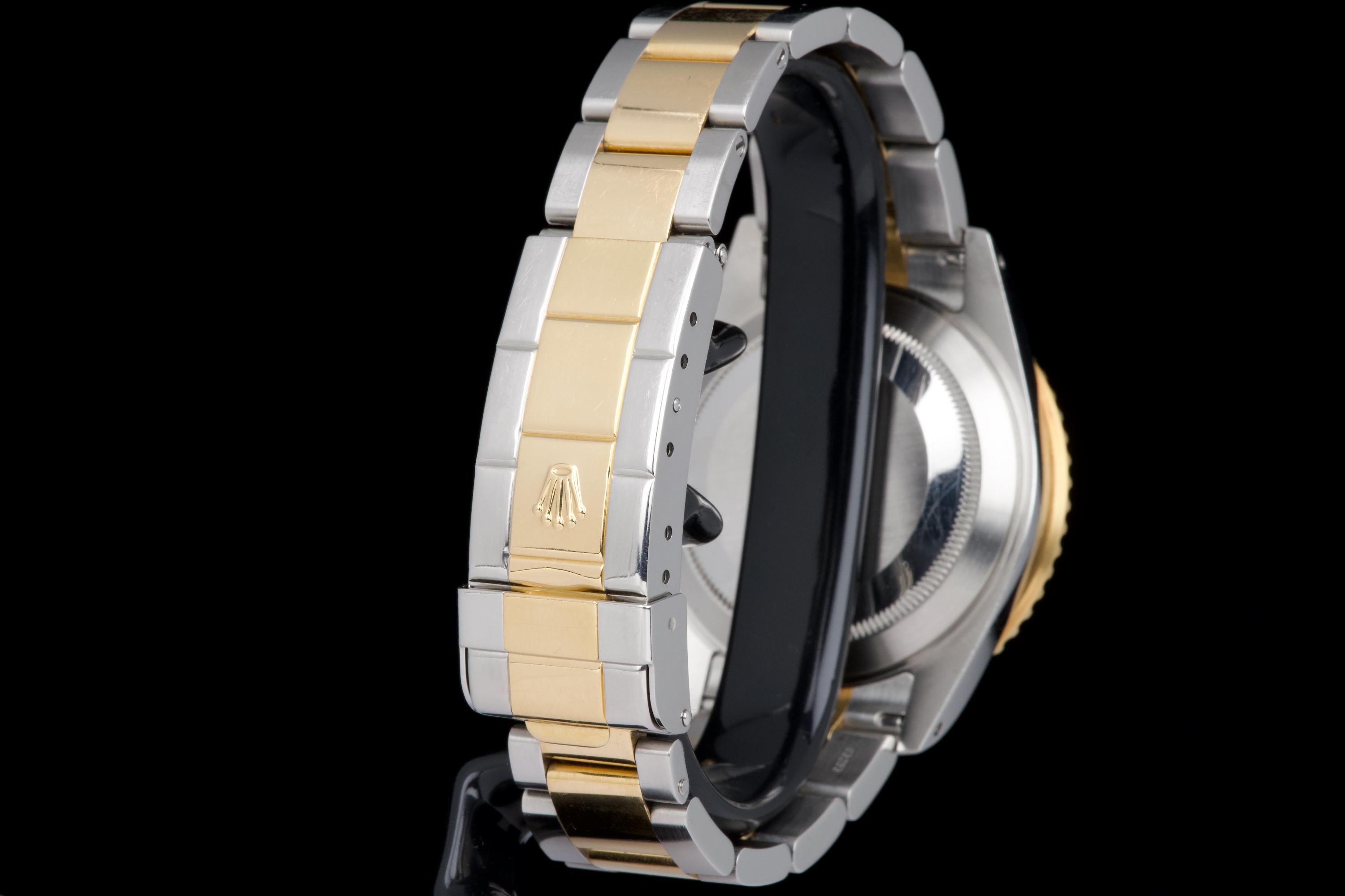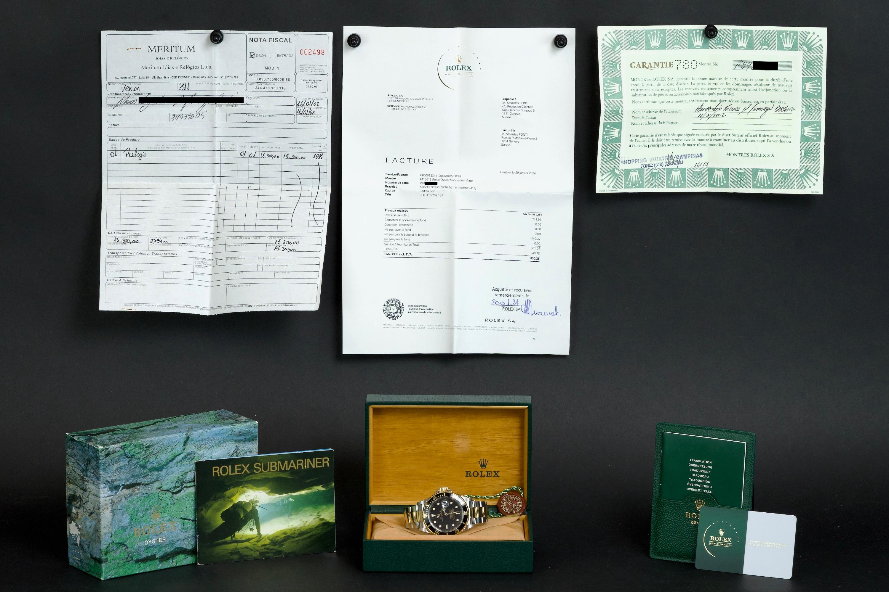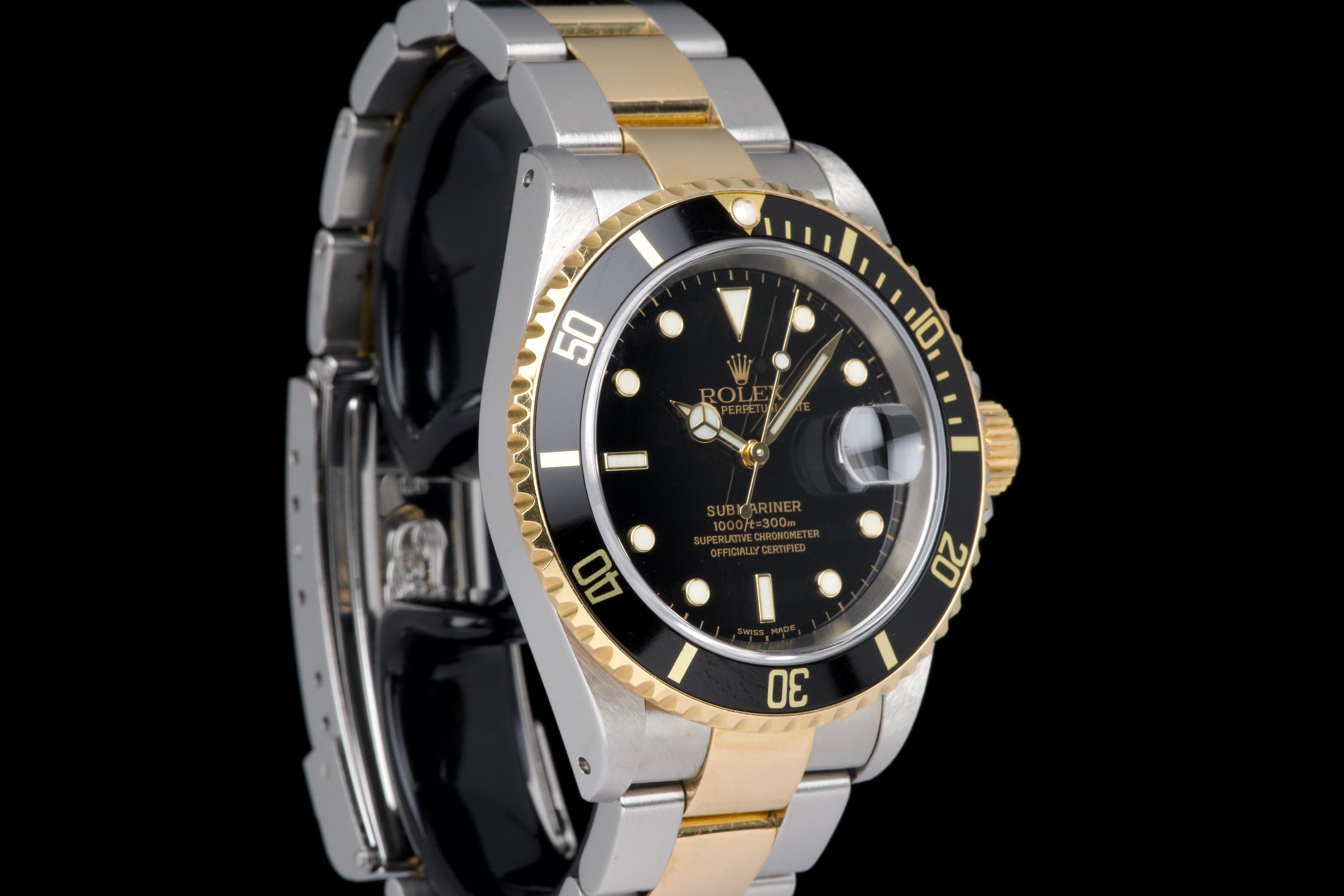 A superb example of the two-tone Submariner Date featuring an excellent and unpolished case showing only light wear from use. The original black luminova dial and matching hands are in perfect condition, complemented by the original black bezel insert which remains exceptionally well preserved. The watch is fitted with its original 93253 Oyster bracelet with solid endlinks, showing extremely light stretch from use. Claspcode DE7. The set includes everything shown in the pictures, including the original purchase invoice. Freshly serviced by Rolex in 2024 (service invoice and card included) and in perfect working condition. A particularly attractive example of the classic 16613, combining originality, full documentation, and recent Rolex service — ready to wear and enjoy.