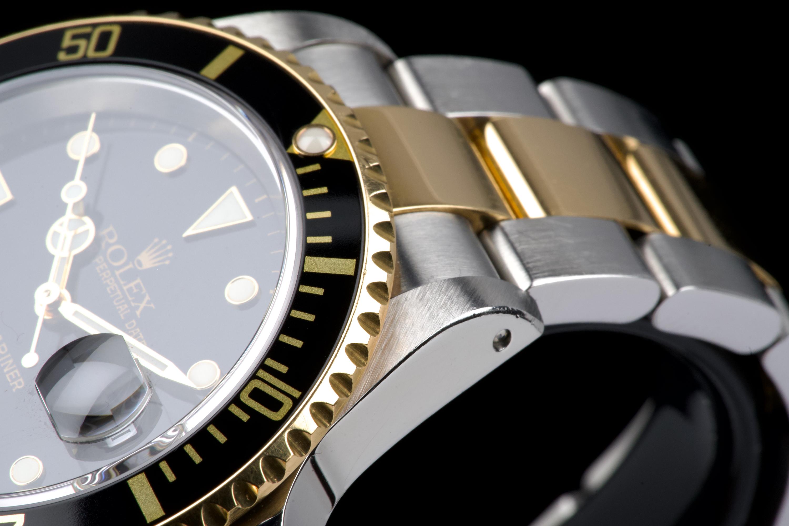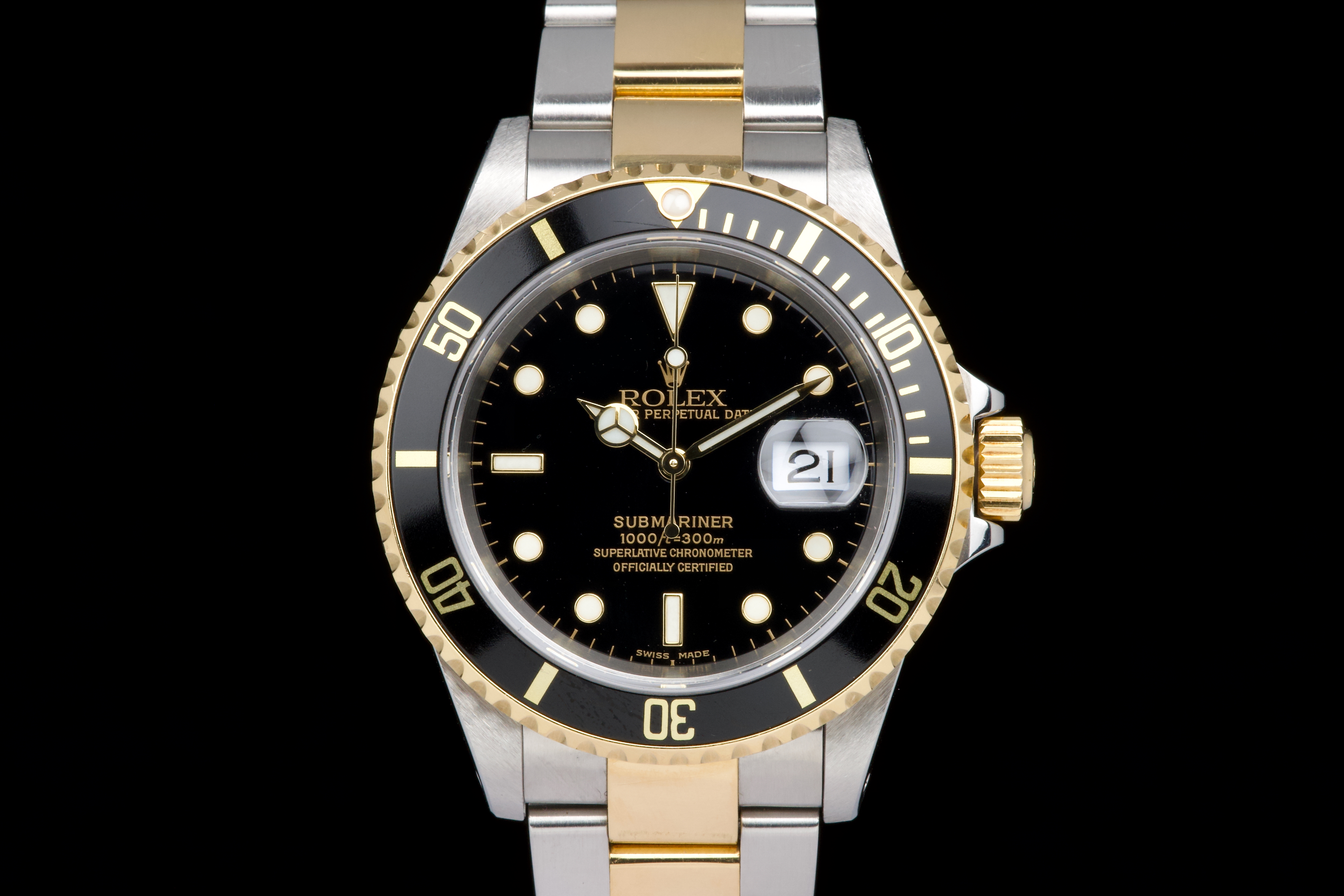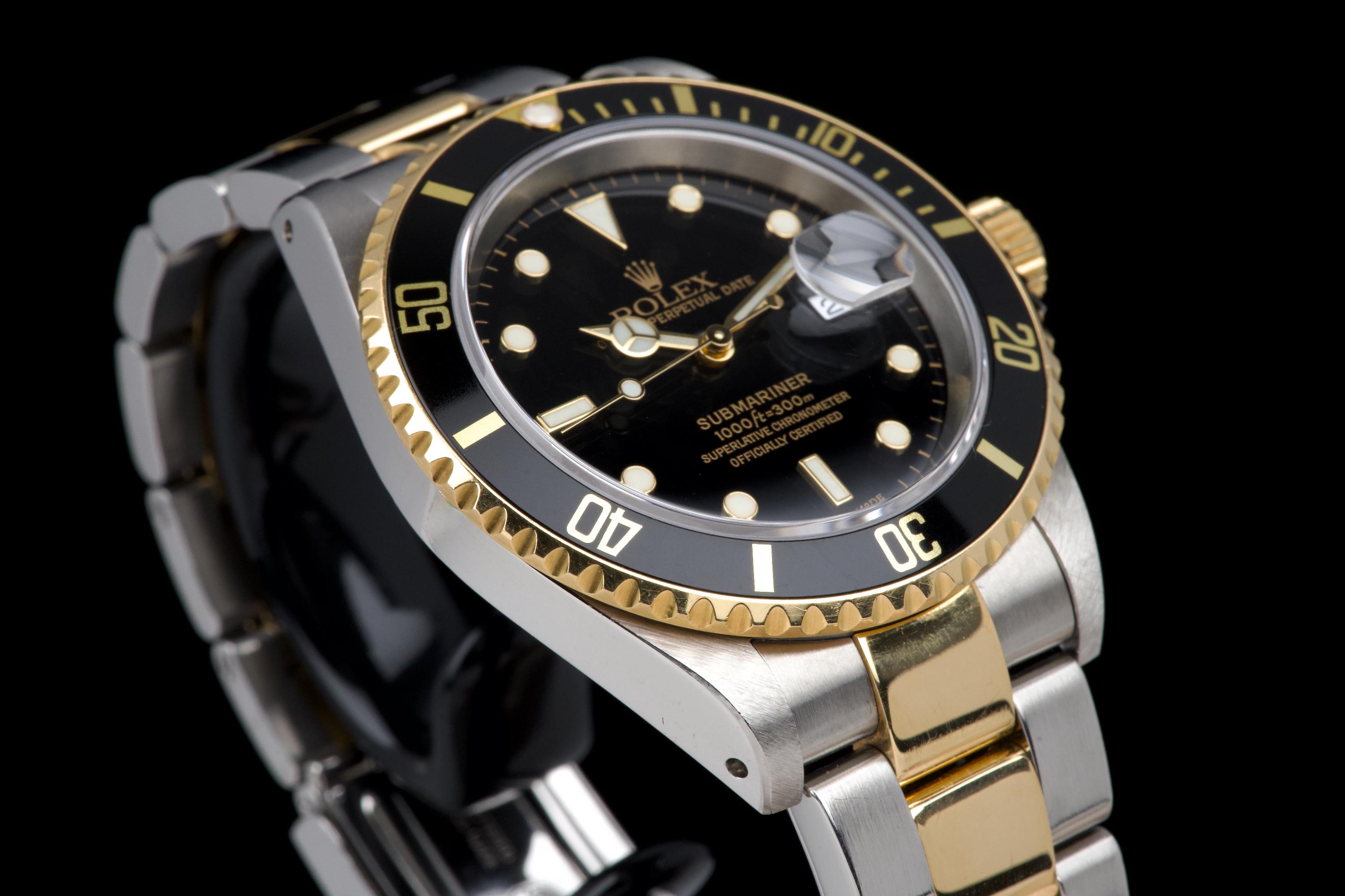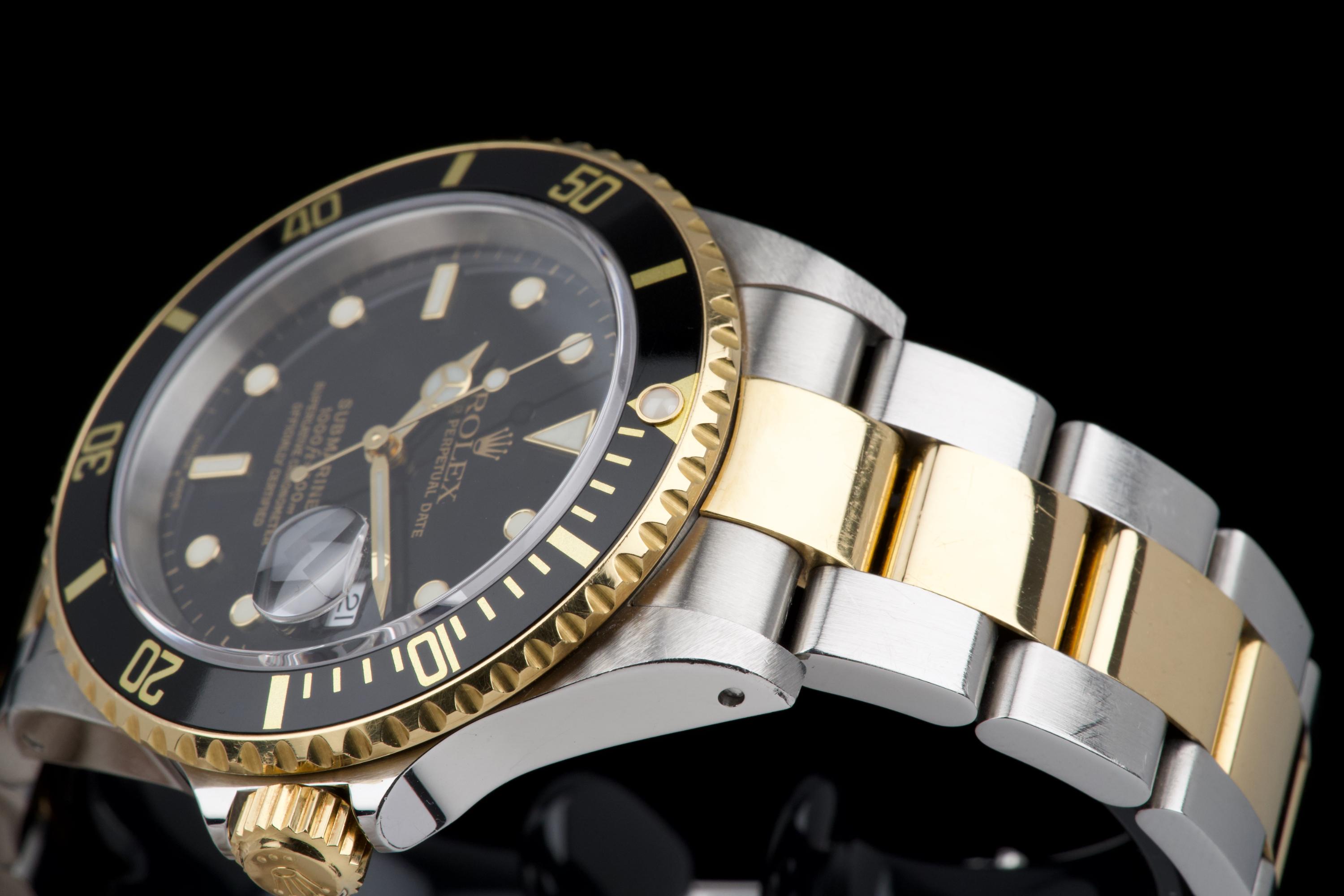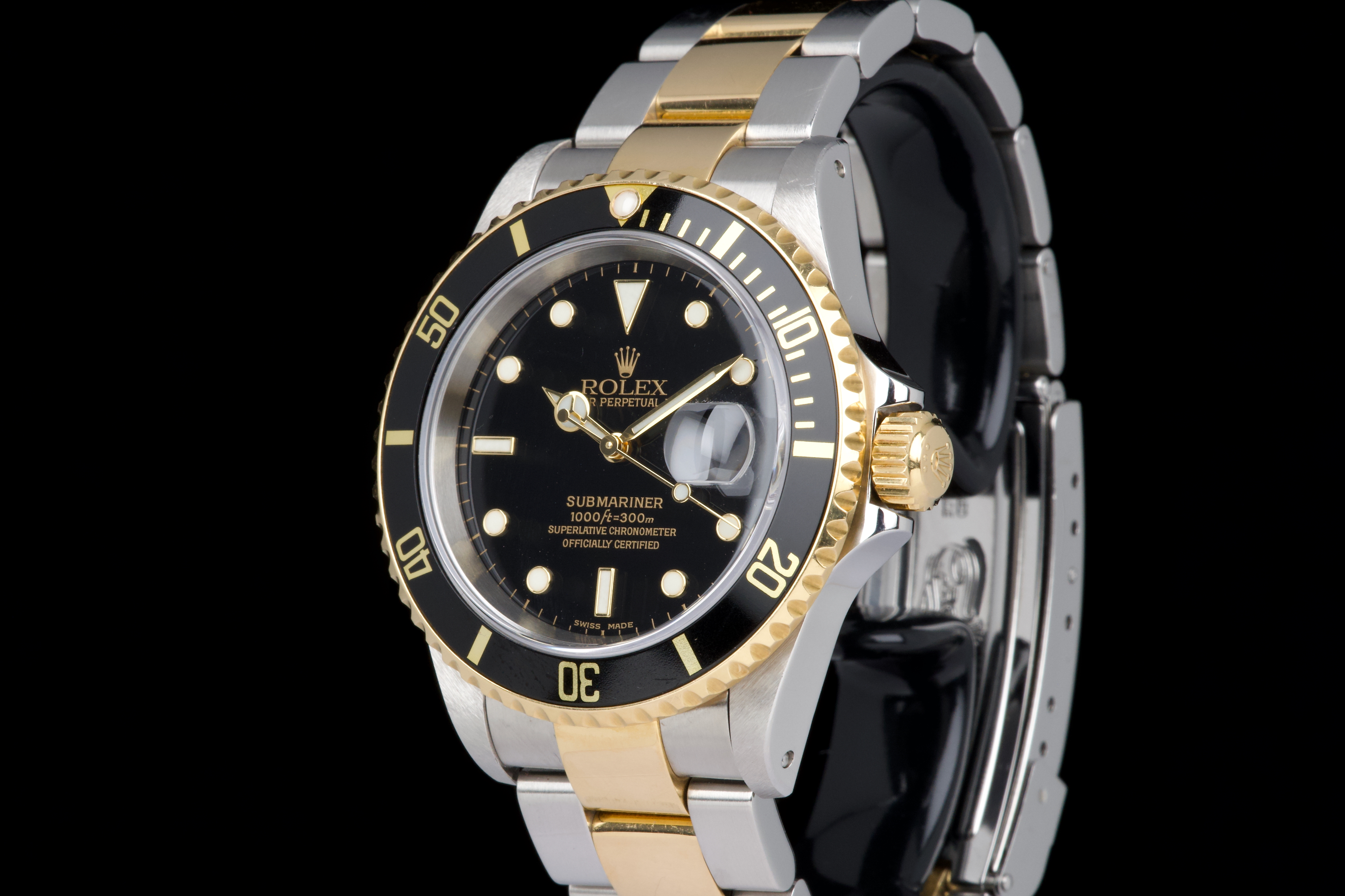 A superb example of the two-tone Submariner Date featuring an excellent and unpolished case showing only light wear from use. The original black luminova dial and matching hands are in perfect condition, complemented by the original black bezel insert which remains exceptionally well preserved. The watch is fitted with its original 93253 Oyster bracelet with solid endlinks, showing extremely light stretch from use. Claspcode DE7. The set includes everything shown in the pictures, including the original purchase invoice. Freshly serviced by Rolex in 2024 (service invoice and card included) and in perfect working condition. A particularly attractive example of the classic 16613, combining originality, full documentation, and recent Rolex service — ready to wear and enjoy.