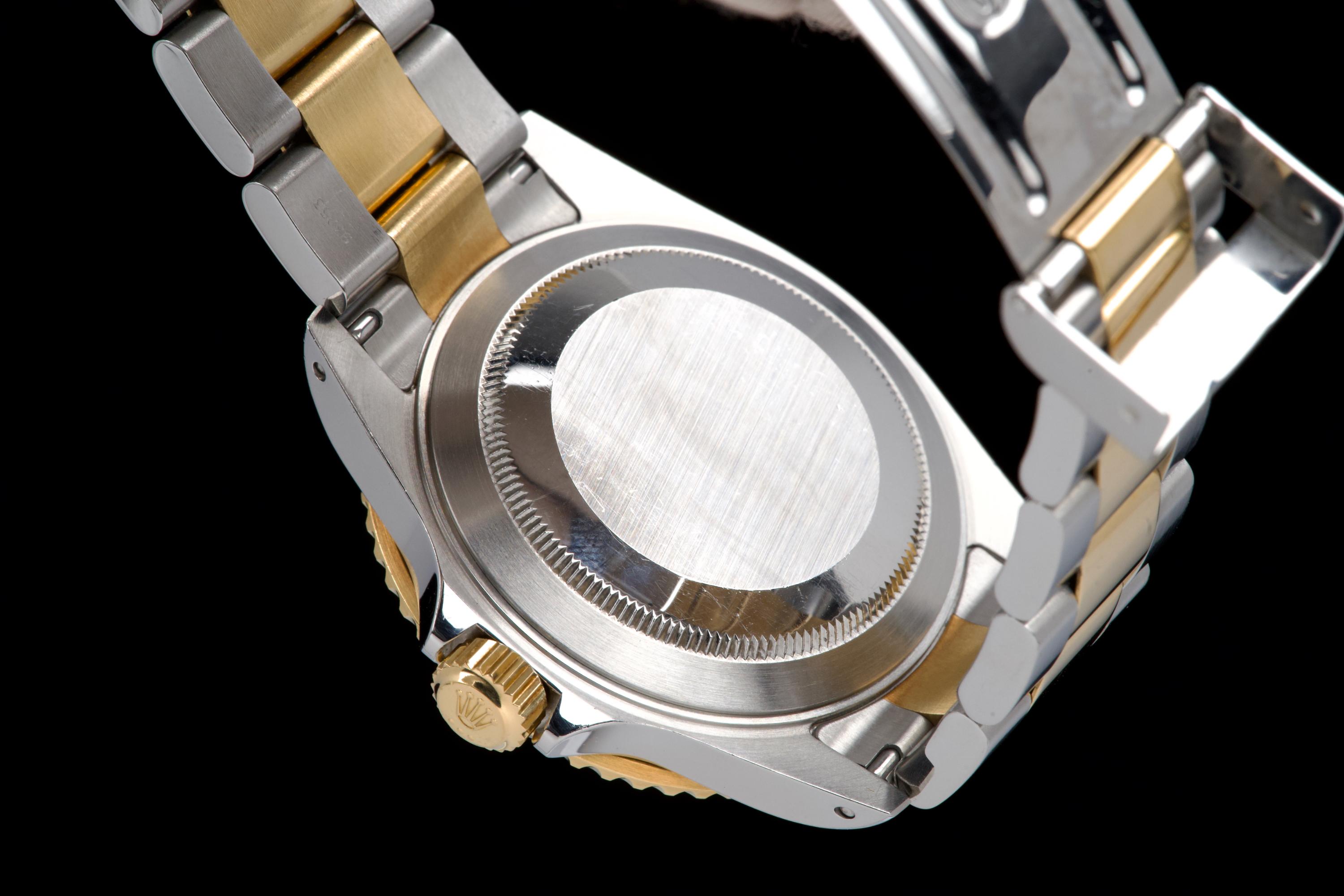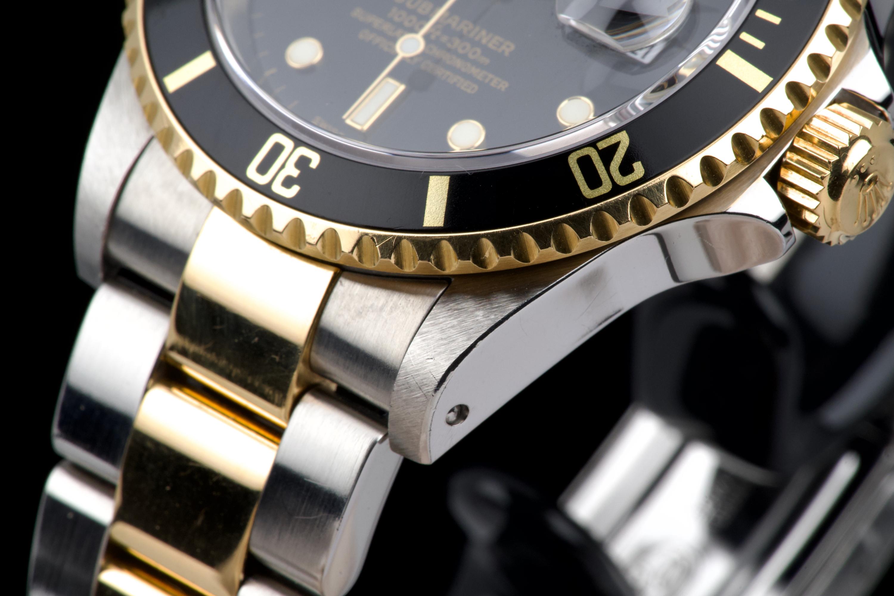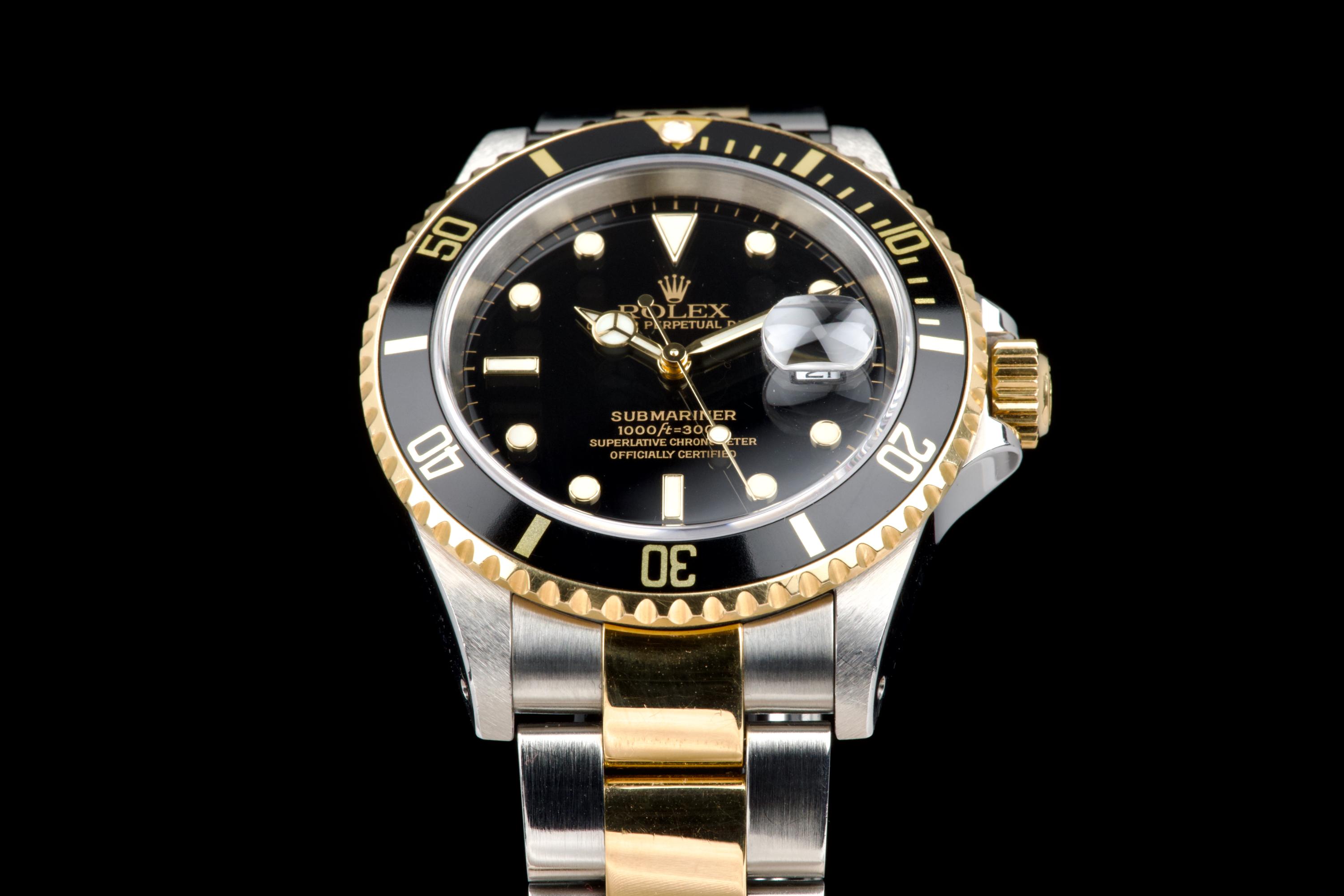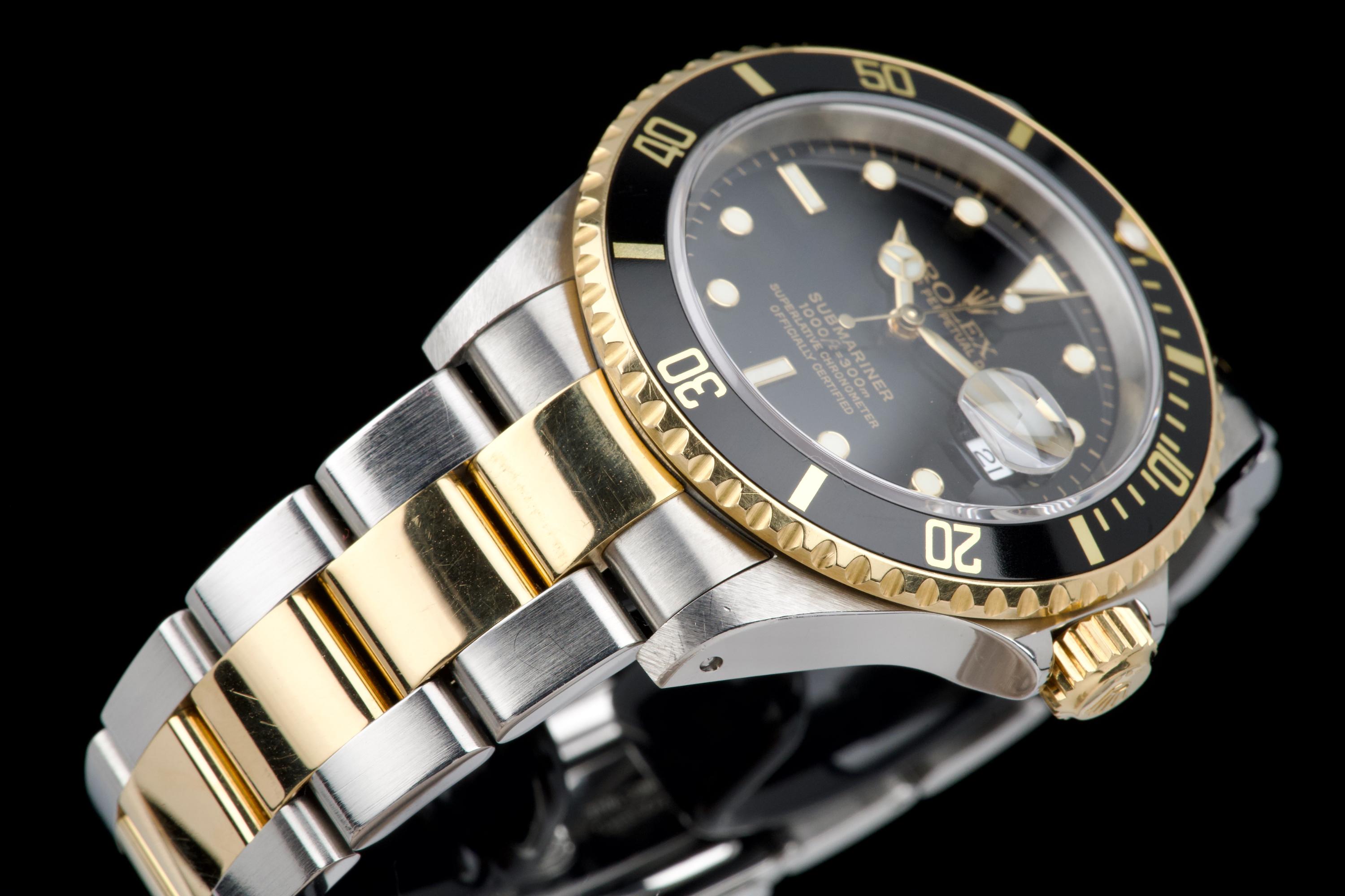 A superb example of the two-tone Submariner Date featuring an excellent and unpolished case showing only light wear from use. The original black luminova dial and matching hands are in perfect condition, complemented by the original black bezel insert which remains exceptionally well preserved. The watch is fitted with its original 93253 Oyster bracelet with solid endlinks, showing extremely light stretch from use. Claspcode DE7. The set includes everything shown in the pictures, including the original purchase invoice. Freshly serviced by Rolex in 2024 (service invoice and card included) and in perfect working condition. A particularly attractive example of the classic 16613, combining originality, full documentation, and recent Rolex service — ready to wear and enjoy.