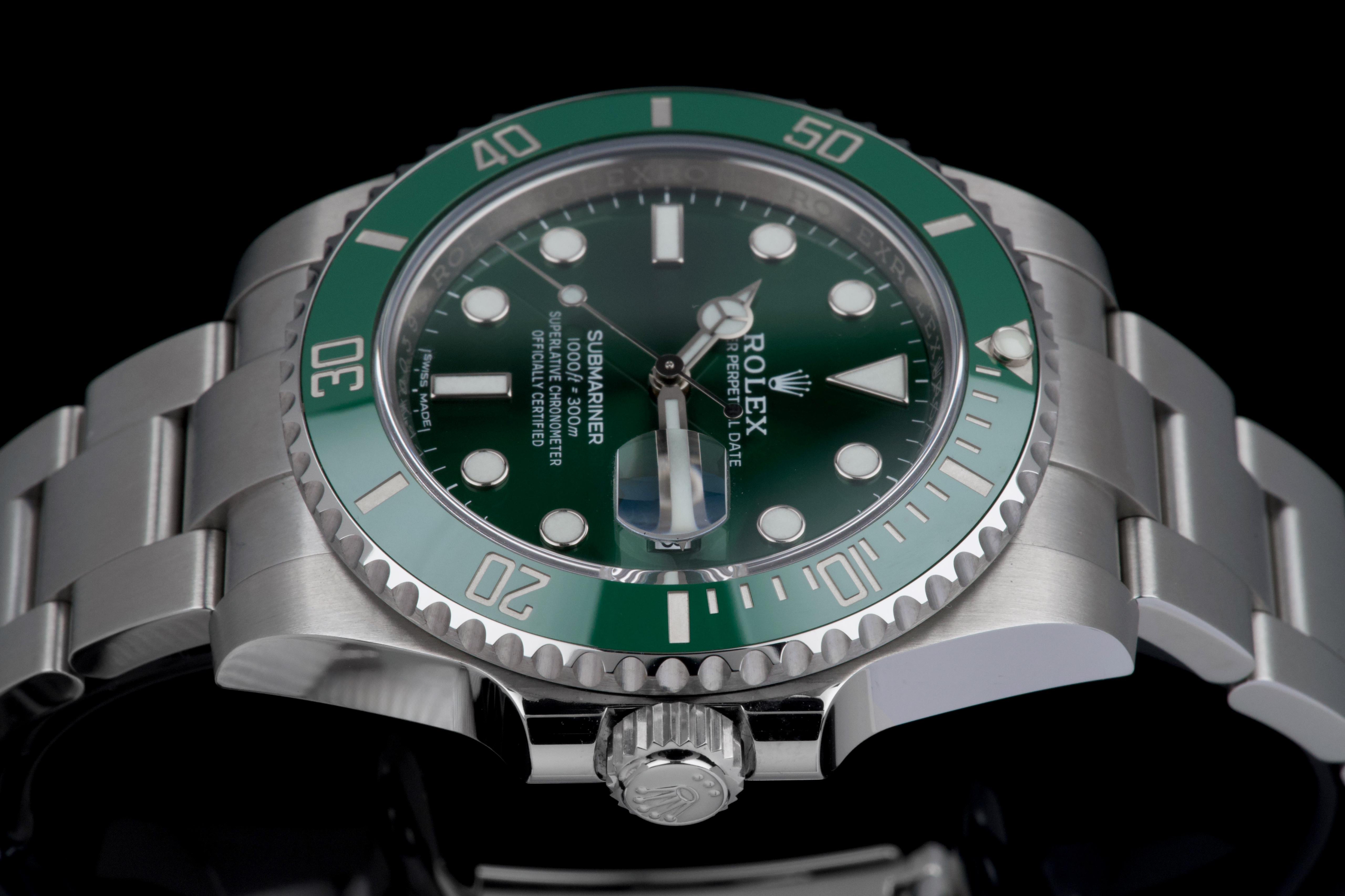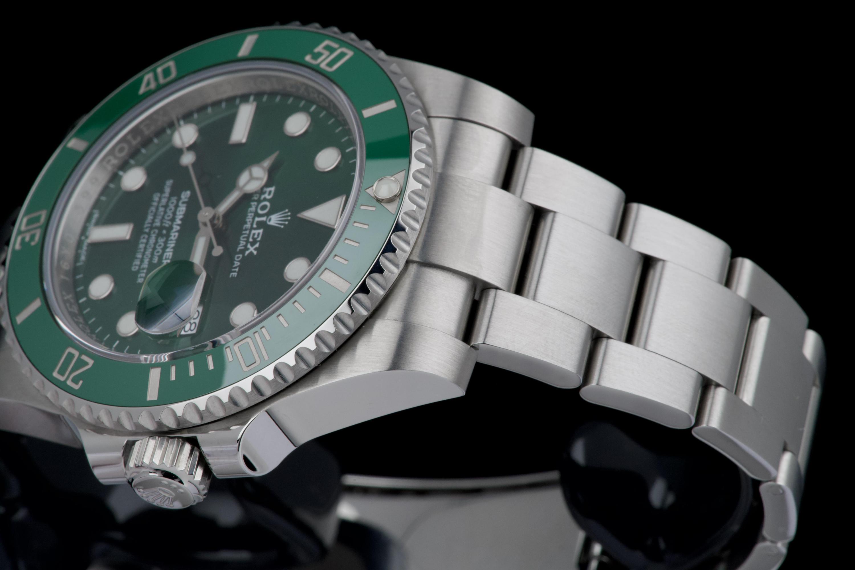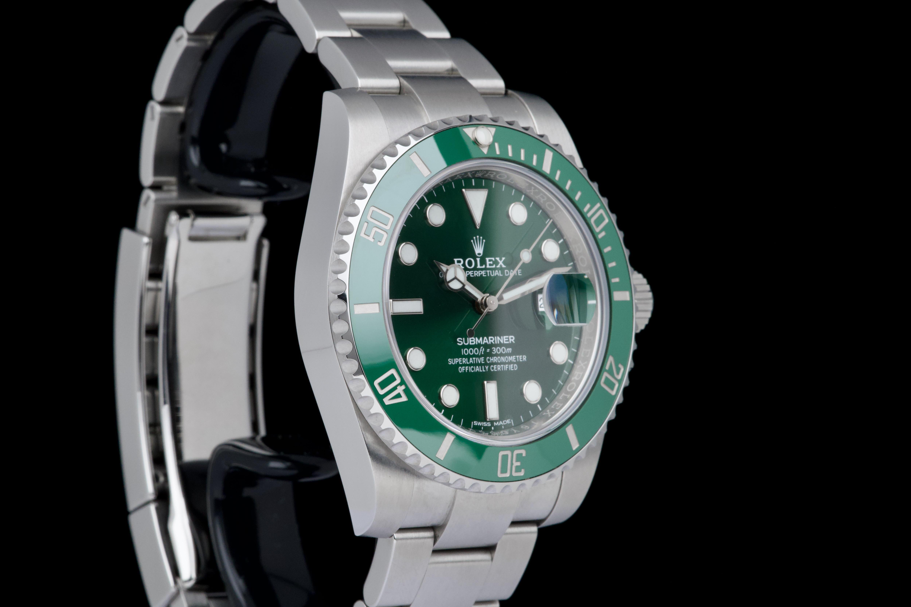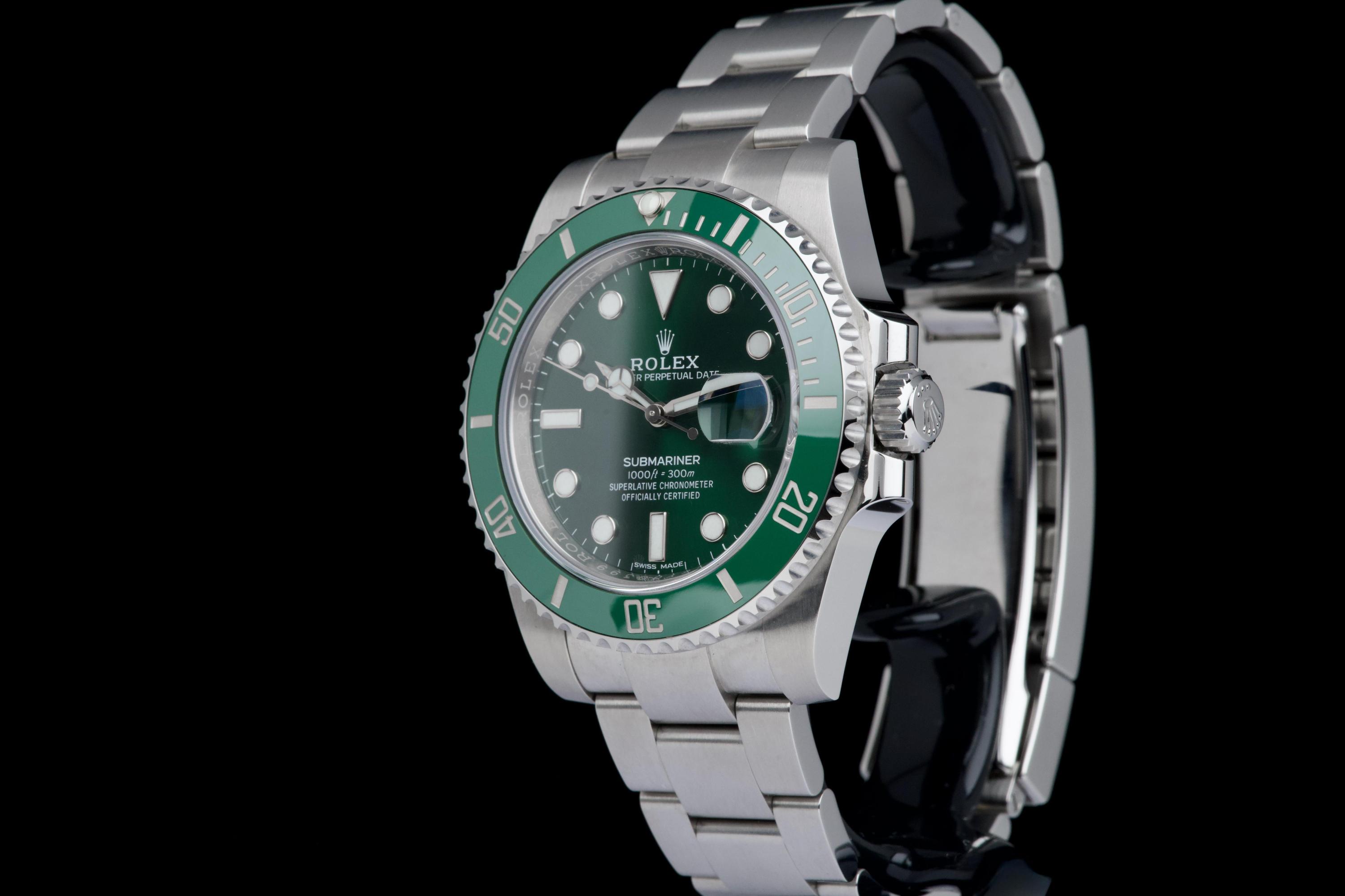 Rolex Submariner Date “Hulk”, reference 116610LV, stainless steel wristwatch with green dial and bezel, full set, circa 2018. An iconic modern sports watch, the present Submariner 116610LV—affectionately known as the “Hulk” among collectors—combines Rolex’s legendary robustness with a bold and highly recognizable aesthetic. Produced in 2018, this example features the signature green sunburst dial paired with a matching green Cerachrom bezel, creating a striking and sought-after configuration. Housed in a 40 mm Oyster case in stainless steel, the watch is equipped with a unidirectional rotating bezel, screw-down crown, and sapphire crystal with Cyclops lens over the date, ensuring both durability and excellent legibility. At its heart beats a reliable Rolex automatic movement, delivering precision and performance in line with the Submariner’s professional diving heritage. According to the consignor, the watch was originally sold new in Geneva in 2018 and has remained in the possession of a single owner since purchase. It has never been polished nor serviced, and is presented in near-new condition, preserving its original lines and sharp edges. Offered as a full set with its original box, warranty card and accessories, this Submariner “Hulk” represents a highly attractive opportunity to acquire a well-preserved example of one of Rolex’s most desirable modern references.