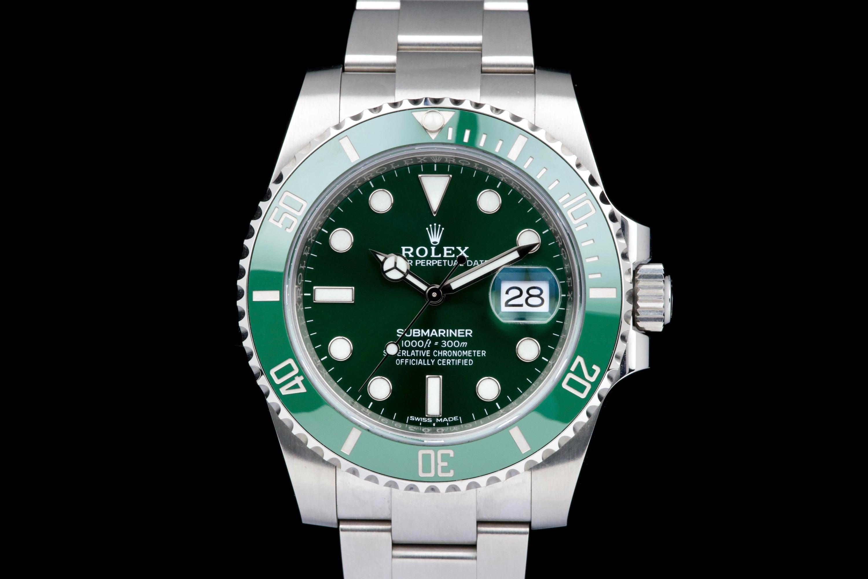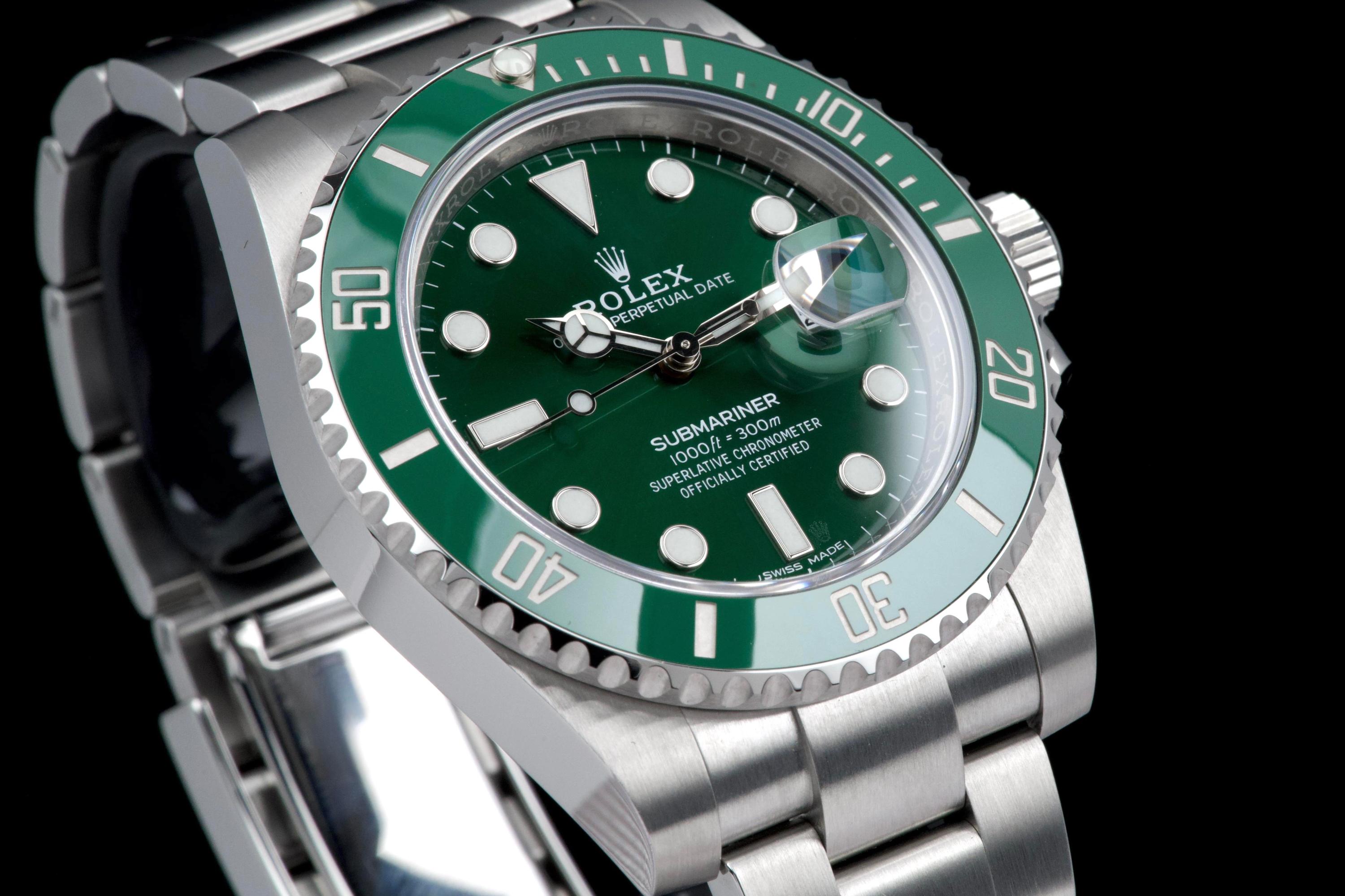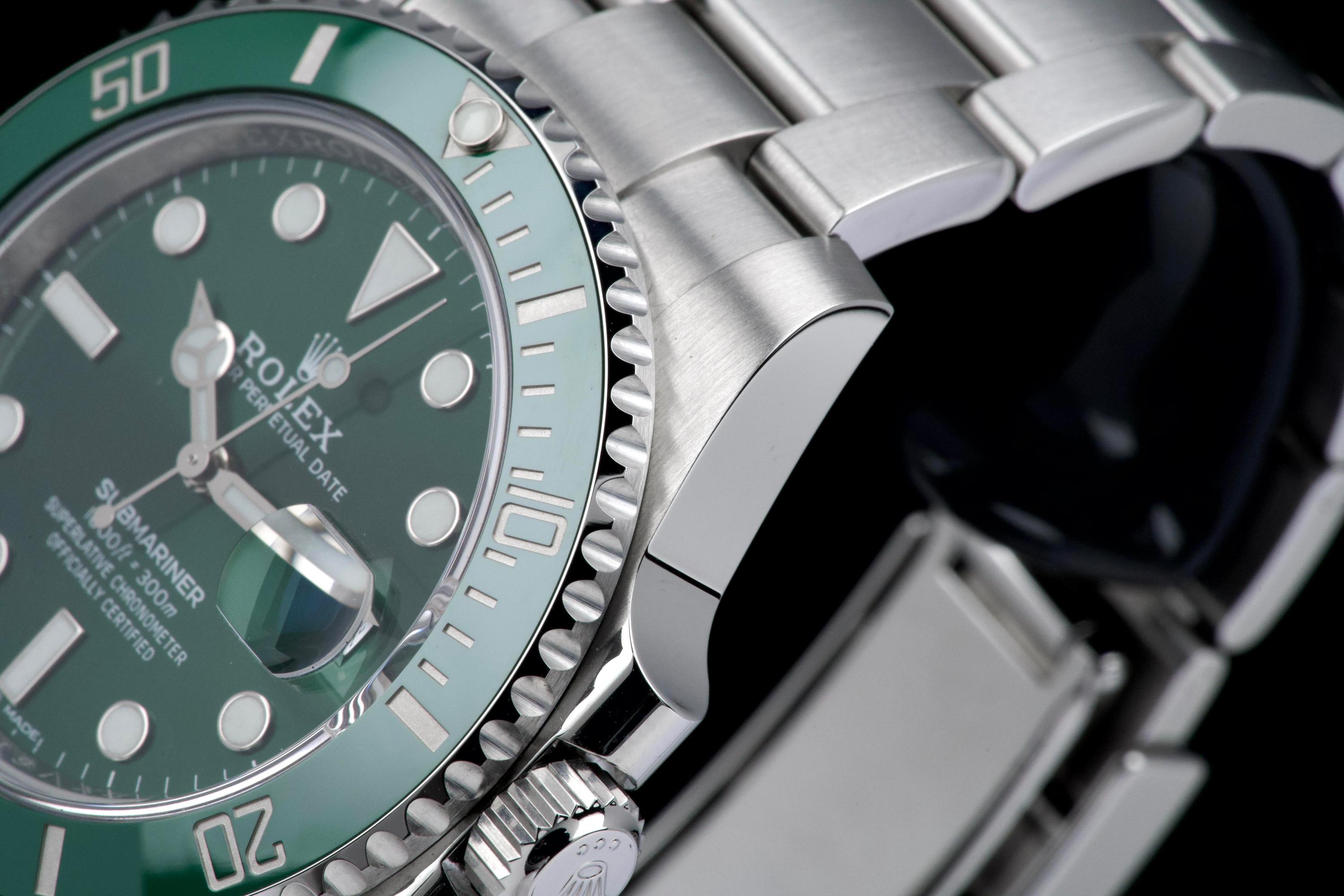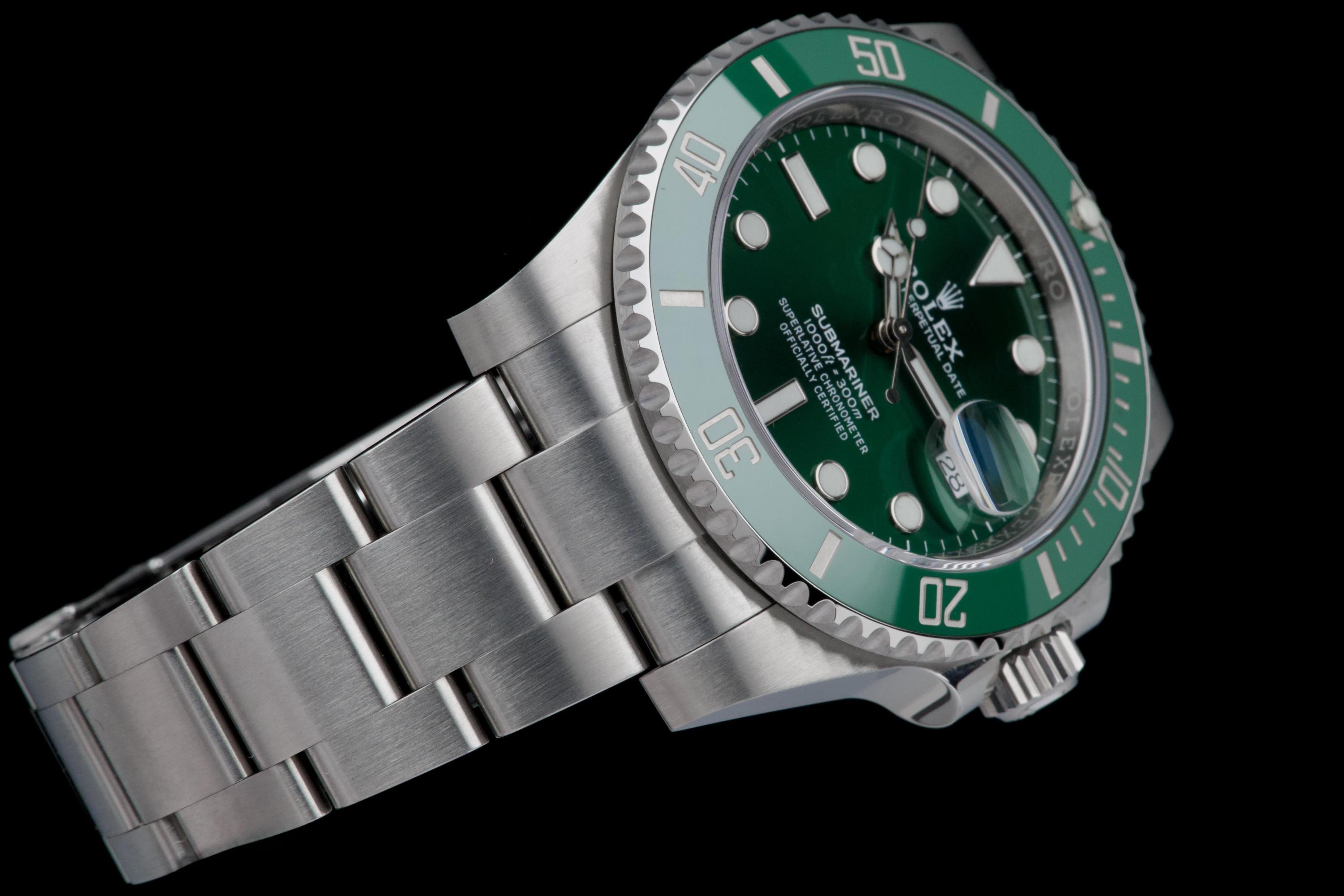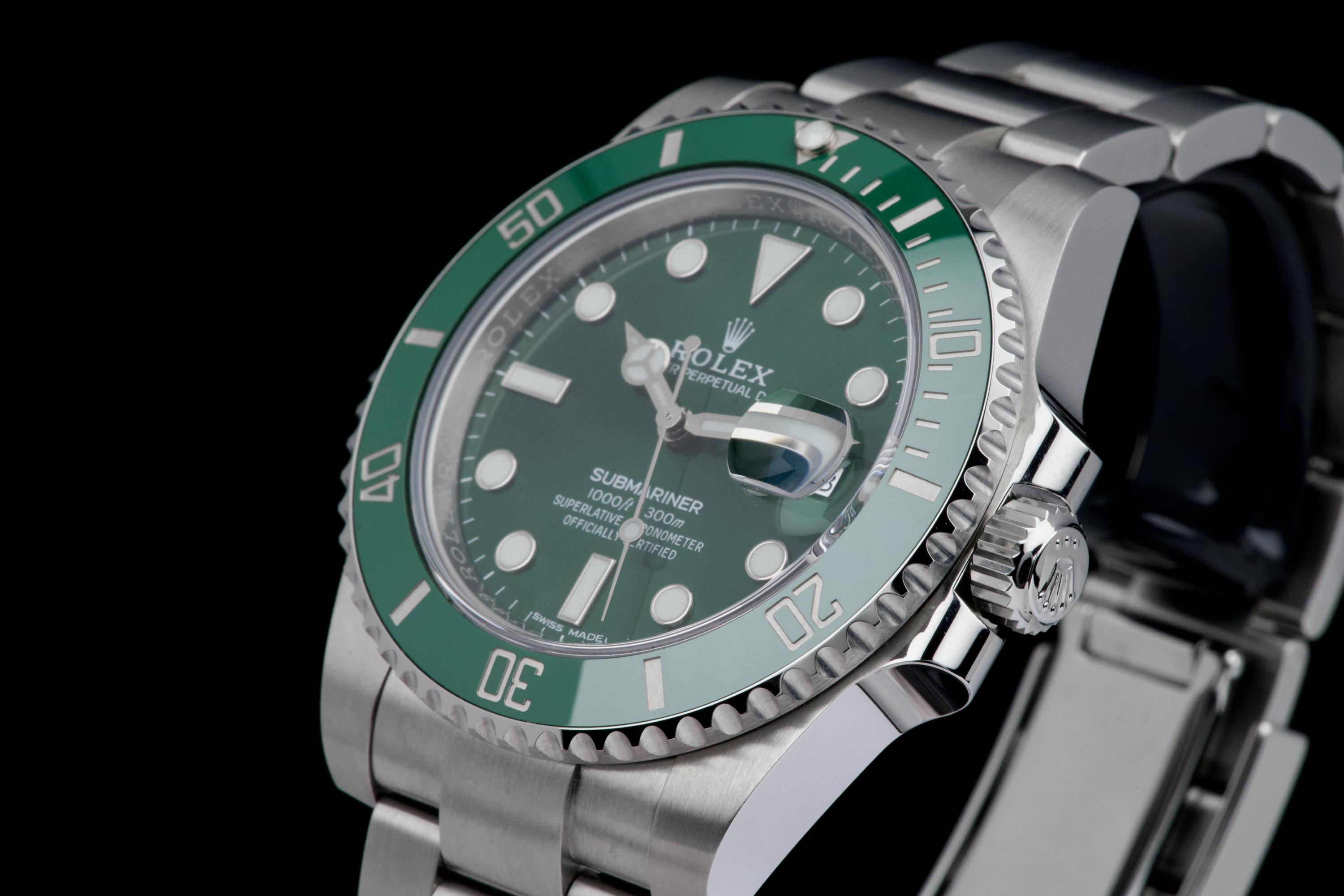 Rolex Submariner Date “Hulk”, reference 116610LV, stainless steel wristwatch with green dial and bezel, full set, circa 2018. An iconic modern sports watch, the present Submariner 116610LV—affectionately known as the “Hulk” among collectors—combines Rolex’s legendary robustness with a bold and highly recognizable aesthetic. Produced in 2018, this example features the signature green sunburst dial paired with a matching green Cerachrom bezel, creating a striking and sought-after configuration. Housed in a 40 mm Oyster case in stainless steel, the watch is equipped with a unidirectional rotating bezel, screw-down crown, and sapphire crystal with Cyclops lens over the date, ensuring both durability and excellent legibility. At its heart beats a reliable Rolex automatic movement, delivering precision and performance in line with the Submariner’s professional diving heritage. According to the consignor, the watch was originally sold new in Geneva in 2018 and has remained in the possession of a single owner since purchase. It has never been polished nor serviced, and is presented in near-new condition, preserving its original lines and sharp edges. Offered as a full set with its original box, warranty card and accessories, this Submariner “Hulk” represents a highly attractive opportunity to acquire a well-preserved example of one of Rolex’s most desirable modern references.