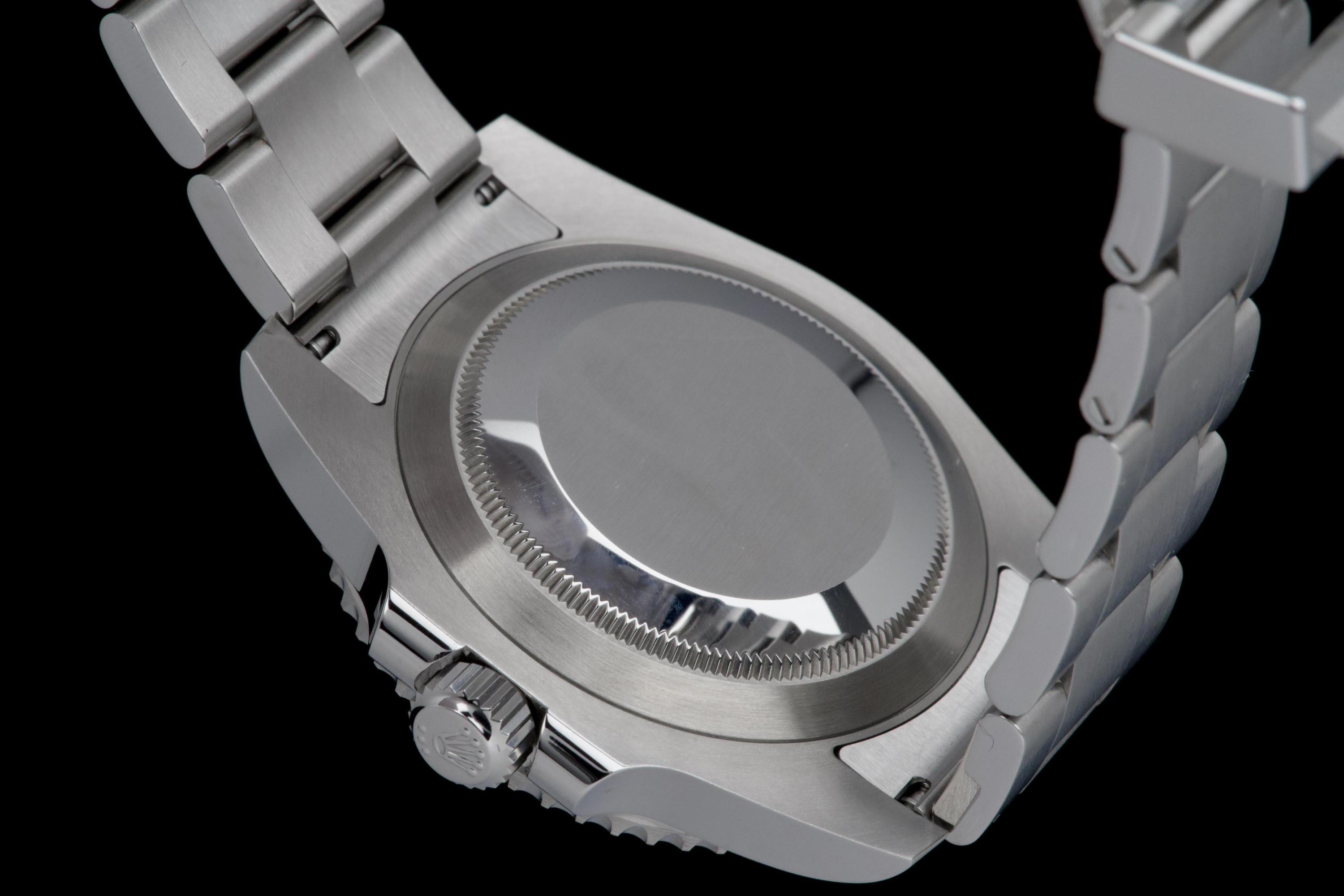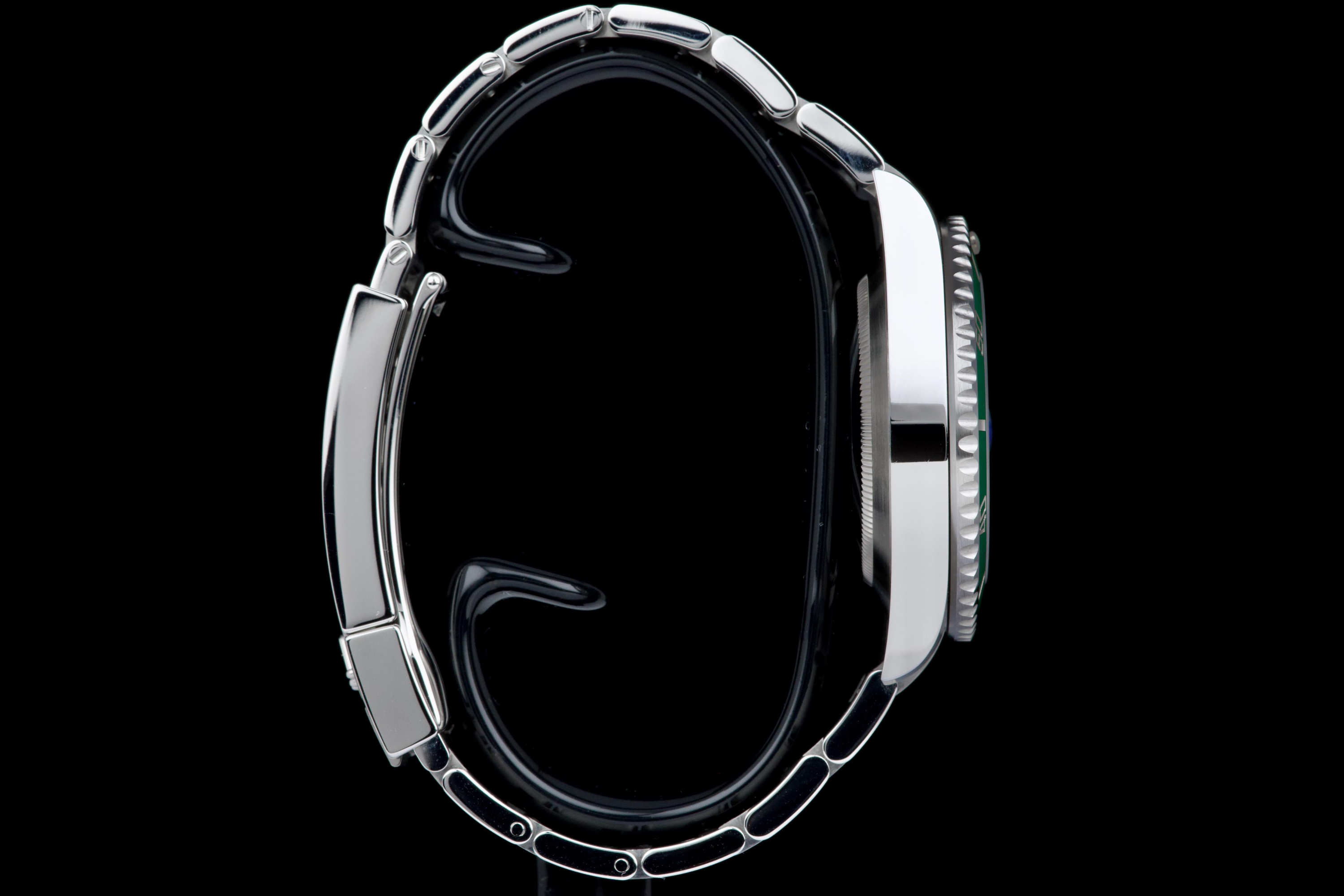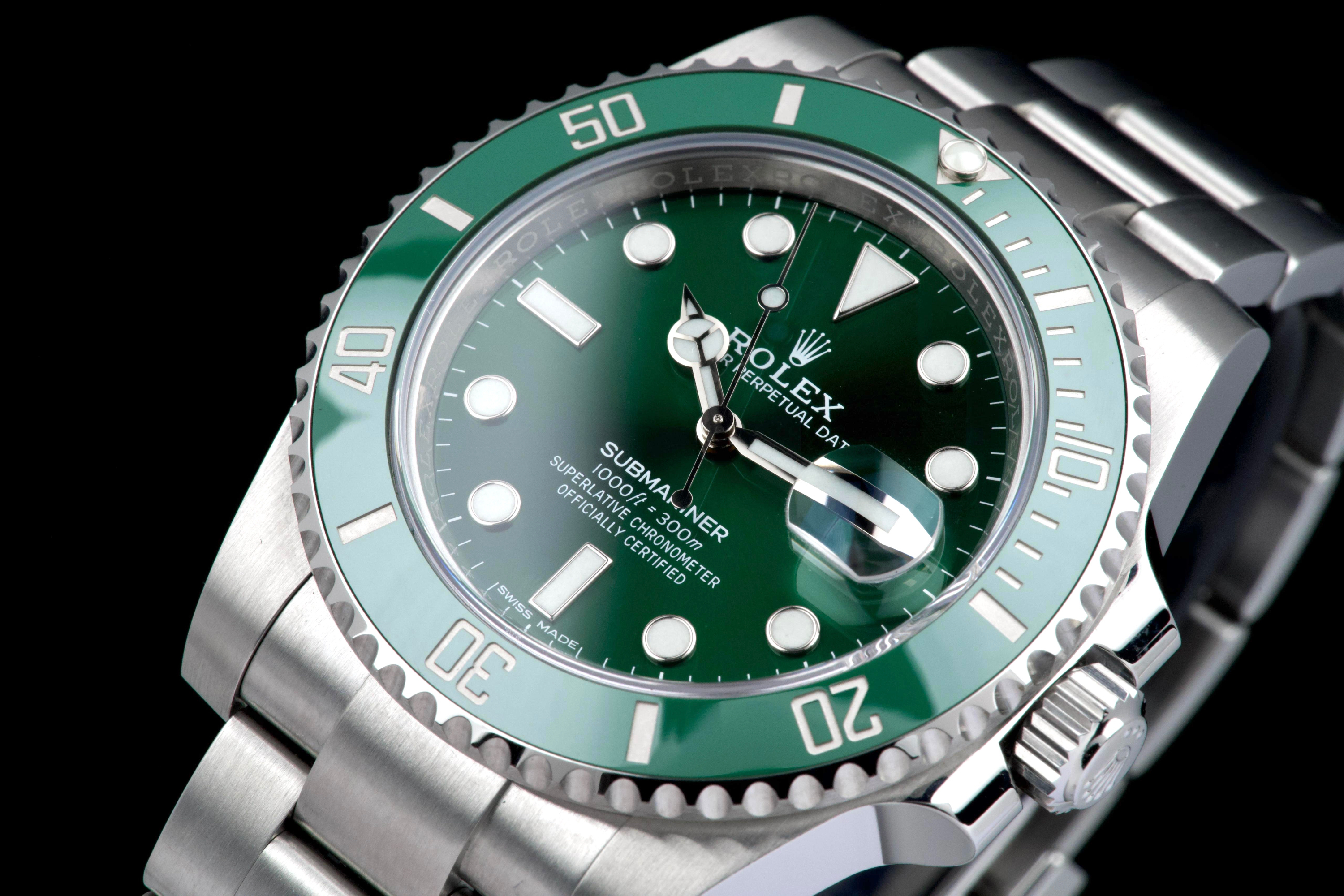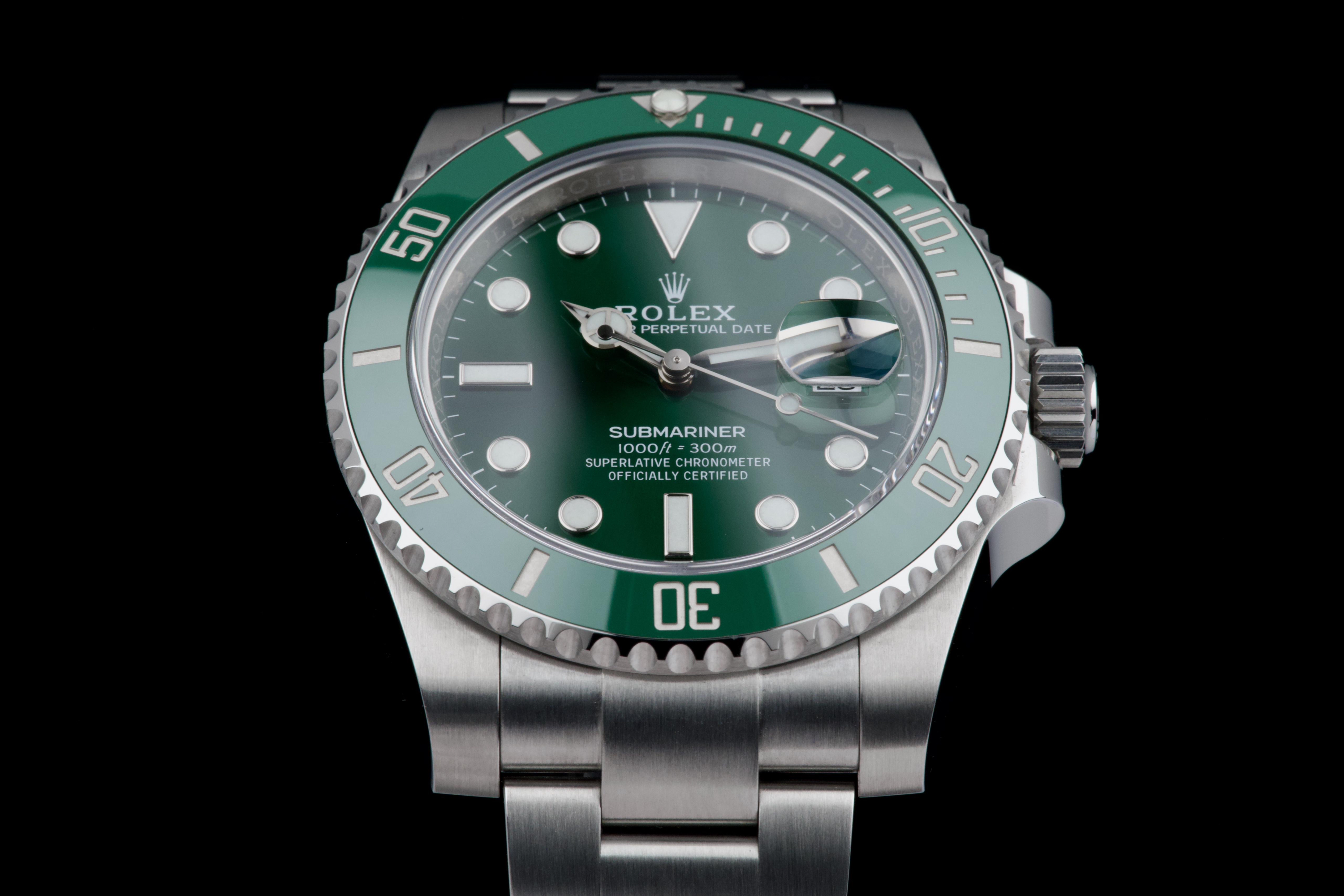 Rolex Submariner Date “Hulk”, reference 116610LV, stainless steel wristwatch with green dial and bezel, full set, circa 2018. An iconic modern sports watch, the present Submariner 116610LV—affectionately known as the “Hulk” among collectors—combines Rolex’s legendary robustness with a bold and highly recognizable aesthetic. Produced in 2018, this example features the signature green sunburst dial paired with a matching green Cerachrom bezel, creating a striking and sought-after configuration. Housed in a 40 mm Oyster case in stainless steel, the watch is equipped with a unidirectional rotating bezel, screw-down crown, and sapphire crystal with Cyclops lens over the date, ensuring both durability and excellent legibility. At its heart beats a reliable Rolex automatic movement, delivering precision and performance in line with the Submariner’s professional diving heritage. According to the consignor, the watch was originally sold new in Geneva in 2018 and has remained in the possession of a single owner since purchase. It has never been polished nor serviced, and is presented in near-new condition, preserving its original lines and sharp edges. Offered as a full set with its original box, warranty card and accessories, this Submariner “Hulk” represents a highly attractive opportunity to acquire a well-preserved example of one of Rolex’s most desirable modern references.