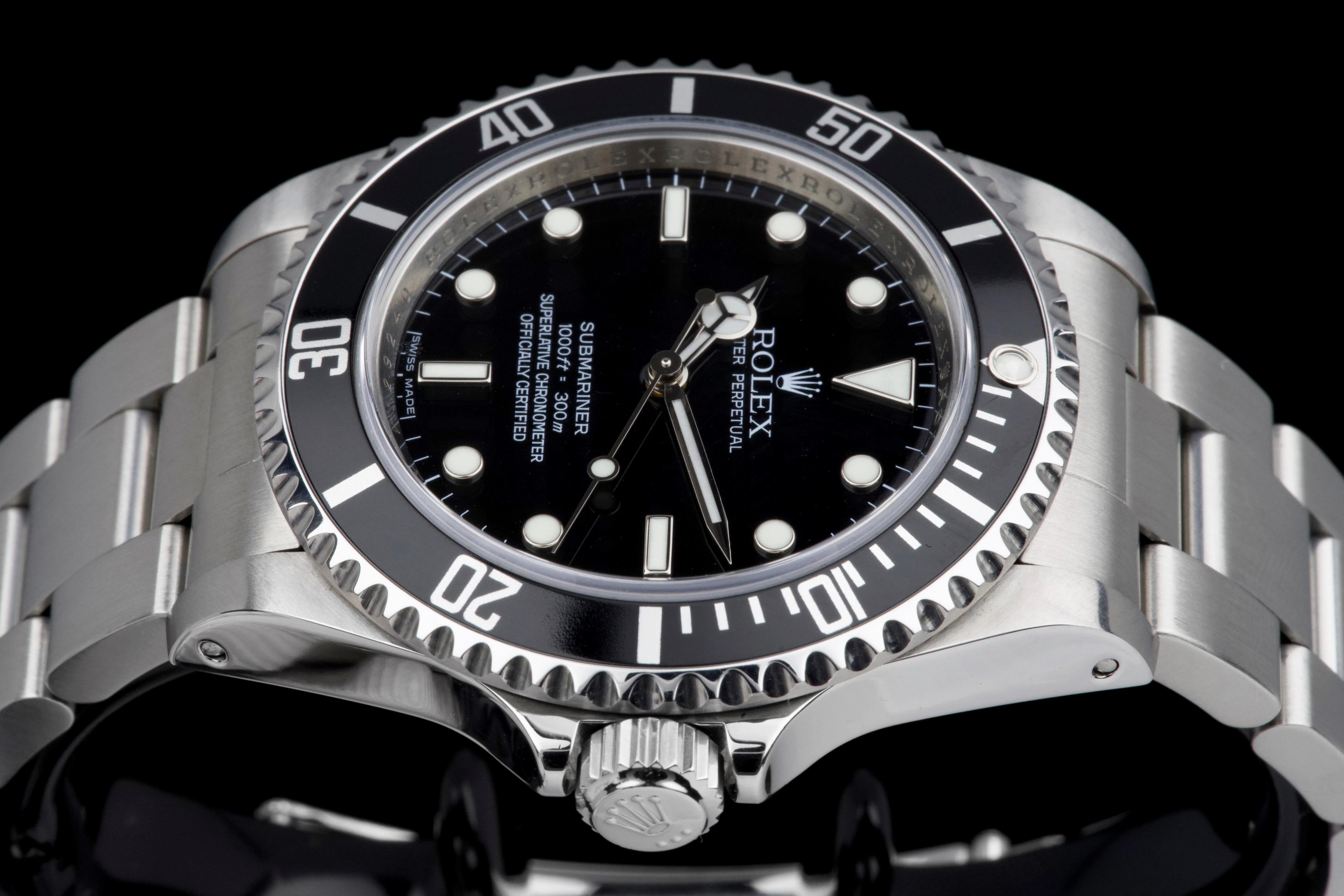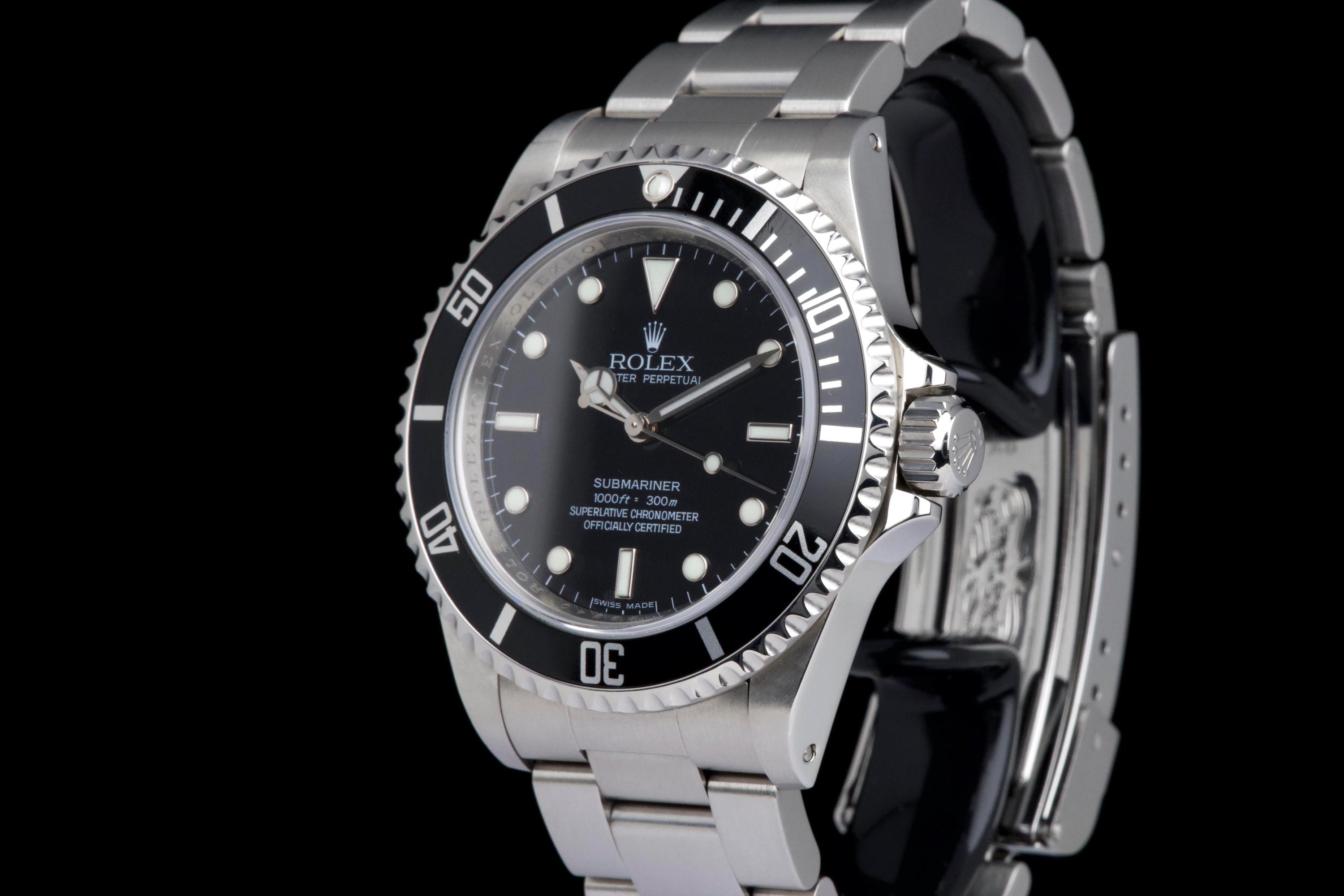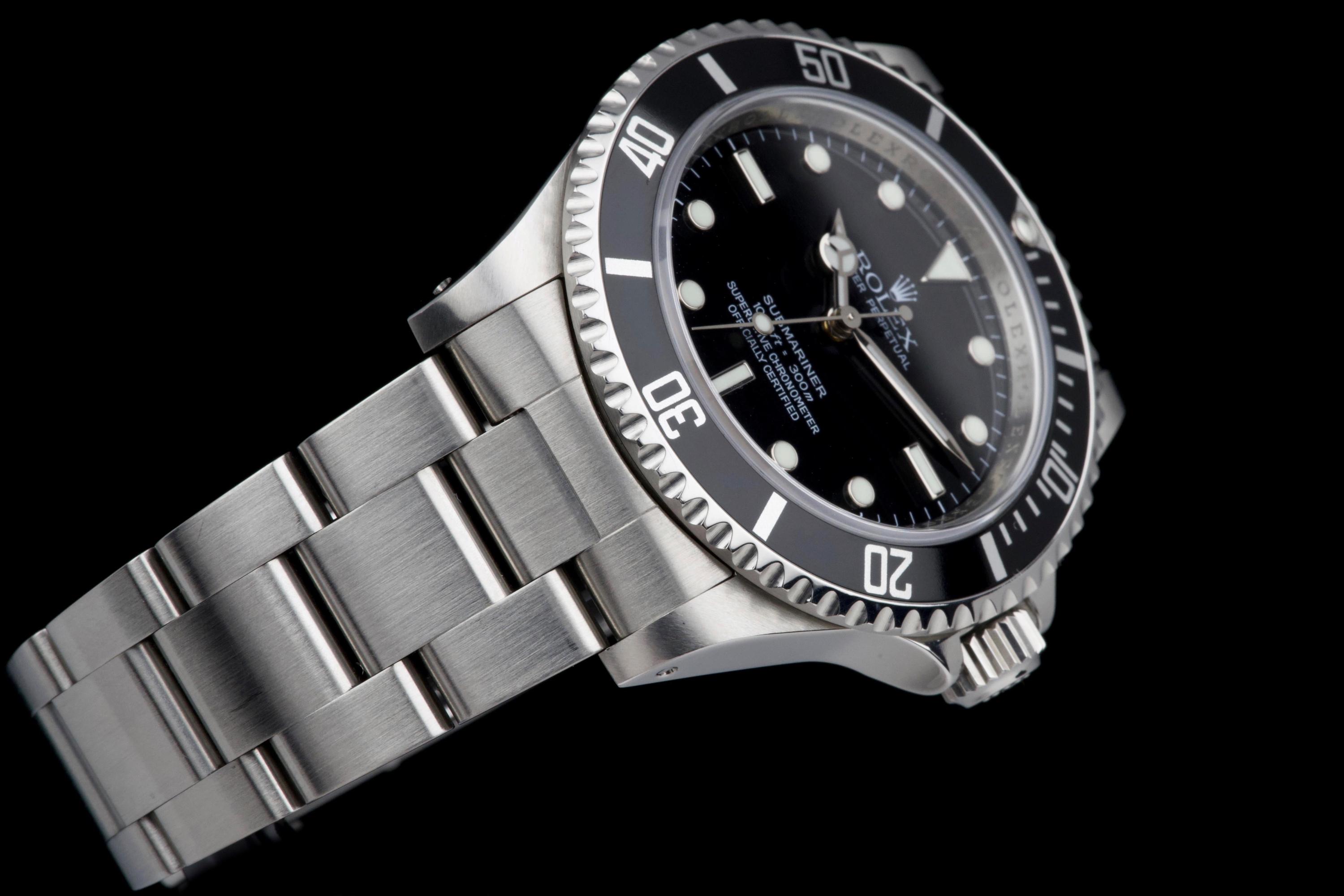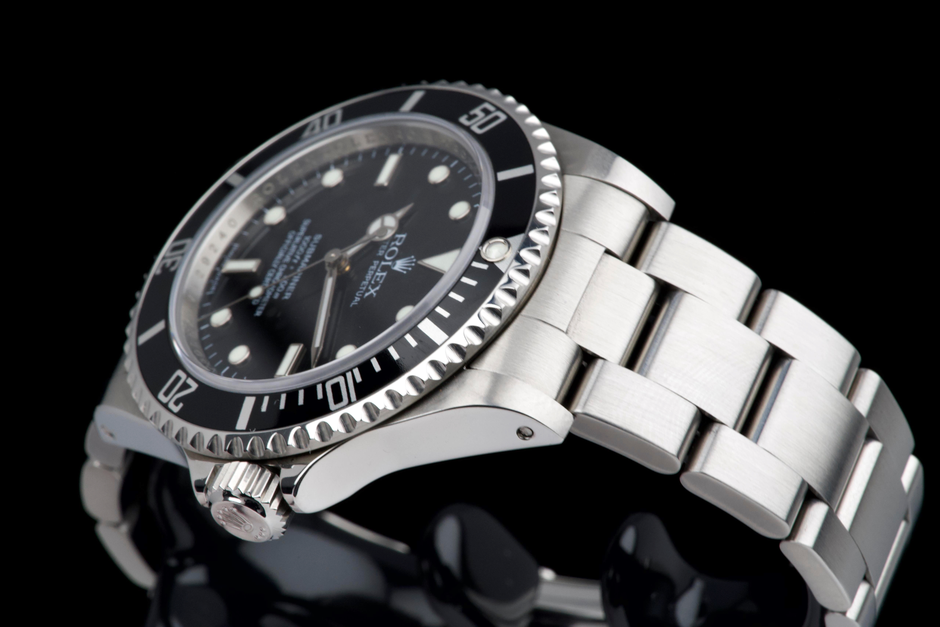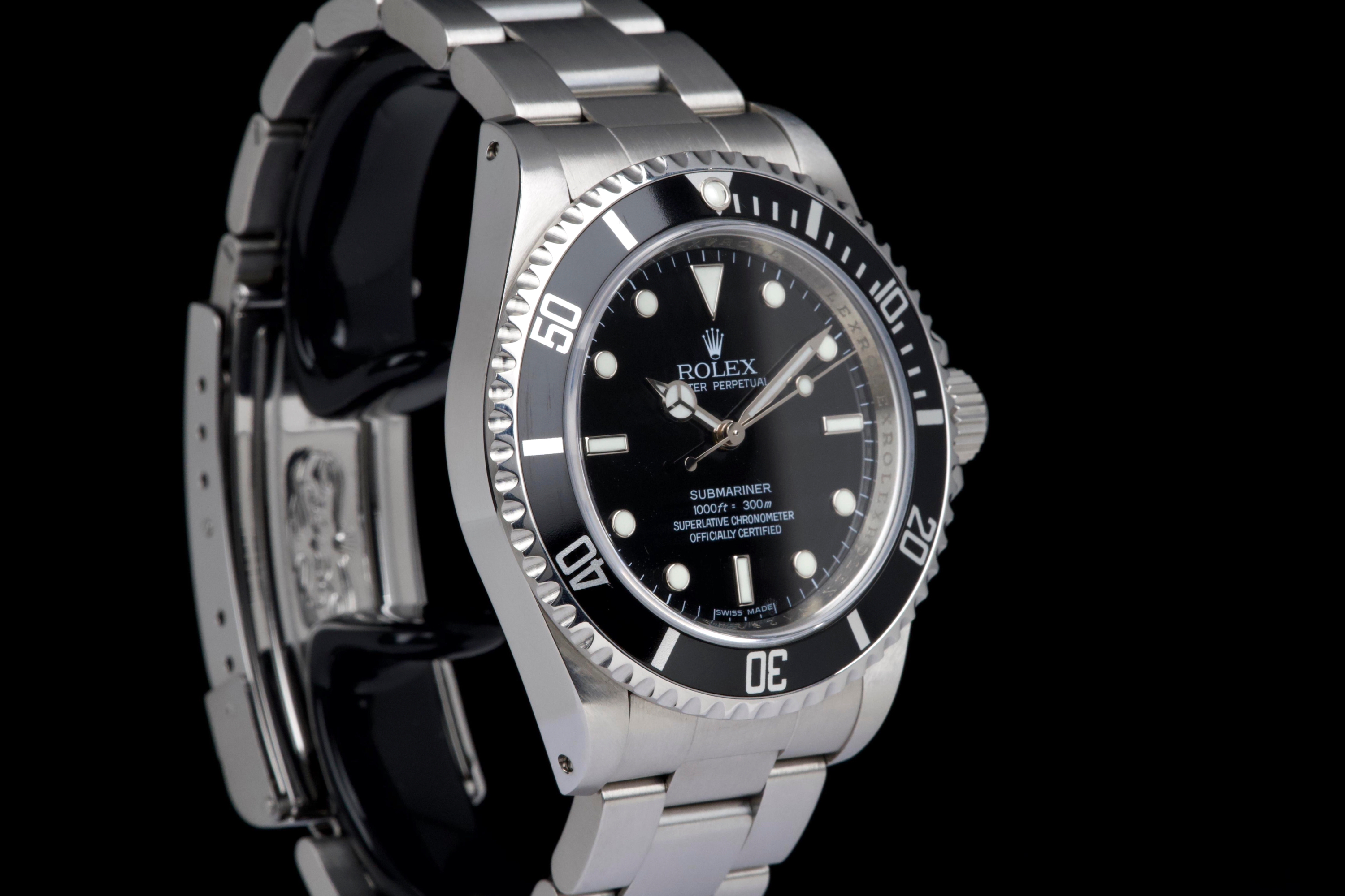 A clean and desirable Rolex Submariner reference 14060M, V-serial dating to 2009, featuring the sought-after “four lines” dial configuration. The case has been recently polished and is in excellent overall condition, showing only very light wear from careful use. The watch is fitted with its original black bezel insert, which remains in excellent condition. The original black luminova dial with four lines of text is in excellent condition, with matching hands, offering a balanced and modern look while retaining the classic no-date Submariner aesthetic. The watch is fitted with its original Oyster bracelet reference 93150 with 501B endlinks, showing only very light stretch, and secured by a clasp stamped PJ9. There is no service history, however the movement has been checked by our watchmaker and is running perfectly. Offered as a full set with box and papers, this is a sharp and well-preserved example of the last generation two-liner case Submariner before the ceramic era, and a great opportunity for collectors and enthusiasts alike.