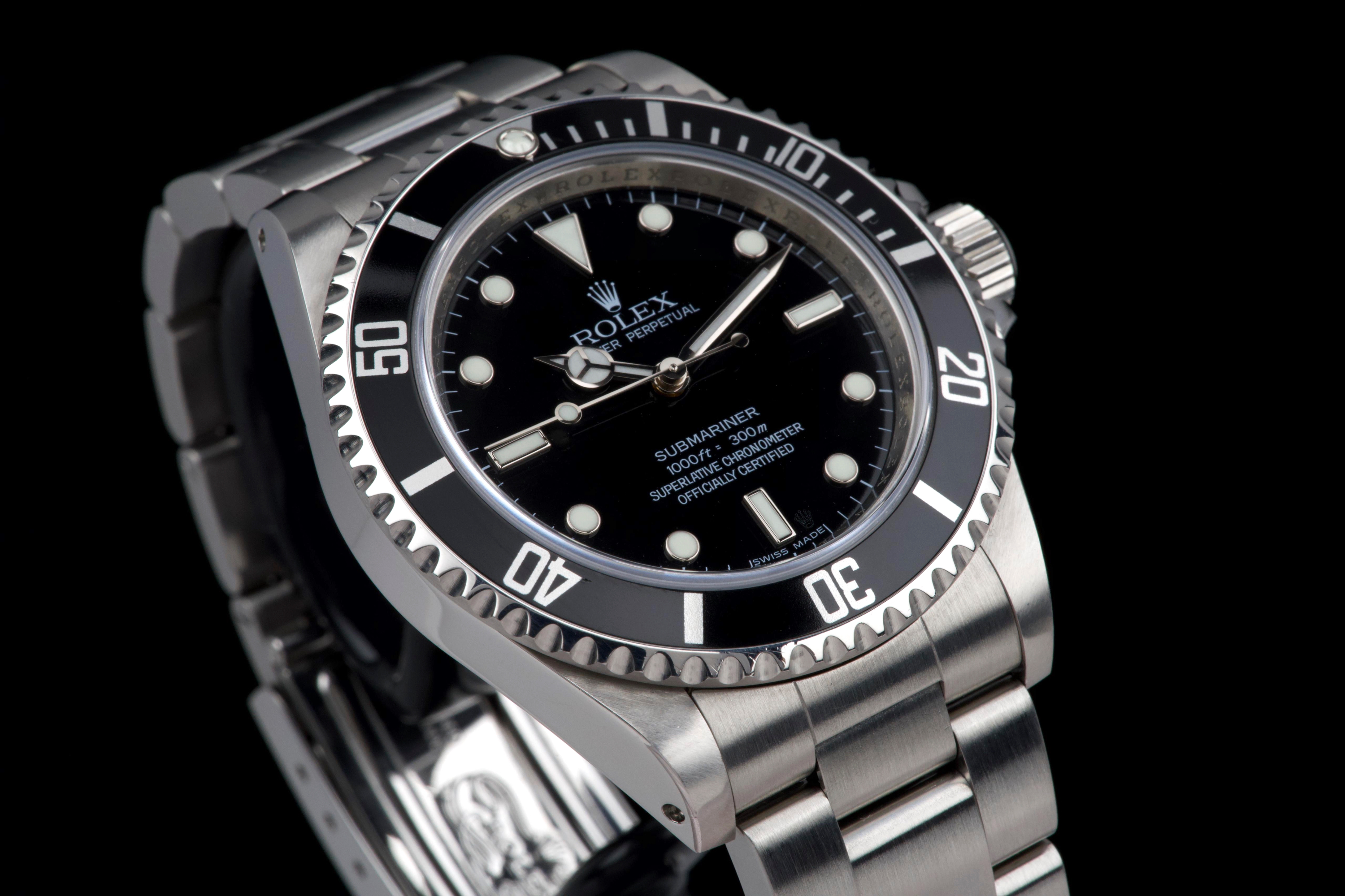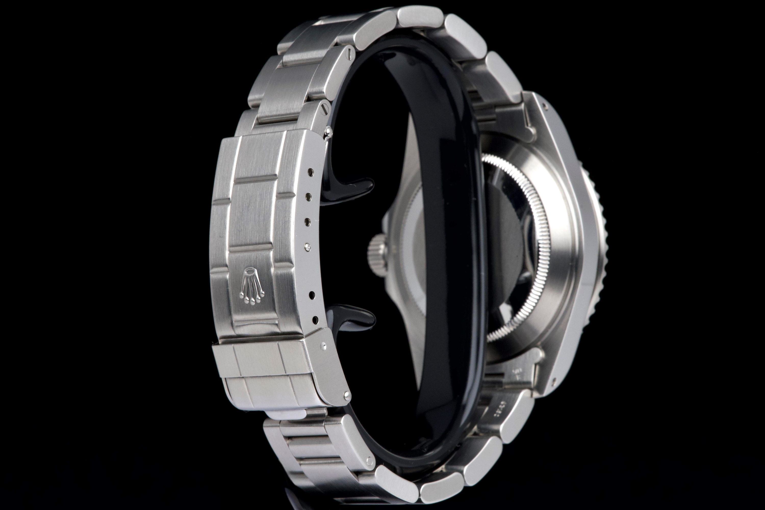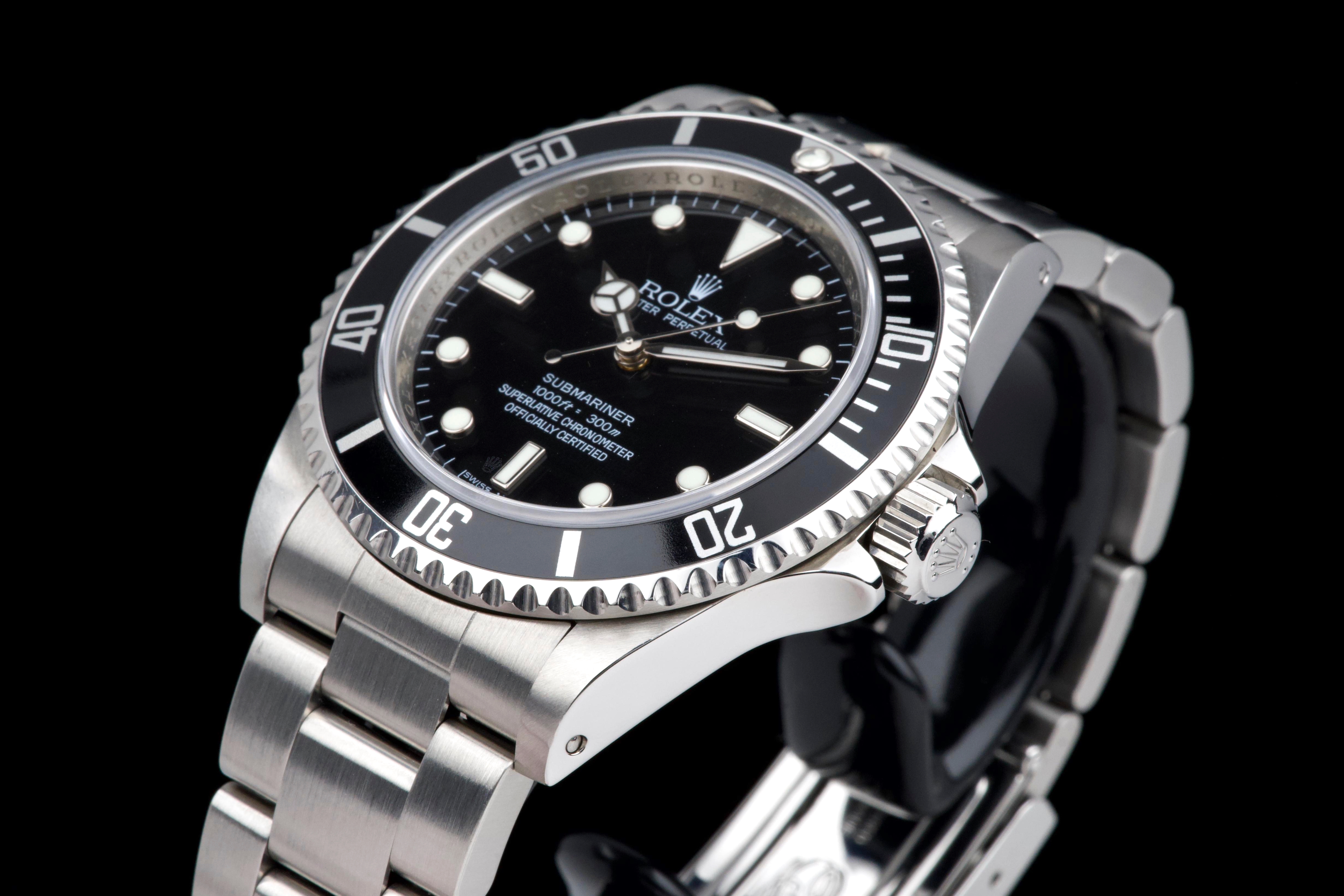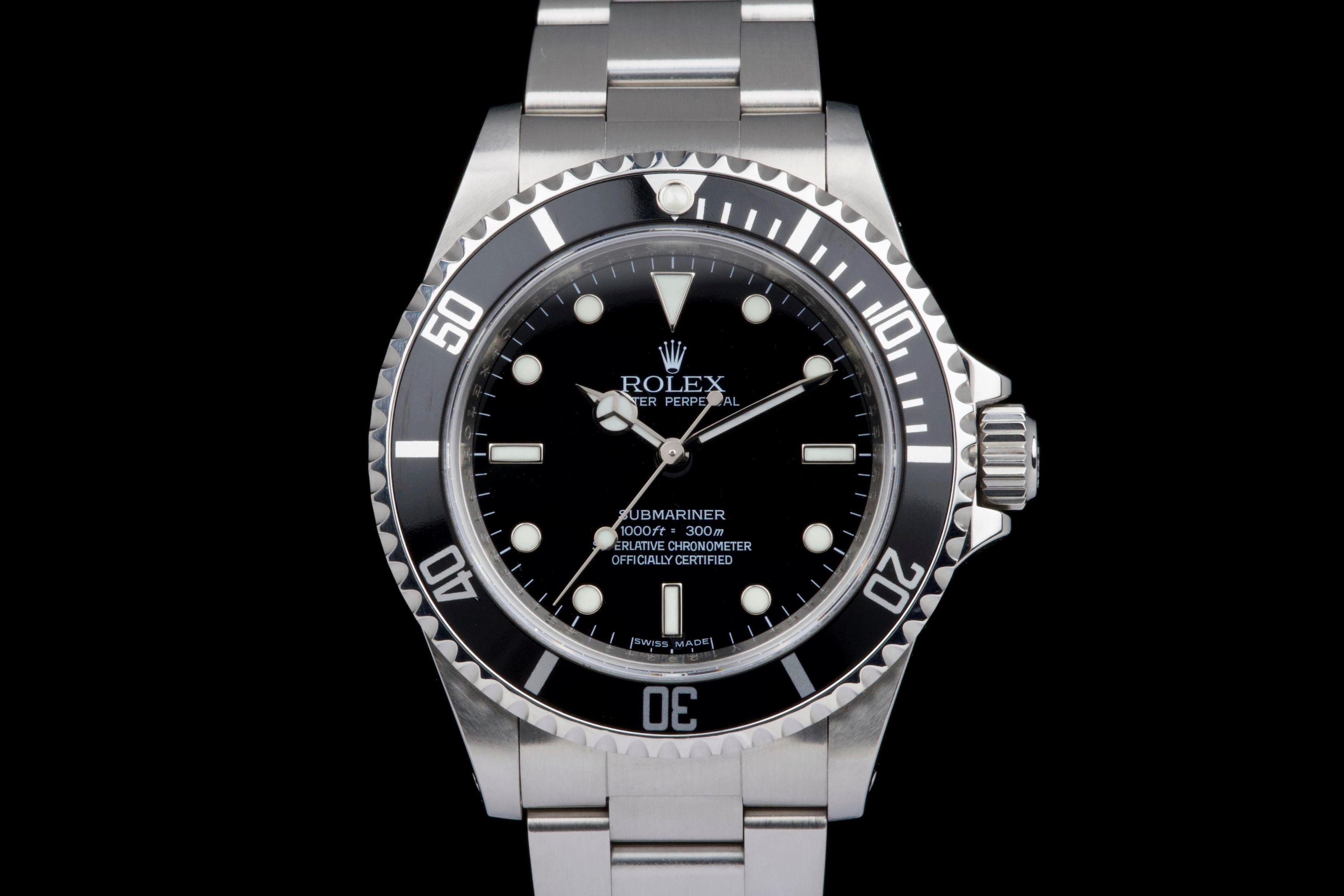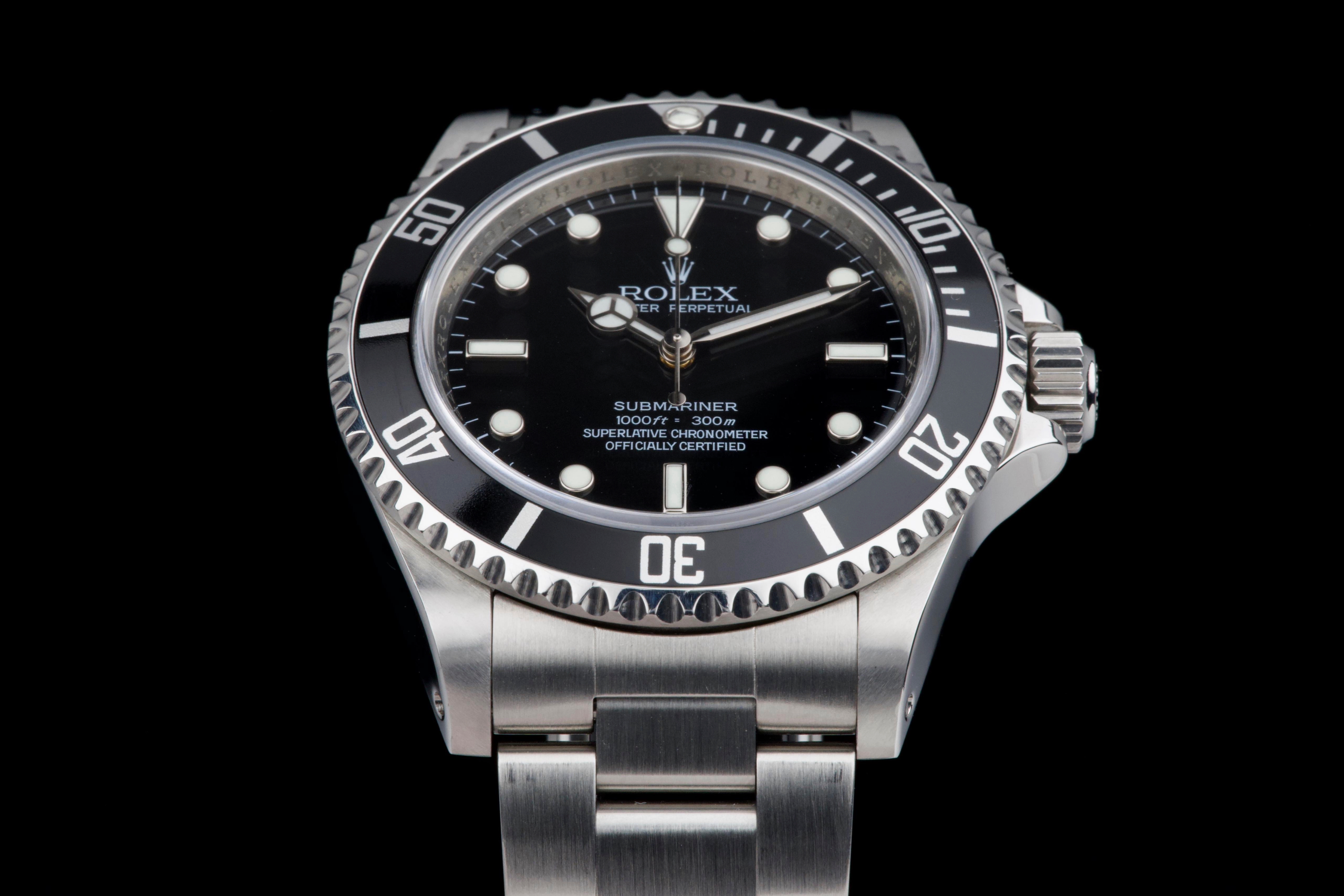 A clean and desirable Rolex Submariner reference 14060M, V-serial dating to 2009, featuring the sought-after “four lines” dial configuration. The case has been recently polished and is in excellent overall condition, showing only very light wear from careful use. The watch is fitted with its original black bezel insert, which remains in excellent condition. The original black luminova dial with four lines of text is in excellent condition, with matching hands, offering a balanced and modern look while retaining the classic no-date Submariner aesthetic. The watch is fitted with its original Oyster bracelet reference 93150 with 501B endlinks, showing only very light stretch, and secured by a clasp stamped PJ9. There is no service history, however the movement has been checked by our watchmaker and is running perfectly. Offered as a full set with box and papers, this is a sharp and well-preserved example of the last generation two-liner case Submariner before the ceramic era, and a great opportunity for collectors and enthusiasts alike.
