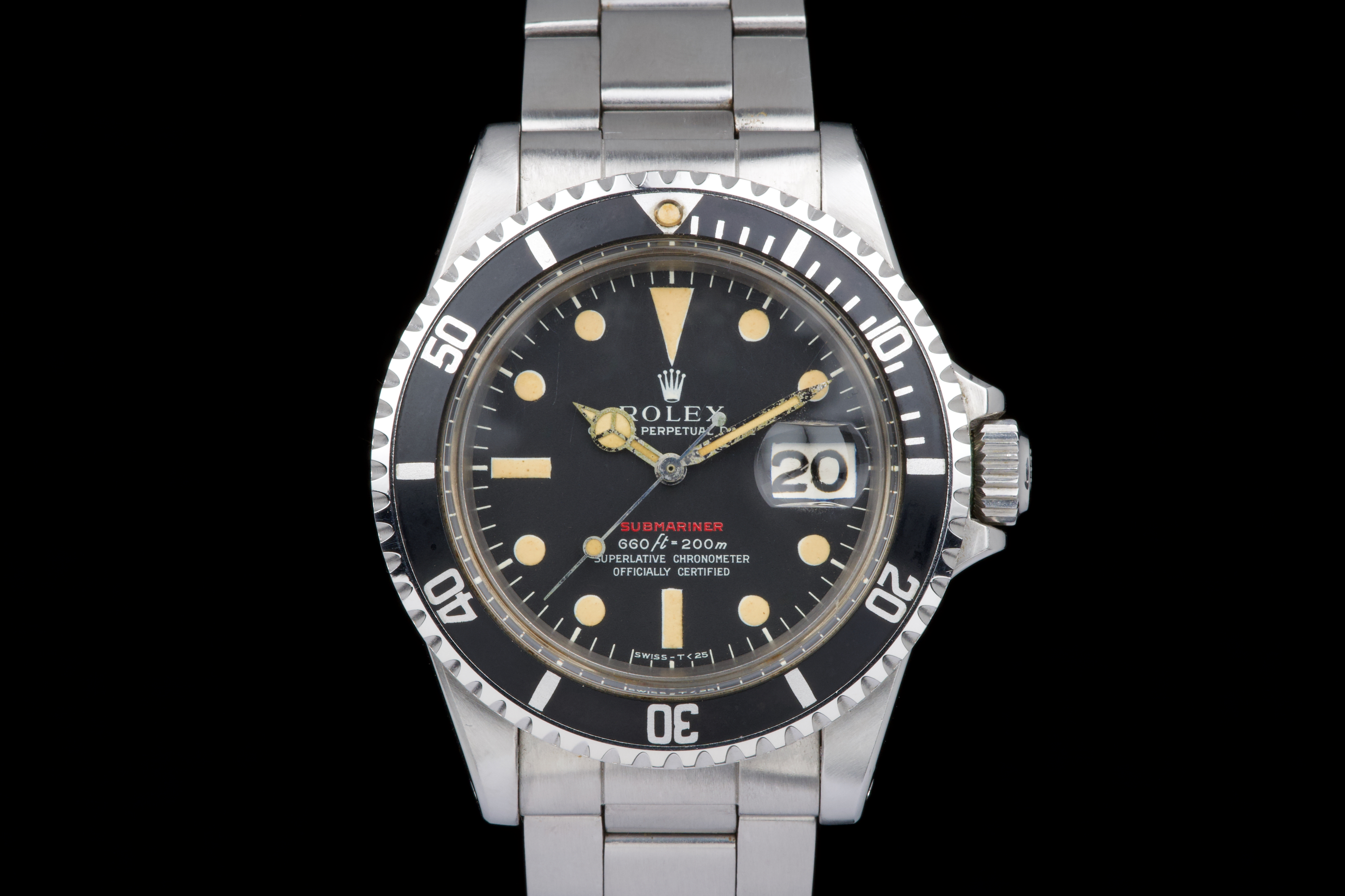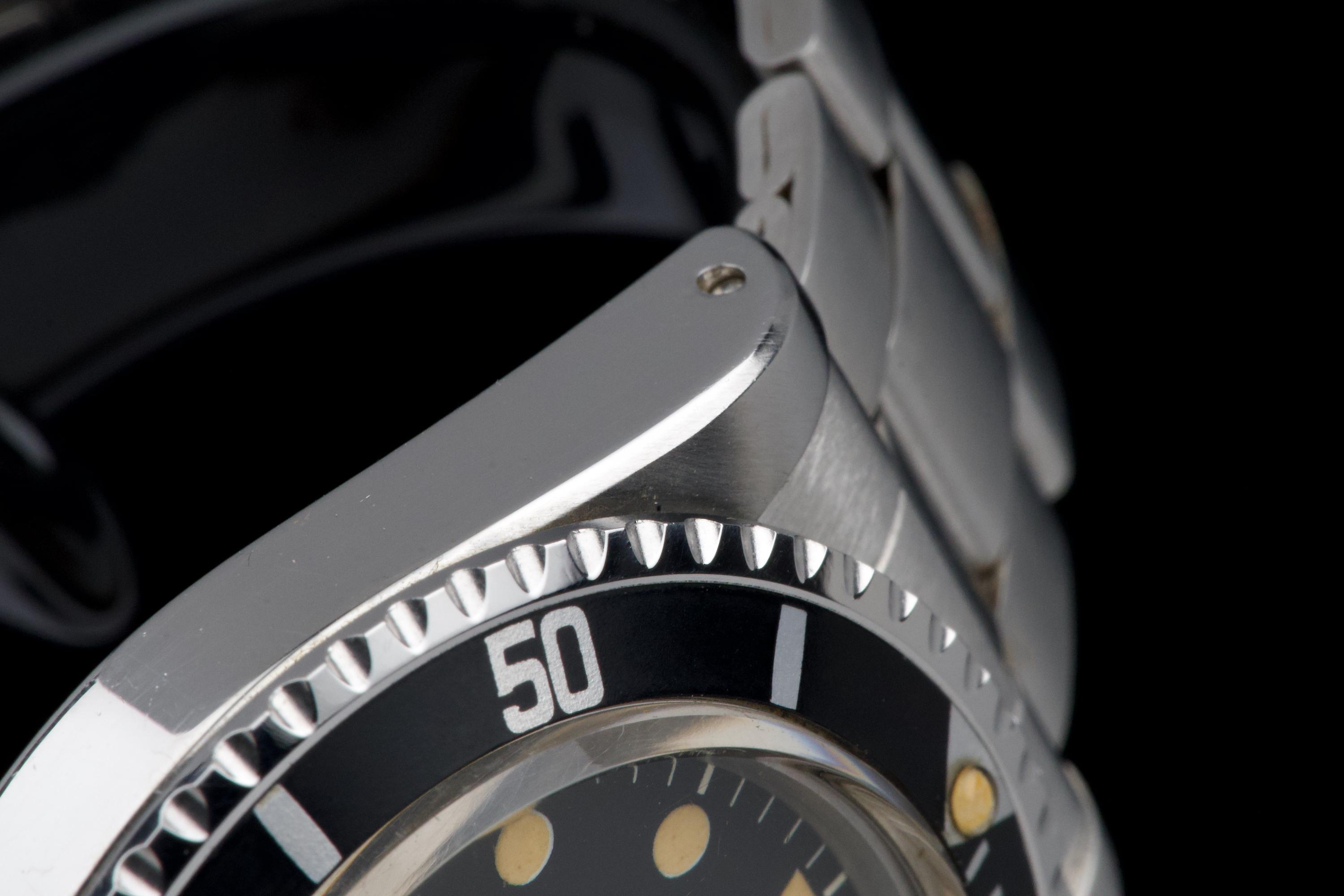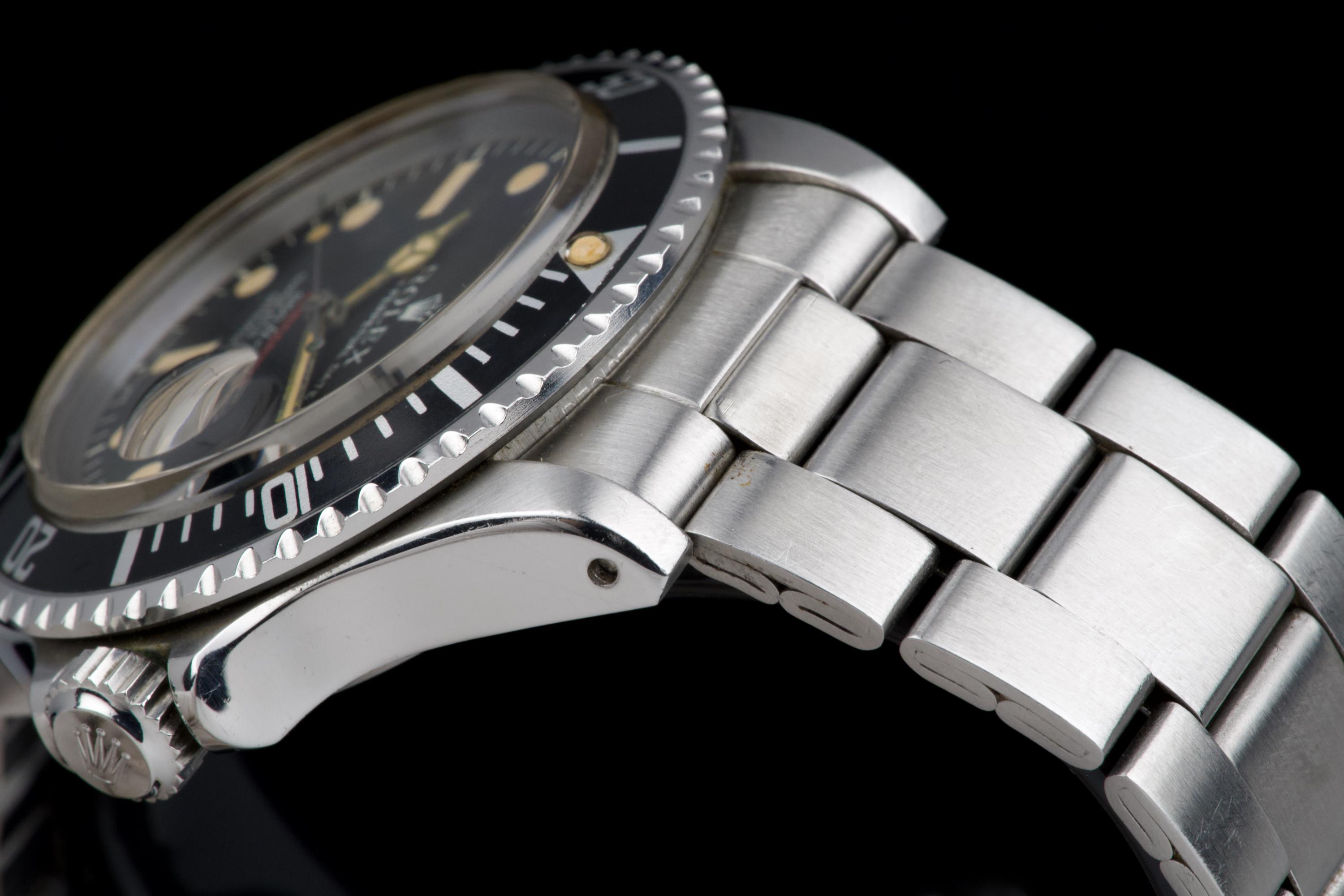 Rolex Submariner “Red” 1680 MKIV, from 1970 (Serial 2.79XXXX). An exceptional example of the iconic Red Submariner 1680 with MKIV dial. The case is superb, likely polished only once in the past, and remains thick with well-defined and symmetrical chamfers. The MKIV matte black dial is stunning, with no visible flaws. The tritium hour markers have developed a beautiful light orange patina, and the matching hands show light corrosion typical for a watch of this age. The original bezel insert is exceptional, showing no scratches and featuring the desirable thick font. The original crown is present, as is the folded Oyster bracelet dated 4.70 with 280 endlinks. The bracelet shows virtually no stretch. Serial and reference numbers between the lugs are crisp and deep, indicating minimal wear. The caseback is correctly stamped IV.70. The movement has just been serviced by our watchmaker and is running perfectly. A fantastic example of a 1970 MKIV Red Submariner — combining an exceptional case, flawless dial, and original components throughout. A true collector-grade vintage Rolex.