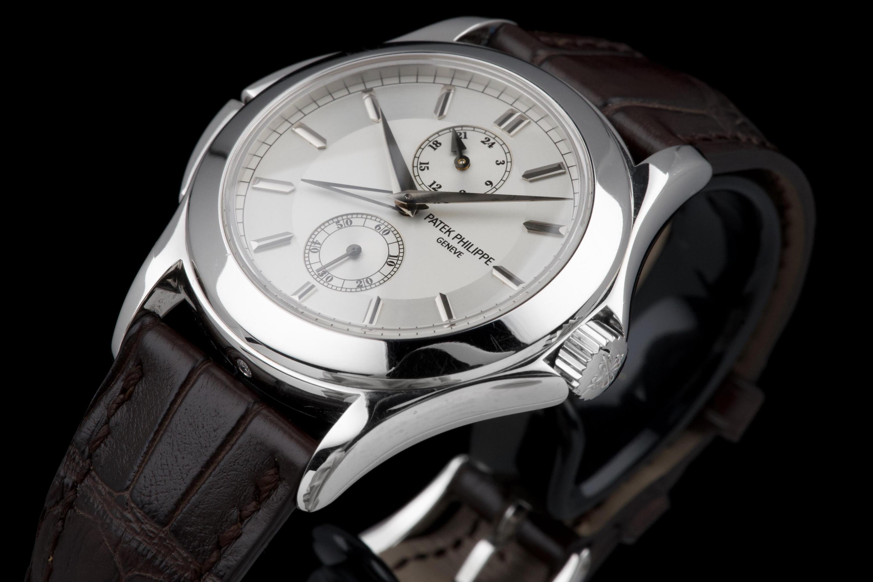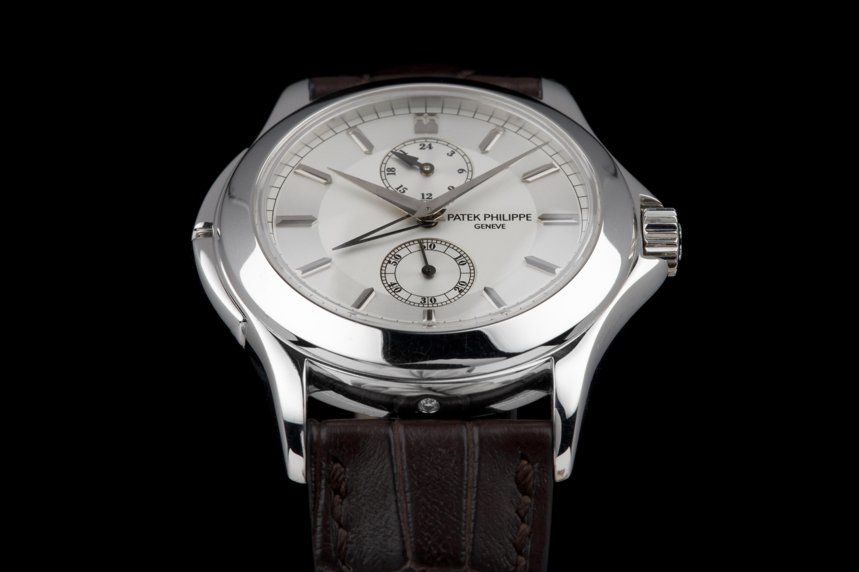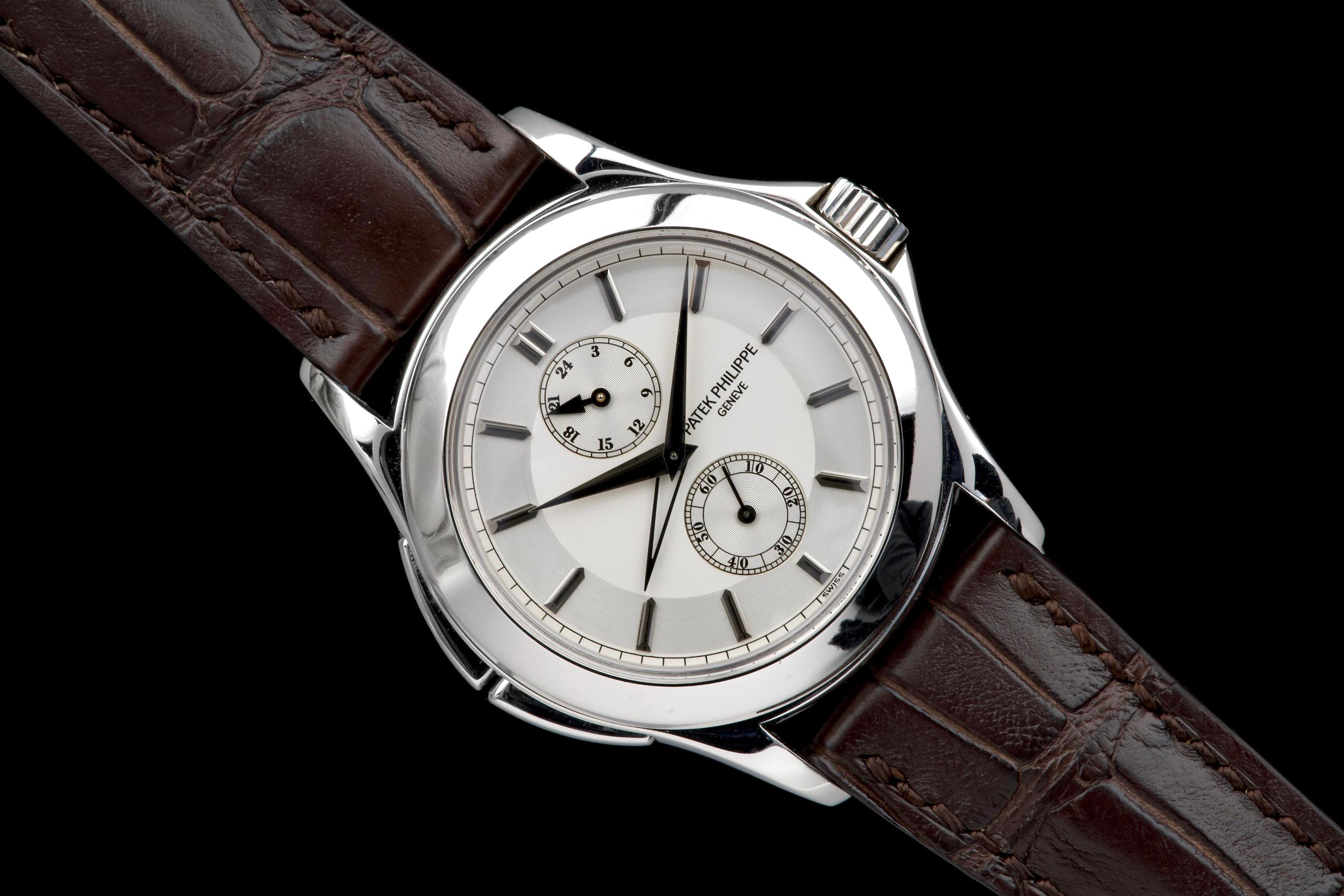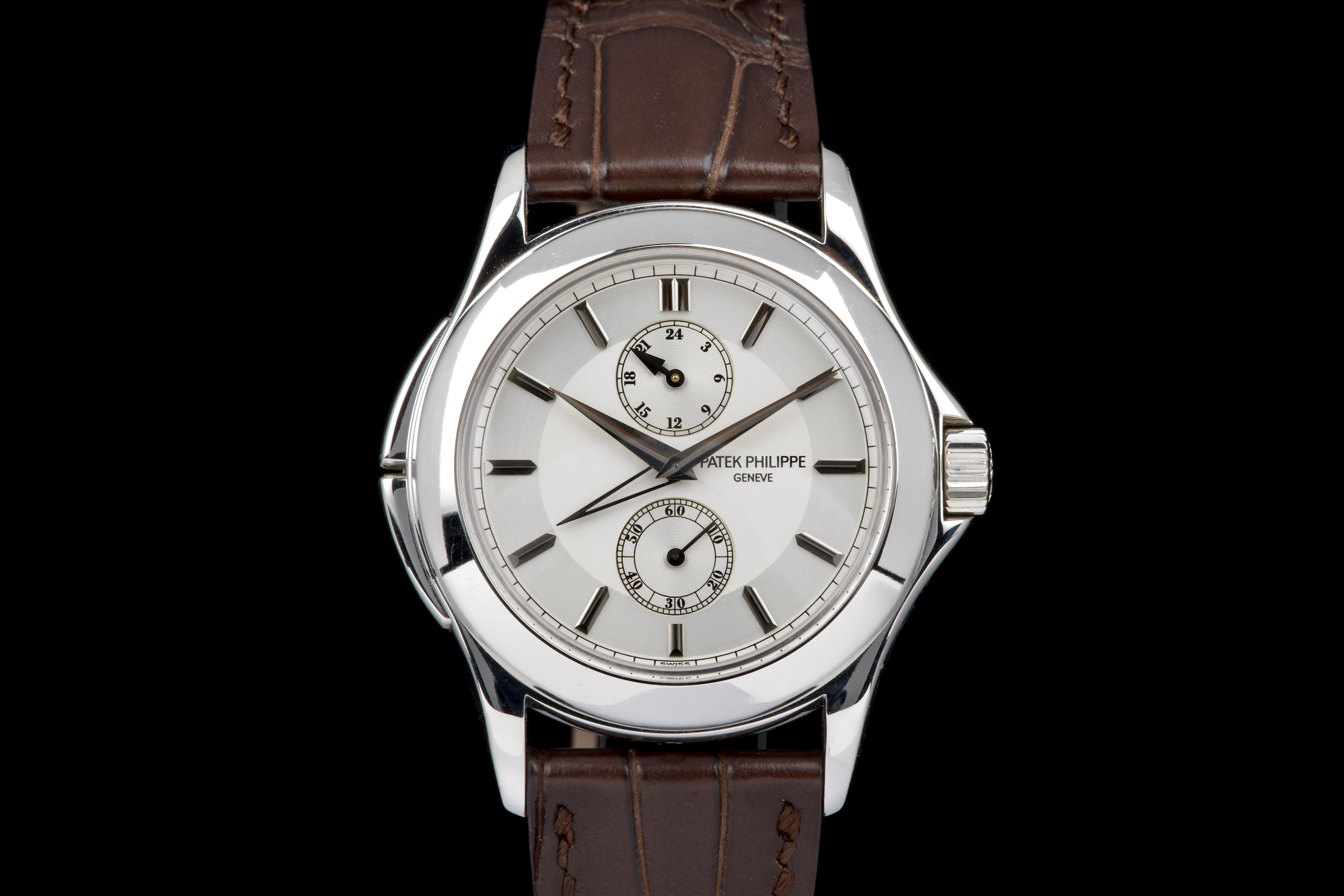 The present Patek Philippe Travel Time reference 5134P, dating to 2003, is a refined and technically elegant example of the manufacture’s dual-time complication, executed in platinum. The case presents in excellent overall condition and appears to be unpolished, showing only very light wear consistent with careful use over time, and retaining crisp lines and harmonious proportions. Housed in a platinum case measuring 37 mm in diameter, the watch offers classic, understated dimensions that are perfectly in keeping with Patek Philippe’s discreet approach to complicated travel watches. The two-tone silvered dial is flawless and distinguished by applied white-gold sword-shaped hour markers, lending depth and clarity to the composition while maintaining a restrained and elegant aesthetic. Powering the watch is the automatic Patek Philippe calibre 215 PS FUS, a finely constructed movement featuring a Travel Time (dual-time) complication with independently adjustable local hour hand. This intuitive system allows the wearer to easily change time zones without stopping the movement, making it both practical and technically sophisticated. The movement has just been fully serviced by our watchmaker and is running perfectly at the time of cataloguing. The watch is fitted with a brand-new Patek Philippe brown alligator leather strap, paired with a platinum Patek Philippe ardillon buckle, completing the ensemble with correct material and period coherence. It is accompanied by an Extract from the Archives, confirming production of the watch in 2003. Elegant, discreet, and mechanically refined, this Travel Time 5134P represents an excellent opportunity to acquire a platinum Patek Philippe complication that combines everyday usability with timeless design and exceptional craftsmanship.