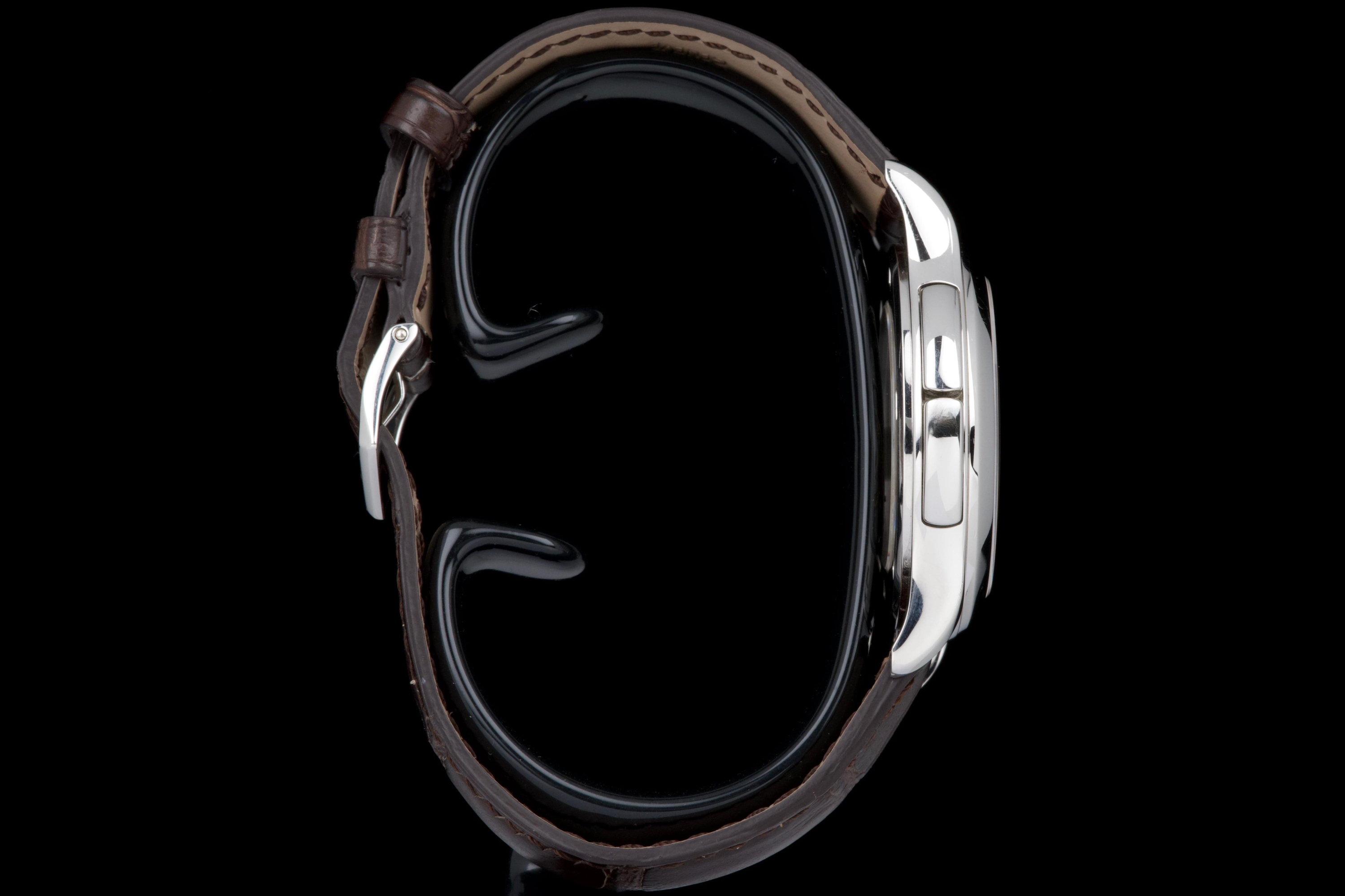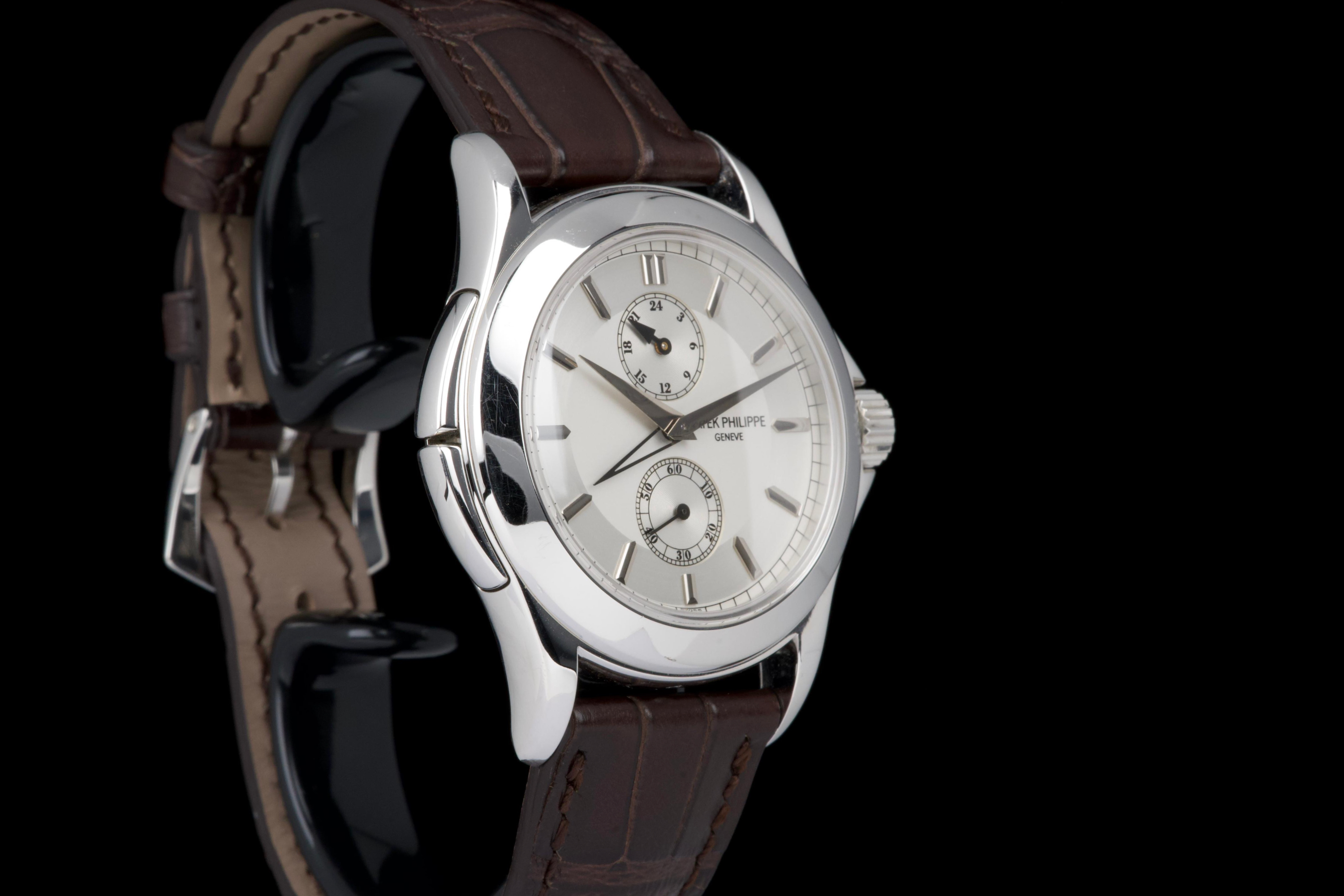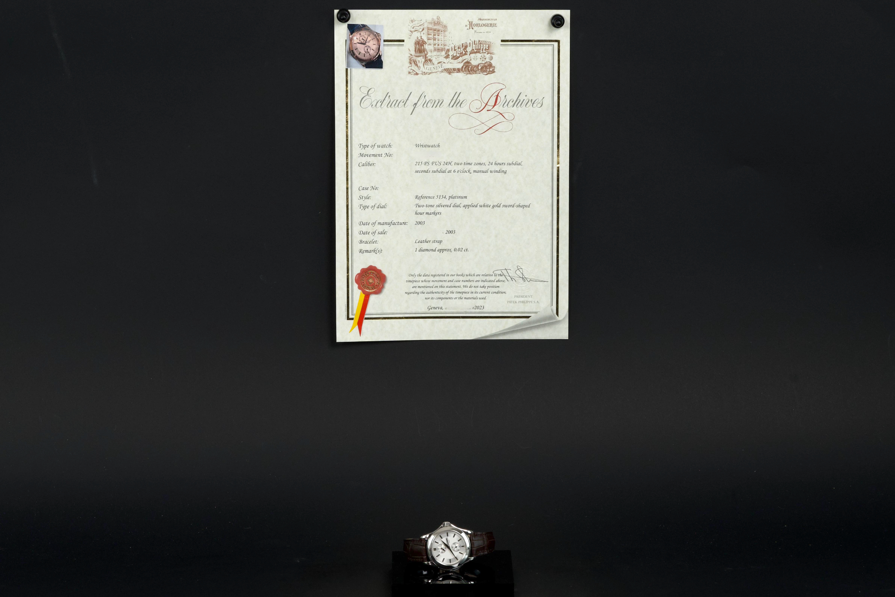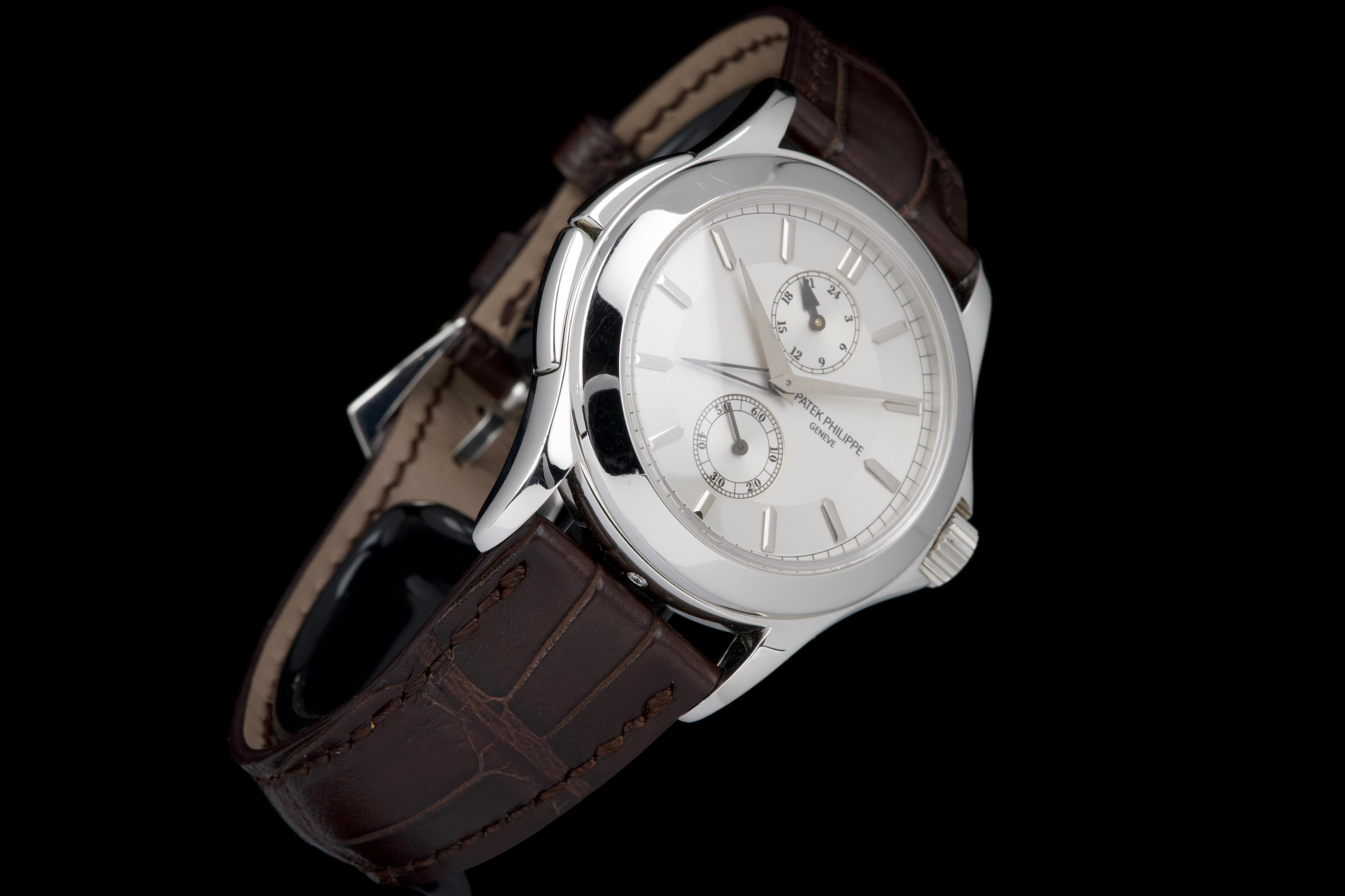 The present Patek Philippe Travel Time reference 5134P, dating to 2003, is a refined and technically elegant example of the manufacture’s dual-time complication, executed in platinum. The case presents in excellent overall condition and appears to be unpolished, showing only very light wear consistent with careful use over time, and retaining crisp lines and harmonious proportions. Housed in a platinum case measuring 37 mm in diameter, the watch offers classic, understated dimensions that are perfectly in keeping with Patek Philippe’s discreet approach to complicated travel watches. The two-tone silvered dial is flawless and distinguished by applied white-gold sword-shaped hour markers, lending depth and clarity to the composition while maintaining a restrained and elegant aesthetic. Powering the watch is the automatic Patek Philippe calibre 215 PS FUS, a finely constructed movement featuring a Travel Time (dual-time) complication with independently adjustable local hour hand. This intuitive system allows the wearer to easily change time zones without stopping the movement, making it both practical and technically sophisticated. The movement has just been fully serviced by our watchmaker and is running perfectly at the time of cataloguing. The watch is fitted with a brand-new Patek Philippe brown alligator leather strap, paired with a platinum Patek Philippe ardillon buckle, completing the ensemble with correct material and period coherence. It is accompanied by an Extract from the Archives, confirming production of the watch in 2003. Elegant, discreet, and mechanically refined, this Travel Time 5134P represents an excellent opportunity to acquire a platinum Patek Philippe complication that combines everyday usability with timeless design and exceptional craftsmanship.