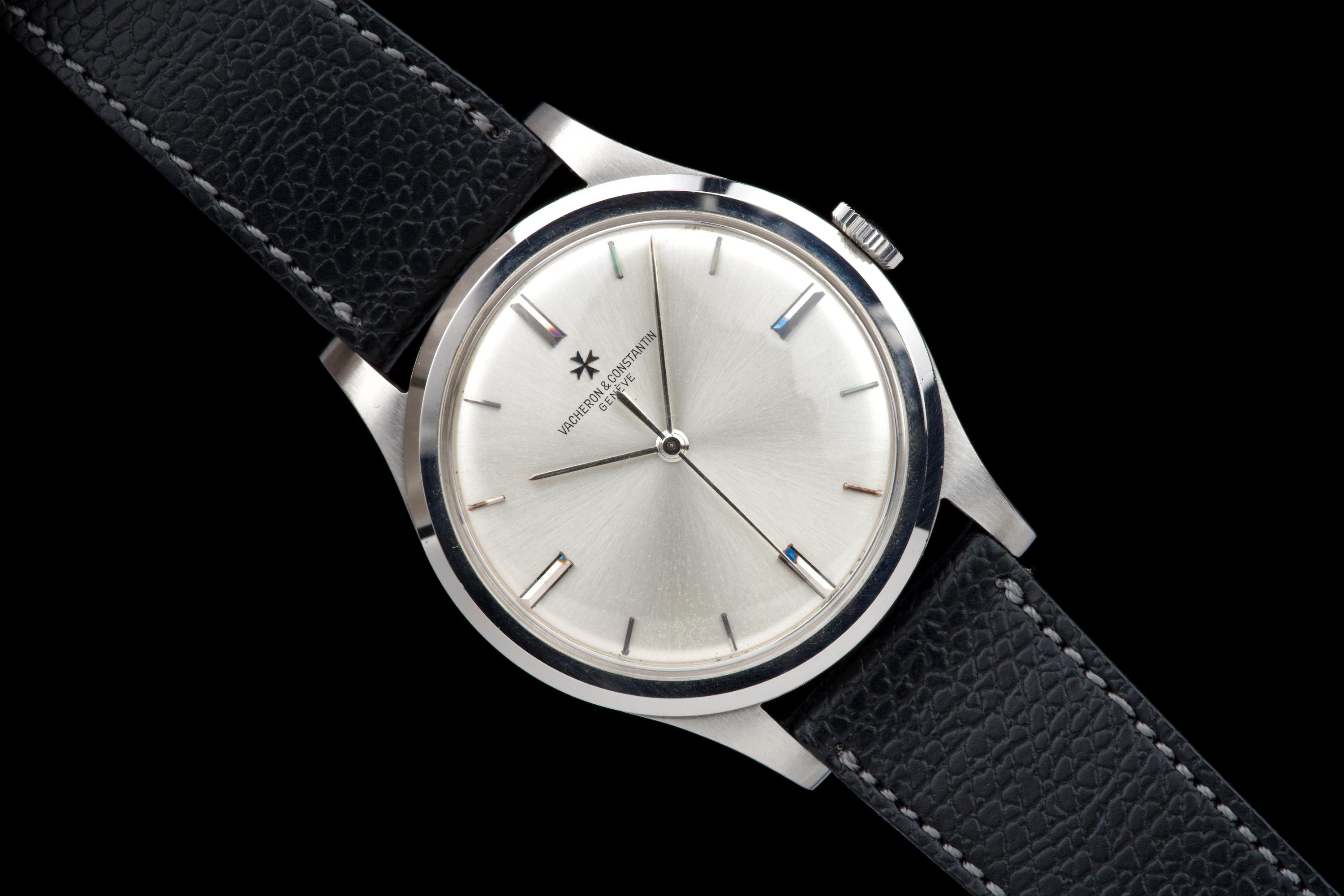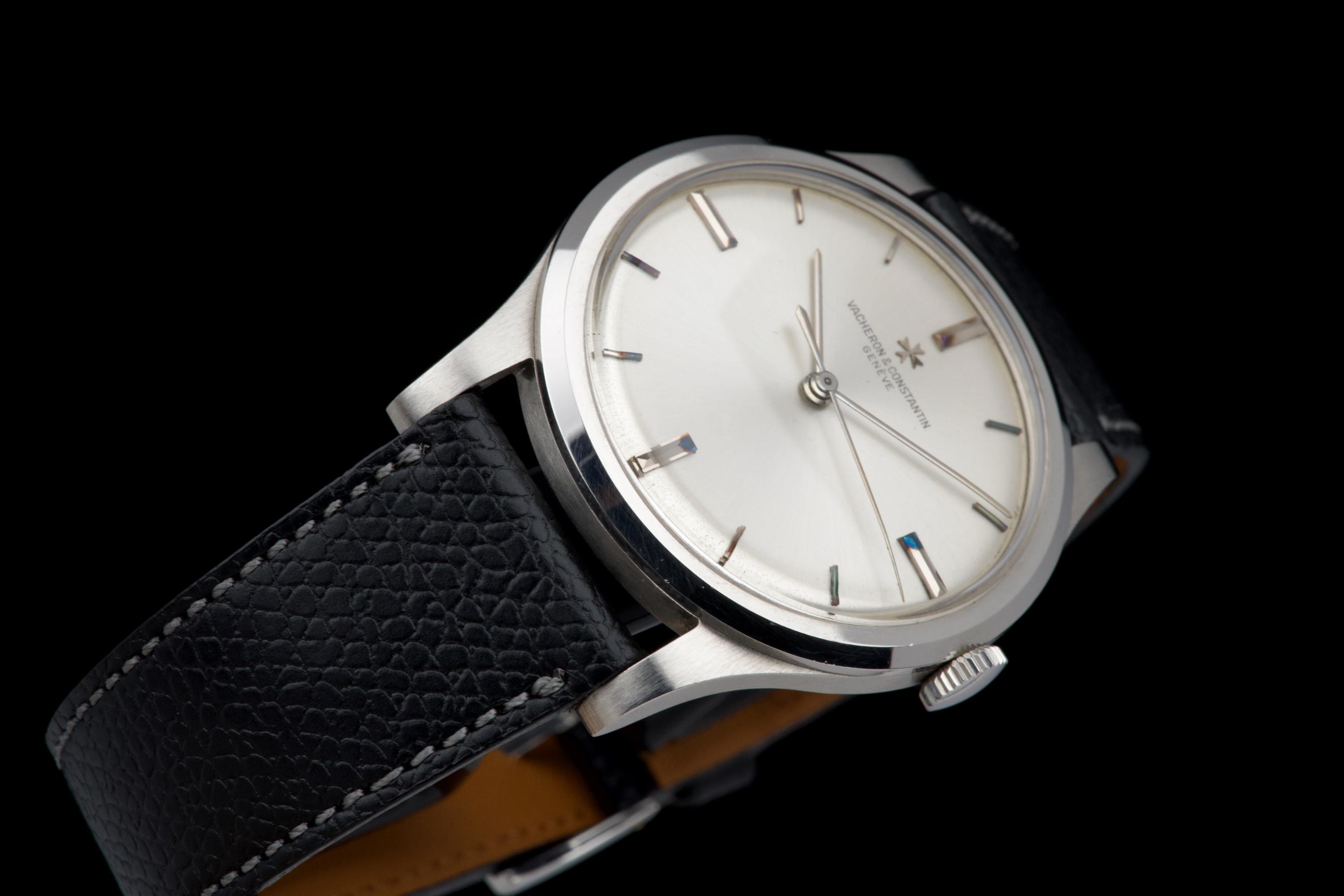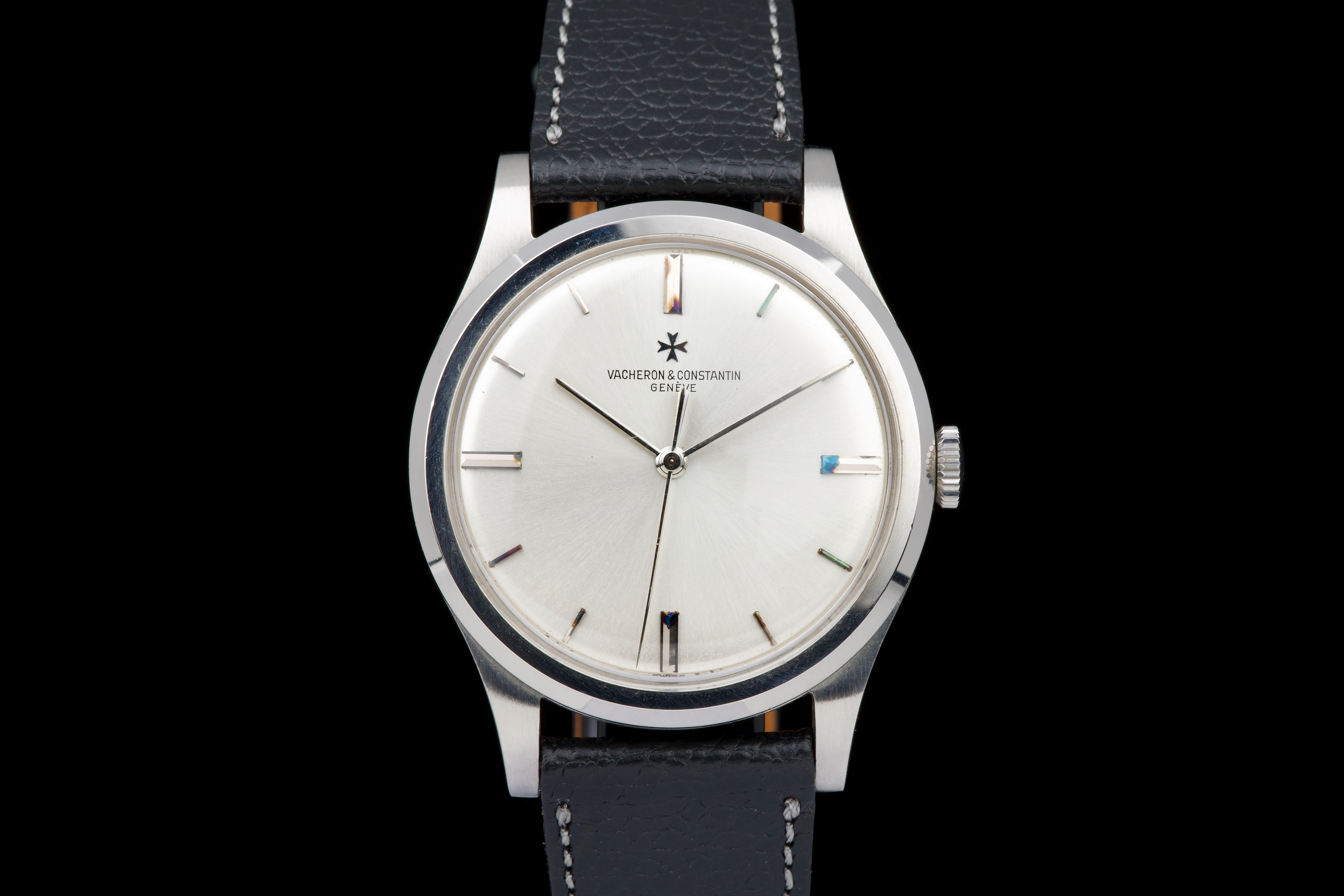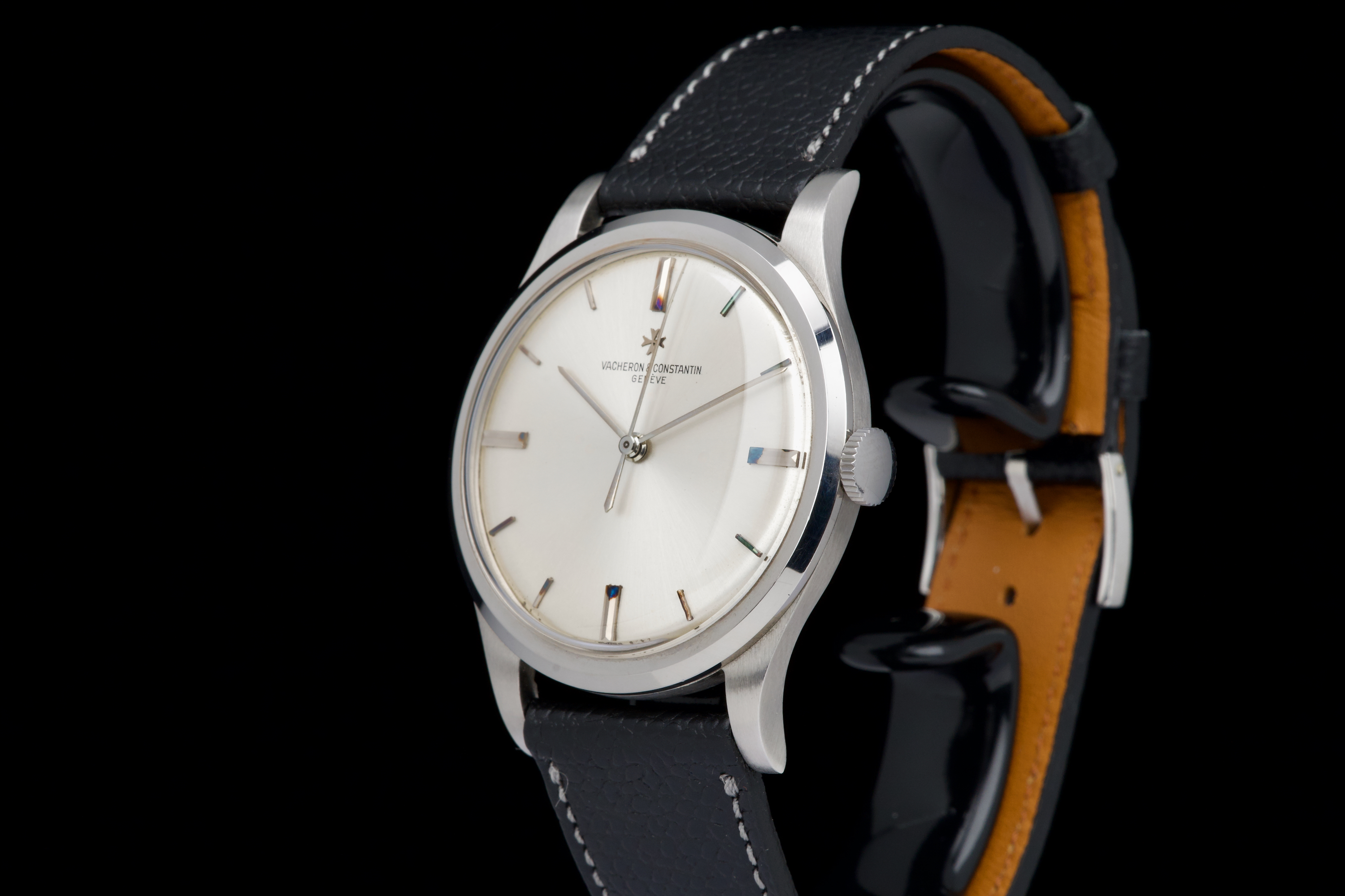 A beautifully preserved example of the Vacheron Constantin reference 6803, an oversized 36mm dress watch from the late 1960s. The stainless-steel case appears to be unpolished, and retains sharp lines and harmonious proportions — a hallmark of Vacheron’s understated elegance of the era. The original silver dial is in excellent overall condition, with a subtle partial discoloration on some of the hour markers, typical for watches of this period and adding to its vintage charm. The center-seconds layout gives the watch a clean and balanced aesthetic. The plexiglass crystal shows a few light surface scratches, again consistent with age. Recently serviced by our watchmaker, the movement runs perfectly. The watch is fitted with a brand-new calf leather strap and the original Vacheron Constantin steel buckle. An elegant and charismatic vintage Vacheron — perfectly proportioned, beautifully preserved, and a superb representative of the brand’s refined 1960s design language.