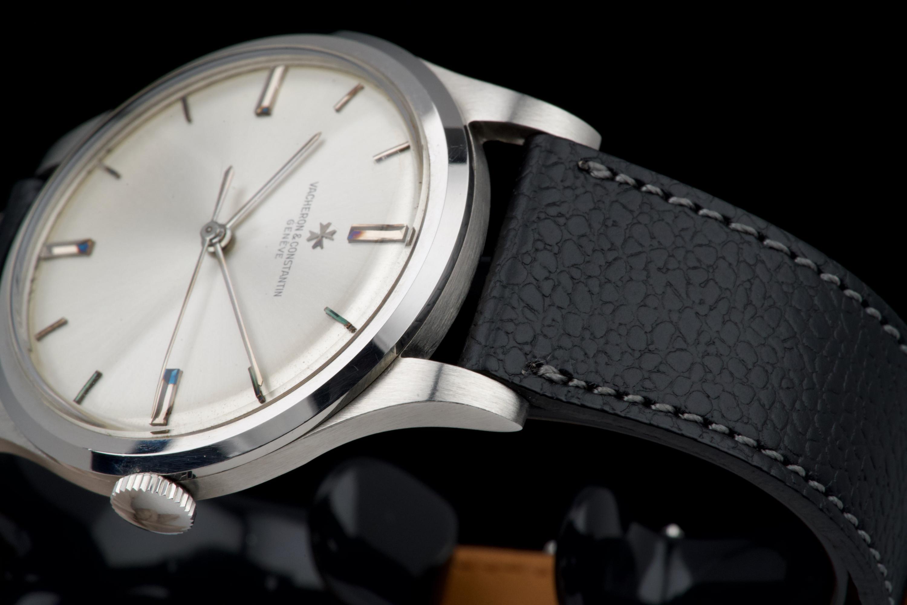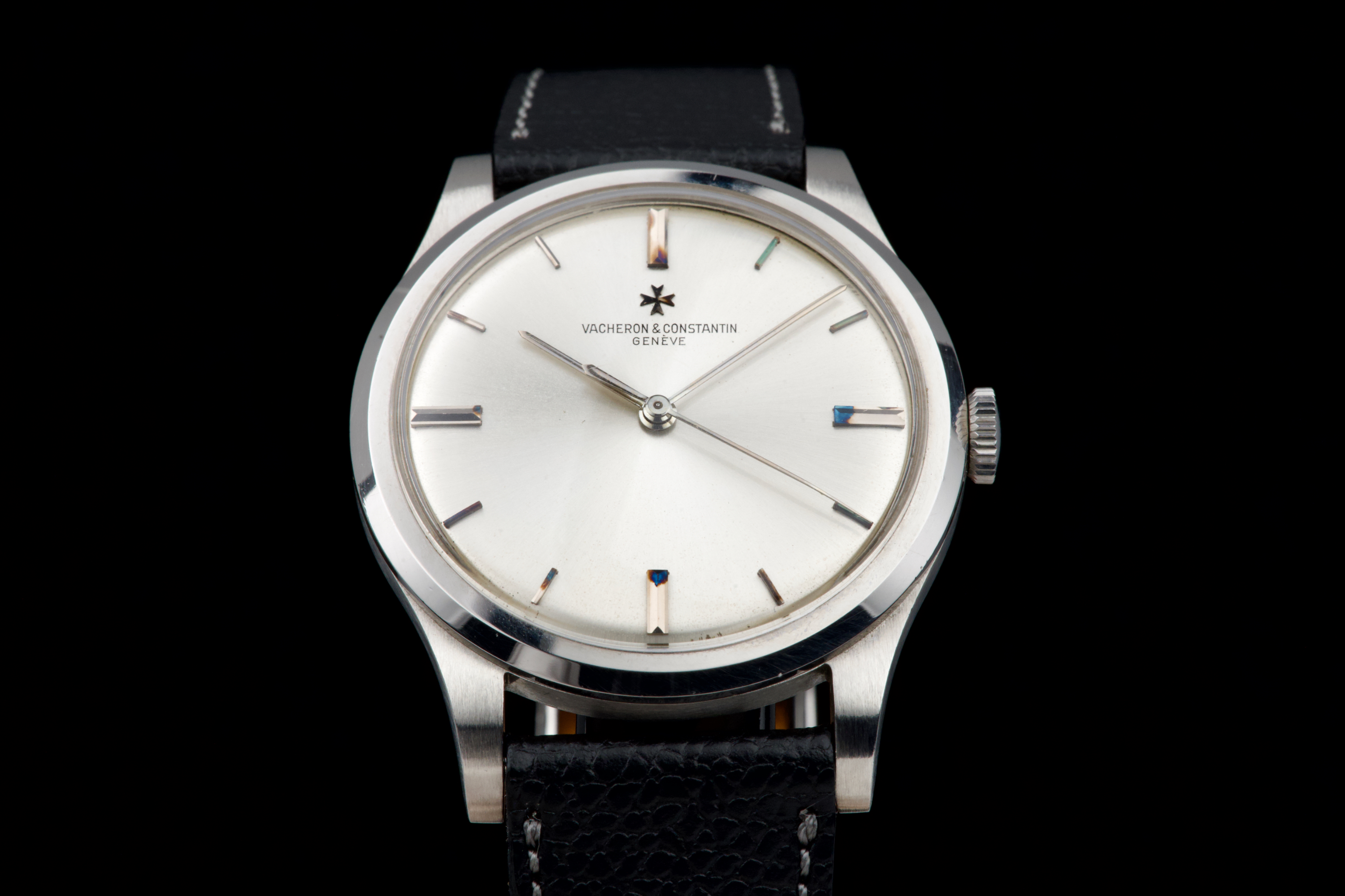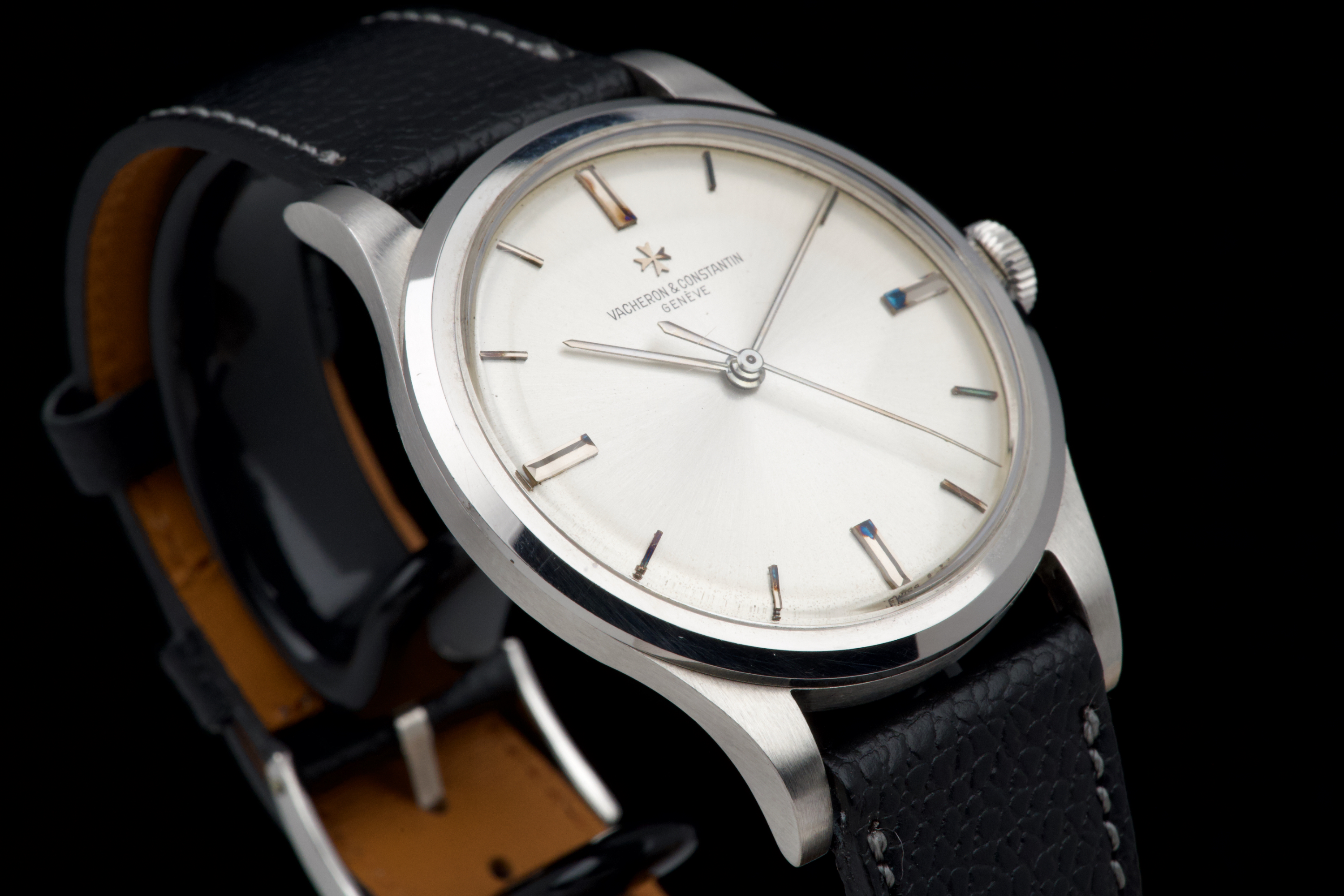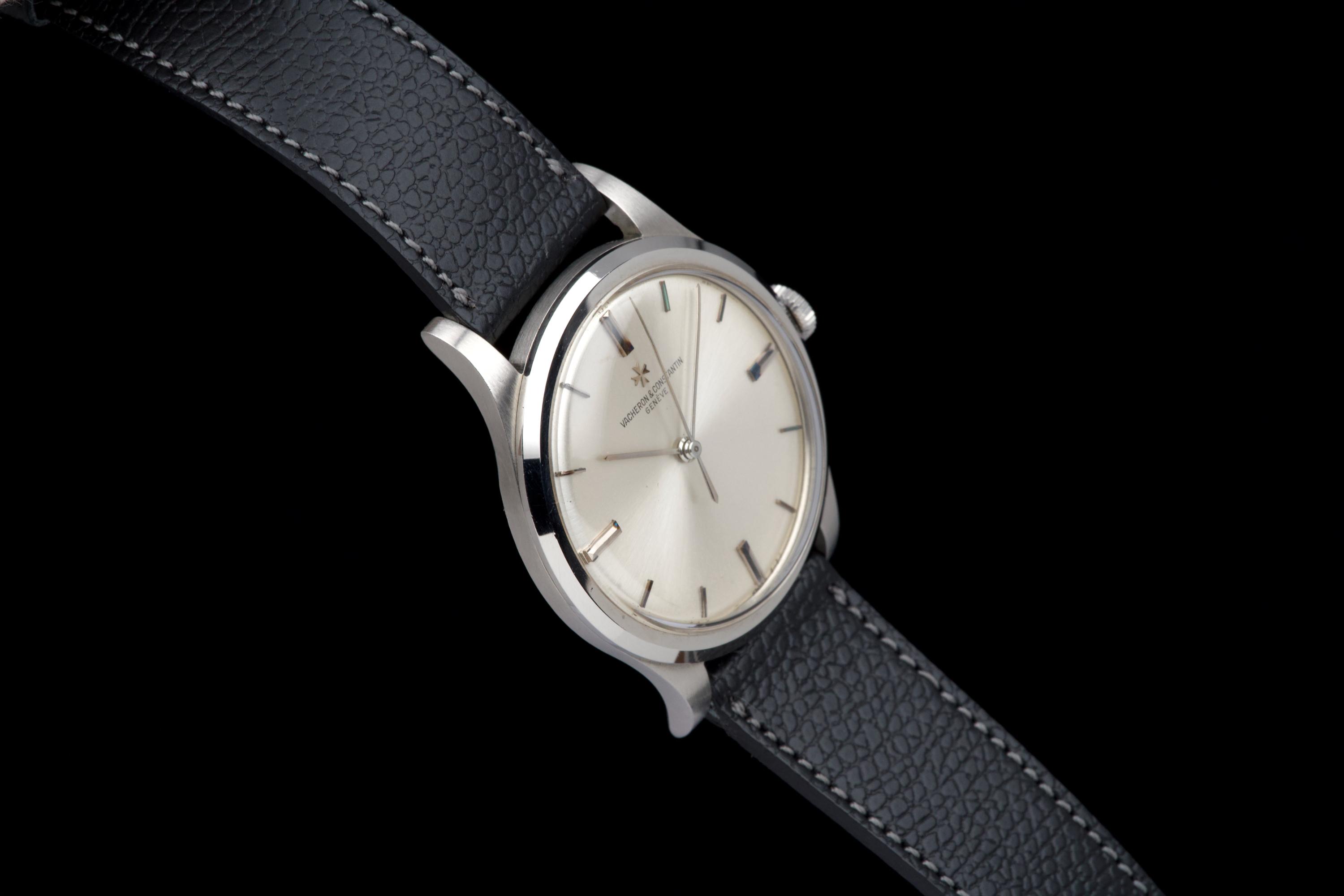 A beautifully preserved example of the Vacheron Constantin reference 6803, an oversized 36mm dress watch from the late 1960s. The stainless-steel case appears to be unpolished, and retains sharp lines and harmonious proportions — a hallmark of Vacheron’s understated elegance of the era. The original silver dial is in excellent overall condition, with a subtle partial discoloration on some of the hour markers, typical for watches of this period and adding to its vintage charm. The center-seconds layout gives the watch a clean and balanced aesthetic. The plexiglass crystal shows a few light surface scratches, again consistent with age. Recently serviced by our watchmaker, the movement runs perfectly. The watch is fitted with a brand-new calf leather strap and the original Vacheron Constantin steel buckle. An elegant and charismatic vintage Vacheron — perfectly proportioned, beautifully preserved, and a superb representative of the brand’s refined 1960s design language.