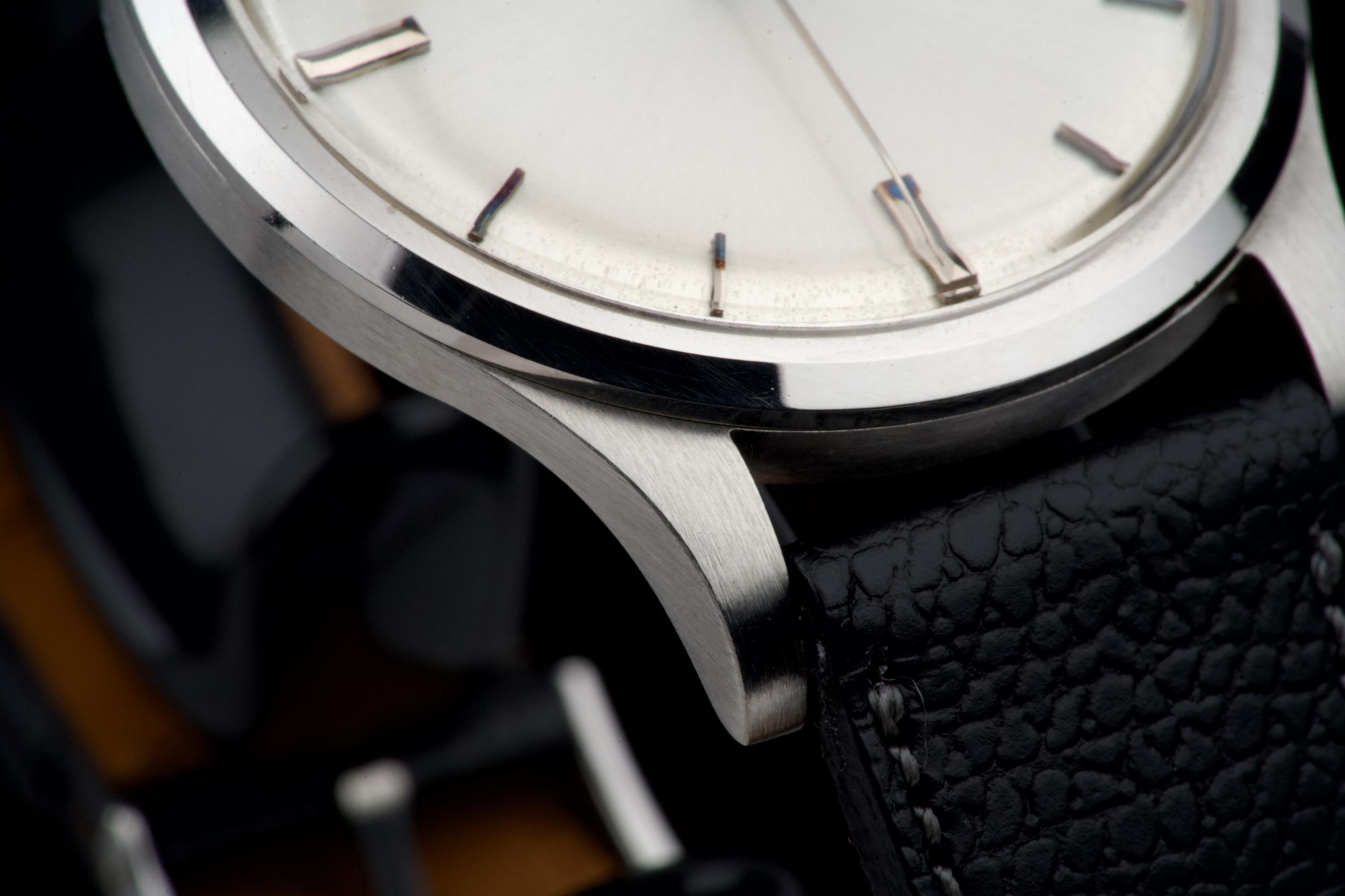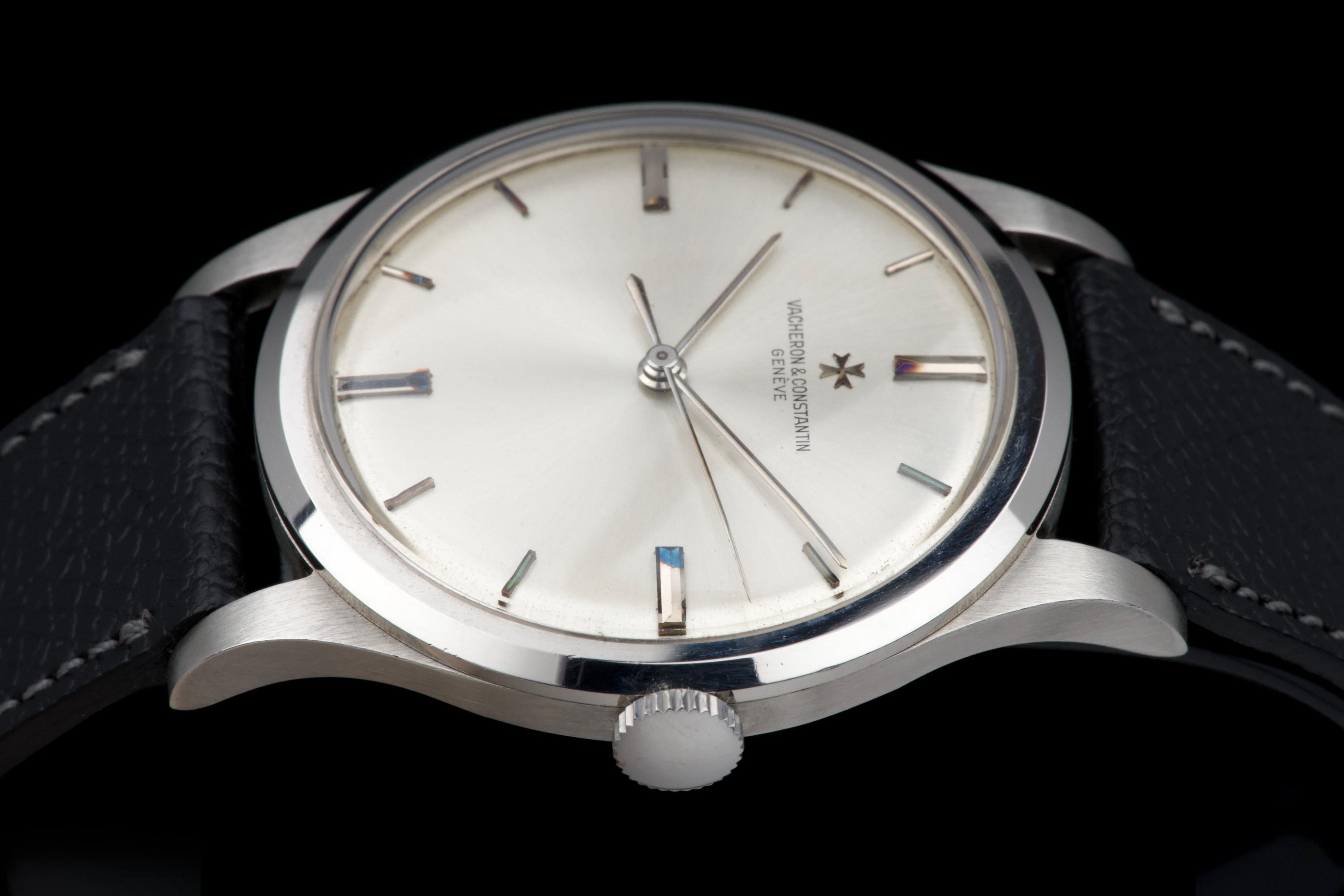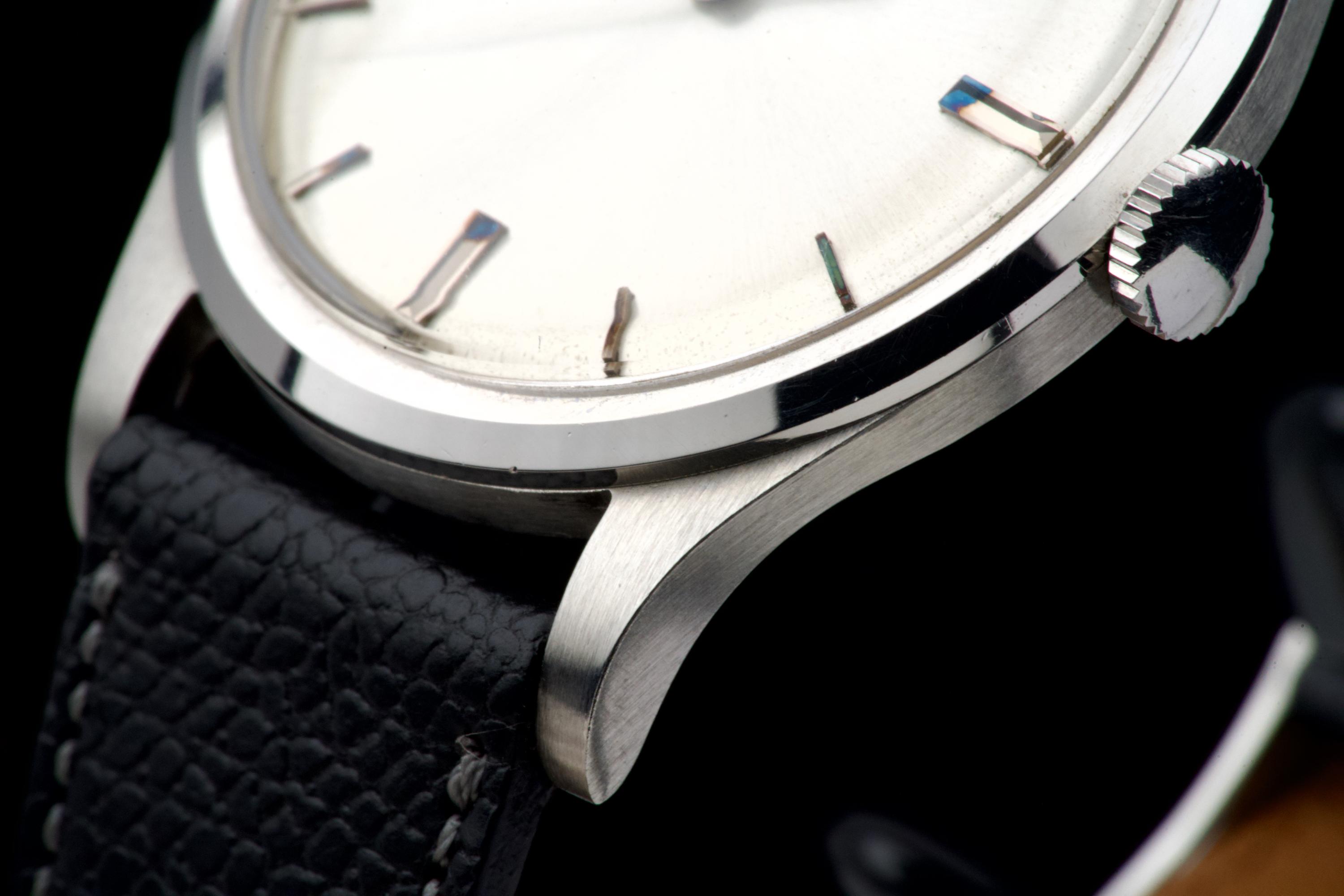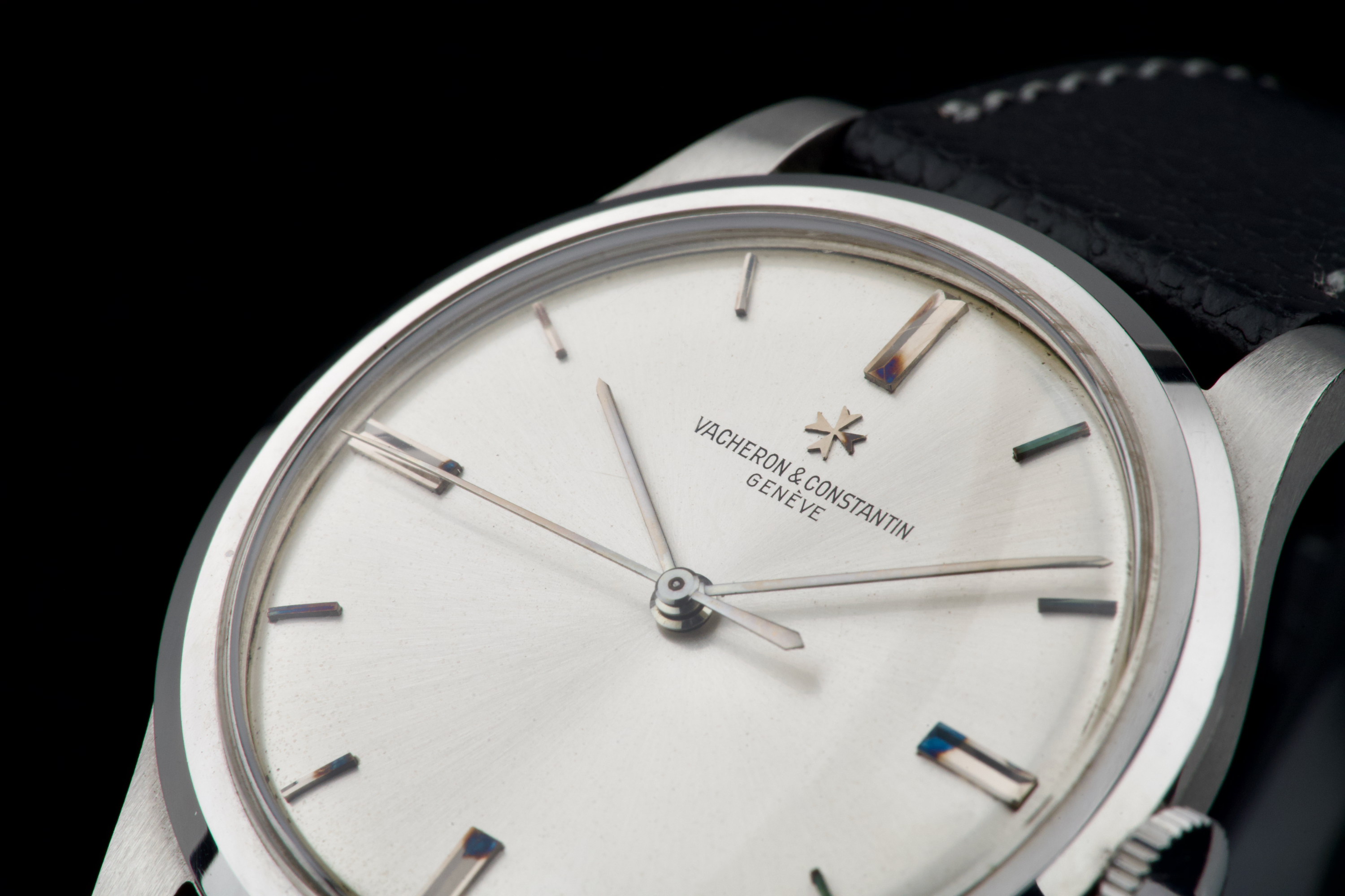 A beautifully preserved example of the Vacheron Constantin reference 6803, an oversized 36mm dress watch from the late 1960s. The stainless-steel case appears to be unpolished, and retains sharp lines and harmonious proportions — a hallmark of Vacheron’s understated elegance of the era. The original silver dial is in excellent overall condition, with a subtle partial discoloration on some of the hour markers, typical for watches of this period and adding to its vintage charm. The center-seconds layout gives the watch a clean and balanced aesthetic. The plexiglass crystal shows a few light surface scratches, again consistent with age. Recently serviced by our watchmaker, the movement runs perfectly. The watch is fitted with a brand-new calf leather strap and the original Vacheron Constantin steel buckle. An elegant and charismatic vintage Vacheron — perfectly proportioned, beautifully preserved, and a superb representative of the brand’s refined 1960s design language.