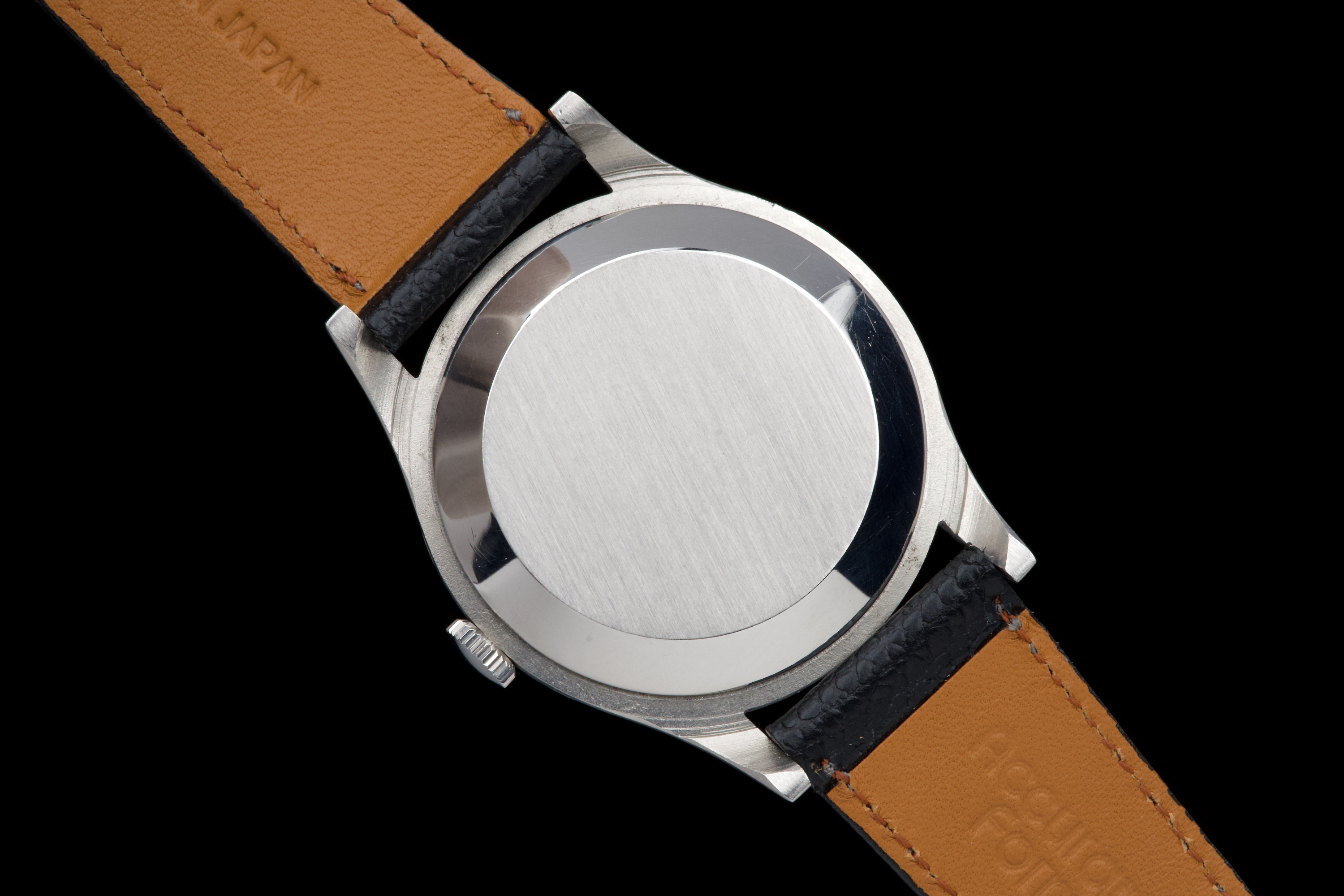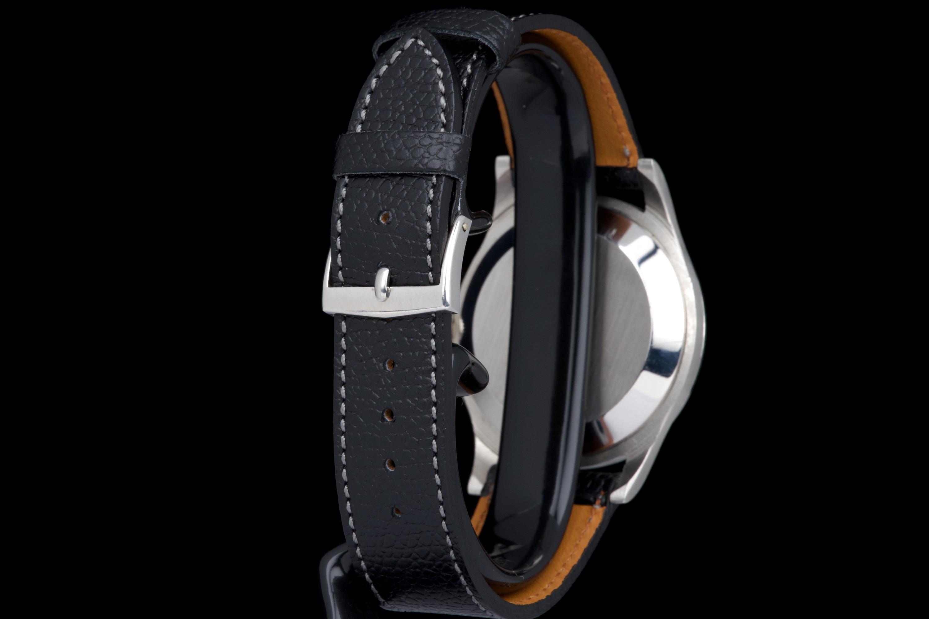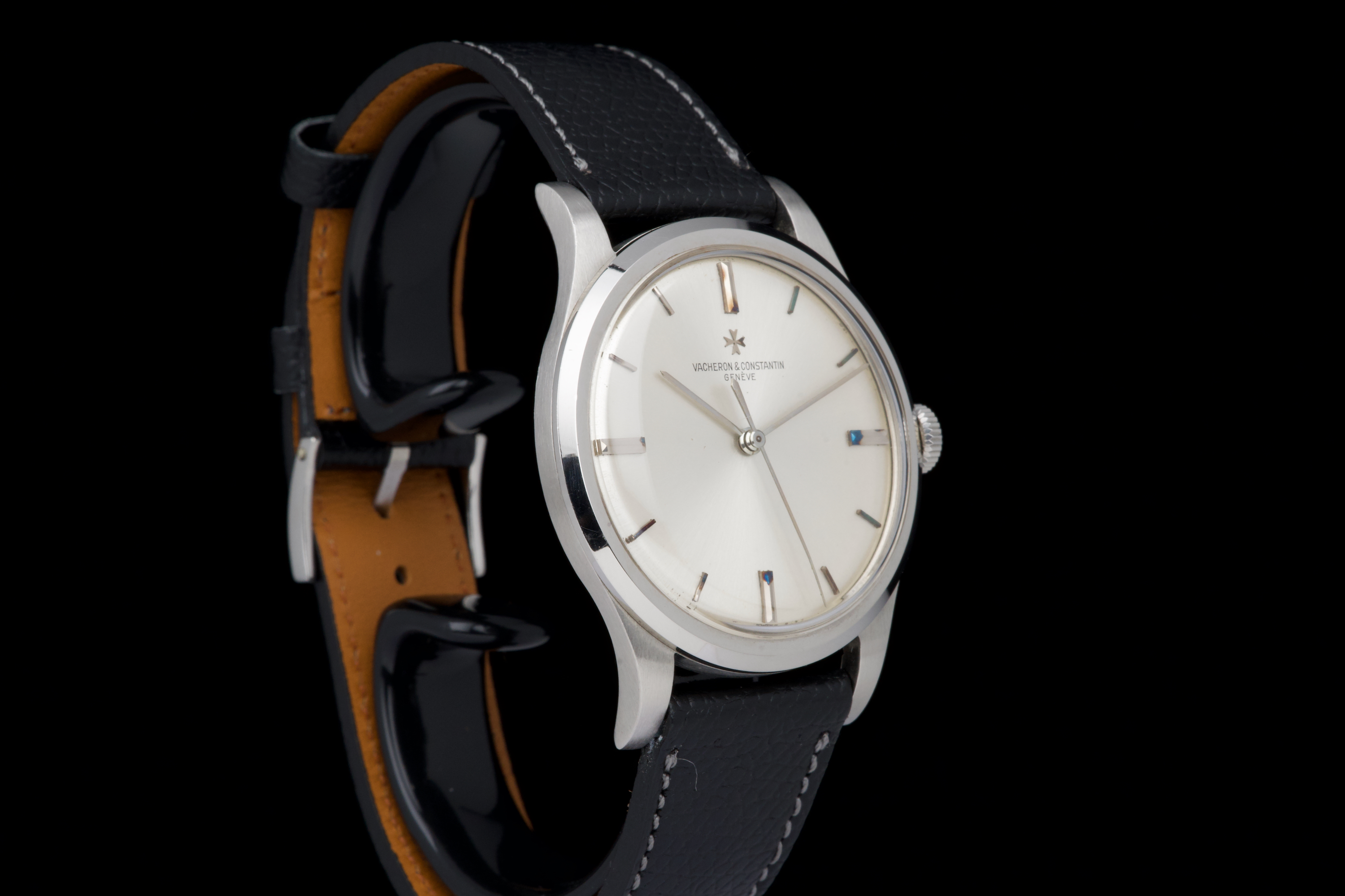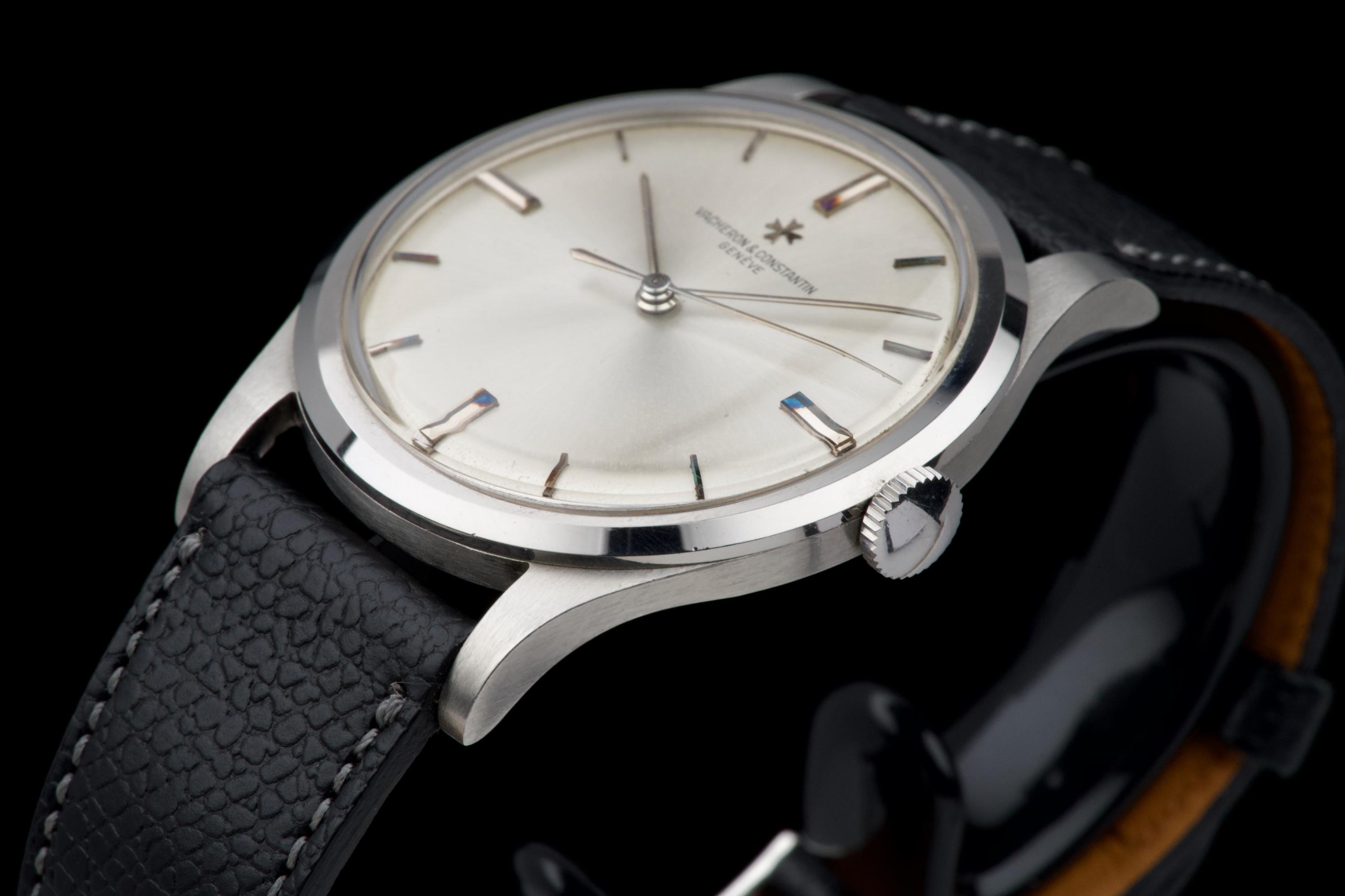 A beautifully preserved example of the Vacheron Constantin reference 6803, an oversized 36mm dress watch from the late 1960s. The stainless-steel case appears to be unpolished, and retains sharp lines and harmonious proportions — a hallmark of Vacheron’s understated elegance of the era. The original silver dial is in excellent overall condition, with a subtle partial discoloration on some of the hour markers, typical for watches of this period and adding to its vintage charm. The center-seconds layout gives the watch a clean and balanced aesthetic. The plexiglass crystal shows a few light surface scratches, again consistent with age. Recently serviced by our watchmaker, the movement runs perfectly. The watch is fitted with a brand-new calf leather strap and the original Vacheron Constantin steel buckle. An elegant and charismatic vintage Vacheron — perfectly proportioned, beautifully preserved, and a superb representative of the brand’s refined 1960s design language.