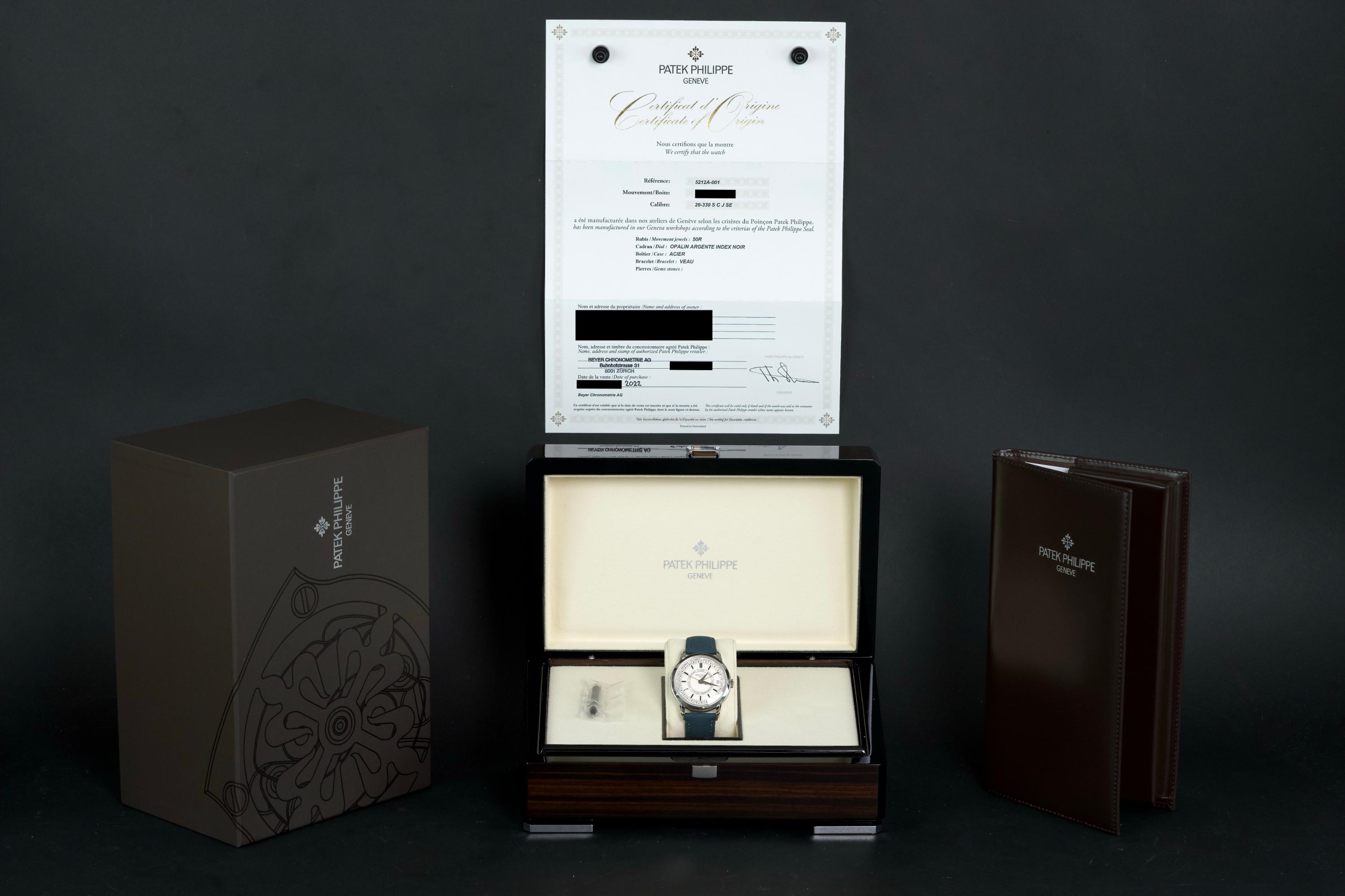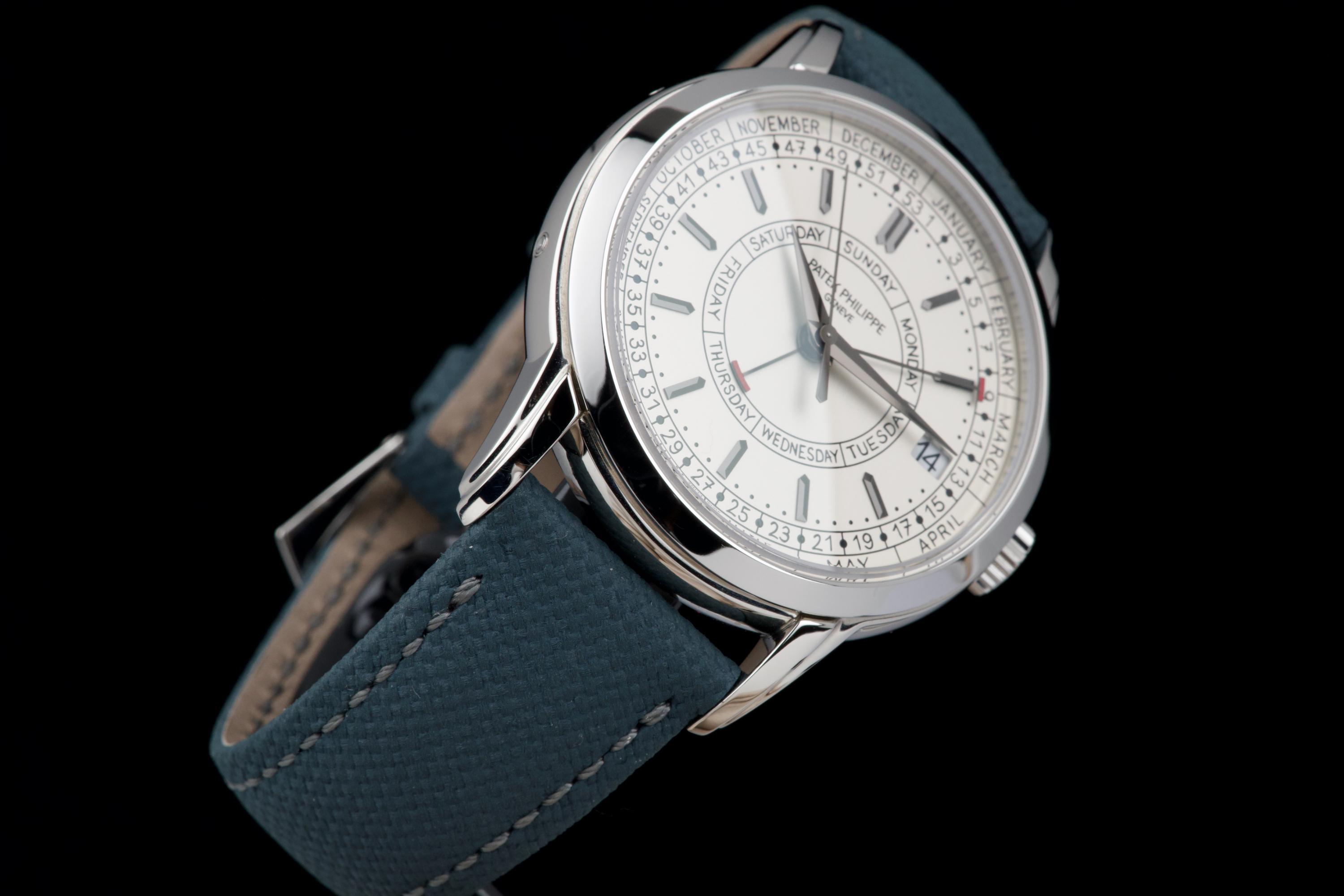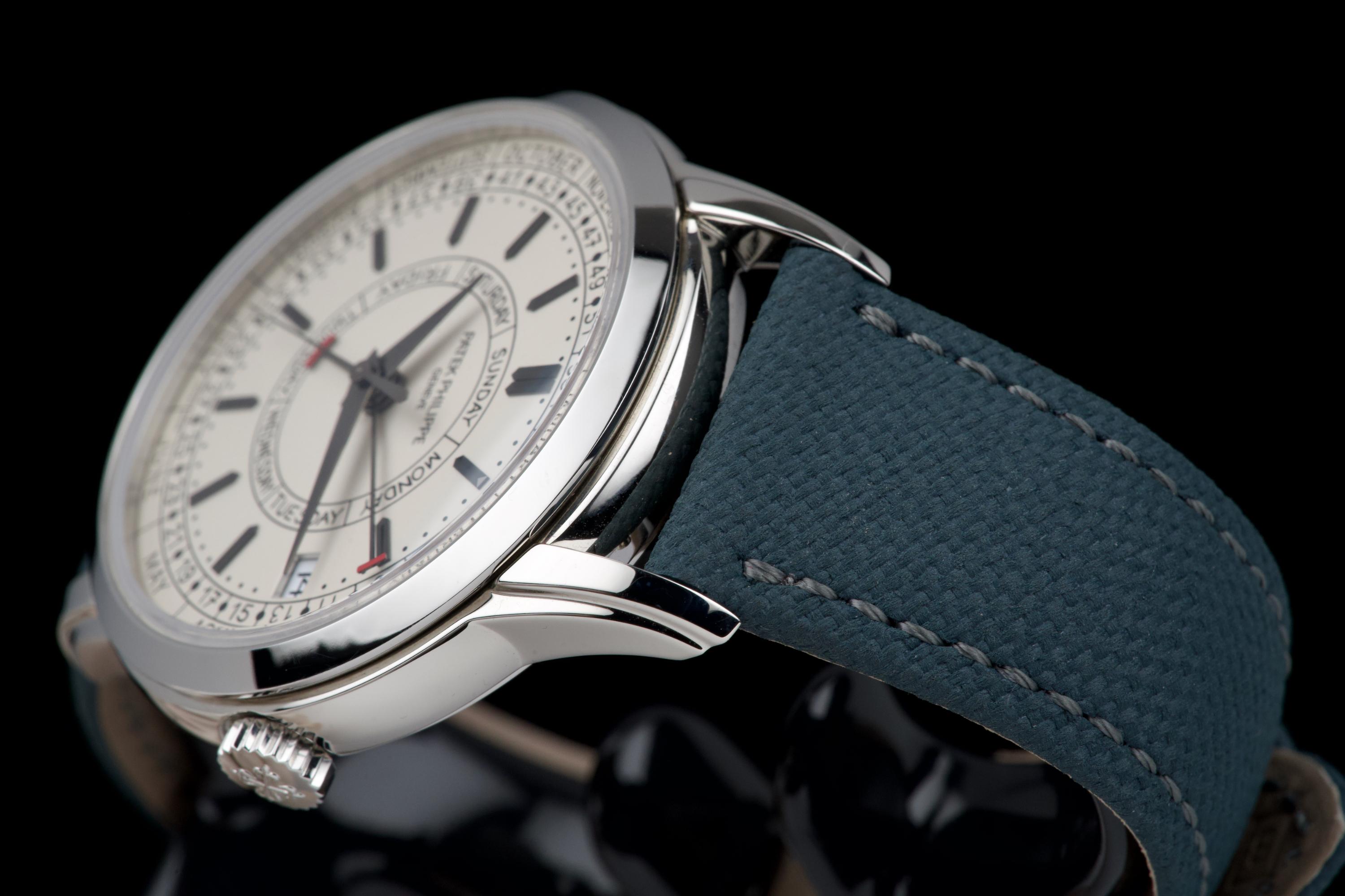 A superb single-owner example of the Patek Philippe Weekly Calendar 5212A, originally sold in Switzerland in 2022. The watch is in mint, close-to-new condition and comes complete with its full set. This elegant steel model features the distinctive silver opaline dial with handwritten-style day and week indications — a signature of the 5212. Powered by the automatic caliber 26-330 S C J SE, combining weekly calendar functionality with Patek Philippe’s refined finishing and reliability. The watch comes with its original beige calf leather strap, as well as an additional blue Patek Philippe fabric strap. A beautiful, fresh example of one of Patek Philippe’s most charismatic modern steel complications.