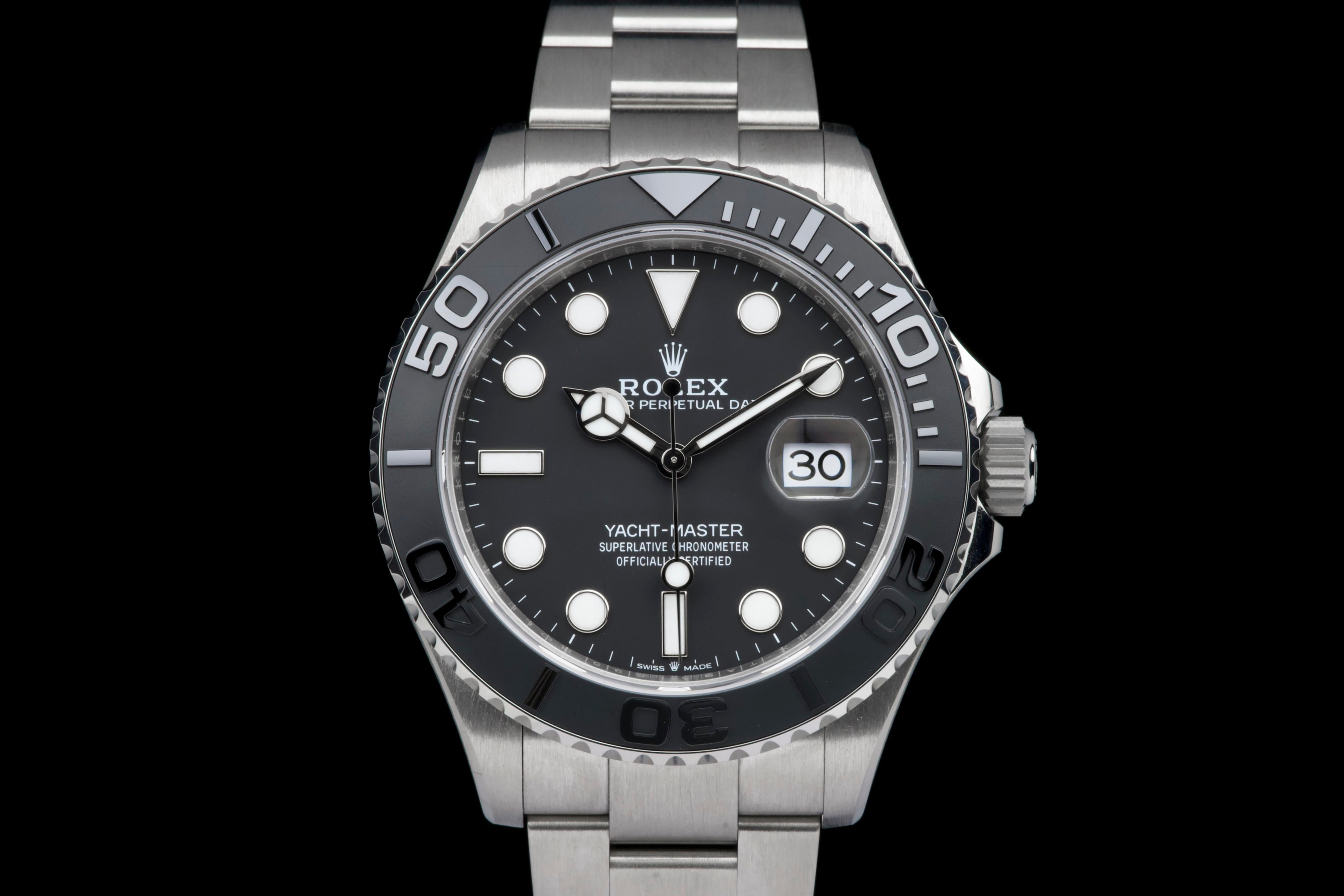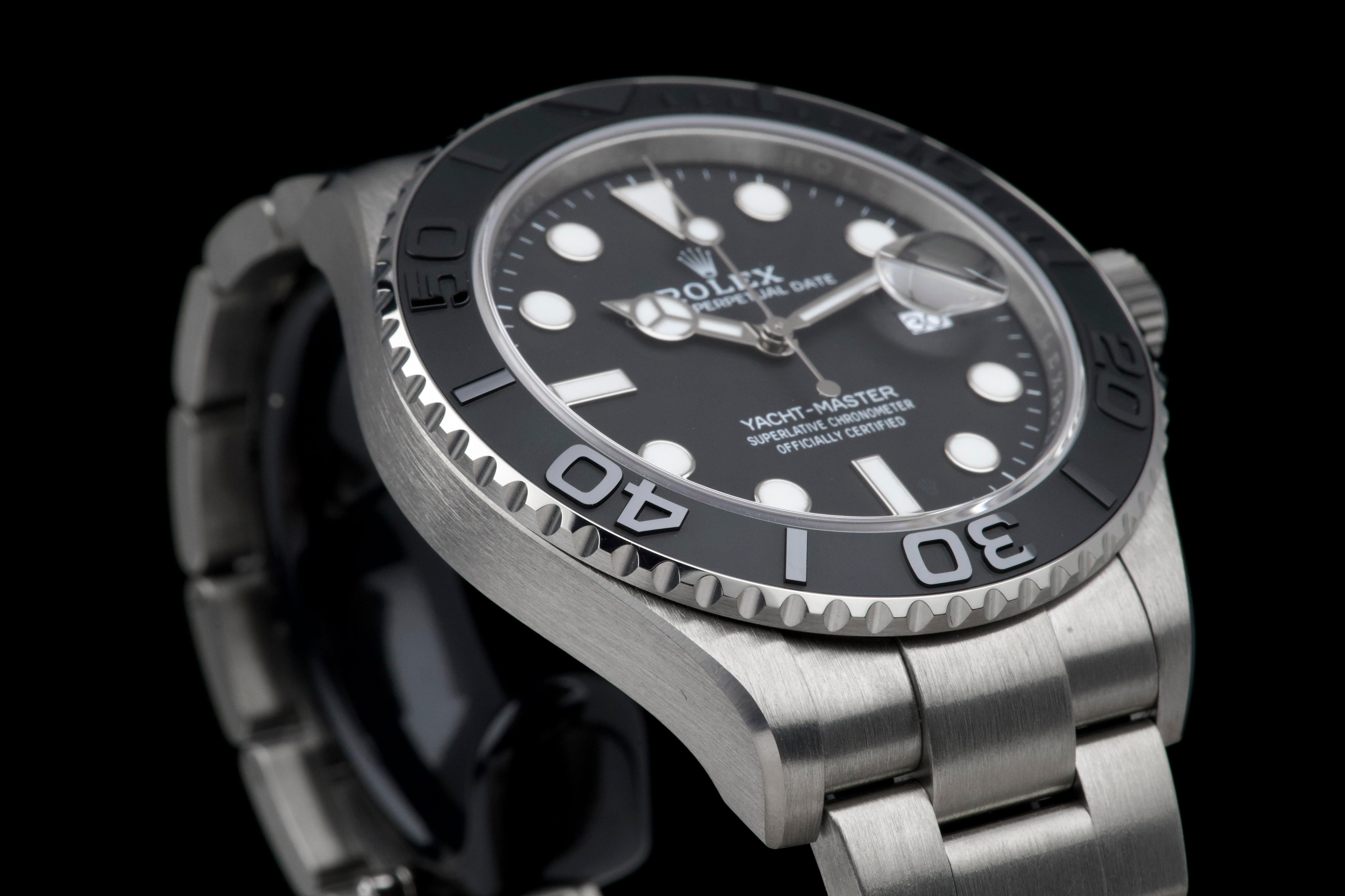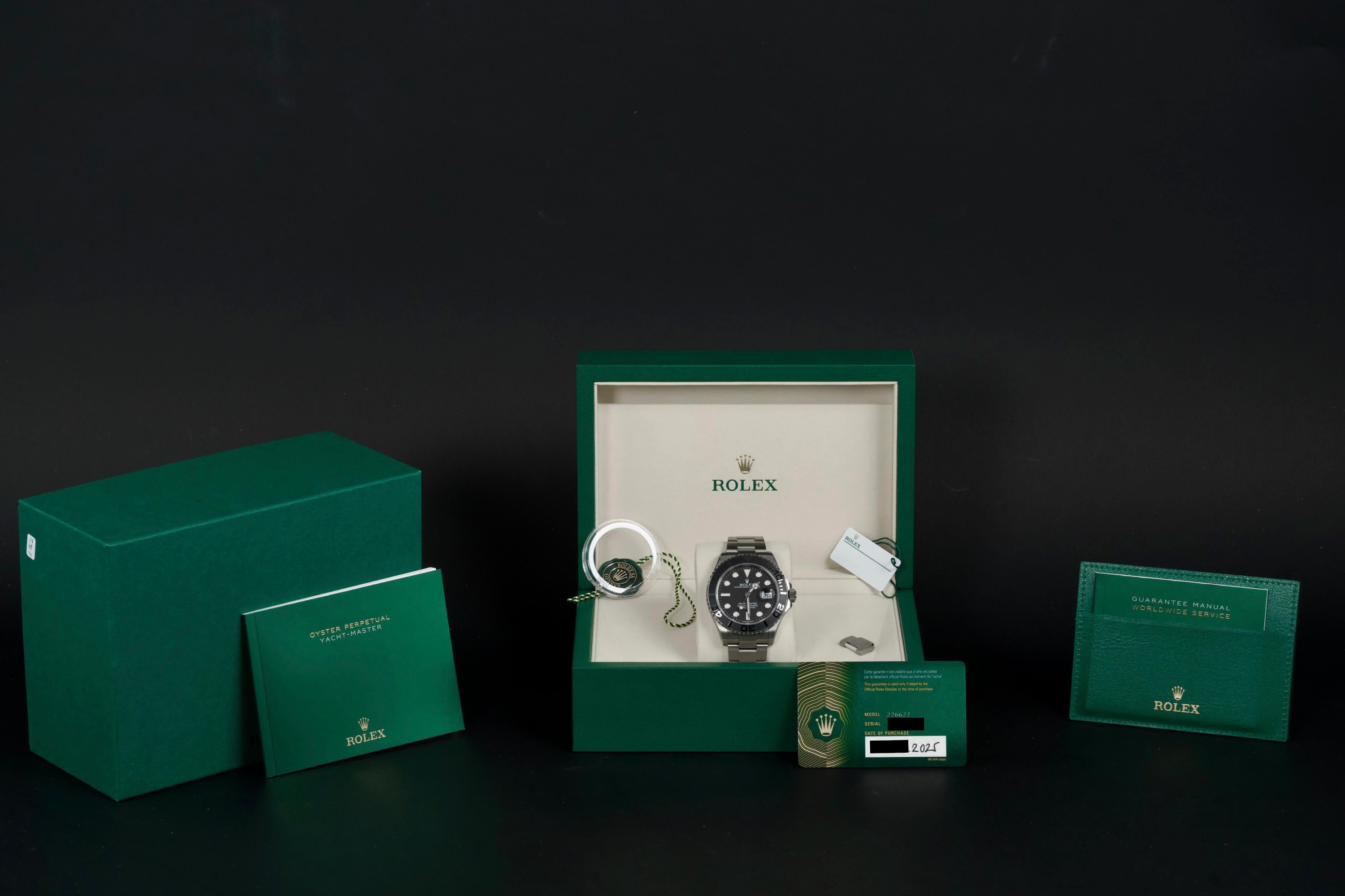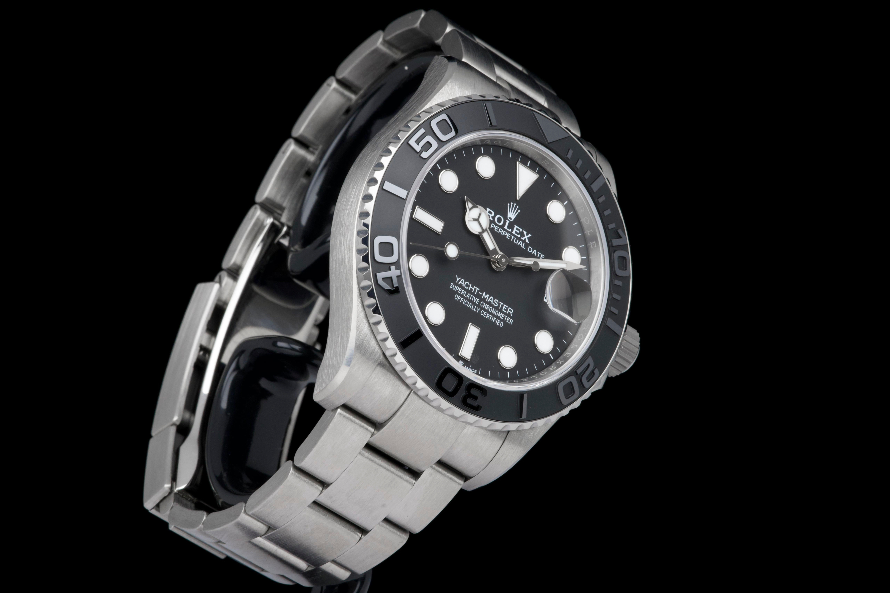 Presented here is an exceptional example of contemporary Rolex innovation: the Yacht-Master 42 in titanium, reference 226627. Crafted in RLX titanium, this striking timepiece represents a decisive evolution in the Yacht-Master lineage, combining technical sophistication with understated elegance. Its 42mm case offers a bold yet balanced presence on the wrist, enhanced by the material’s remarkable lightness and resilience. The matte black Cerachrom bezel, paired with the highly legible black dial, underscores the watch’s professional maritime character while maintaining a refined aesthetic. This particular example is offered in unworn condition, retaining its original factory finish, and is accompanied by its full set, including box, papers, and accessories. Dated 2025, it stands as a pristine and highly desirable specimen, appealing equally to the discerning collector and the connoisseur seeking a modern Rolex of rare substance. A compelling opportunity to acquire one of the most sought-after contemporary sports watches in outstanding condition.