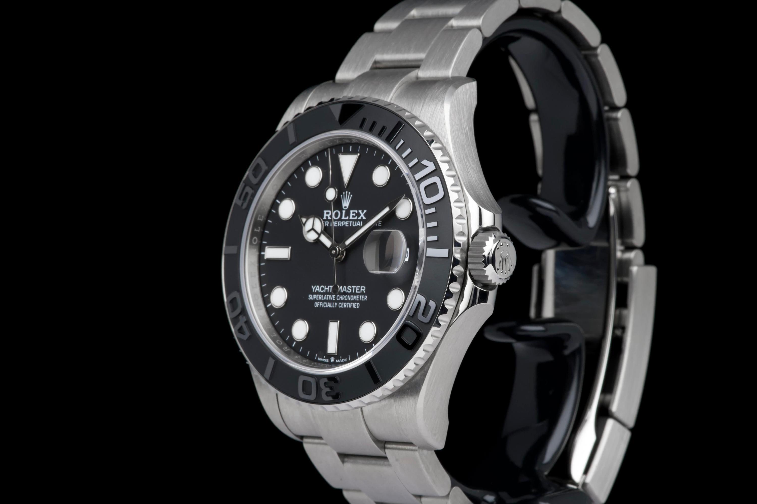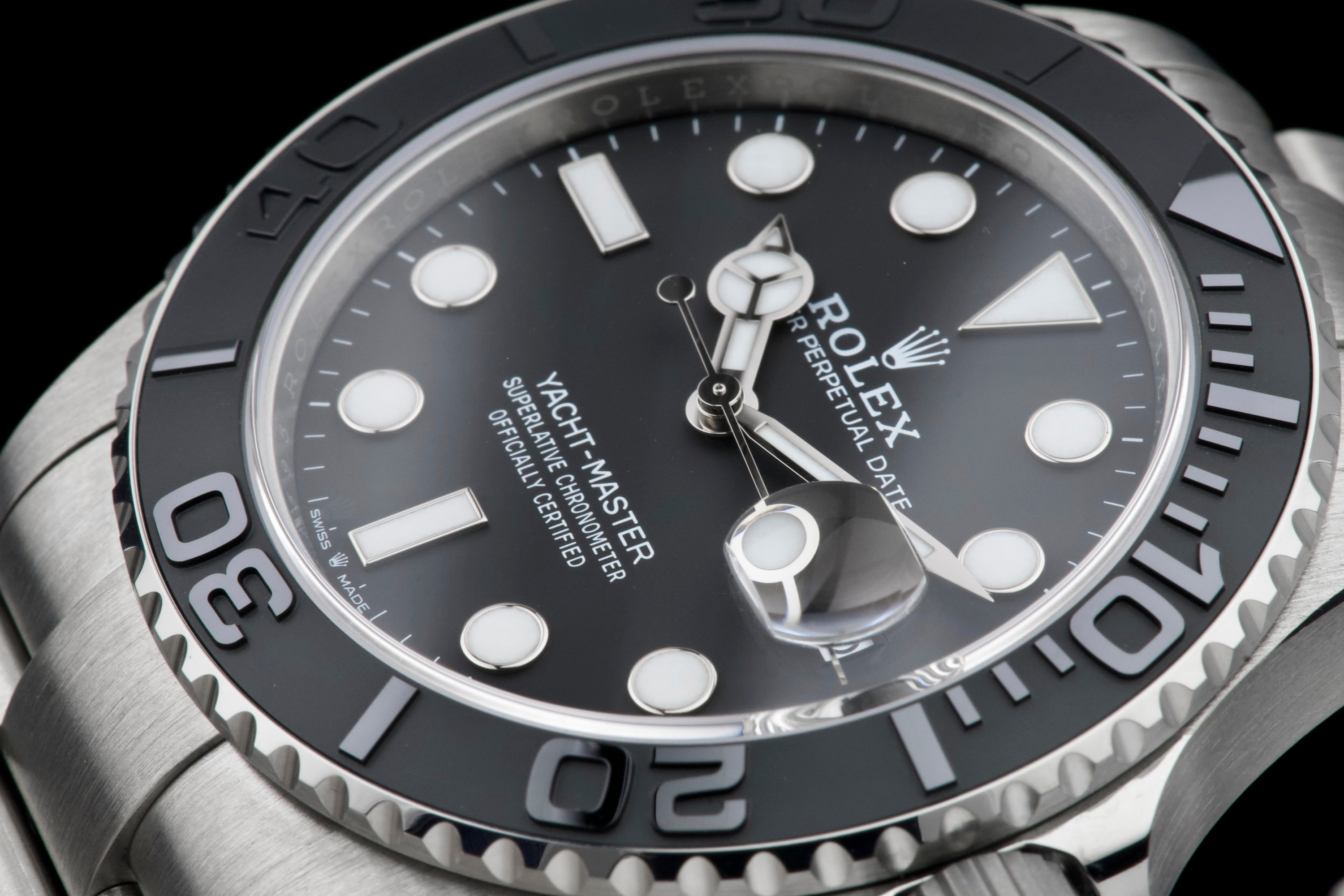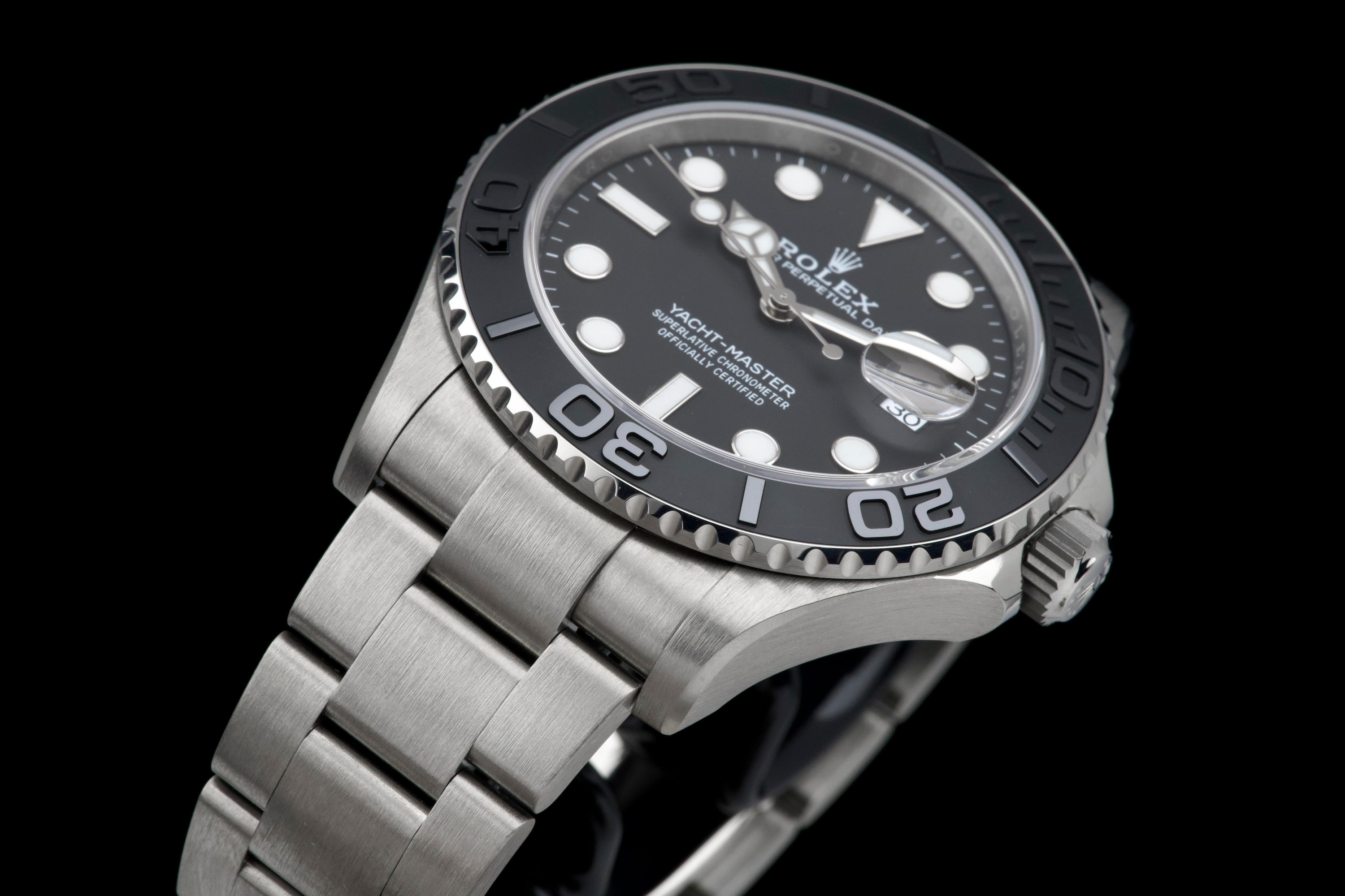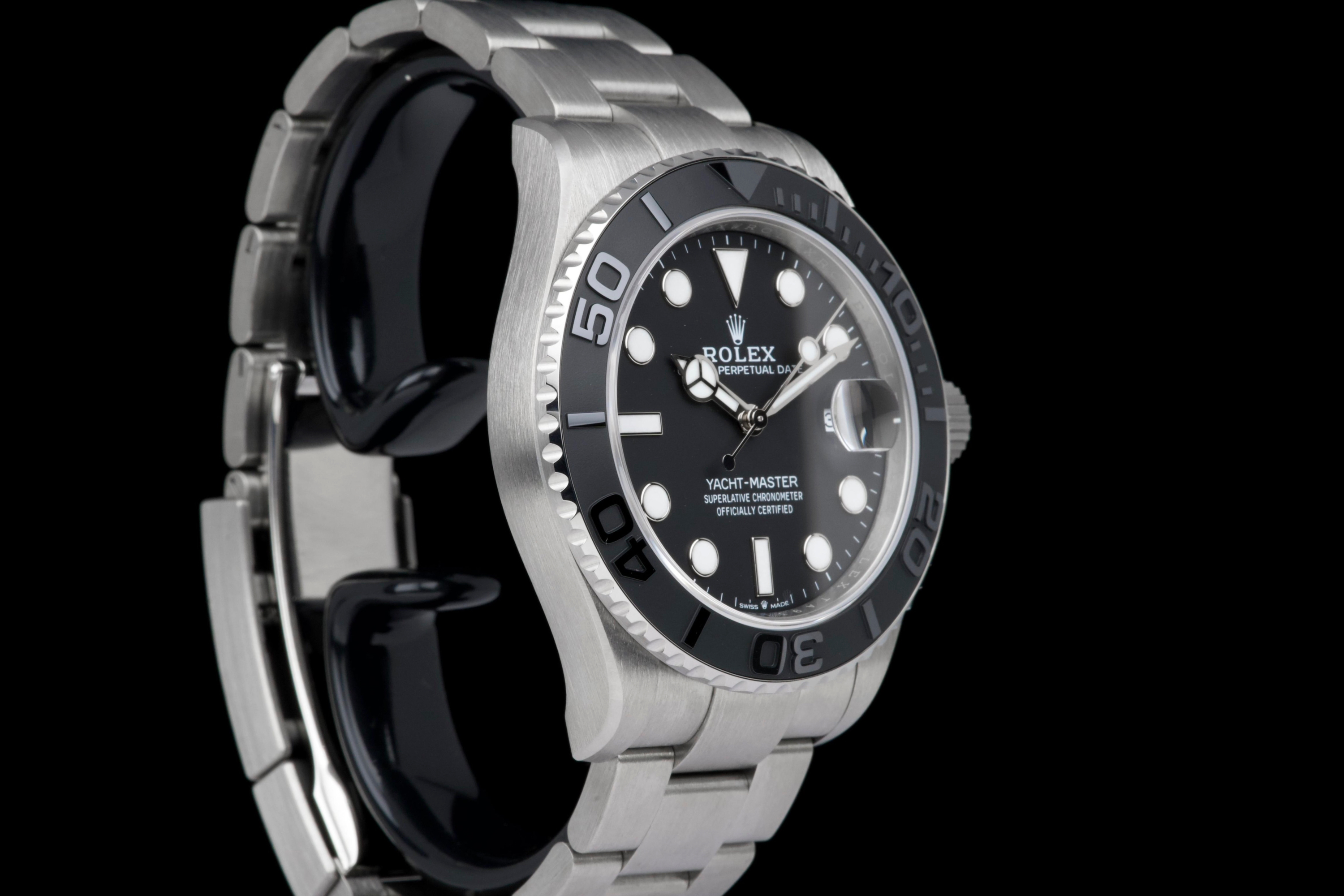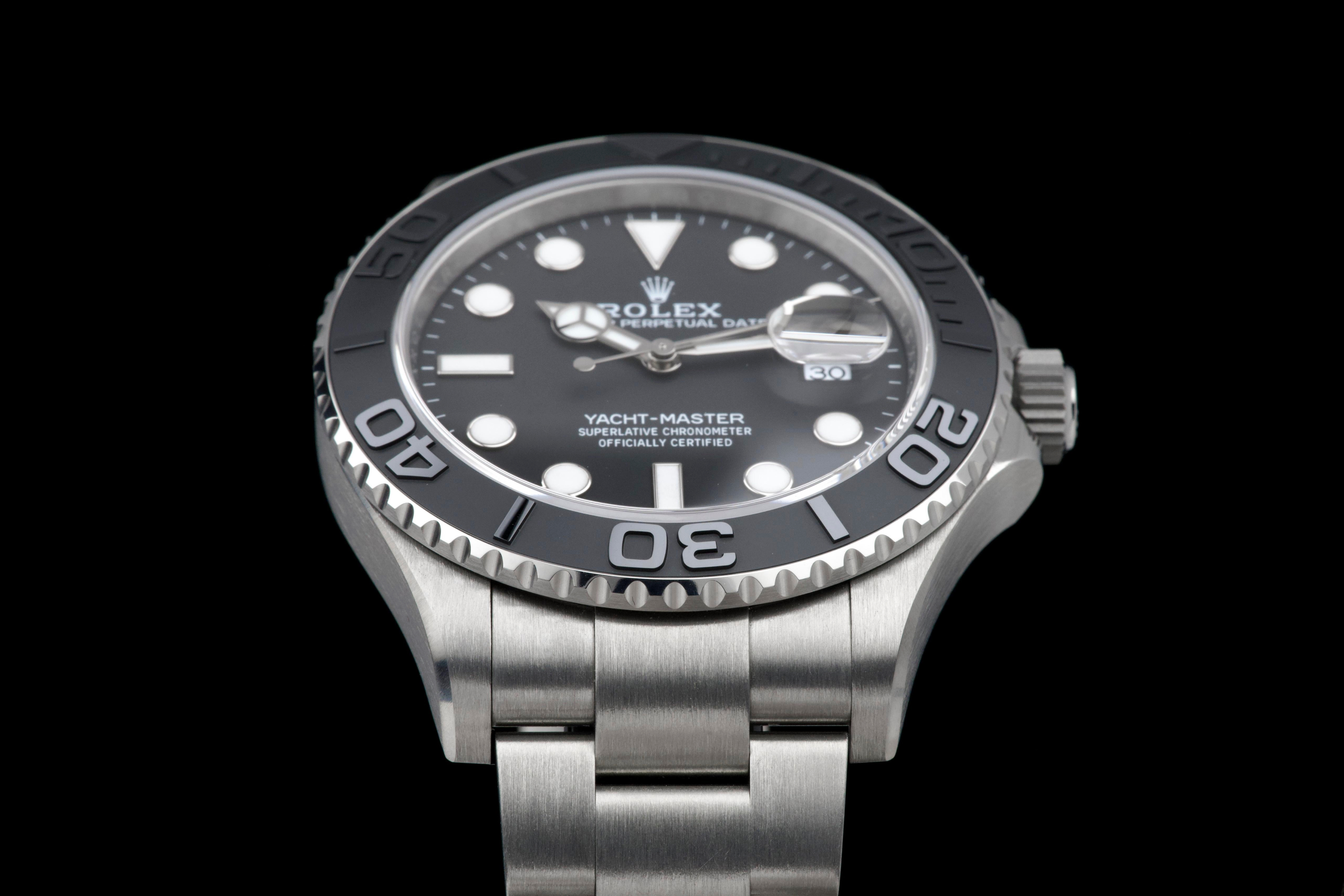 Presented here is an exceptional example of contemporary Rolex innovation: the Yacht-Master 42 in titanium, reference 226627. Crafted in RLX titanium, this striking timepiece represents a decisive evolution in the Yacht-Master lineage, combining technical sophistication with understated elegance. Its 42mm case offers a bold yet balanced presence on the wrist, enhanced by the material’s remarkable lightness and resilience. The matte black Cerachrom bezel, paired with the highly legible black dial, underscores the watch’s professional maritime character while maintaining a refined aesthetic. This particular example is offered in unworn condition, retaining its original factory finish, and is accompanied by its full set, including box, papers, and accessories. Dated 2025, it stands as a pristine and highly desirable specimen, appealing equally to the discerning collector and the connoisseur seeking a modern Rolex of rare substance. A compelling opportunity to acquire one of the most sought-after contemporary sports watches in outstanding condition.