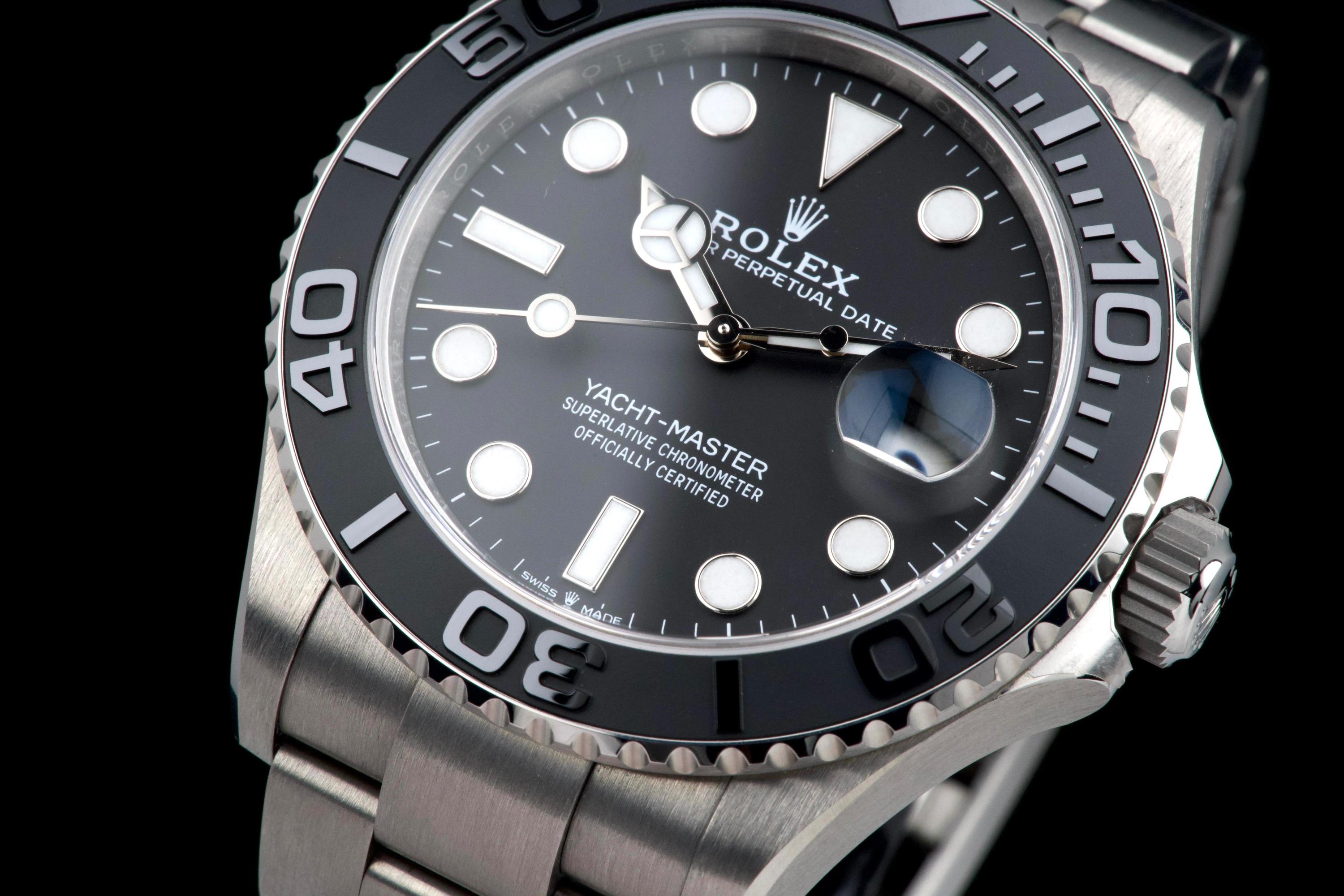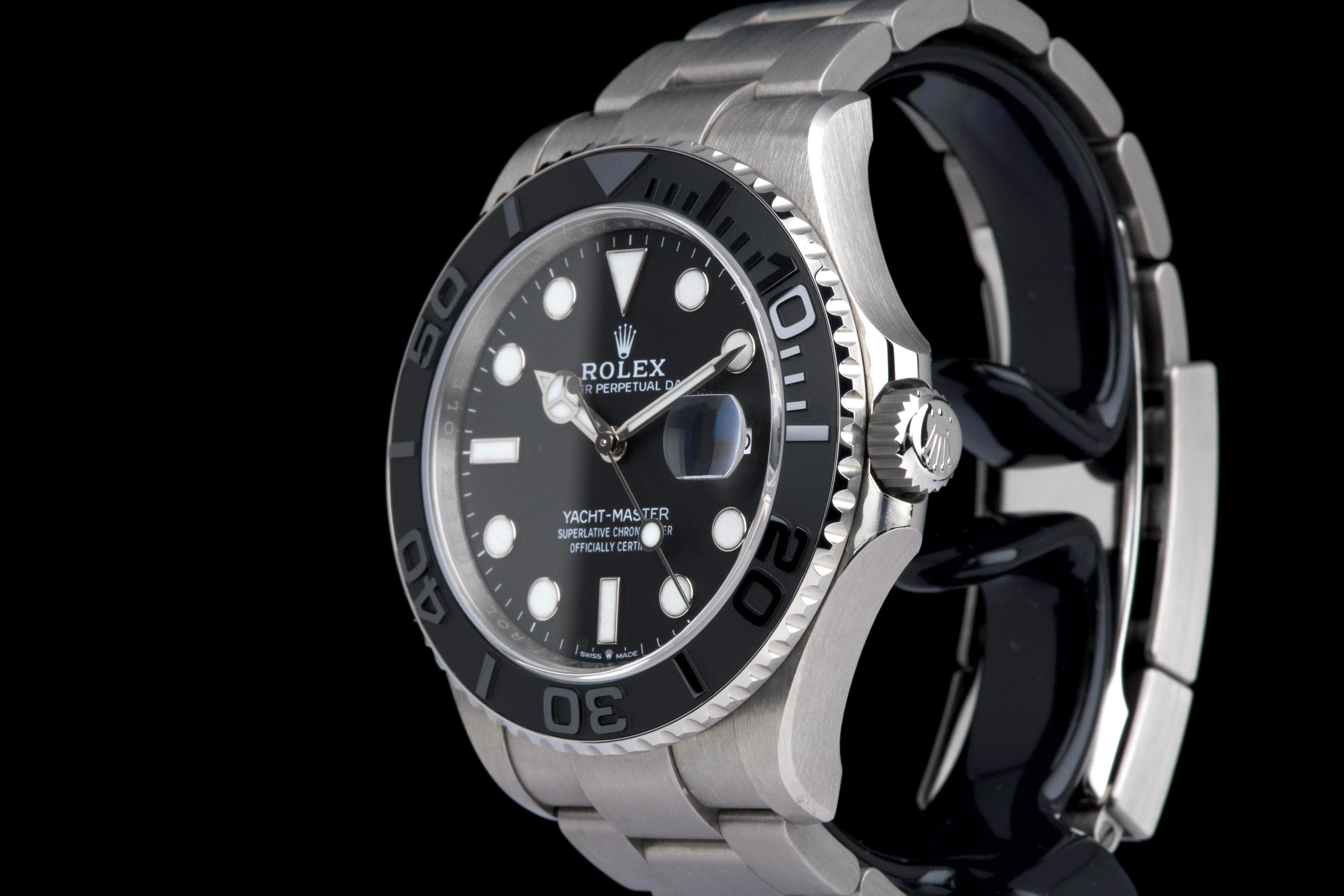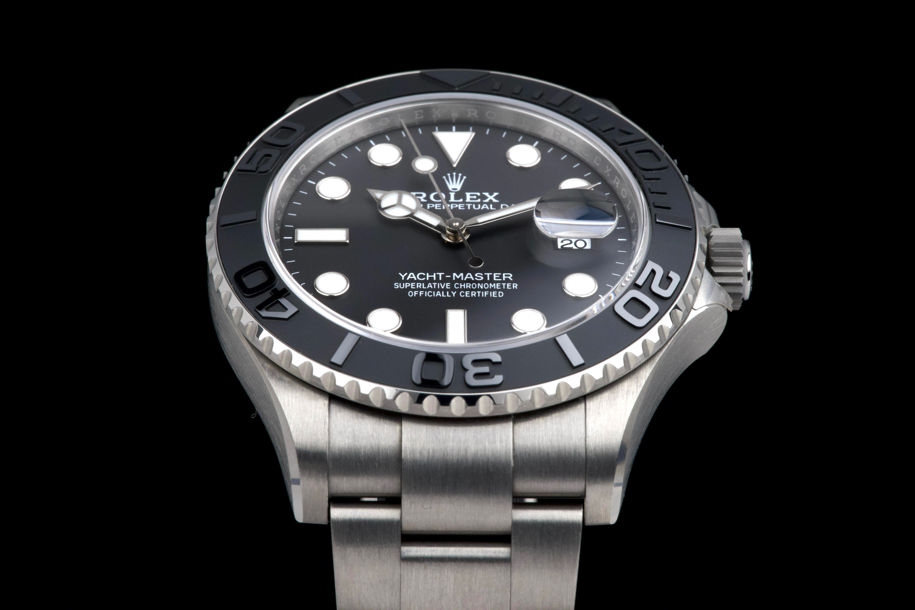 Rolex Yacht-Master 42, reference 226627, RLX titanium wristwatch with date and bracelet, full set, circa 2025. A contemporary and highly technical interpretation of the nautical sports watch, the present Yacht-Master reference 226627 showcases Rolex’s expertise in combining innovation with refined design. Crafted in RLX titanium, a lightweight and highly resistant alloy, the watch offers exceptional comfort on the wrist while maintaining the robustness expected from a professional model. Housed in a 42 mm case, the watch features a bidirectional rotatable bezel with raised numerals and a matte finish, enhancing both functionality and legibility. The dial is fitted with luminous hour markers and hands, along with a date aperture at 3 o’clock under a sapphire crystal with Cyclops magnifier. Powered by a reliable Rolex automatic movement, the watch delivers precision and durability in all conditions. According to the consignor, the watch was purchased new in 2025 and has remained in the possession of a single owner since. It has been very lightly worn, showing only minor hairline marks on the clasp, while the rest of the watch remains in excellent condition. Offered as a full set with its original box, warranty card and accessories, this Yacht-Master 226627 represents an outstanding opportunity to acquire a nearly unworn example of one of Rolex’s most modern and technically advanced sports watches.