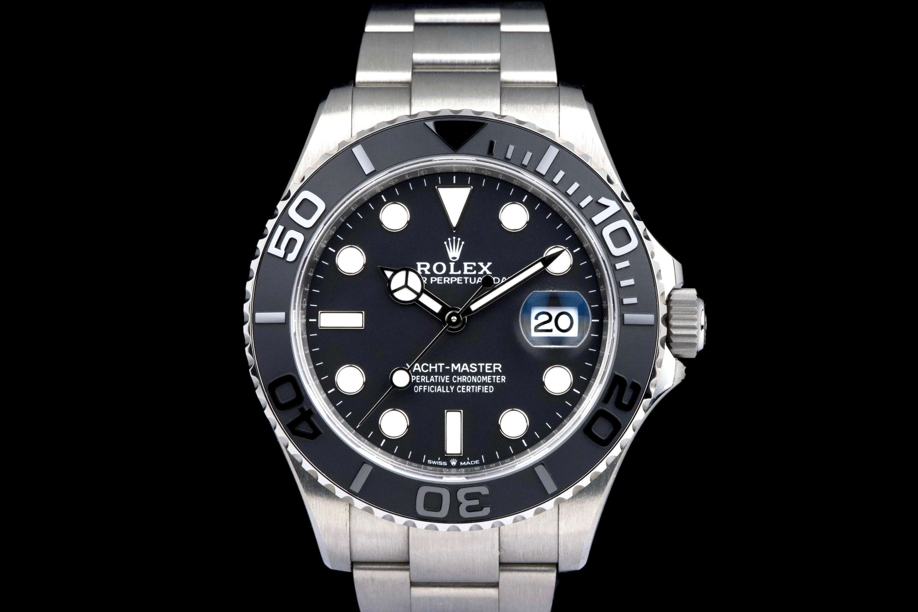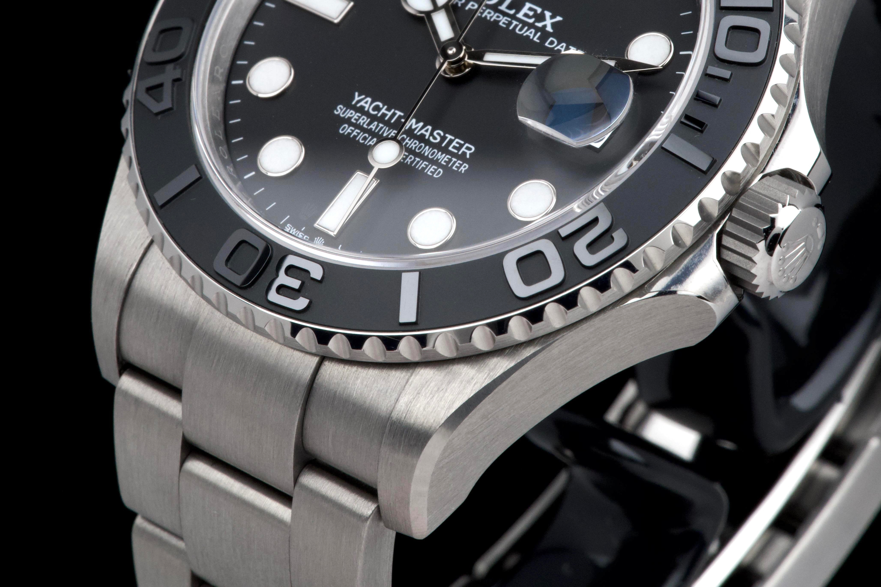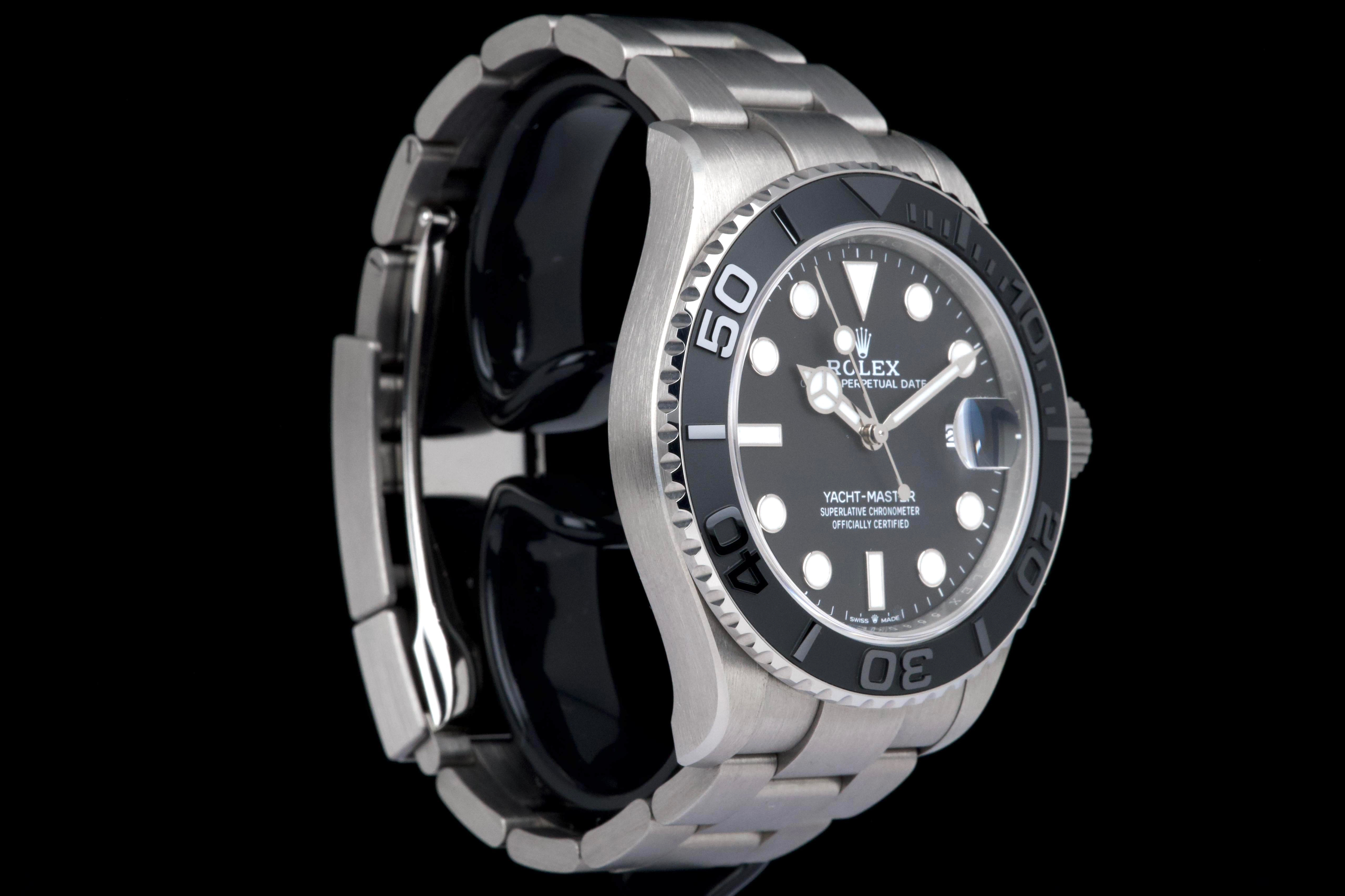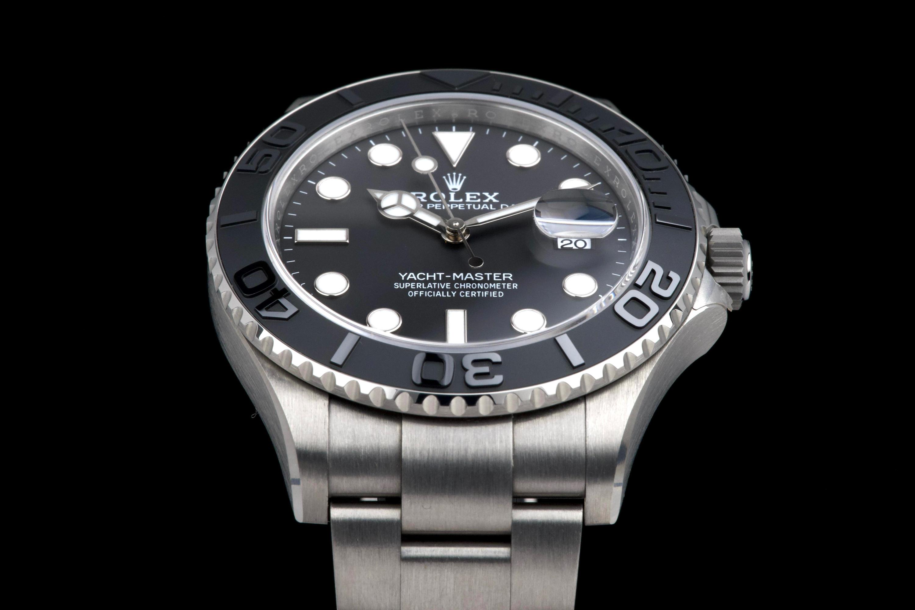 Rolex Yacht-Master 42, reference 226627, RLX titanium wristwatch with date and bracelet, full set, circa 2025. A contemporary and highly technical interpretation of the nautical sports watch, the present Yacht-Master reference 226627 showcases Rolex’s expertise in combining innovation with refined design. Crafted in RLX titanium, a lightweight and highly resistant alloy, the watch offers exceptional comfort on the wrist while maintaining the robustness expected from a professional model. Housed in a 42 mm case, the watch features a bidirectional rotatable bezel with raised numerals and a matte finish, enhancing both functionality and legibility. The dial is fitted with luminous hour markers and hands, along with a date aperture at 3 o’clock under a sapphire crystal with Cyclops magnifier. Powered by a reliable Rolex automatic movement, the watch delivers precision and durability in all conditions. According to the consignor, the watch was purchased new in 2025 and has remained in the possession of a single owner since. It has been very lightly worn, showing only minor hairline marks on the clasp, while the rest of the watch remains in excellent condition. Offered as a full set with its original box, warranty card and accessories, this Yacht-Master 226627 represents an outstanding opportunity to acquire a nearly unworn example of one of Rolex’s most modern and technically advanced sports watches.