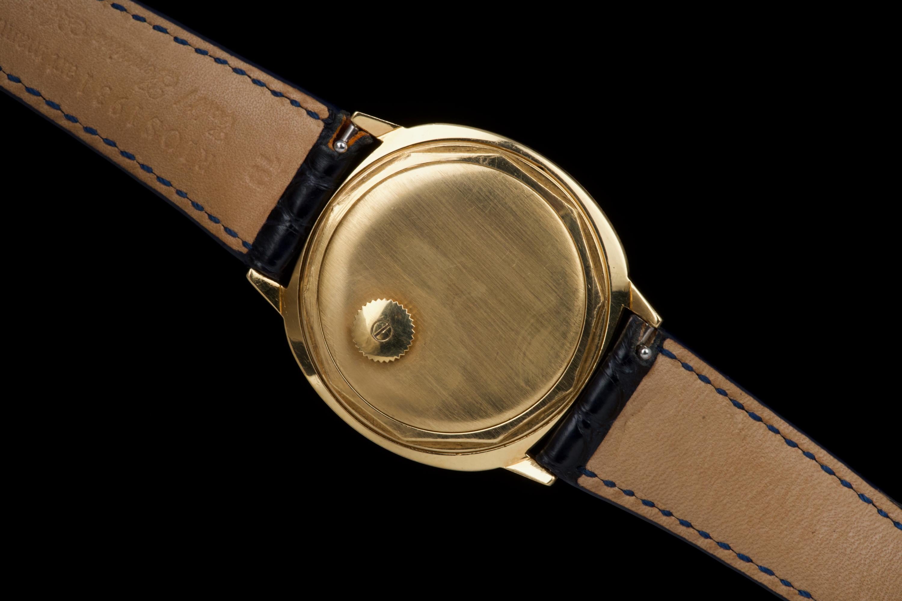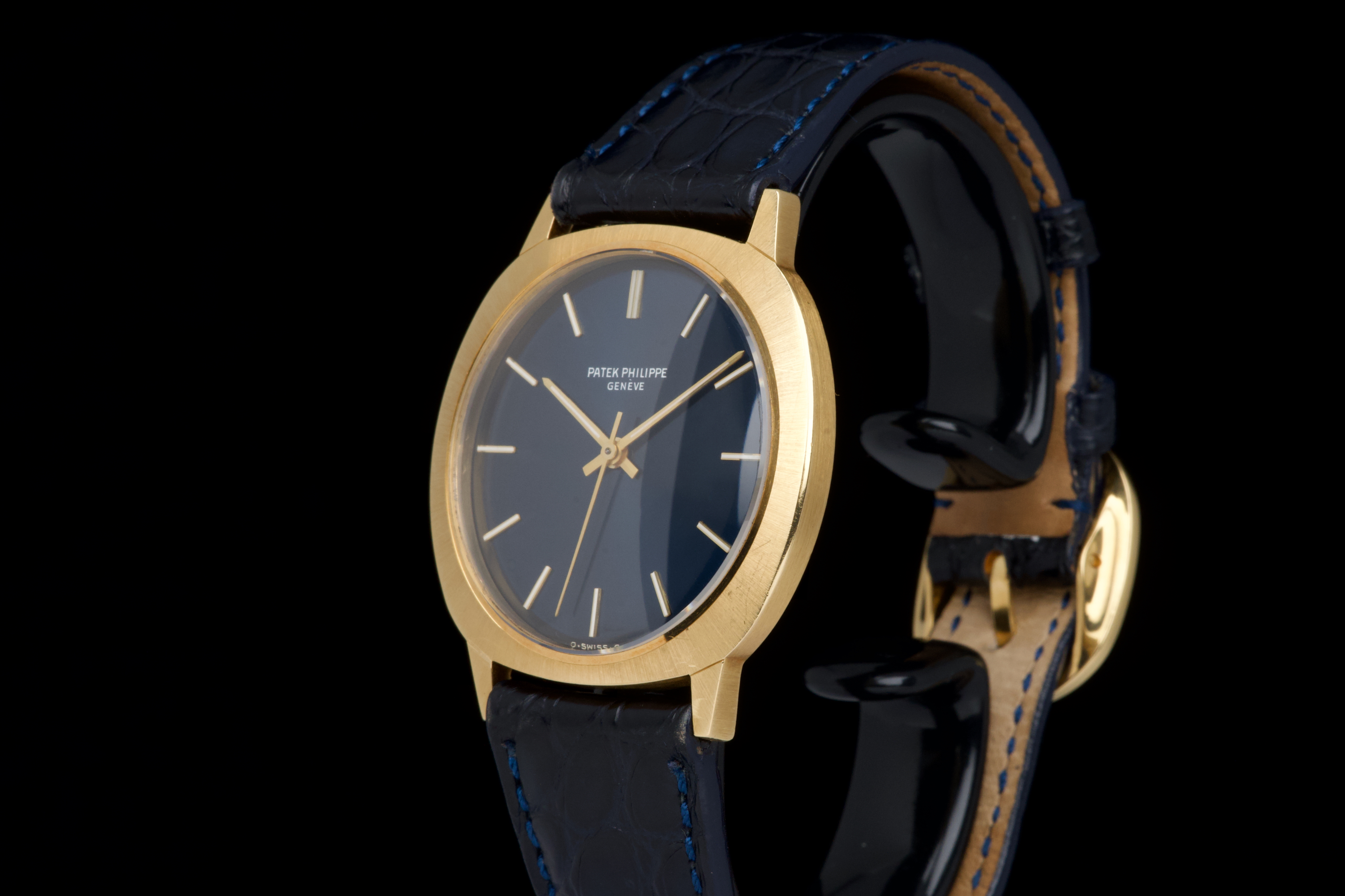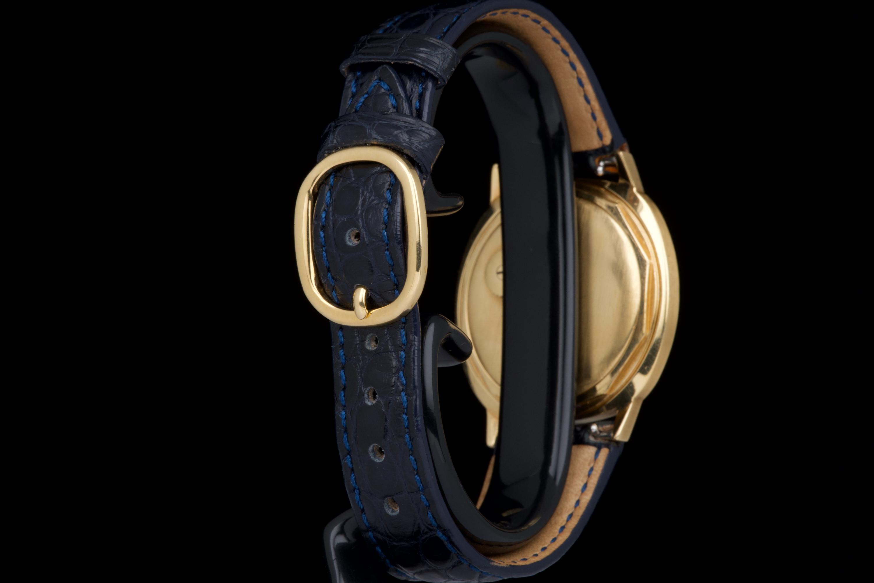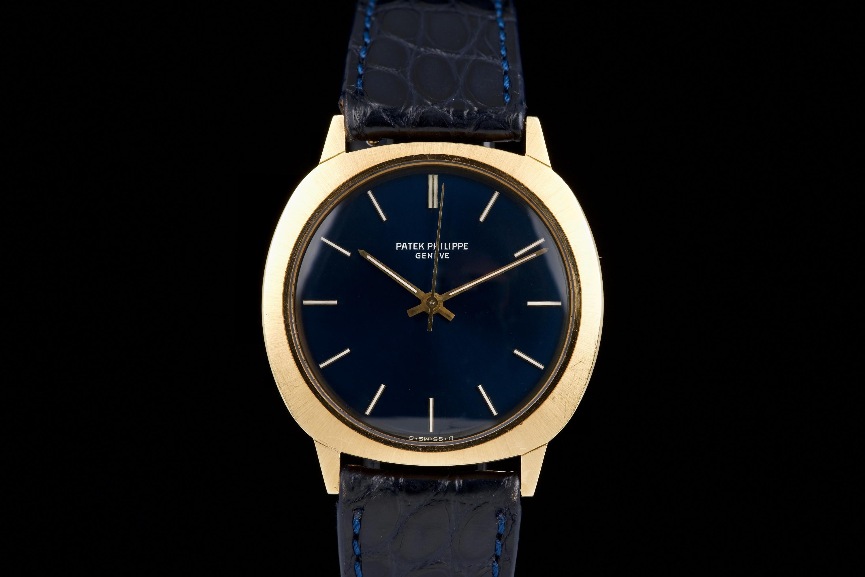 A very rare and elegant example of the Patek Philippe reference 3573, presented here in its most desirable configuration featuring a stunning blue sigma dial. The 36mm yellow-gold cushion-shaped case has been polished in the past but remains sharp, showing only light wear consistent with age. A particularly charming detail of this reference is its crown positioned on the caseback, giving the watch an exceptionally pure and minimalist profile on the wrist — a design hallmark of early 1970s Patek dress pieces. The watch is fitted with a navy blue crocodile strap (non-Patek) paired with an Ellipse-style buckle, complementing the dial beautifully. Although there is no documented service history, the movement has been checked and is functioning very well. A rare and refined vintage Patek in excellent overall condition, showcasing one of the most attractive dial and case combinations of the era.